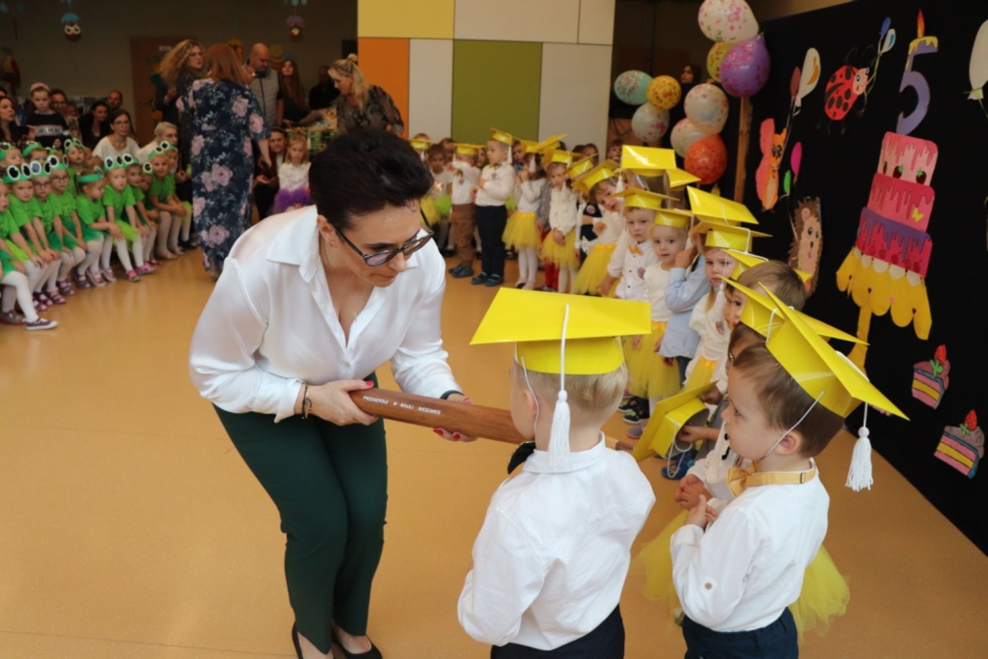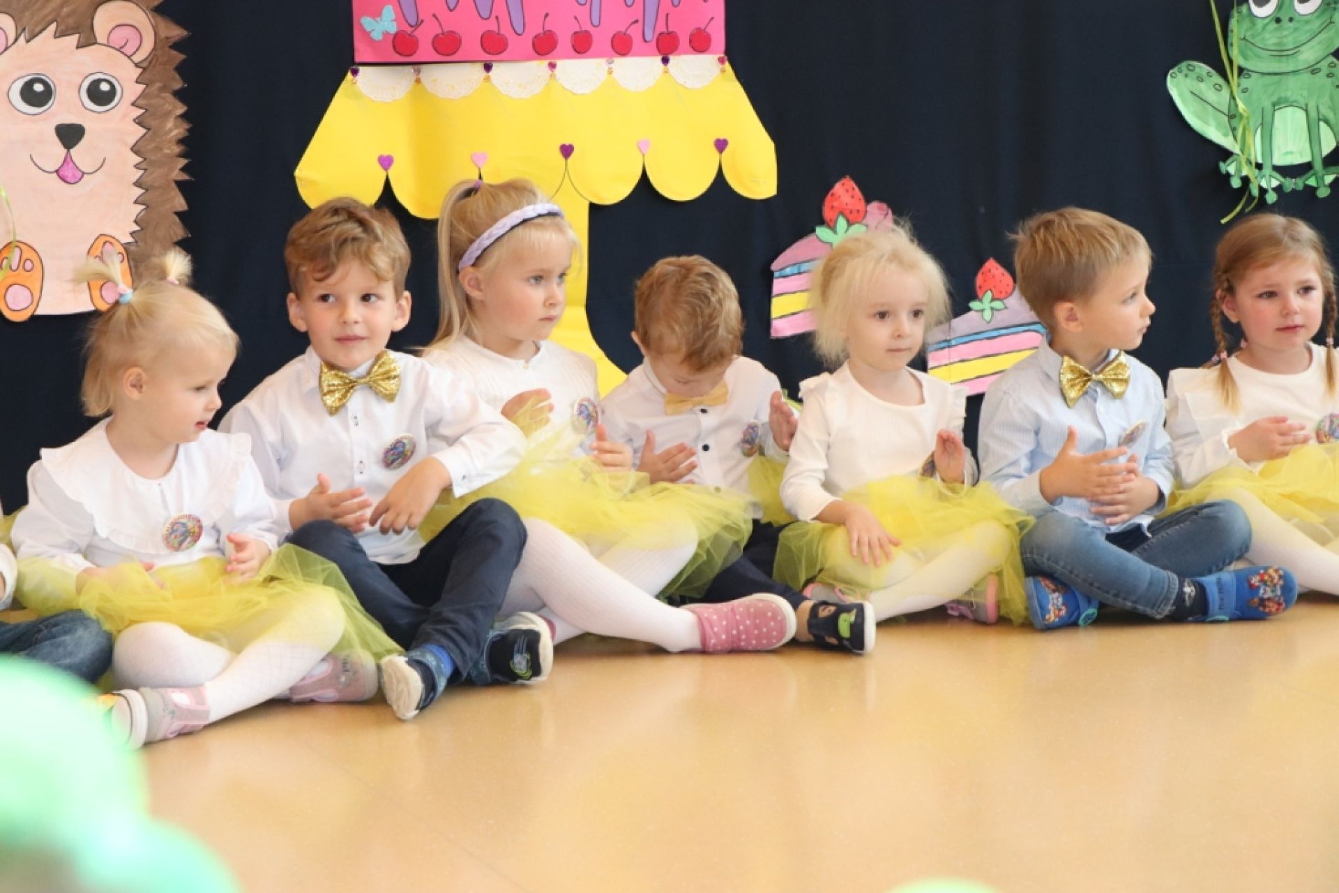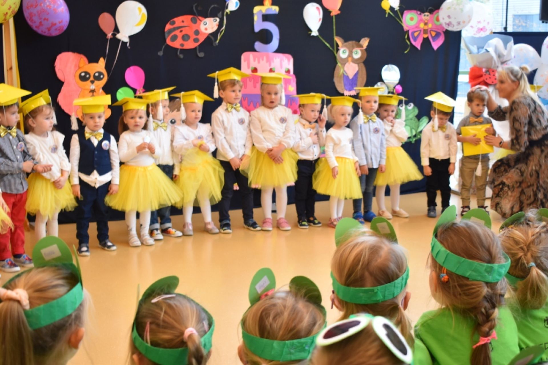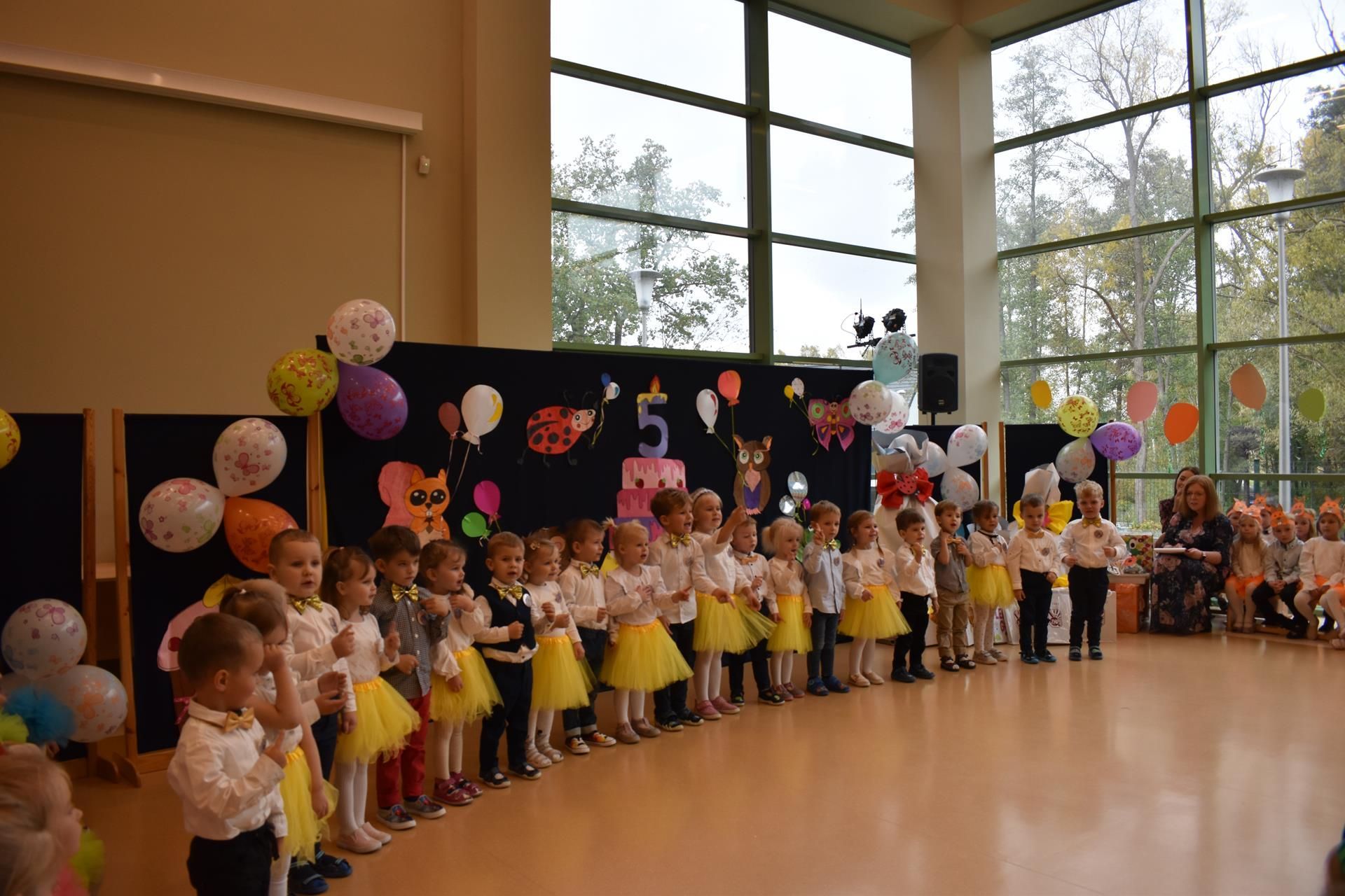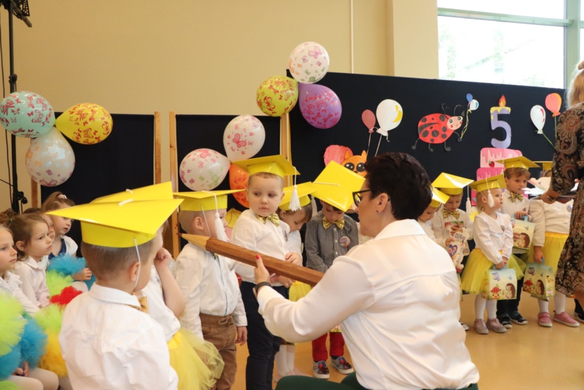 Dnia 21 października 2022 r. świętowaliśmy Piąte urodziny naszego przedszkola. Przybyli do nas wspaniali goście i rodzice najmłodszych przedszkolaków. Z tej okazji wszystkie grupy zaprezentowały swoje umiejętności wokalno-taneczne. Tego właśnie dnia odbyło się również pasowanie na przedszkolaka Biedronek oraz Motylków. Maluszki zaprezentowały swoje umiejętności – dając tym samym dowód, jak dużo już potrafią. Po części artystycznej, dzieci obiecały: zgodnie bawić się w przedszkolu, przychodzić każdego dnia z uśmiechem, słuchać pani i pomagać kolegom, być dzielnym przedszkolakiem. Następnie pani dyrektor Barbara Mrugalska dokonała uroczystego pasowania każdego dziecka na przedszkolaka. Na pamiątkę tego ważnego wydarzenia każdy przedszkolak otrzymał dyplom pasowania, medal z symbolem Zucha Przedszkolaka oraz mały słodki upominek. Był również ogromny tort dla wszystkich gości i dzieci oraz prezenty dla każdej z grup. Wszystkim gościom towarzyszył na twarzy uśmiech, chociaż w niejednym oku pojawiły się łzy wzruszenia.