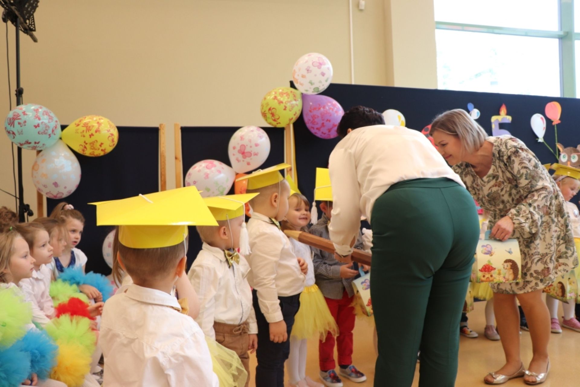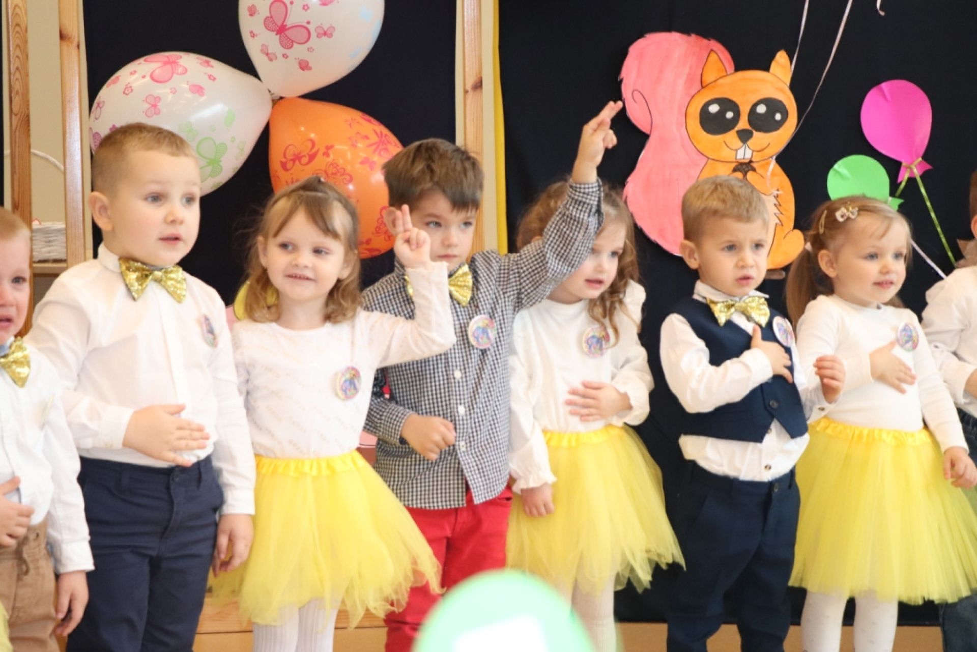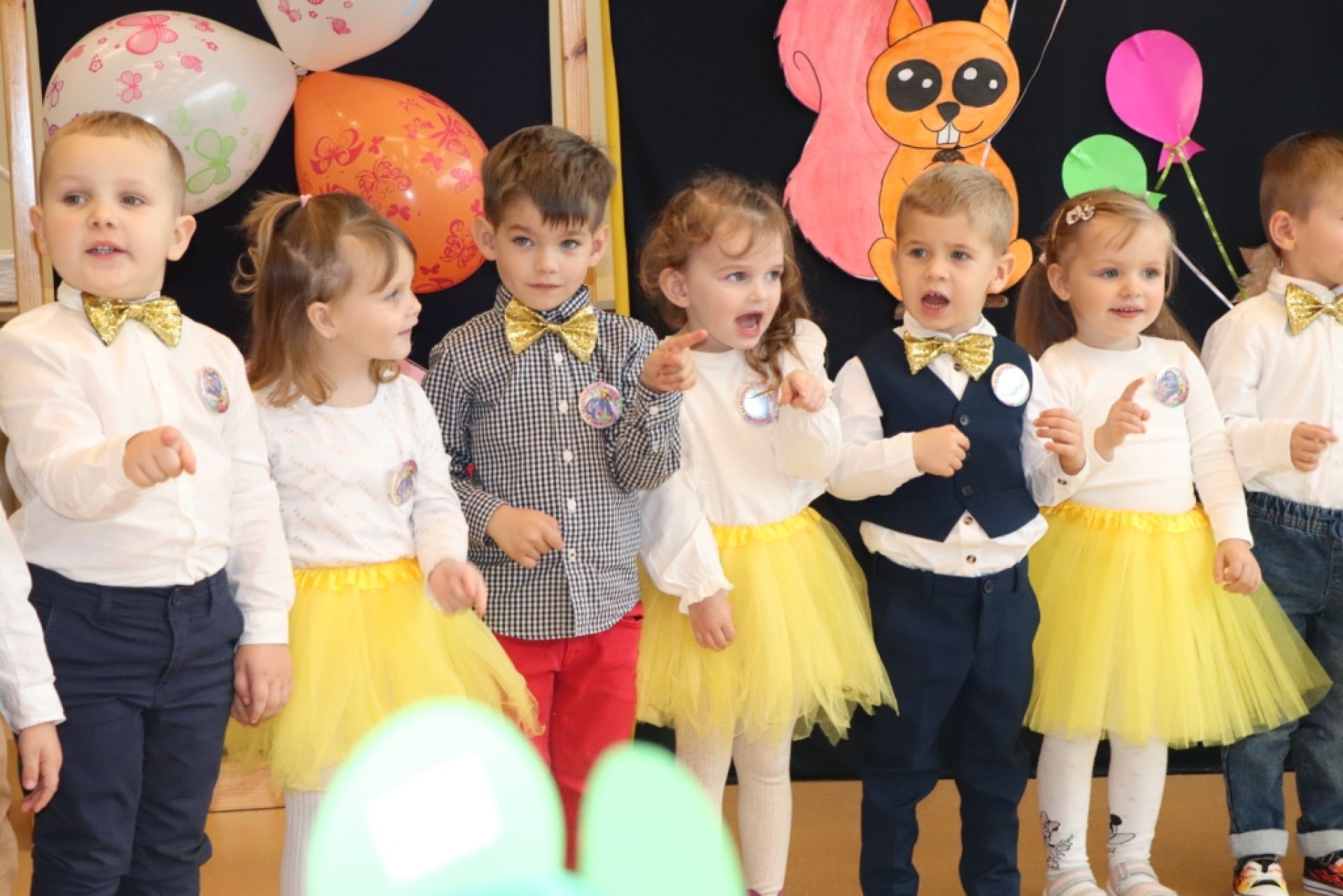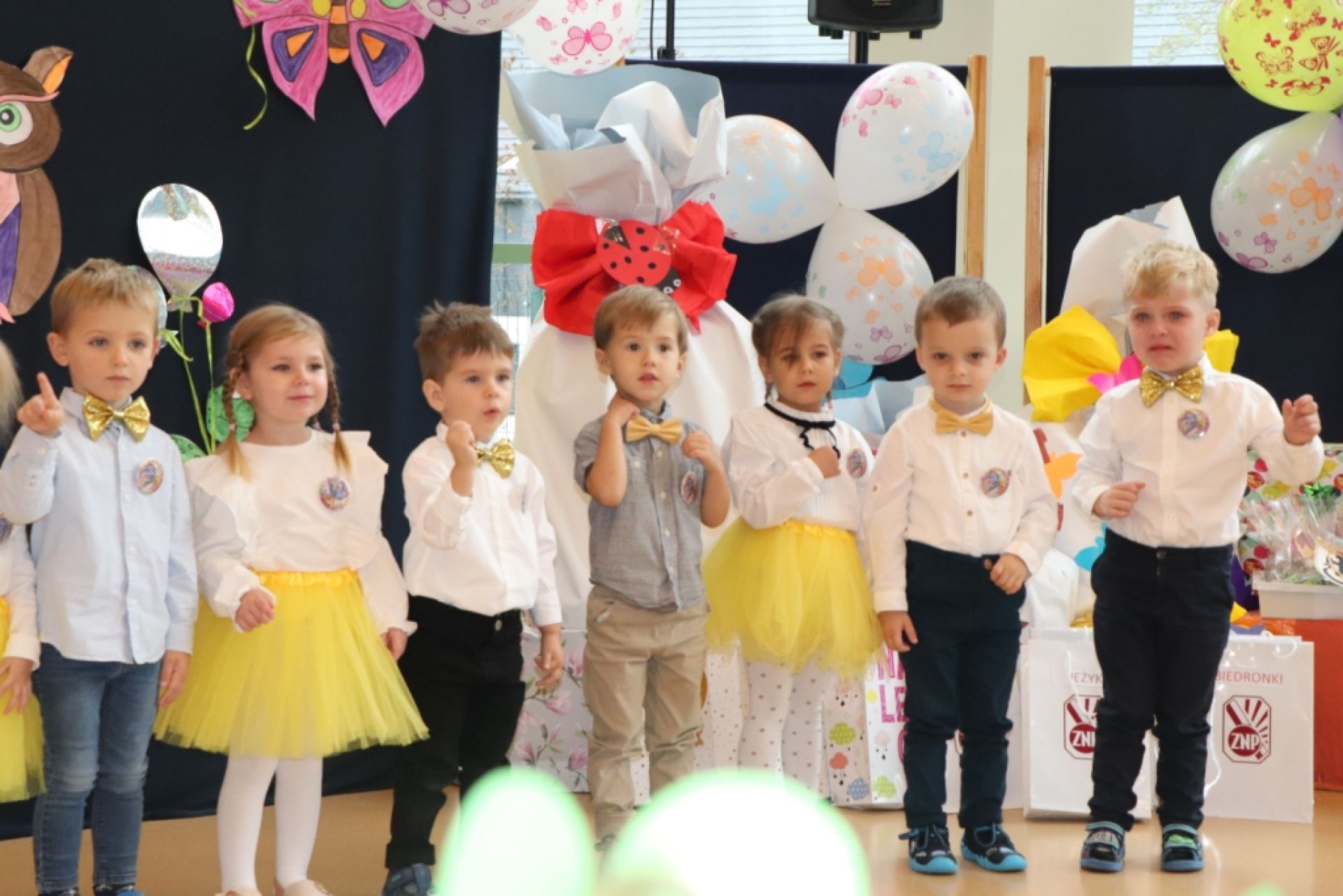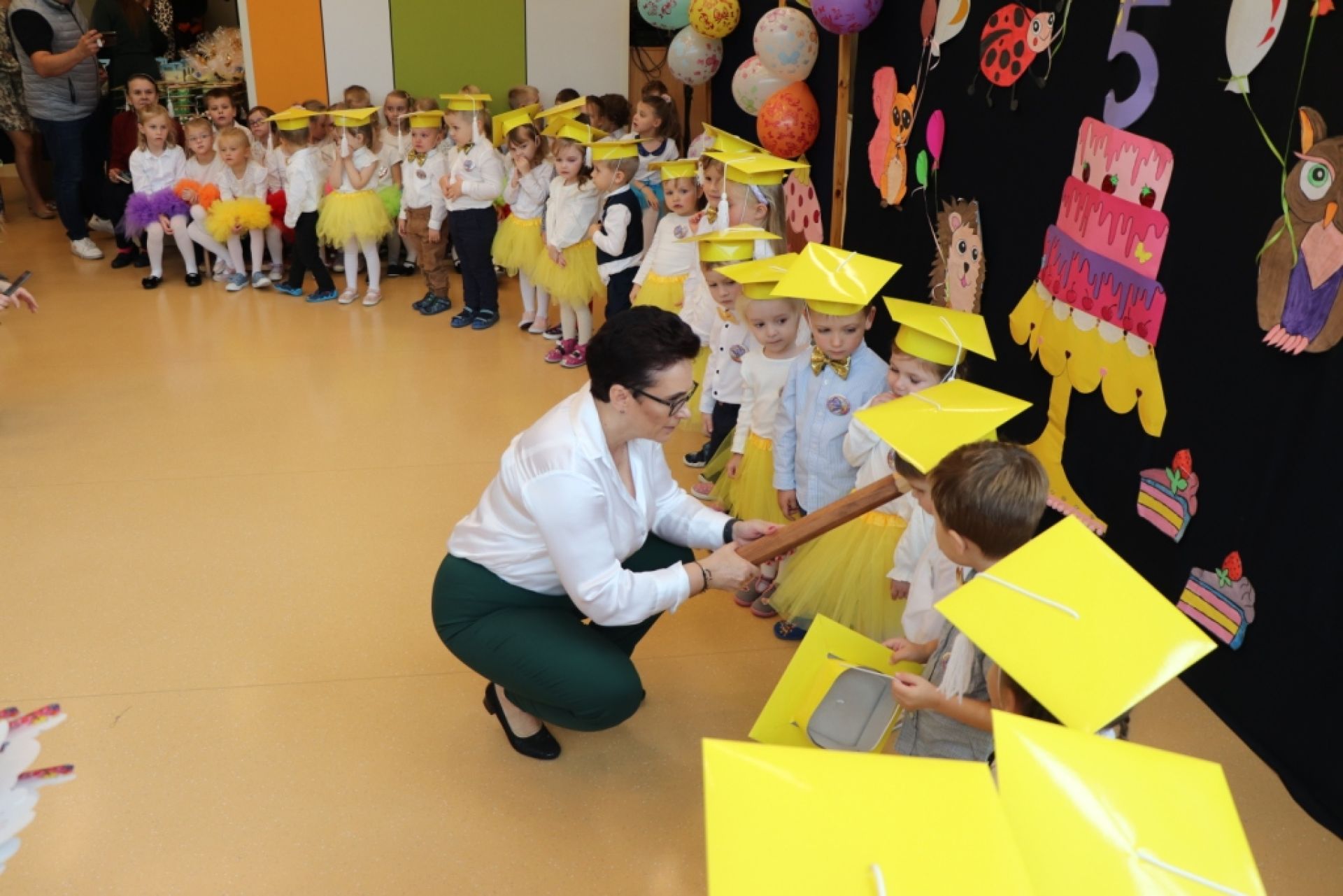Dnia 21 października 2022 r. świętowaliśmy Piąte urodziny naszego przedszkola. Przybyli do nas wspaniali goście i rodzice najmłodszych przedszkolaków. Z tej okazji wszystkie grupy zaprezentowały swoje umiejętności wokalno-taneczne. Tego właśnie dnia odbyło się również pasowanie na przedszkolaka Biedronek oraz Motylków. Maluszki zaprezentowały swoje umiejętności – dając tym samym dowód, jak dużo już potrafią. Po części artystycznej, dzieci obiecały: zgodnie bawić się w przedszkolu, przychodzić każdego dnia z uśmiechem, słuchać pani i pomagać kolegom, być dzielnym przedszkolakiem. Następnie pani dyrektor Barbara Mrugalska dokonała uroczystego pasowania każdego dziecka na przedszkolaka. Na pamiątkę tego ważnego wydarzenia każdy przedszkolak otrzymał dyplom pasowania, medal z symbolem Zucha Przedszkolaka oraz mały słodki upominek. Był również ogromny tort dla wszystkich gości i dzieci oraz prezenty dla każdej z grup. Wszystkim gościom towarzyszył na twarzy uśmiech, chociaż w niejednym oku pojawiły się łzy wzruszenia.