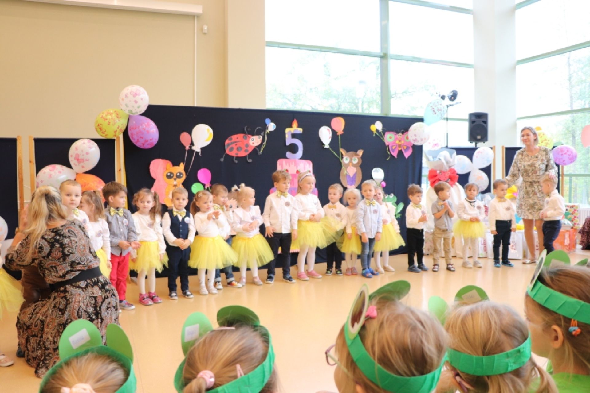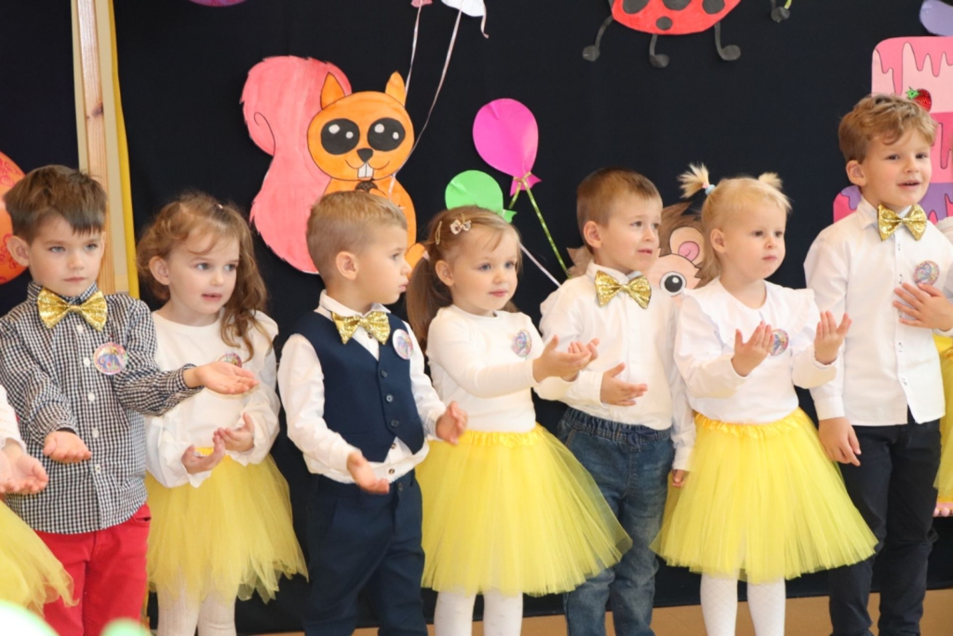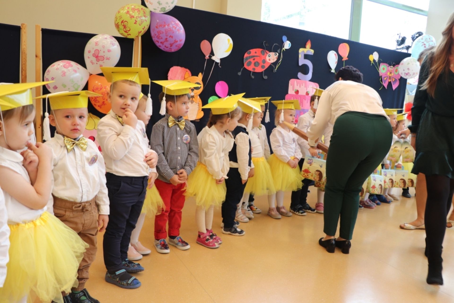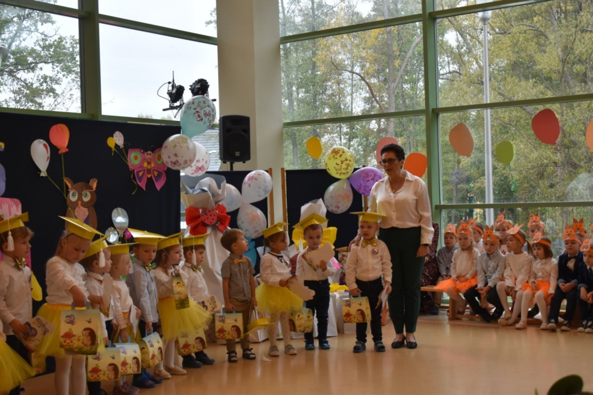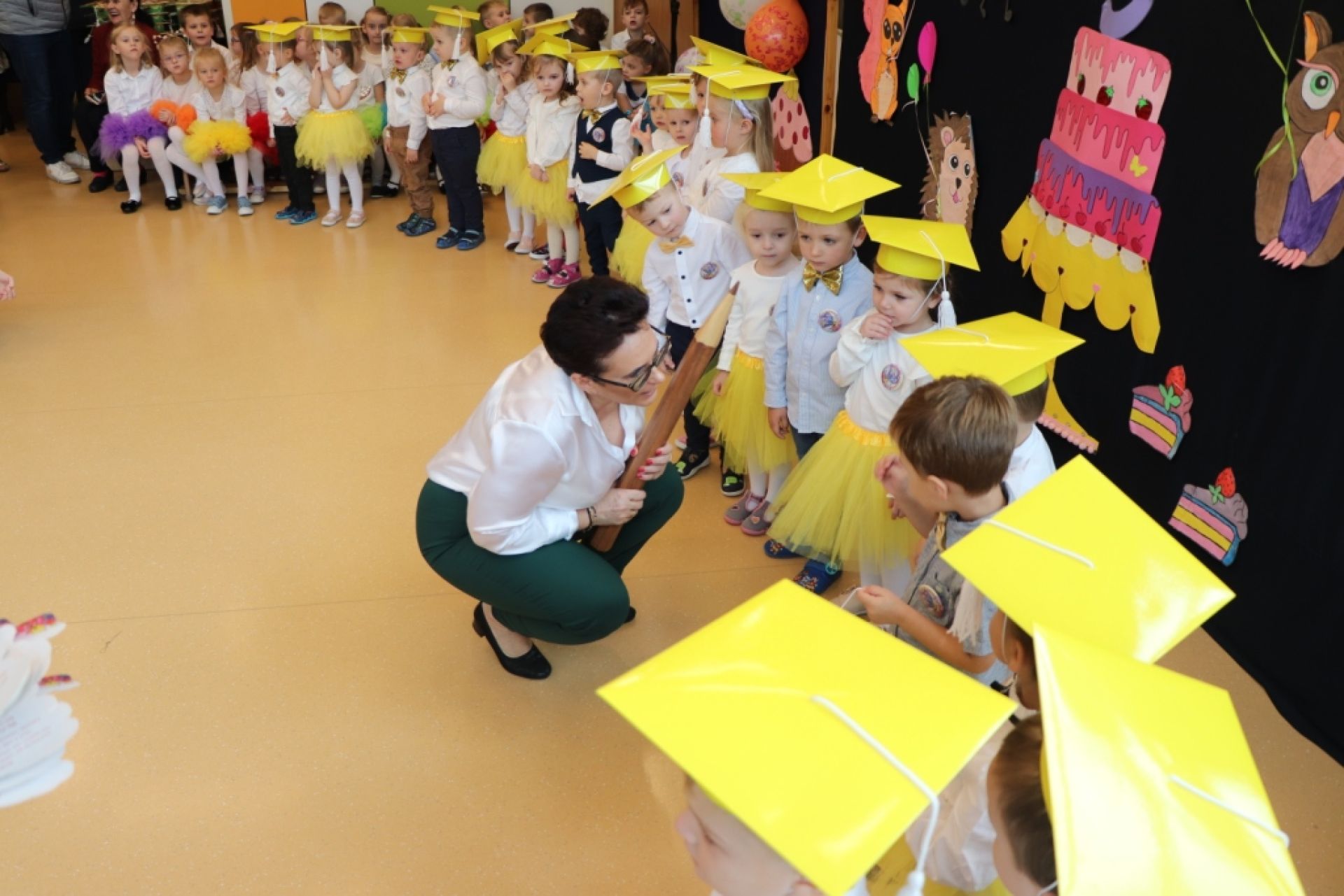Dnia 21 października 2022 r. świętowaliśmy Piąte urodziny naszego przedszkola. Przybyli do nas wspaniali goście i rodzice najmłodszych przedszkolaków. Z tej okazji wszystkie grupy zaprezentowały swoje umiejętności wokalno-taneczne. Tego właśnie dnia odbyło się również pasowanie na przedszkolaka Biedronek oraz Motylków. Maluszki zaprezentowały swoje umiejętności – dając tym samym dowód, jak dużo już potrafią. Po części artystycznej, dzieci obiecały: zgodnie bawić się w przedszkolu, przychodzić każdego dnia z uśmiechem, słuchać pani i pomagać kolegom, być dzielnym przedszkolakiem. Następnie pani dyrektor Barbara Mrugalska dokonała uroczystego pasowania każdego dziecka na przedszkolaka. Na pamiątkę tego ważnego wydarzenia każdy przedszkolak otrzymał dyplom pasowania, medal z symbolem Zucha Przedszkolaka oraz mały słodki upominek. Był również ogromny tort dla wszystkich gości i dzieci oraz prezenty dla każdej z grup. Wszystkim gościom towarzyszył na twarzy uśmiech, chociaż w niejednym oku pojawiły się łzy wzruszenia.
