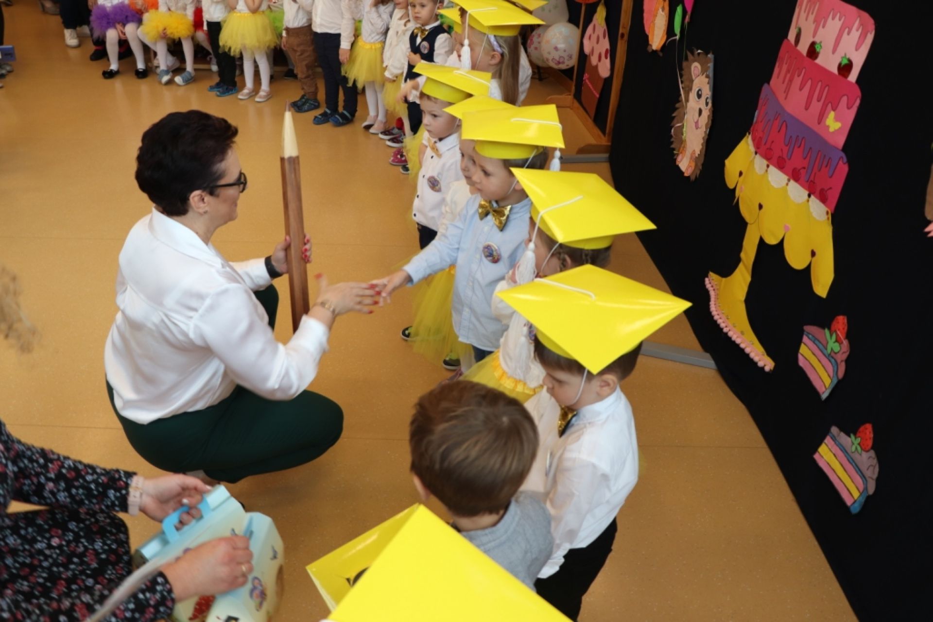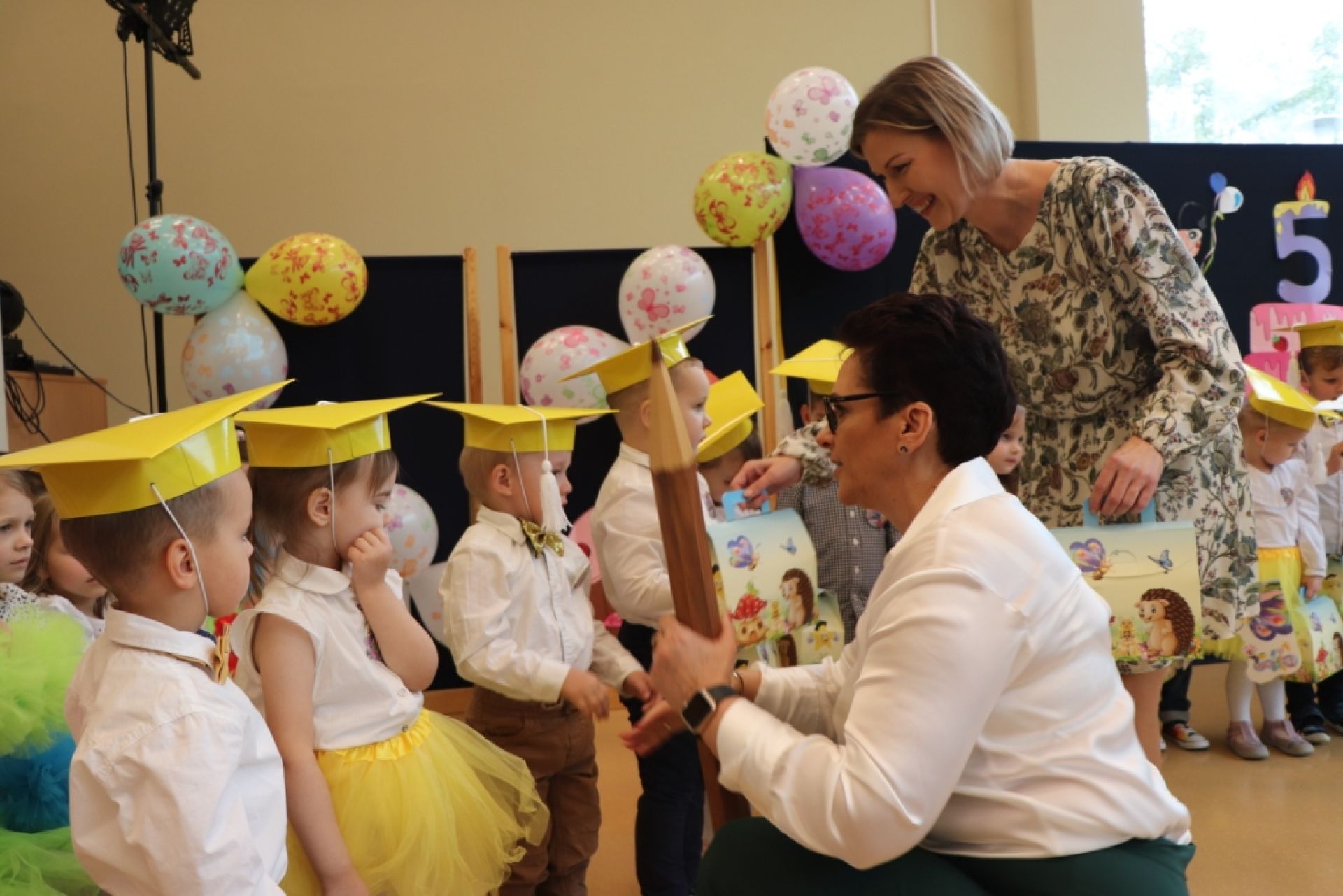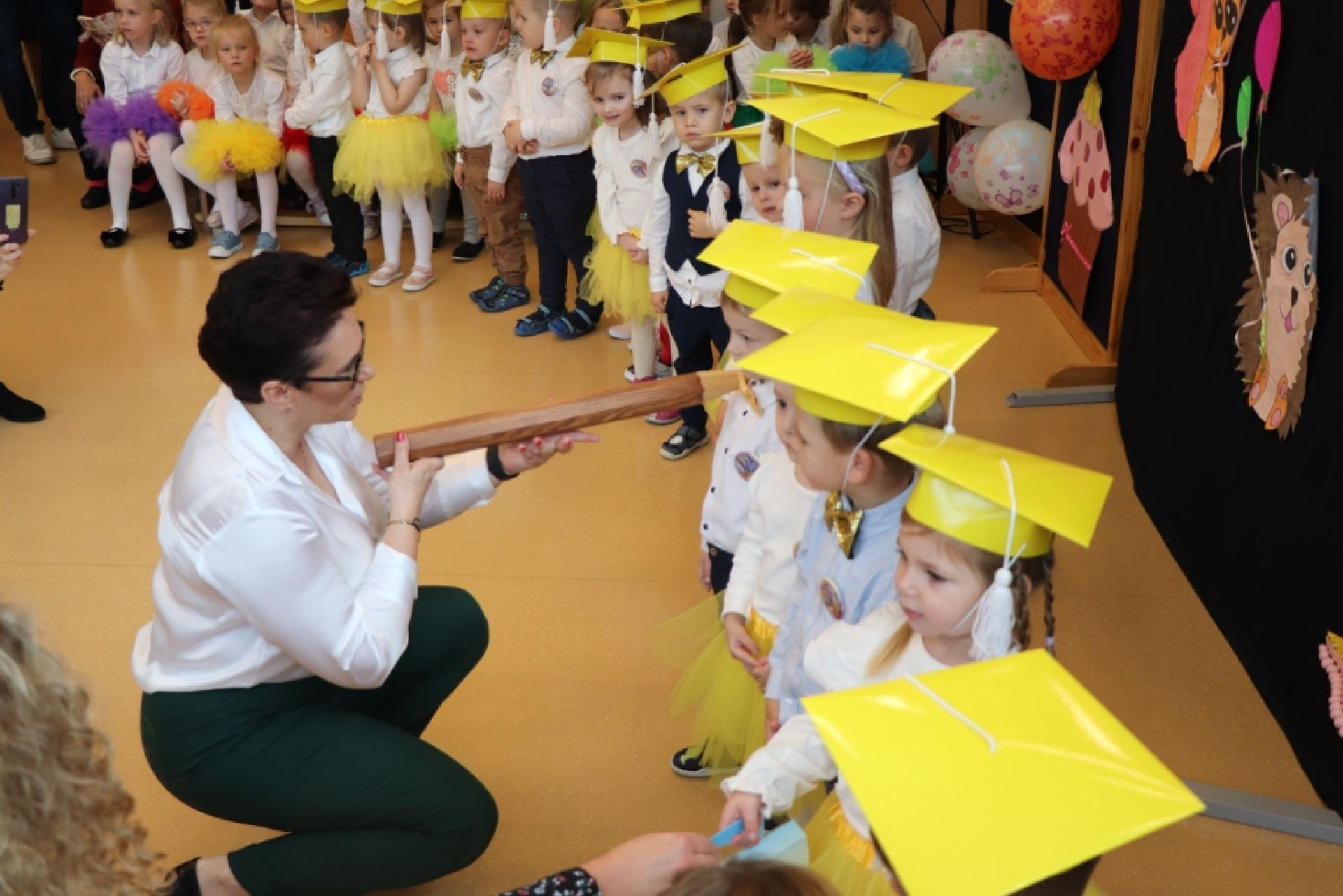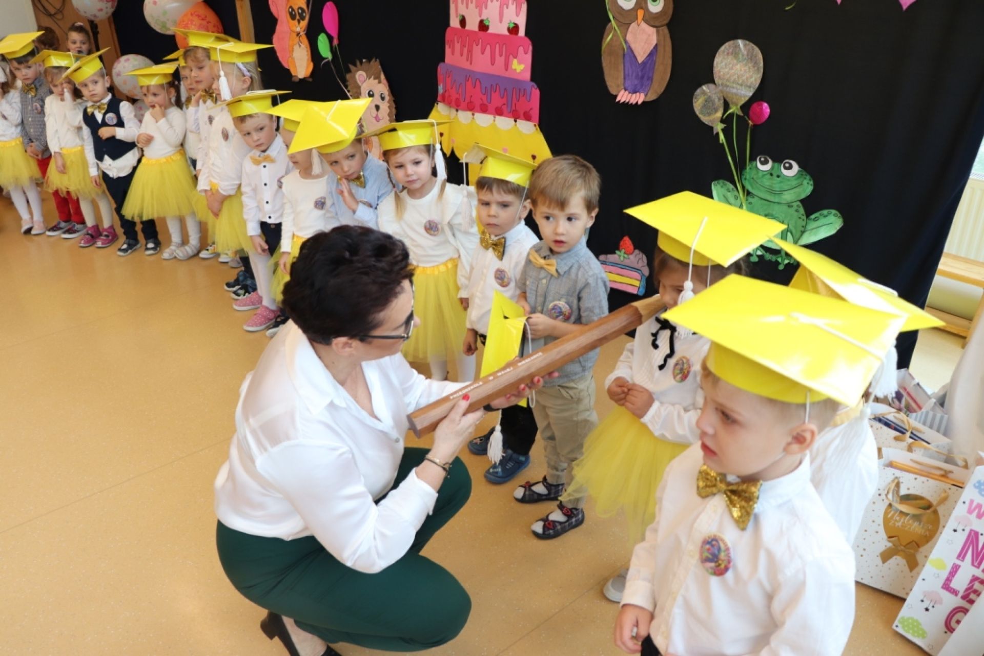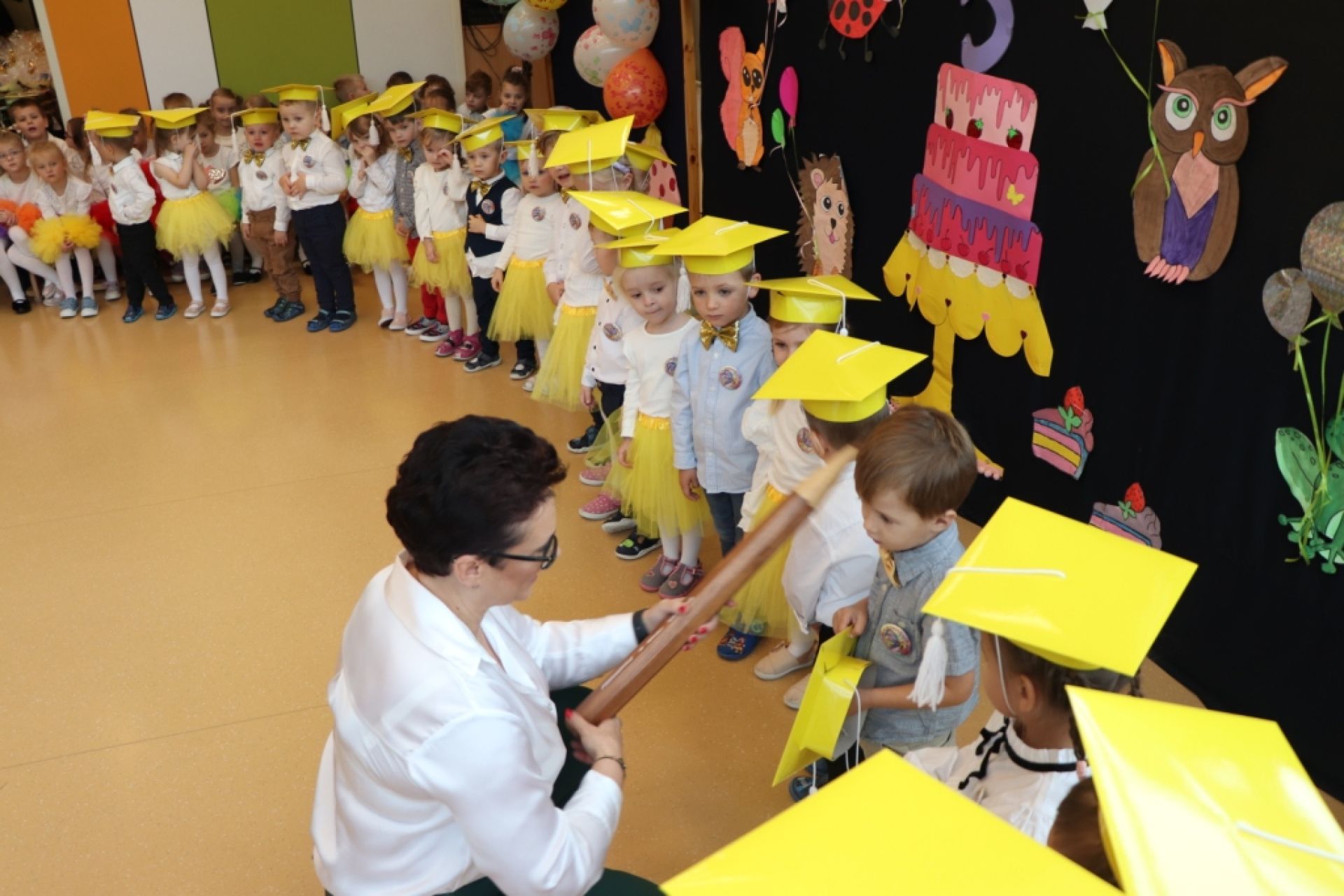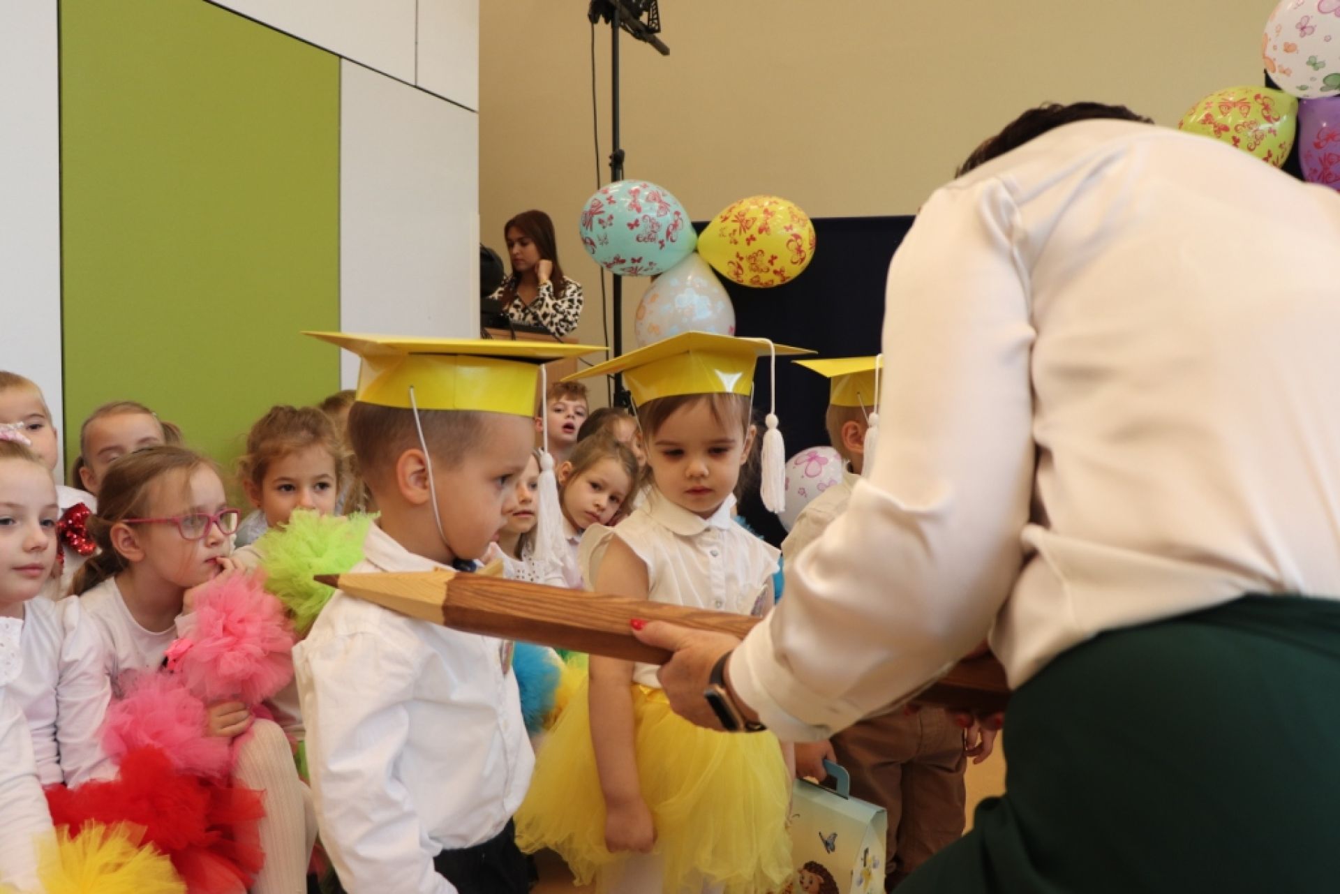 Dnia 21 października 2022 r. świętowaliśmy Piąte urodziny naszego przedszkola. Przybyli do nas wspaniali goście i rodzice najmłodszych przedszkolaków. Z tej okazji wszystkie grupy zaprezentowały swoje umiejętności wokalno-taneczne. Tego właśnie dnia odbyło się również pasowanie na przedszkolaka Biedronek oraz Motylków. Maluszki zaprezentowały swoje umiejętności – dając tym samym dowód, jak dużo już potrafią. Po części artystycznej, dzieci obiecały: zgodnie bawić się w przedszkolu, przychodzić każdego dnia z uśmiechem, słuchać pani i pomagać kolegom, być dzielnym przedszkolakiem. Następnie pani dyrektor Barbara Mrugalska dokonała uroczystego pasowania każdego dziecka na przedszkolaka. Na pamiątkę tego ważnego wydarzenia każdy przedszkolak otrzymał dyplom pasowania, medal z symbolem Zucha Przedszkolaka oraz mały słodki upominek. Był również ogromny tort dla wszystkich gości i dzieci oraz prezenty dla każdej z grup. Wszystkim gościom towarzyszył na twarzy uśmiech, chociaż w niejednym oku pojawiły się łzy wzruszenia.