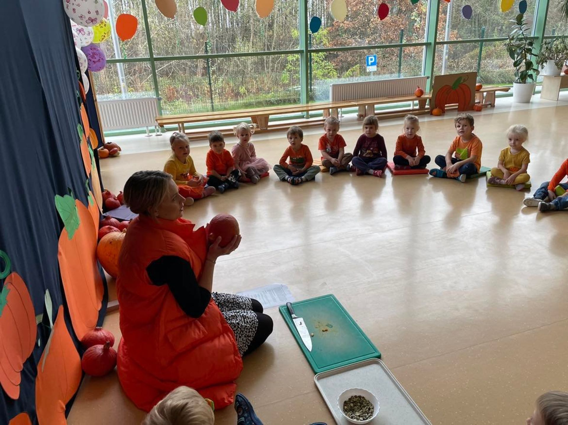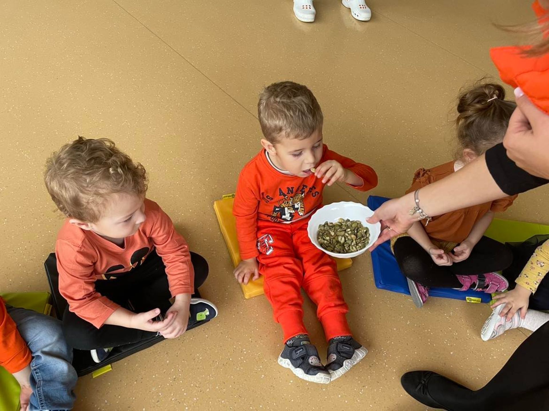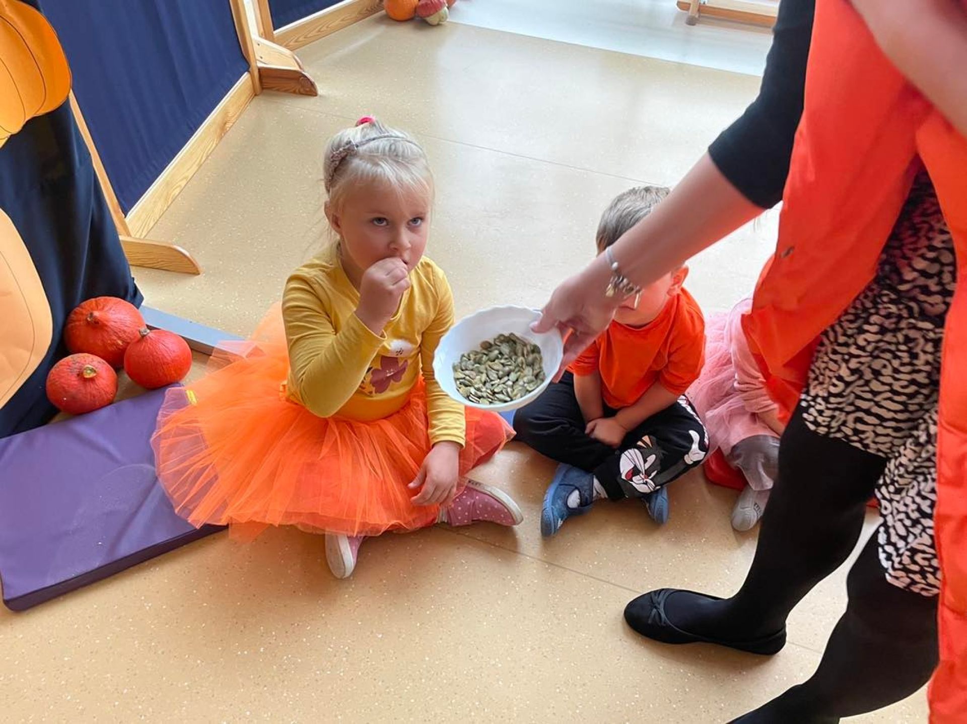 W dniu dzisiejszym obchodziliśmy w naszym przedszkolu dzień dyni. Dzieci dowiedziały się jakie wartości odżywcze ma dynia i co kryje w środku. Dzieci brały udział w licznych zabawach z akcentem dyniowym . Na zakonczenie tego uroczego dnia wszystkie dzieci robiły ciasteczka dyniowe , które zabrały do domów. Był to bardzo udany dzień .