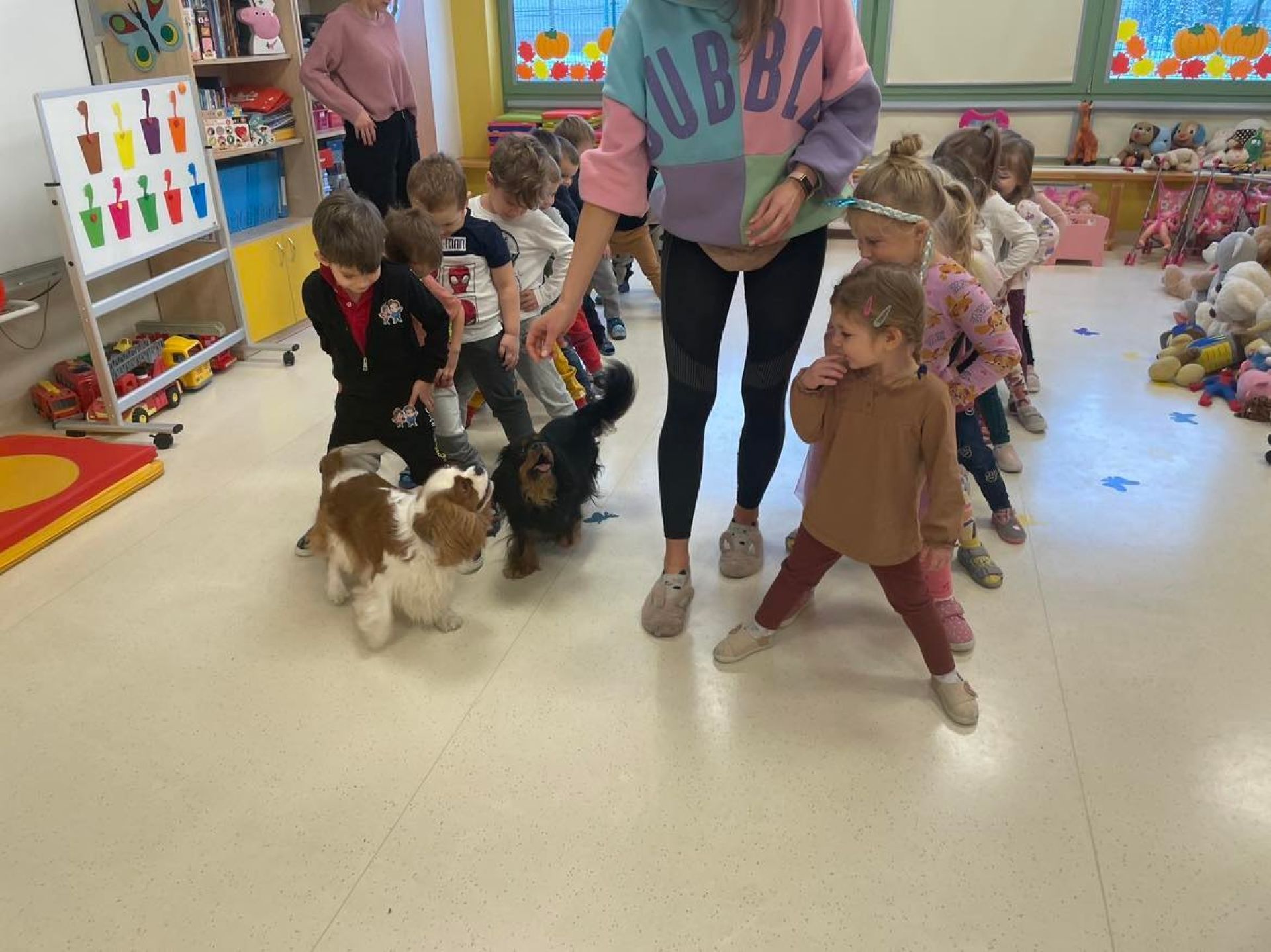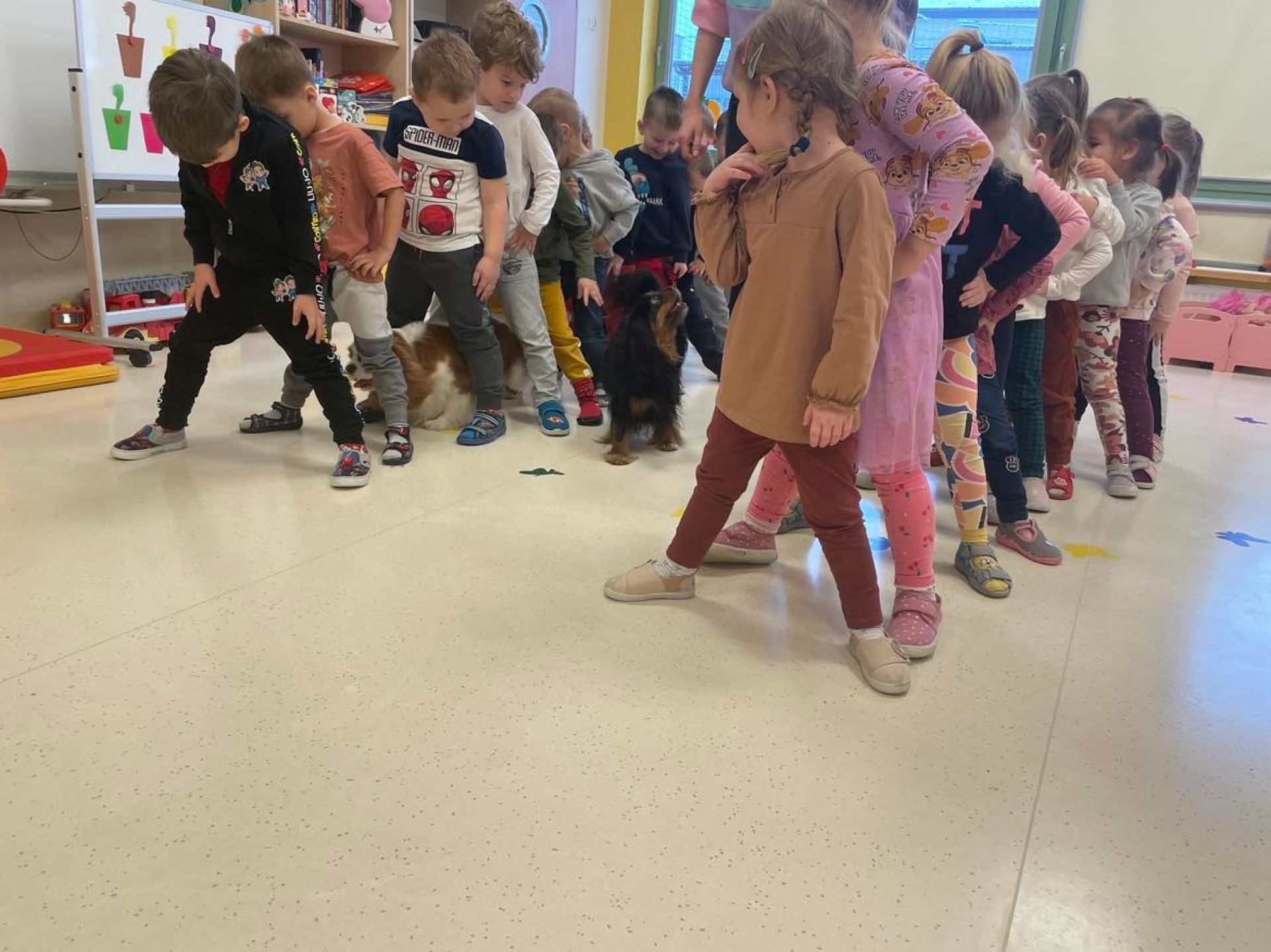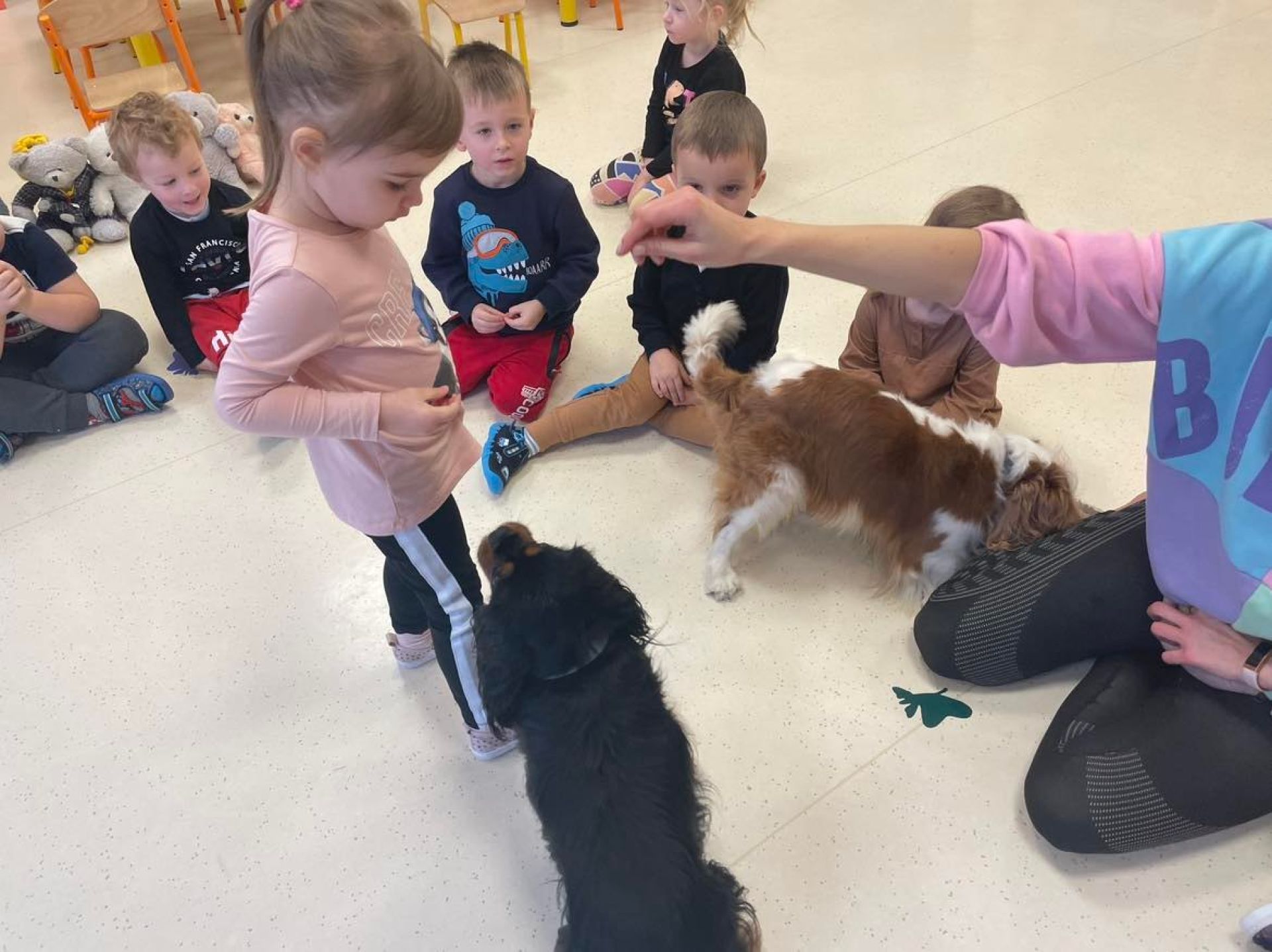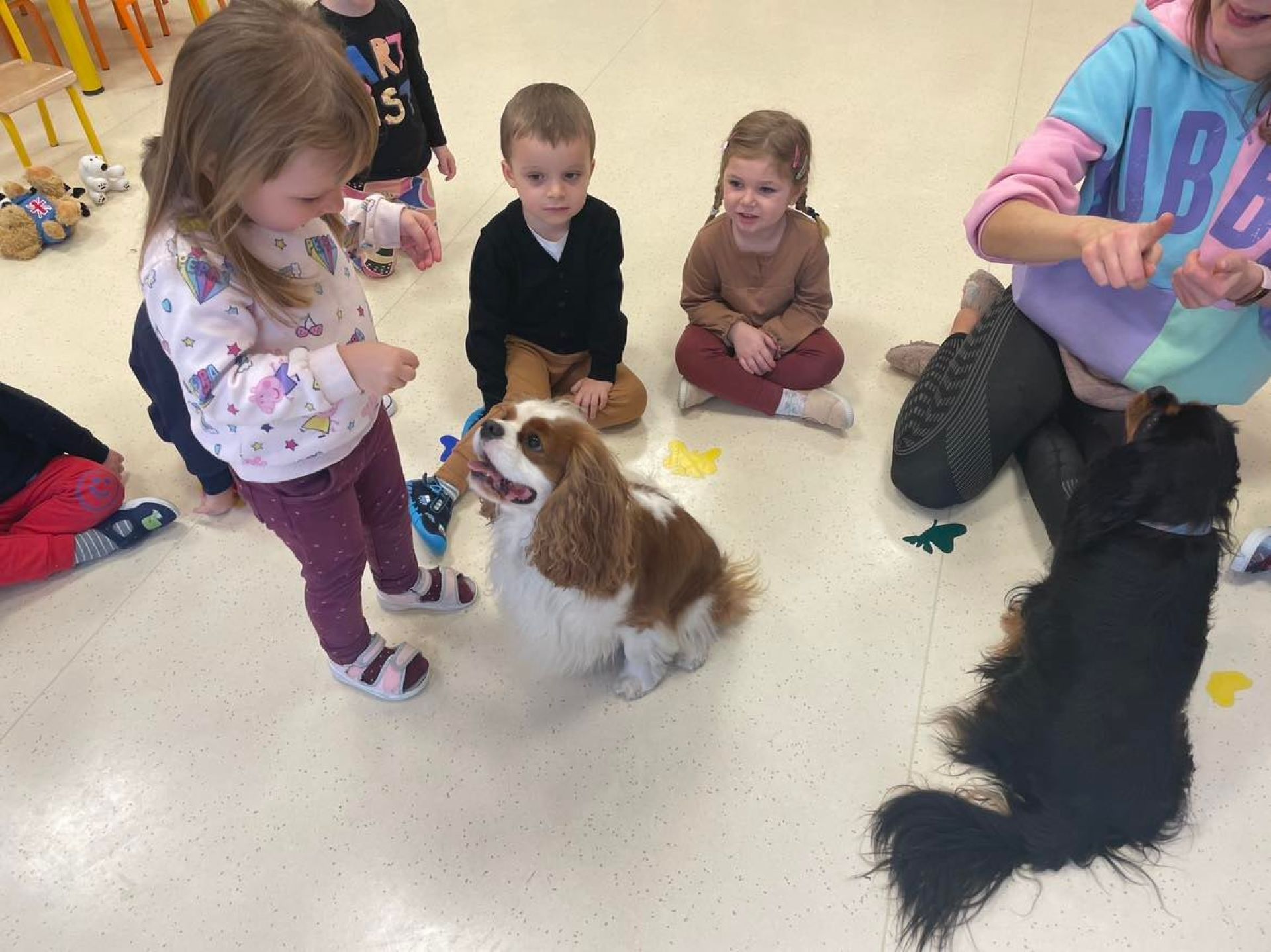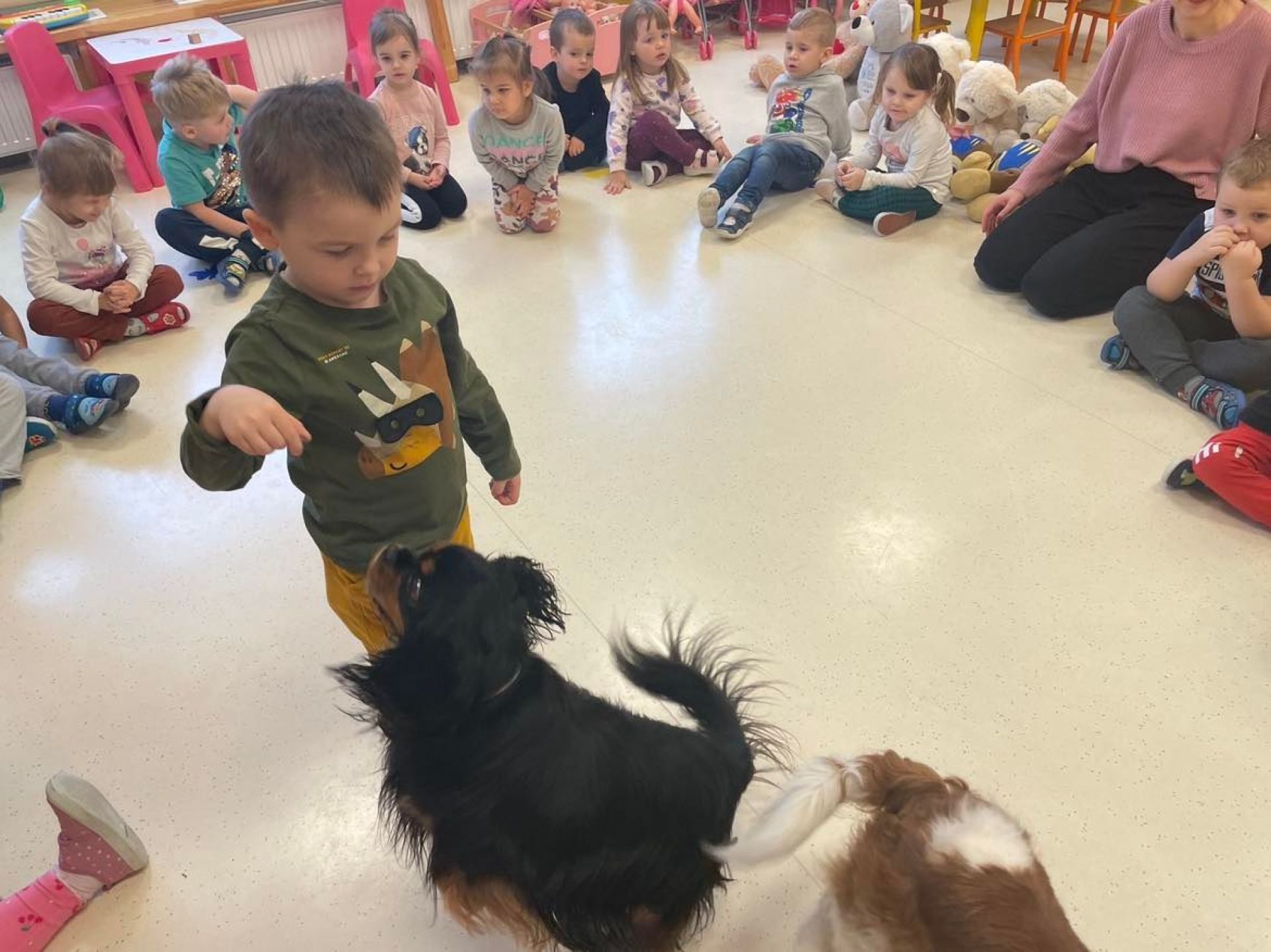 Dziś był dzień pełen atrakcji. Obchodziliśmy dzień pluszowego misia , dzieci przyniosły swoje misie z którymi mogły bawić się i je dekorować. Motylki uczestniczyły również w zabawach o tematyce misiowej . Następnie odwiedziły nas pieski Koko i Karmel z którymi dzieci mogły bliżej  zapoznać się. Dzieci poznały najważniejsze  zasady dotyczące bezpiecznego kontaktu z psami. Wspólnie się bawiły i nabywały śmiałości w kontaktach z zwierzętami.