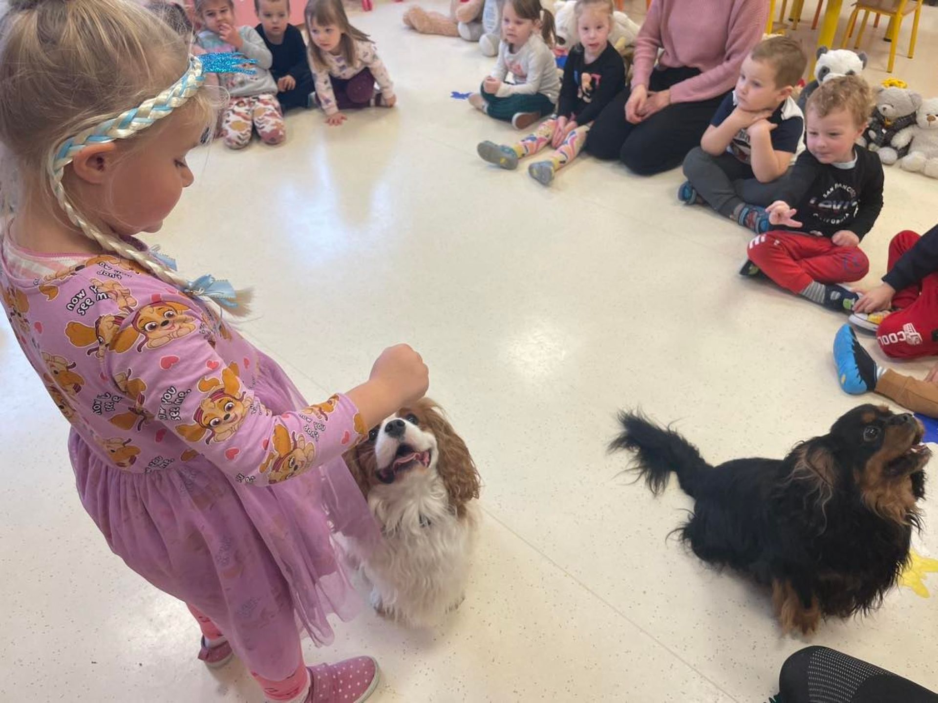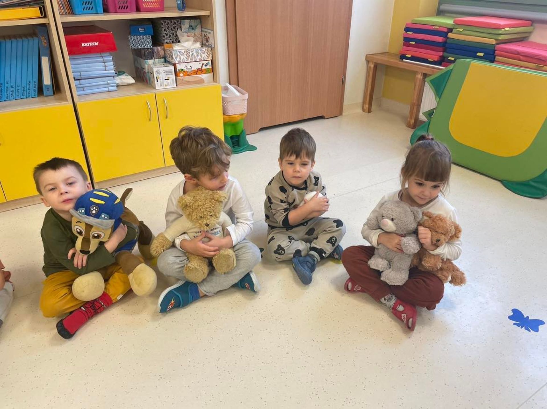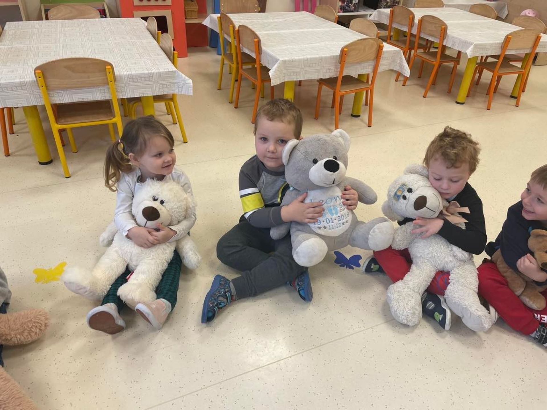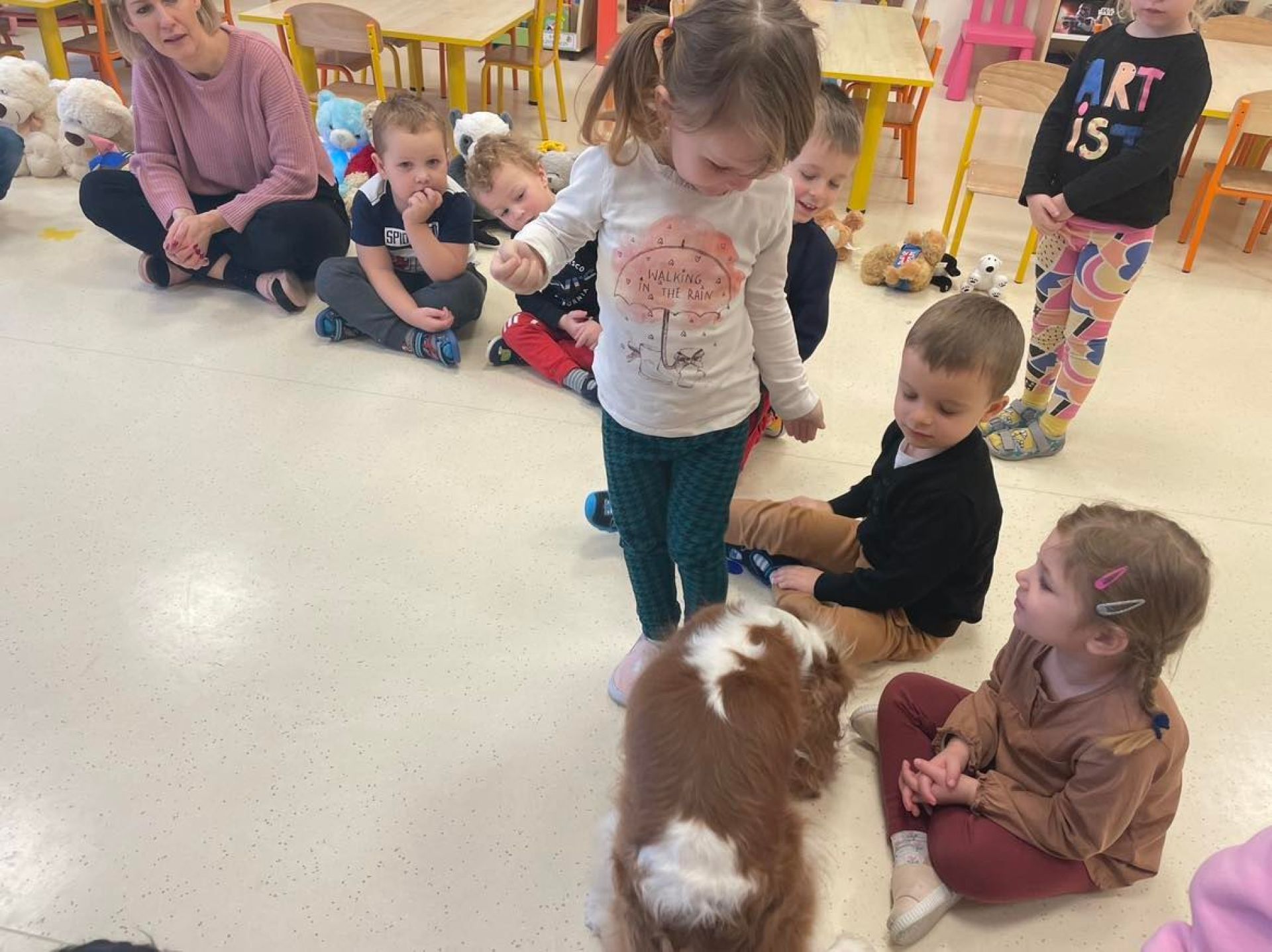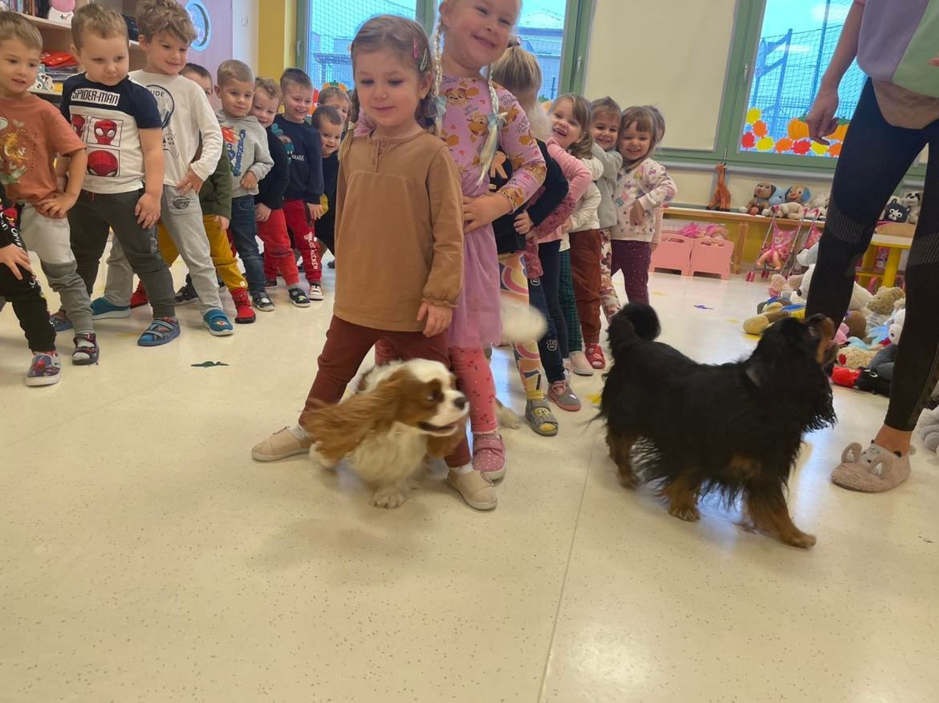 Dziś był dzień pełen atrakcji. Obchodziliśmy dzień pluszowego misia , dzieci przyniosły swoje misie z którymi mogły bawić się i je dekorować. Motylki uczestniczyły również w zabawach o tematyce misiowej . Następnie odwiedziły nas pieski Koko i Karmel z którymi dzieci mogły bliżej  zapoznać się. Dzieci poznały najważniejsze  zasady dotyczące bezpiecznego kontaktu z psami. Wspólnie się bawiły i nabywały śmiałości w kontaktach z zwierzętami.