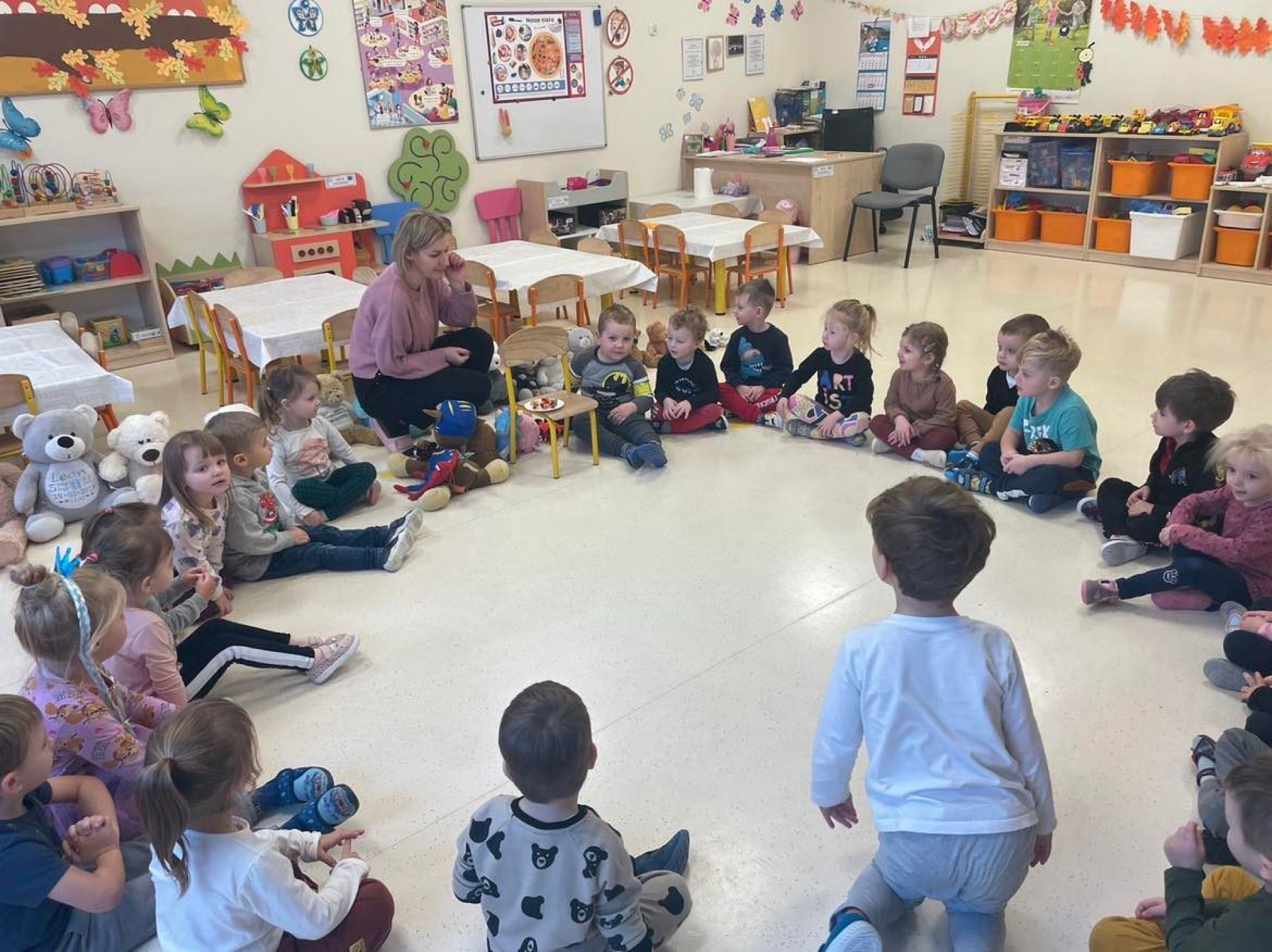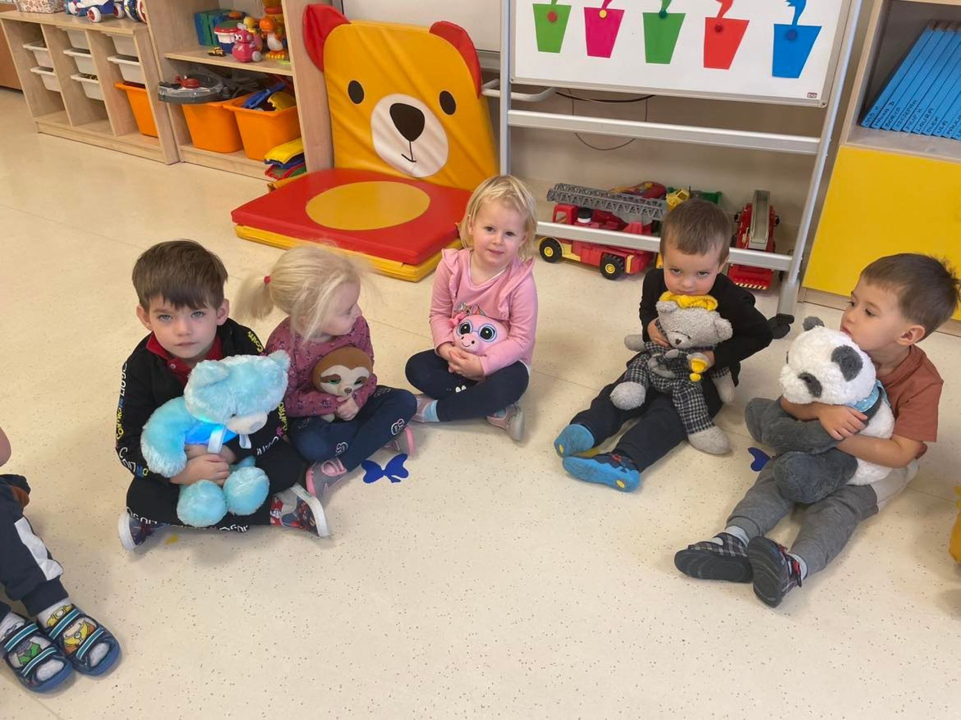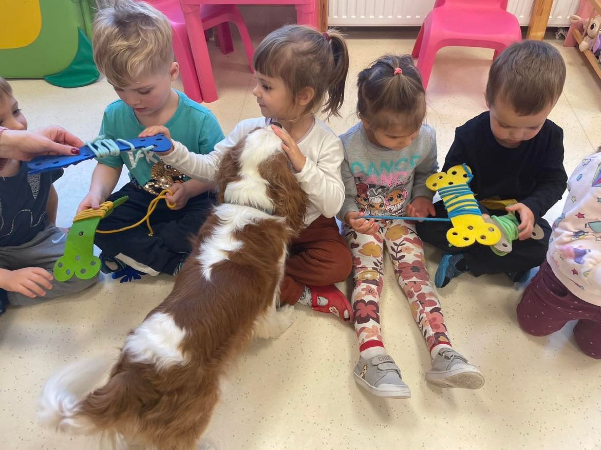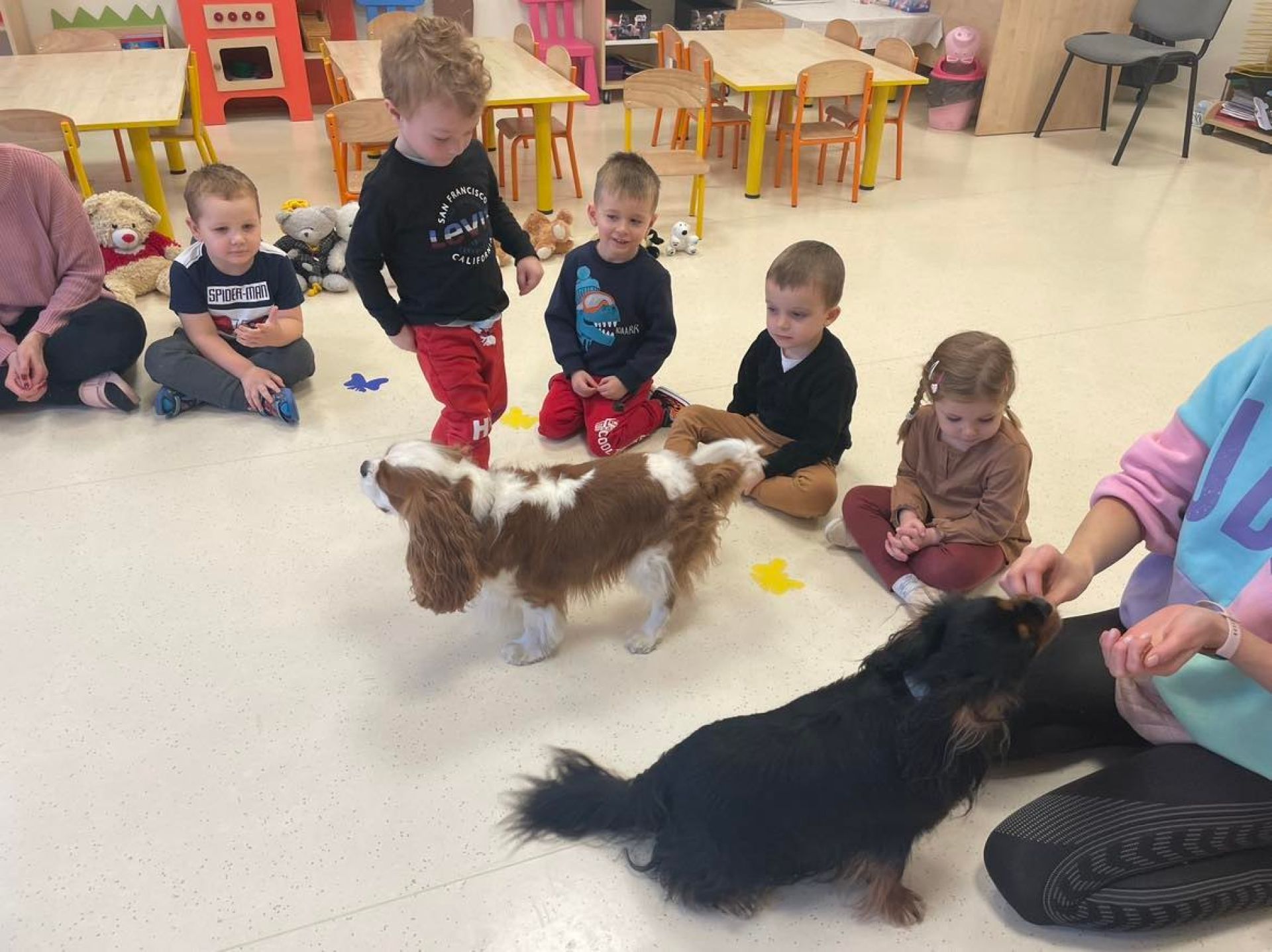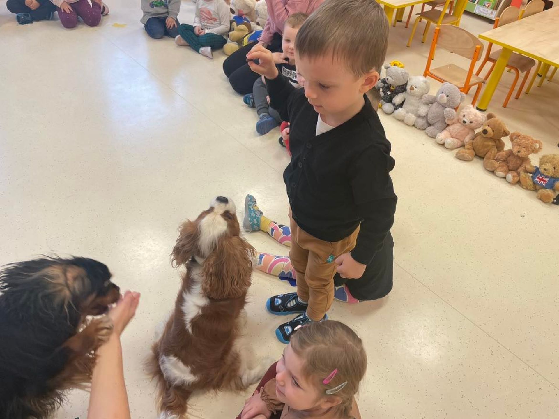 Dziś był dzień pełen atrakcji. Obchodziliśmy dzień pluszowego misia , dzieci przyniosły swoje misie z którymi mogły bawić się i je dekorować. Motylki uczestniczyły również w zabawach o tematyce misiowej . Następnie odwiedziły nas pieski Koko i Karmel z którymi dzieci mogły bliżej  zapoznać się. Dzieci poznały najważniejsze  zasady dotyczące bezpiecznego kontaktu z psami. Wspólnie się bawiły i nabywały śmiałości w kontaktach z zwierzętami.