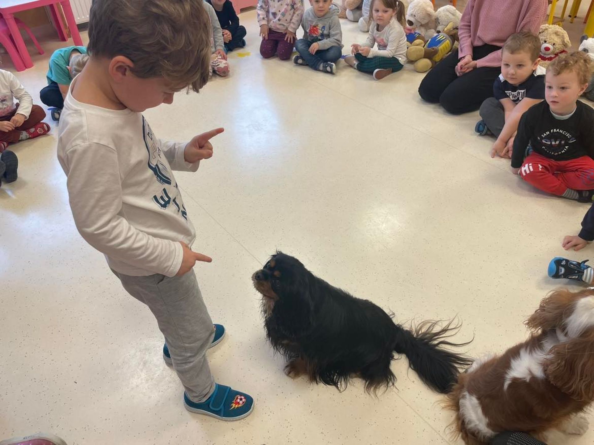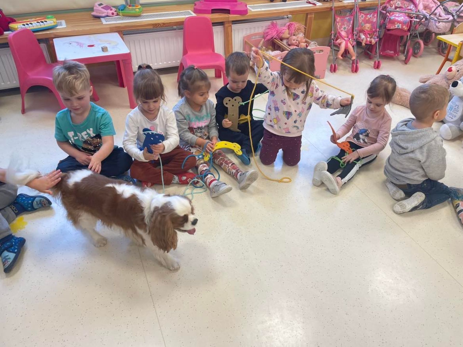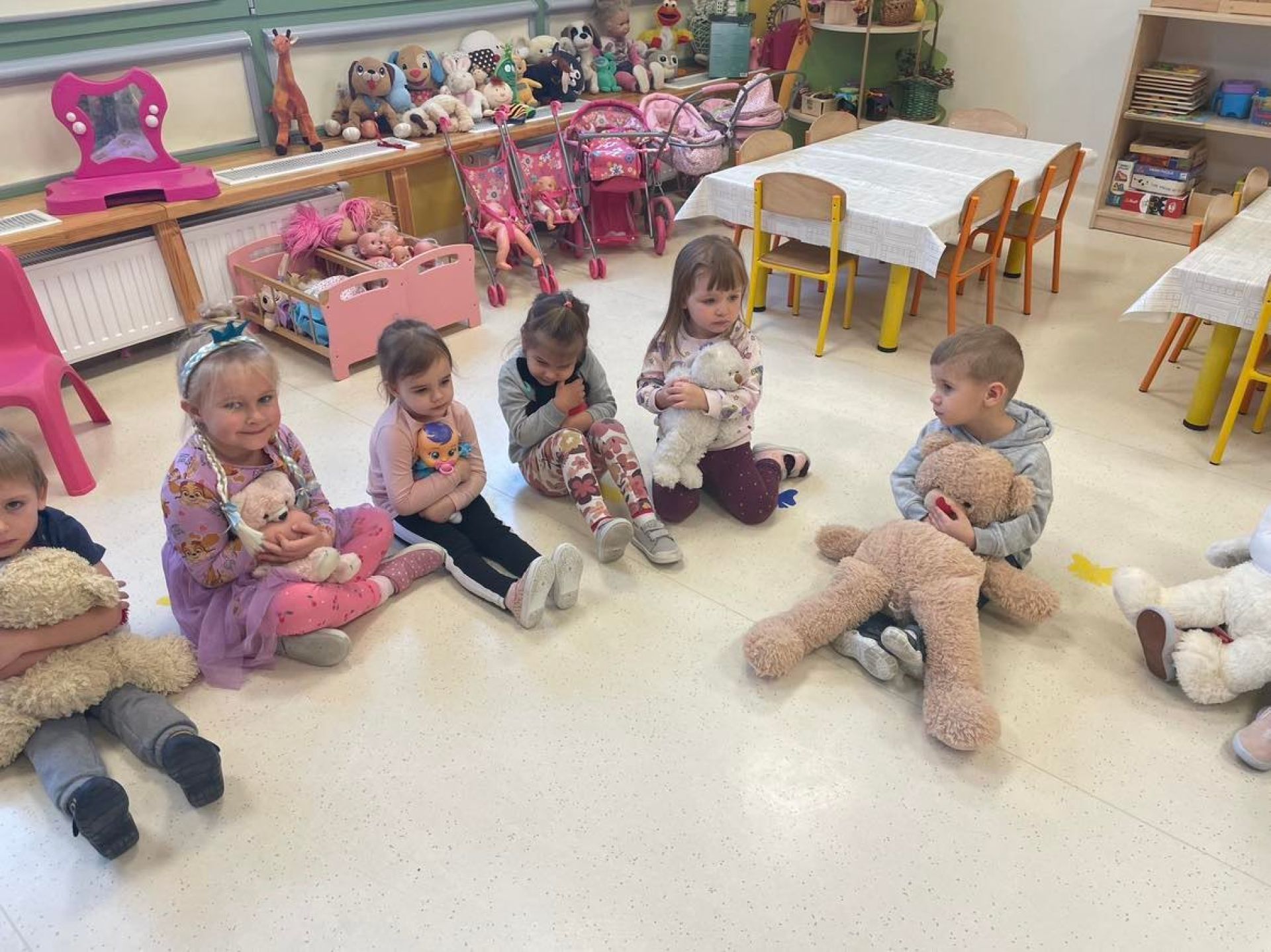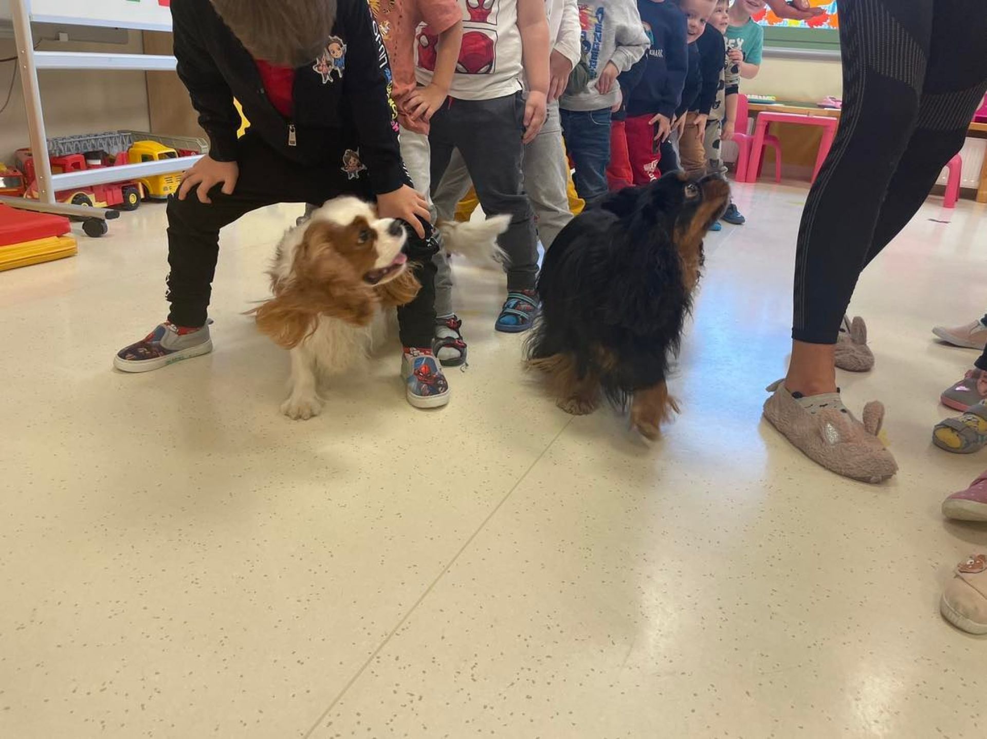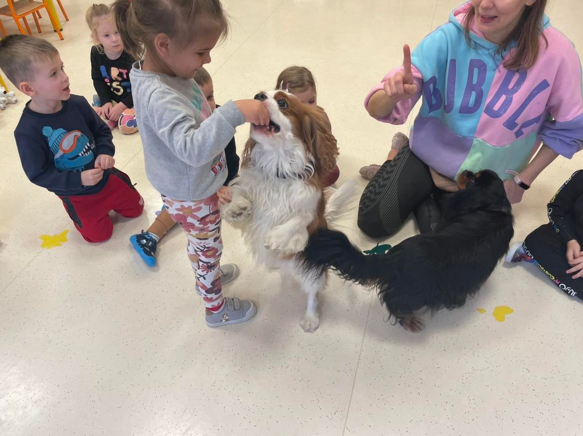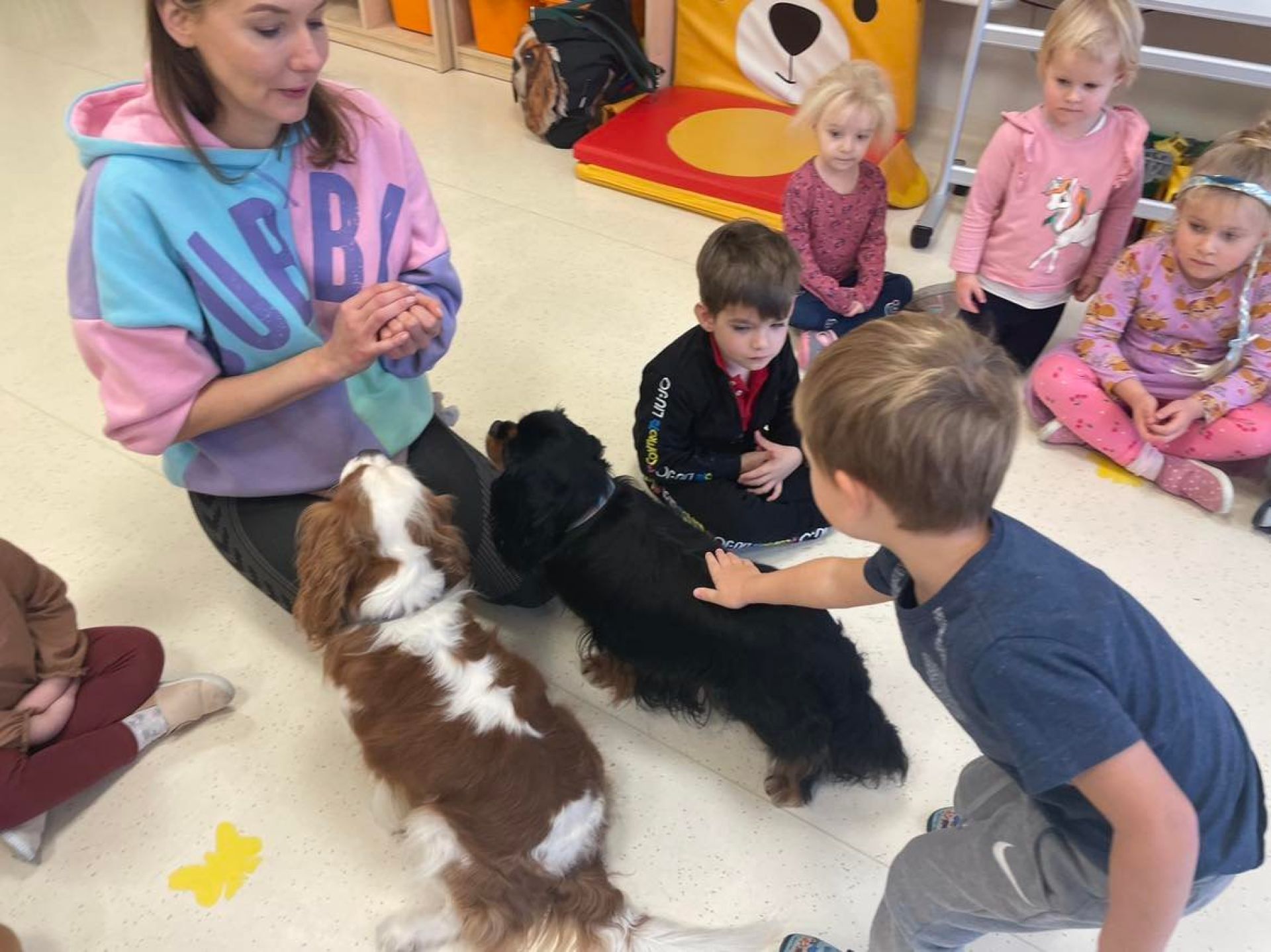 Dziś był dzień pełen atrakcji. Obchodziliśmy dzień pluszowego misia , dzieci przyniosły swoje misie z którymi mogły bawić się i je dekorować. Motylki uczestniczyły również w zabawach o tematyce misiowej . Następnie odwiedziły nas pieski Koko i Karmel z którymi dzieci mogły bliżej  zapoznać się. Dzieci poznały najważniejsze  zasady dotyczące bezpiecznego kontaktu z psami. Wspólnie się bawiły i nabywały śmiałości w kontaktach z zwierzętami.