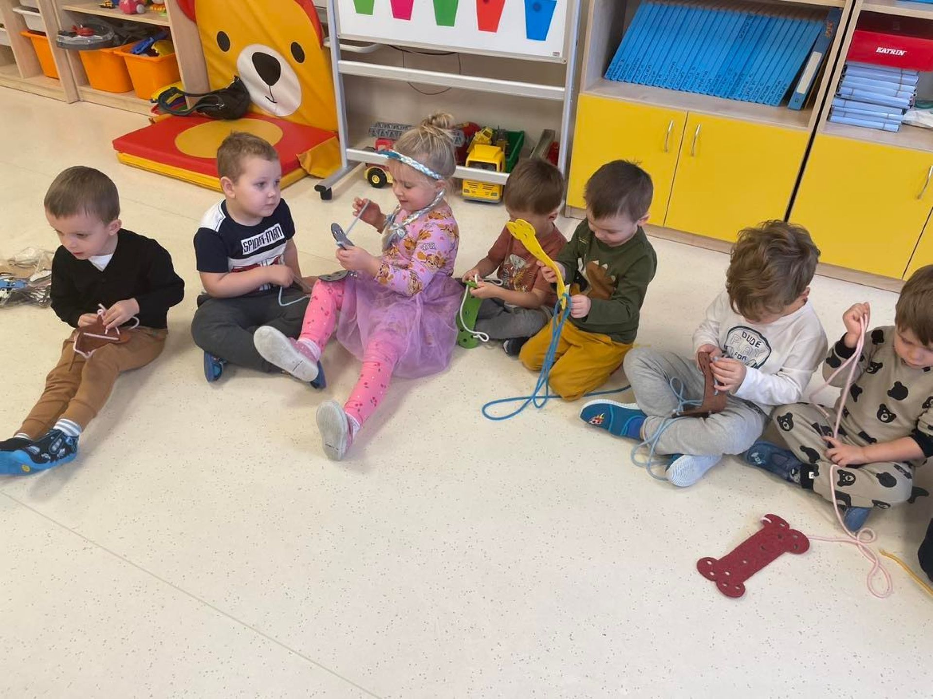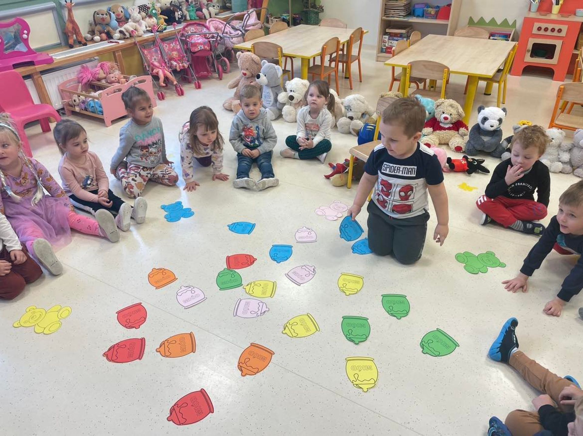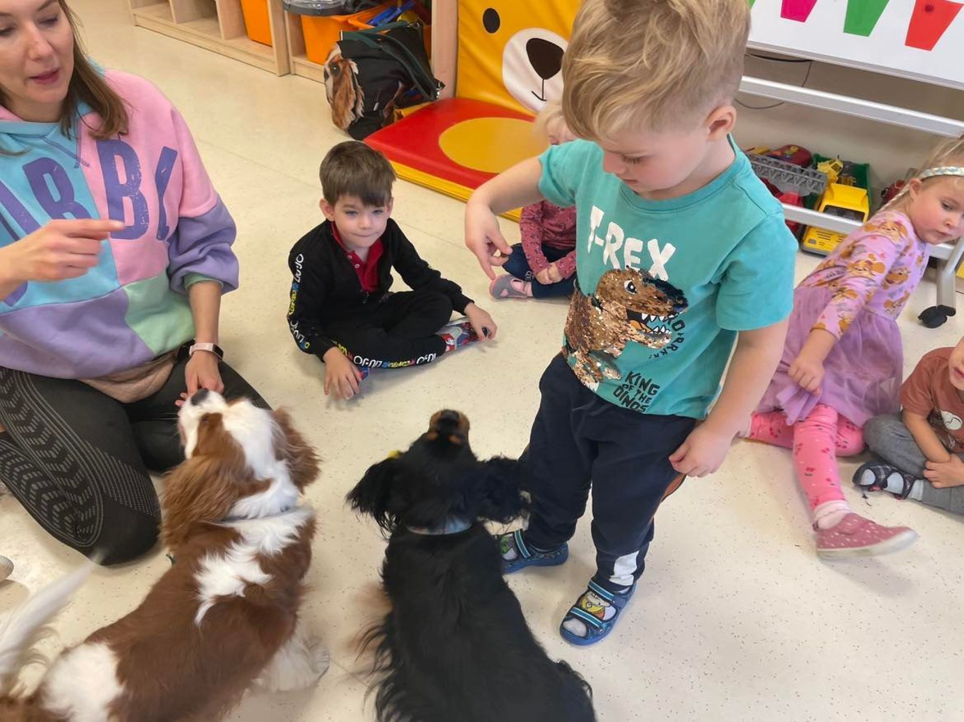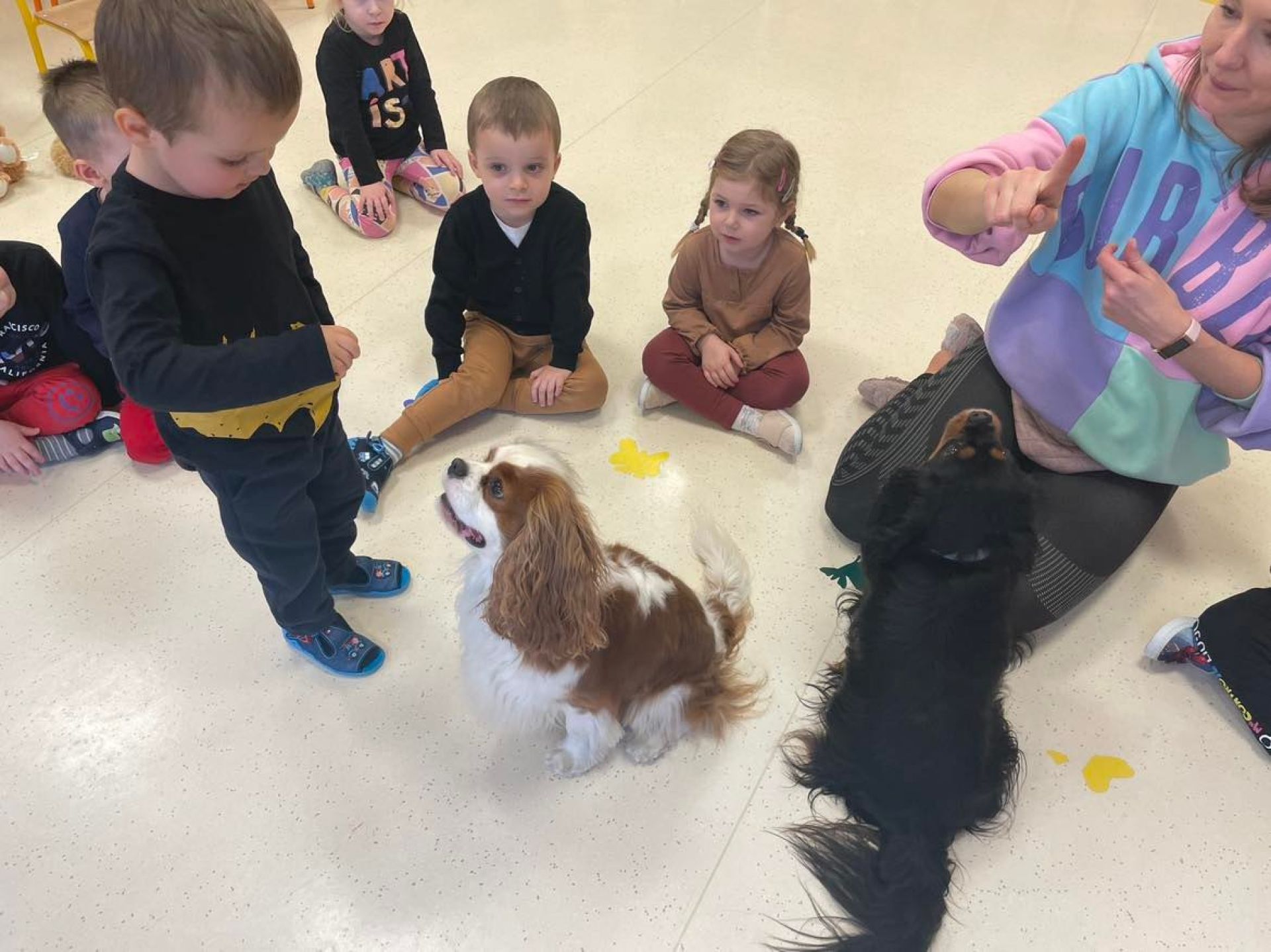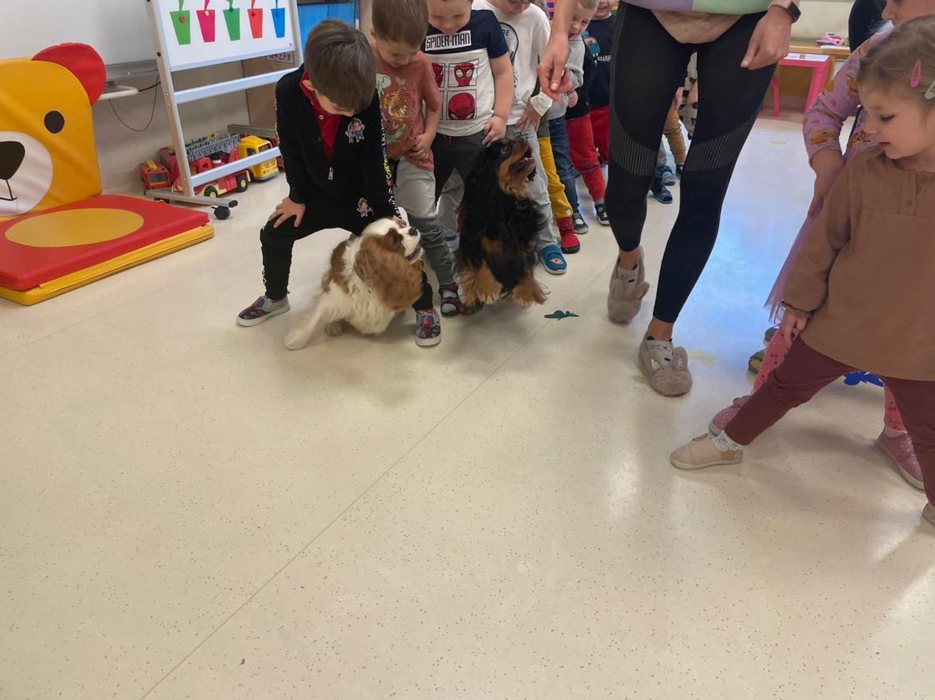 Dziś był dzień pełen atrakcji. Obchodziliśmy dzień pluszowego misia , dzieci przyniosły swoje misie z którymi mogły bawić się i je dekorować. Motylki uczestniczyły również w zabawach o tematyce misiowej . Następnie odwiedziły nas pieski Koko i Karmel z którymi dzieci mogły bliżej  zapoznać się. Dzieci poznały najważniejsze  zasady dotyczące bezpiecznego kontaktu z psami. Wspólnie się bawiły i nabywały śmiałości w kontaktach z zwierzętami.