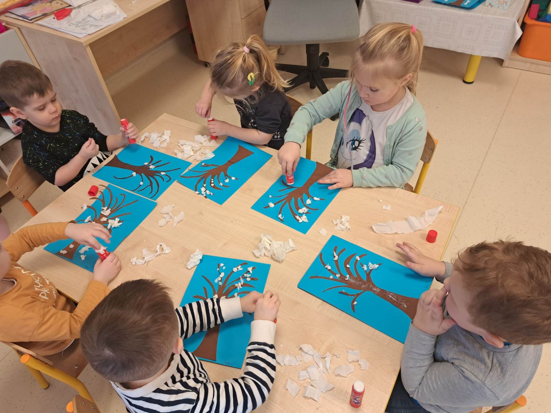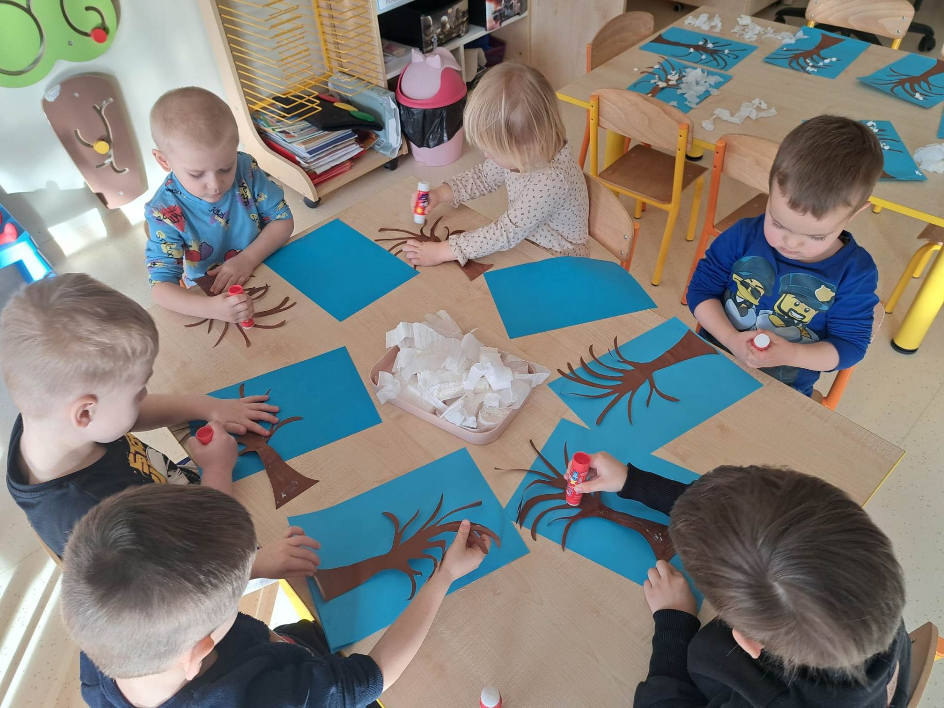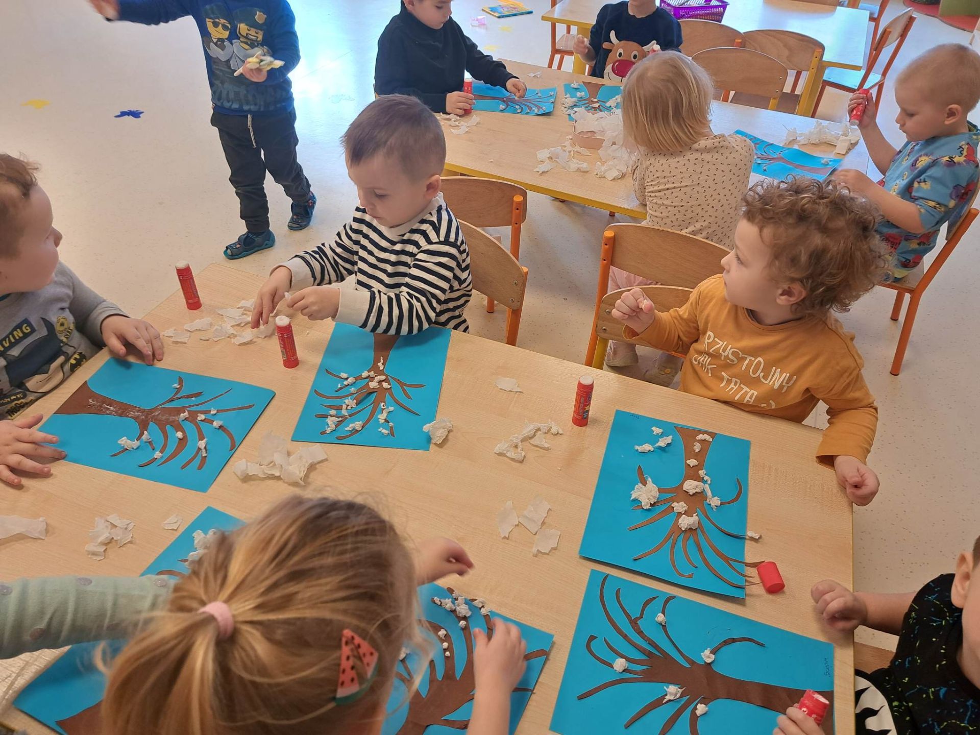 W dniu dzisiejszym dzieci z grupy Motylki wykonywały pracę plastyczną "zimowe drzewa". Samodzielnie przyklejały do kartek szablony drzew. Następnie z białej bibuły lepiły kuleczki przypominające śnieg, które przyklejały do wcześniej przyklejonych drzew. Był to bardzo pracowity dzień...