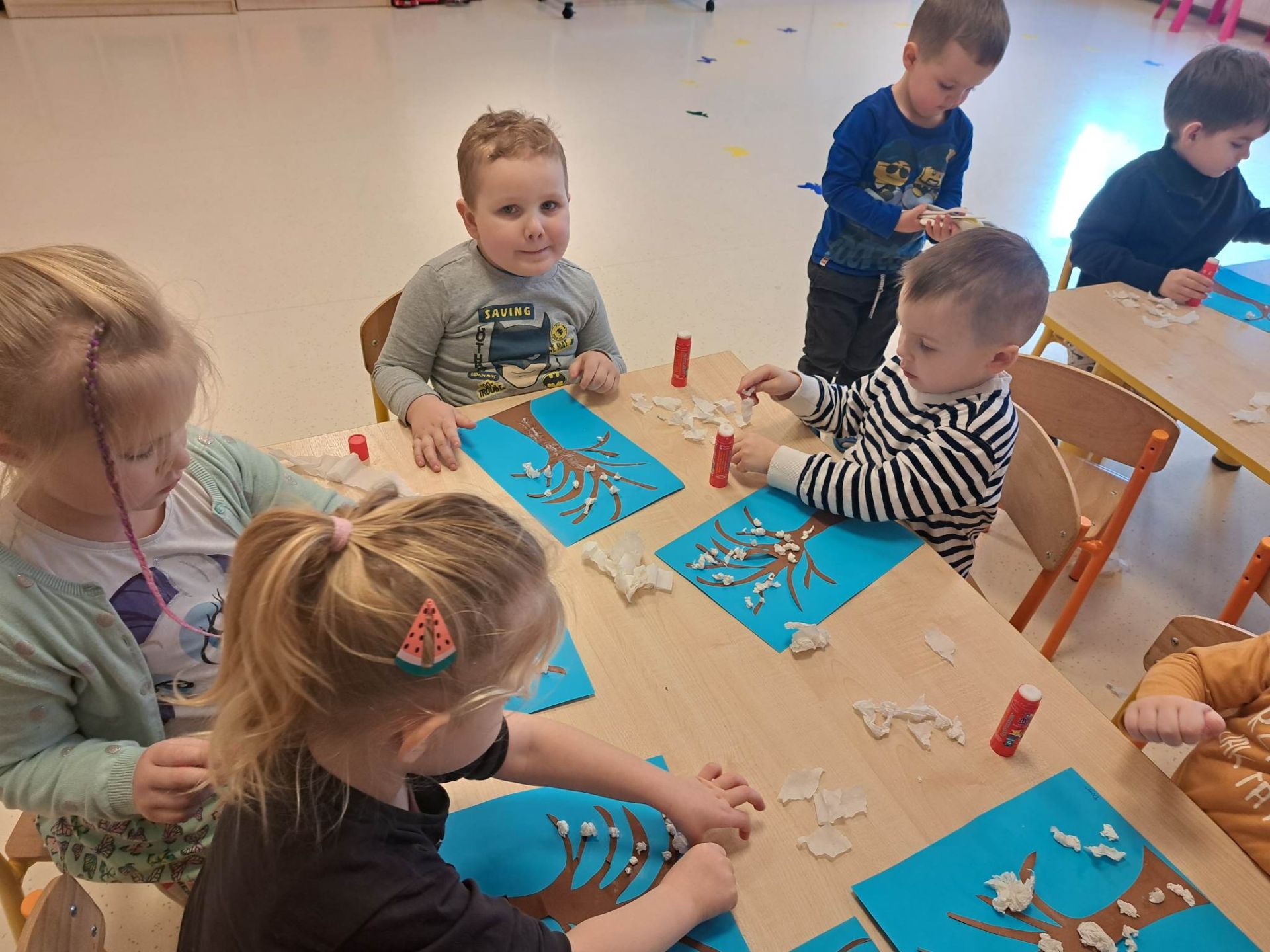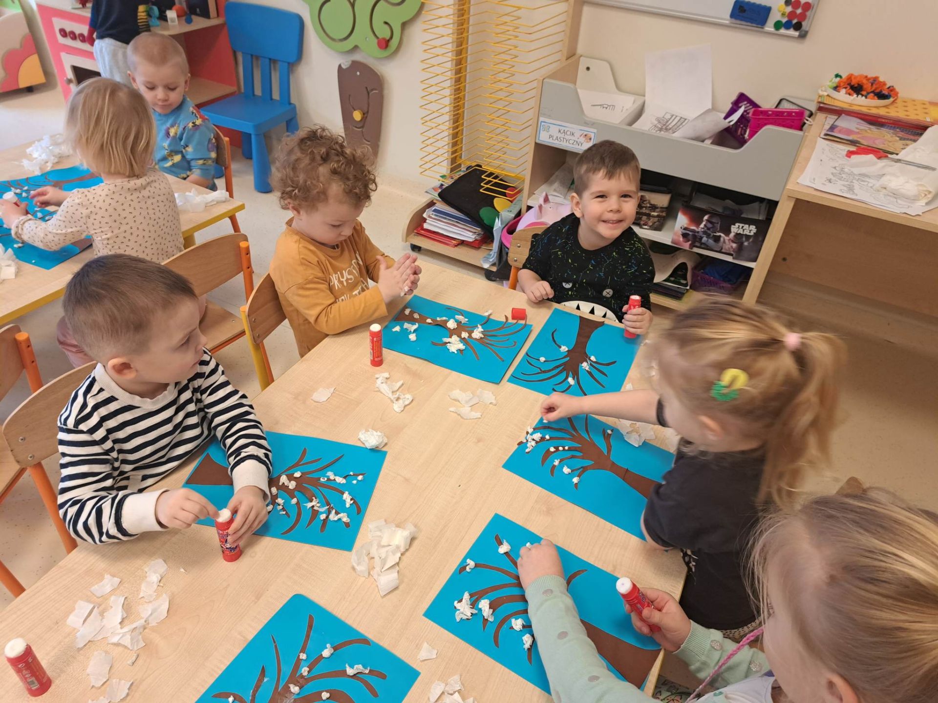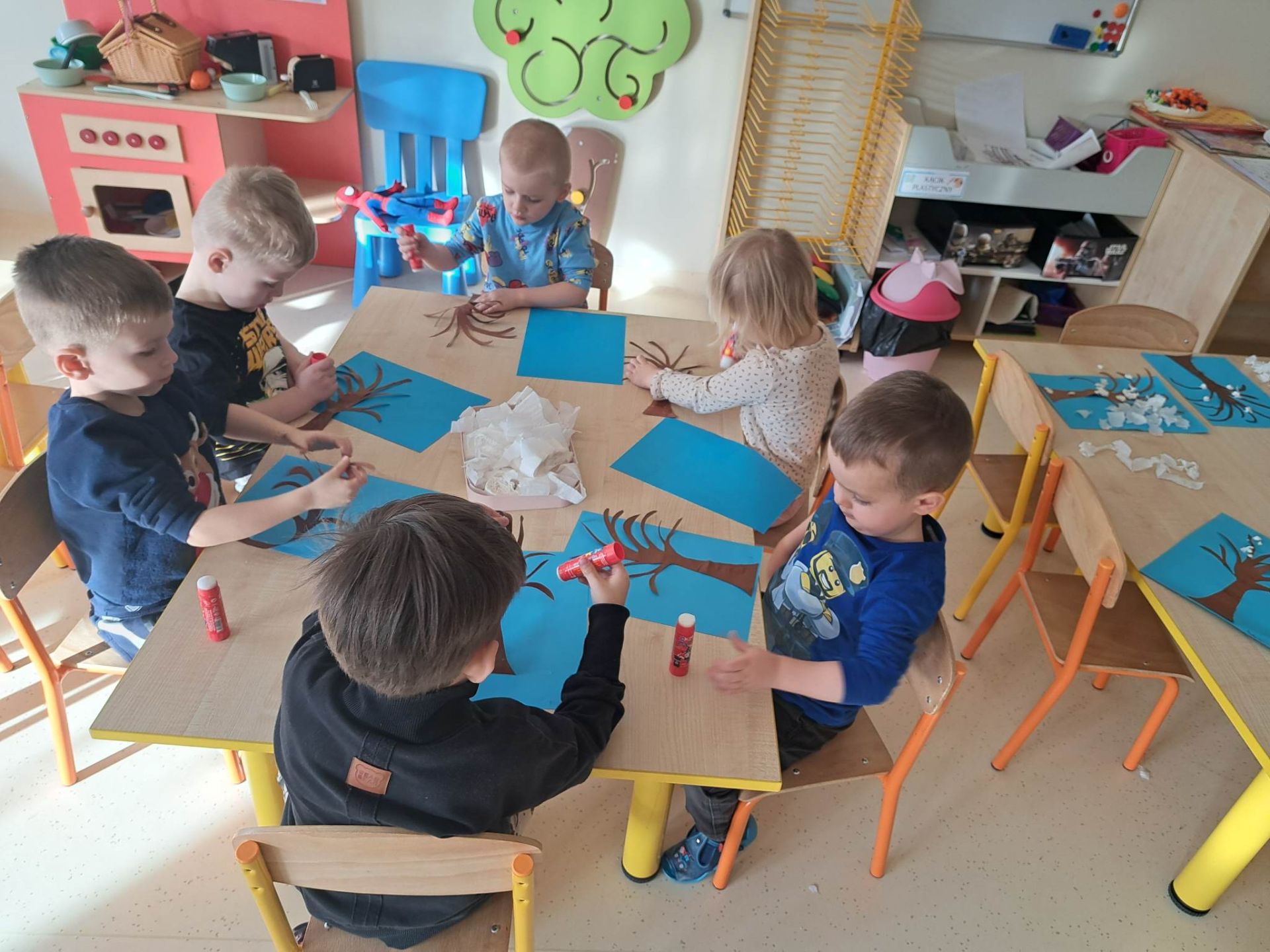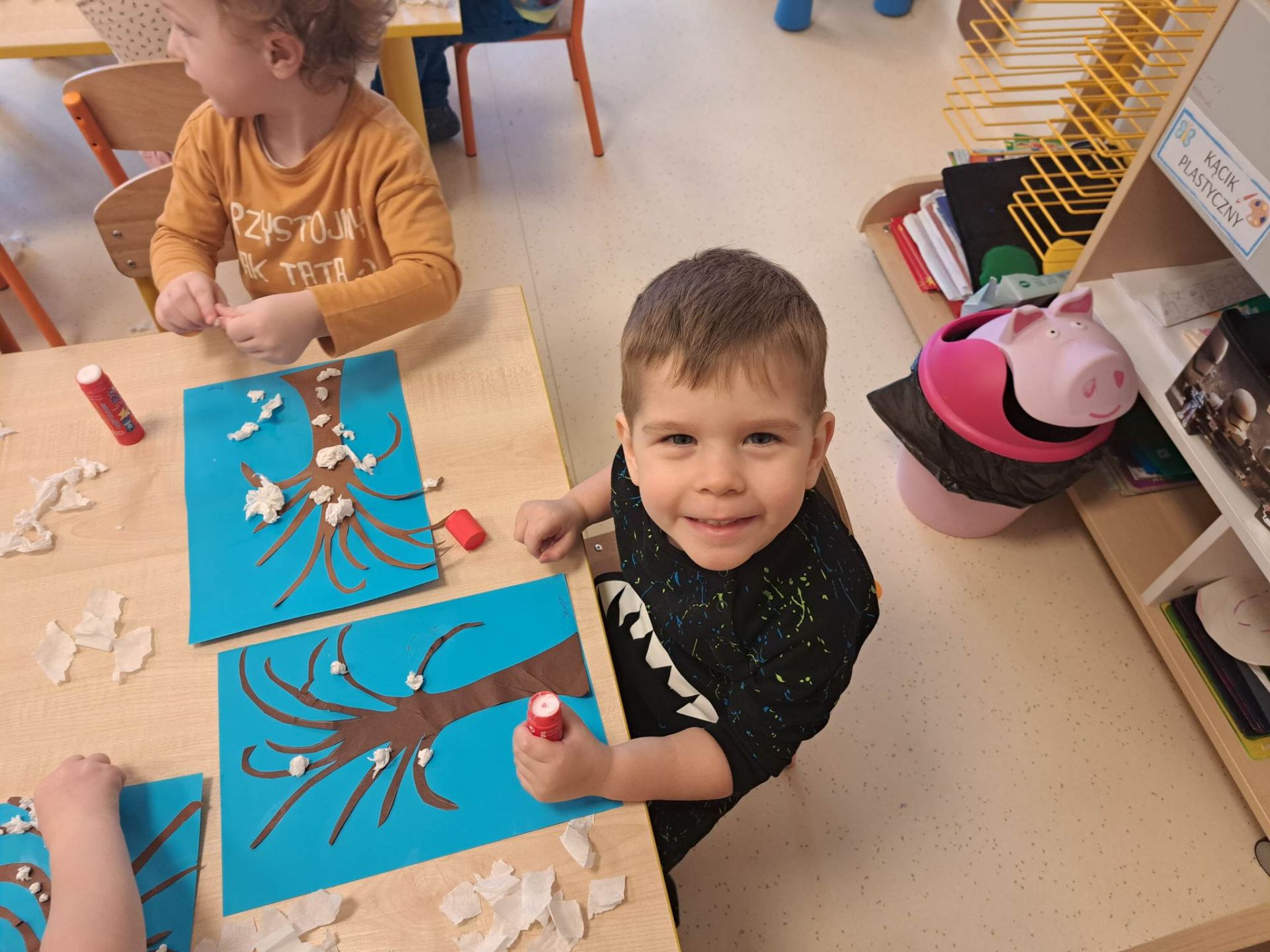 W dniu dzisiejszym dzieci z grupy Motylki wykonywały pracę plastyczną "zimowe drzewa". Samodzielnie przyklejały do kartek szablony drzew. Następnie z białej bibuły lepiły kuleczki przypominające śnieg, które przyklejały do wcześniej przyklejonych drzew. Był to bardzo pracowity dzień...