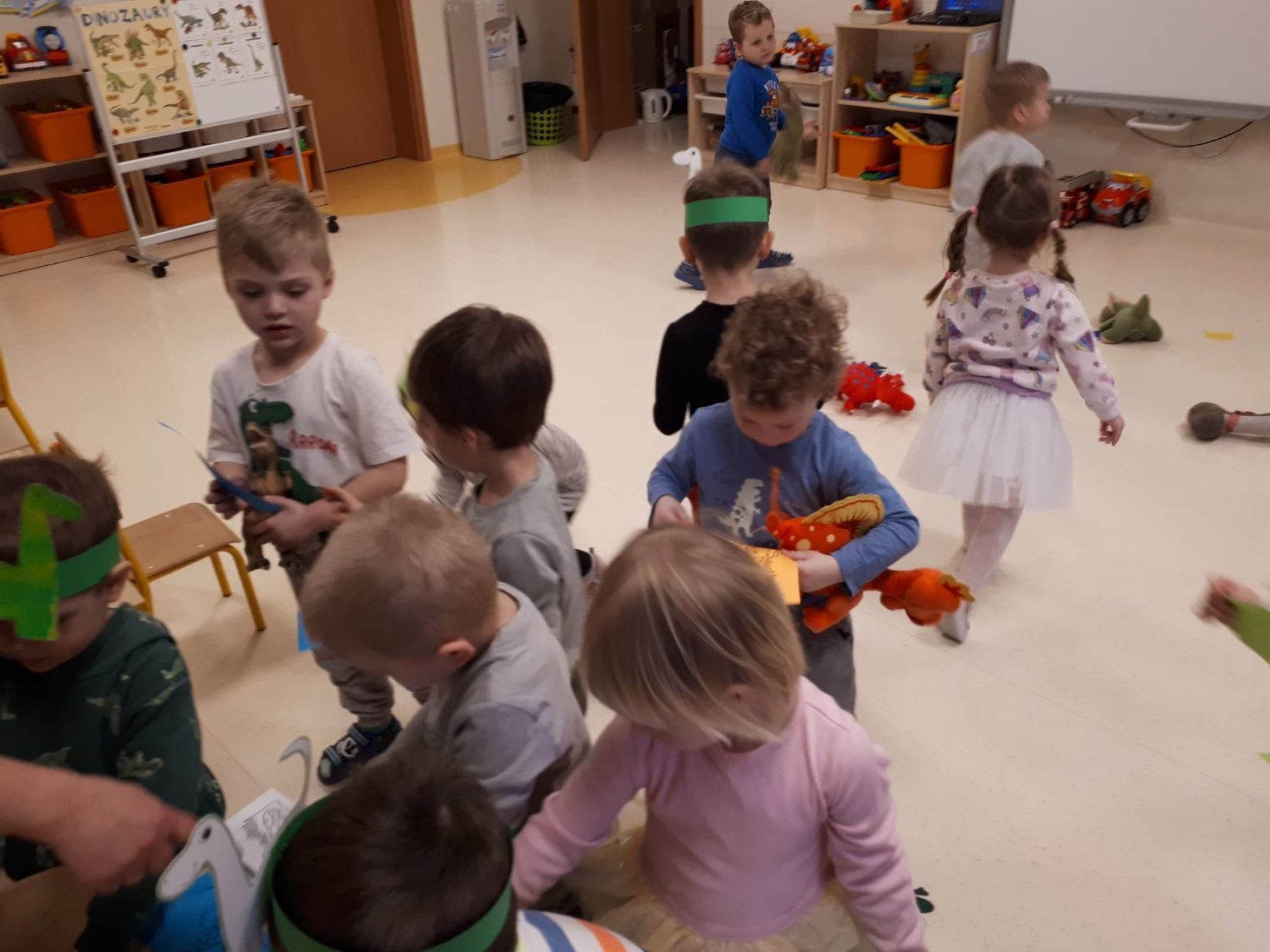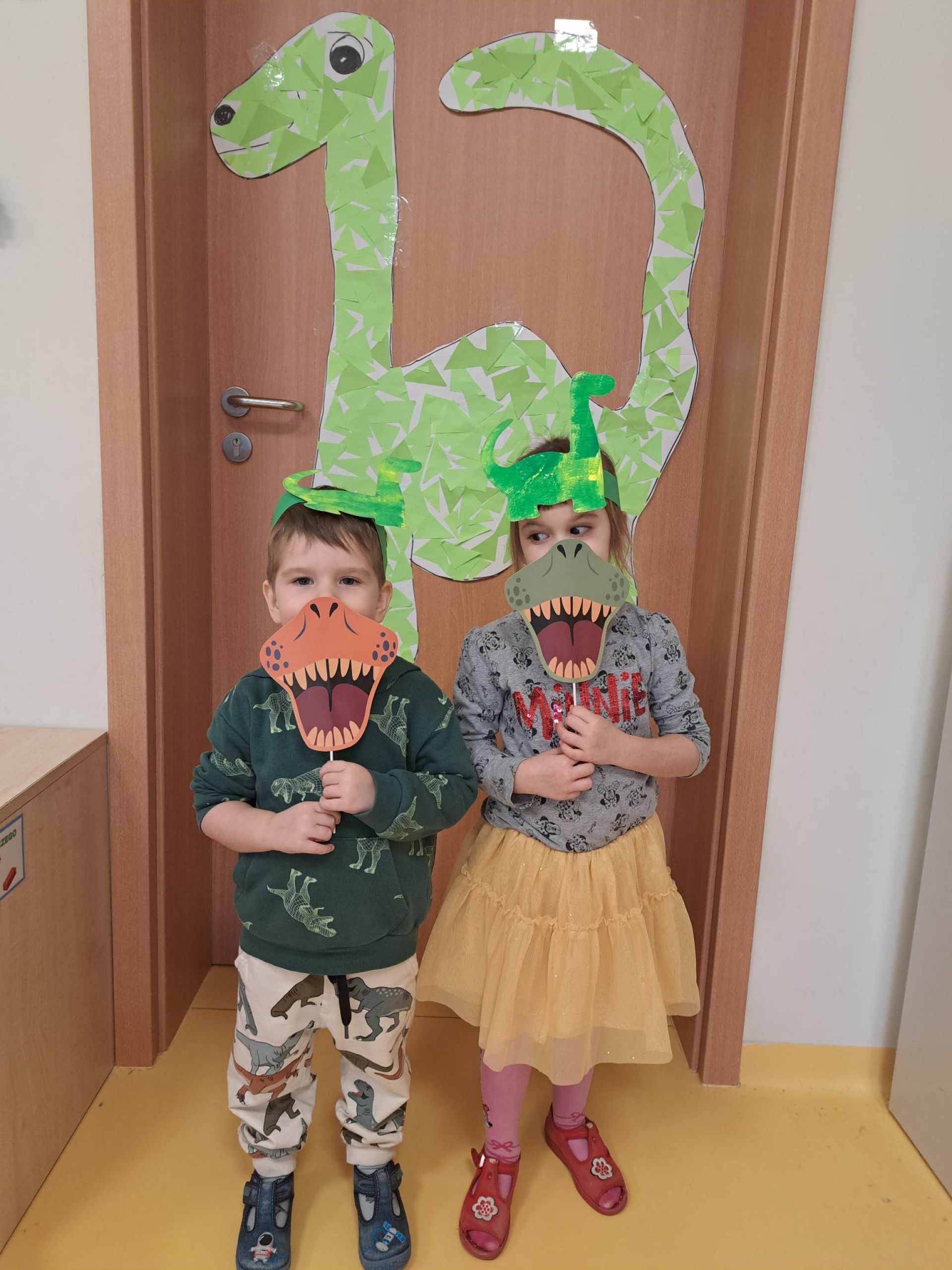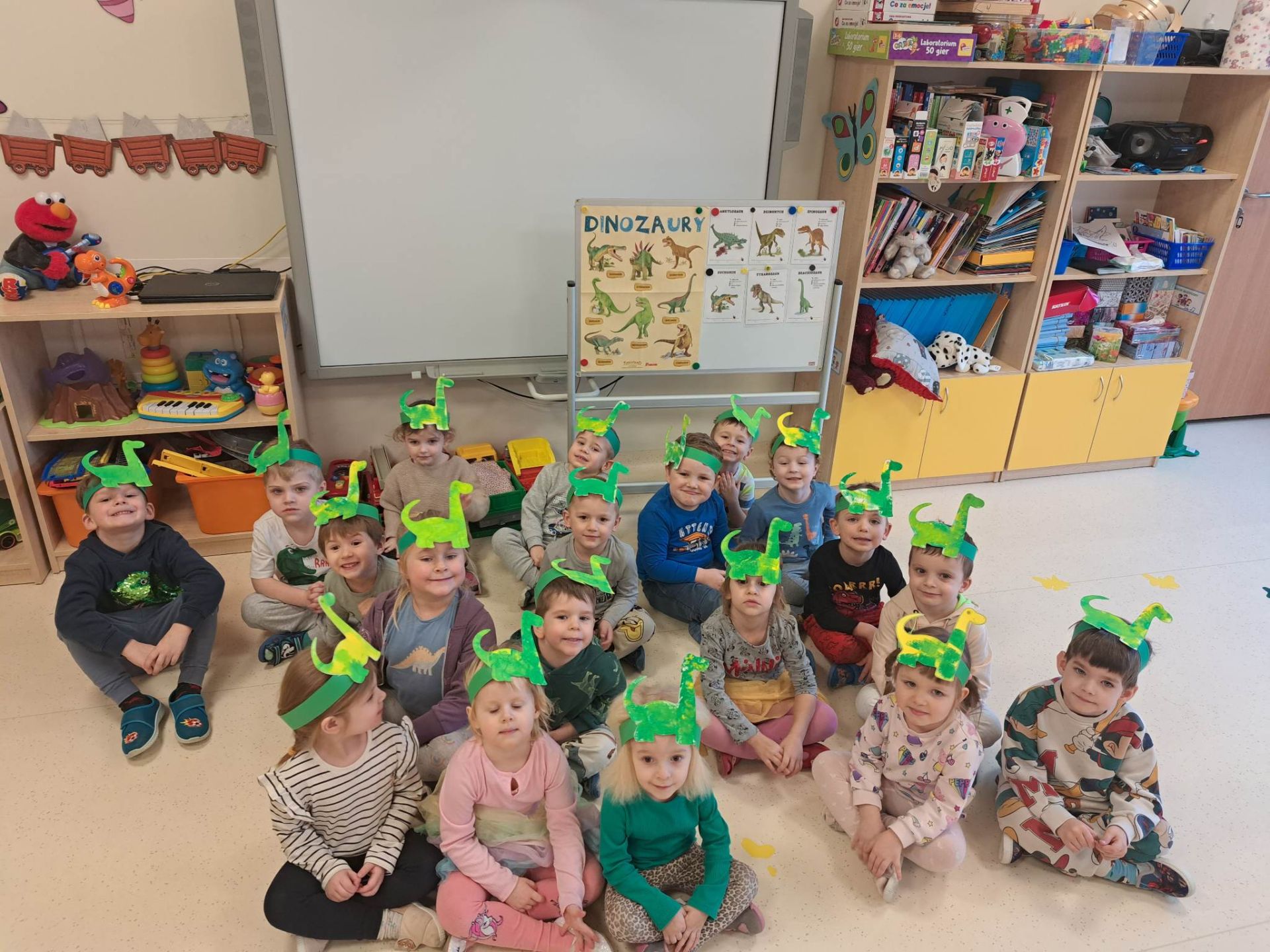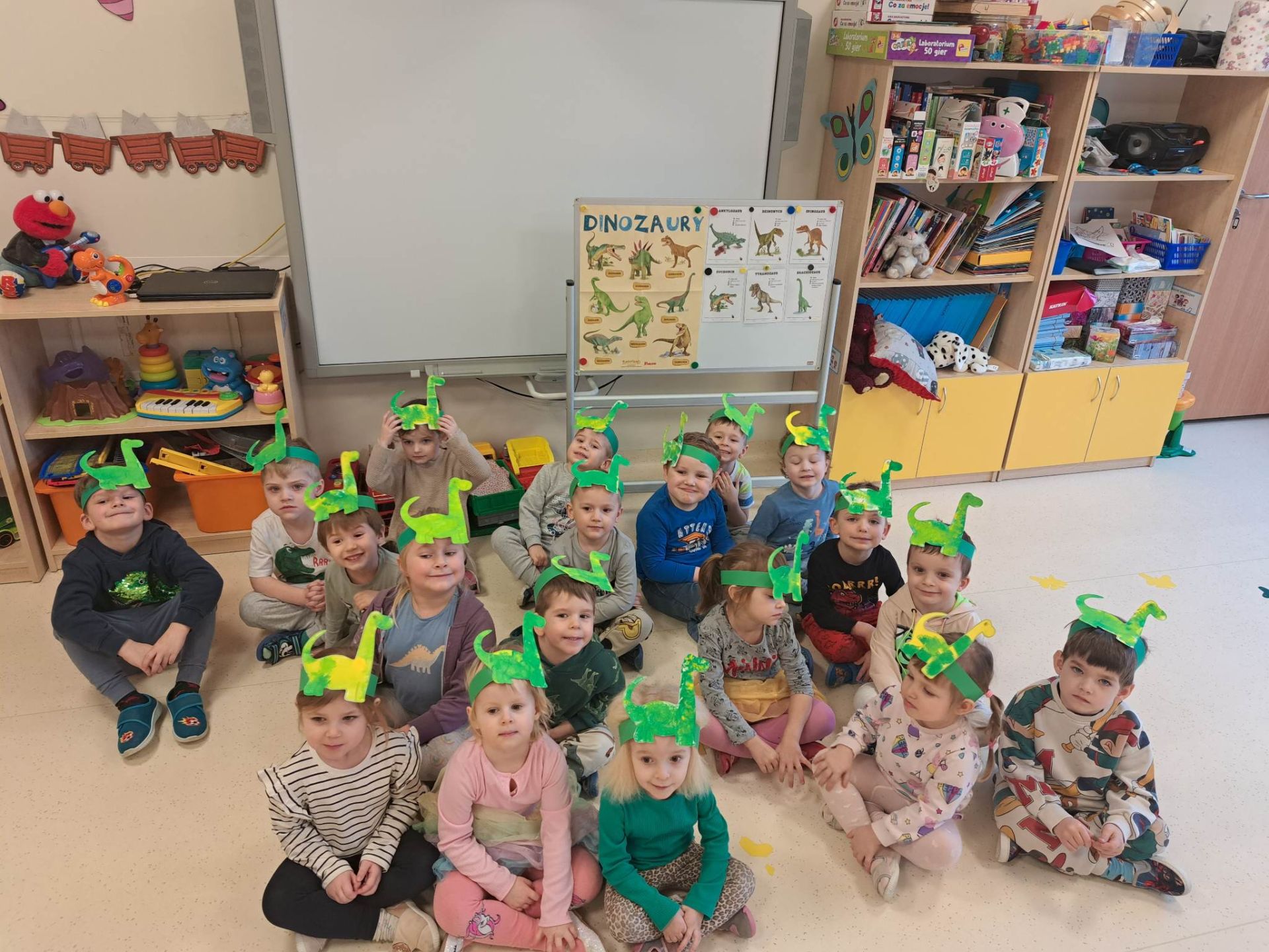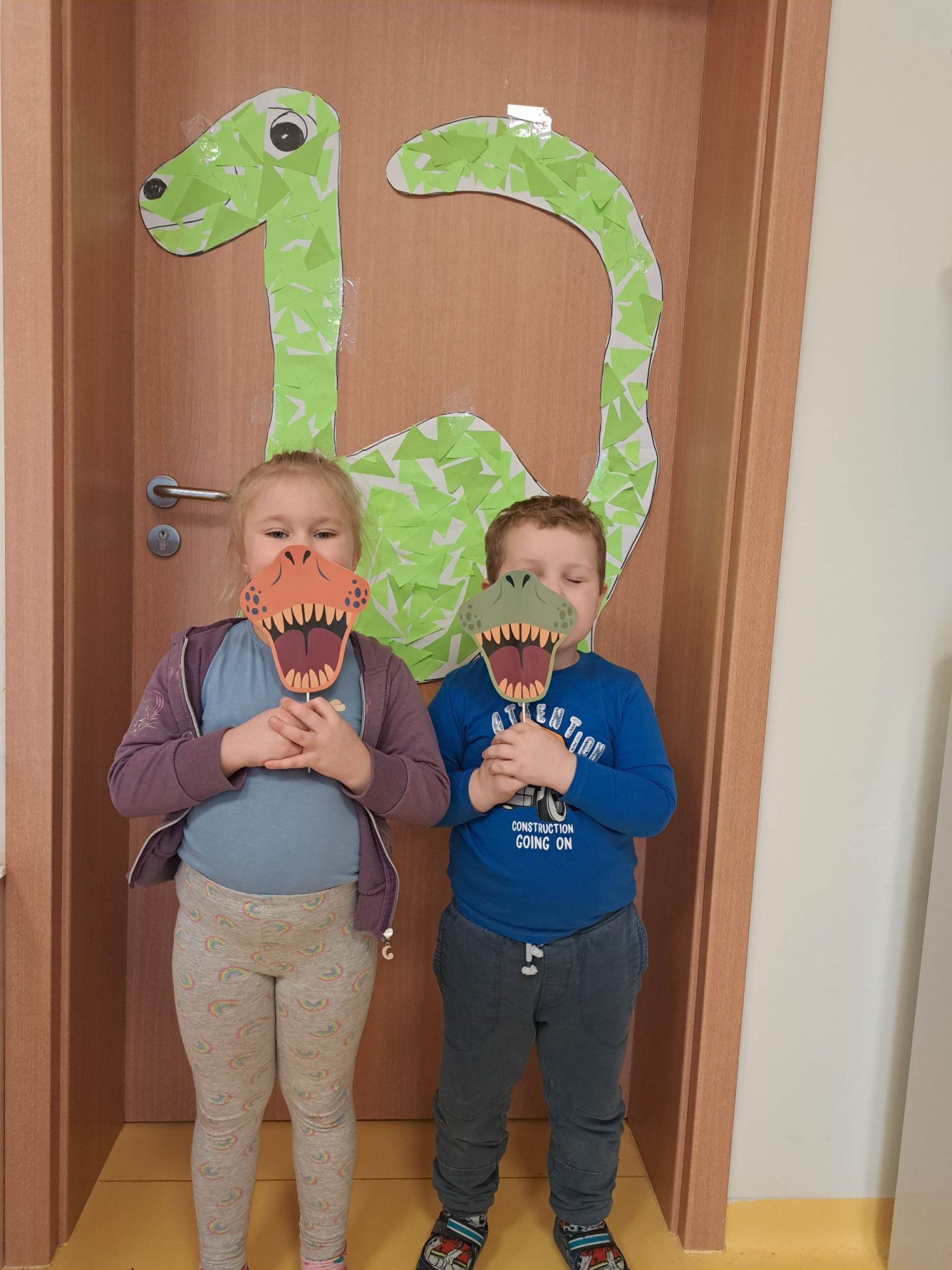W dniu dzisiejszym Motylki obchodziły Światowy Dzień Dinozaura. Dzieci poznały historię dinozaurów, bawiły się w paleontologów, tańczyły ze swoimi dinozaurami. Dzięki wspólnej pracy powstał gigantyczny Diplodok który zadomowił się na drzwiach naszej sali. Na zakończenie każde dziecko miało zrobione zdjęcie w masce i opasce dinozaura.