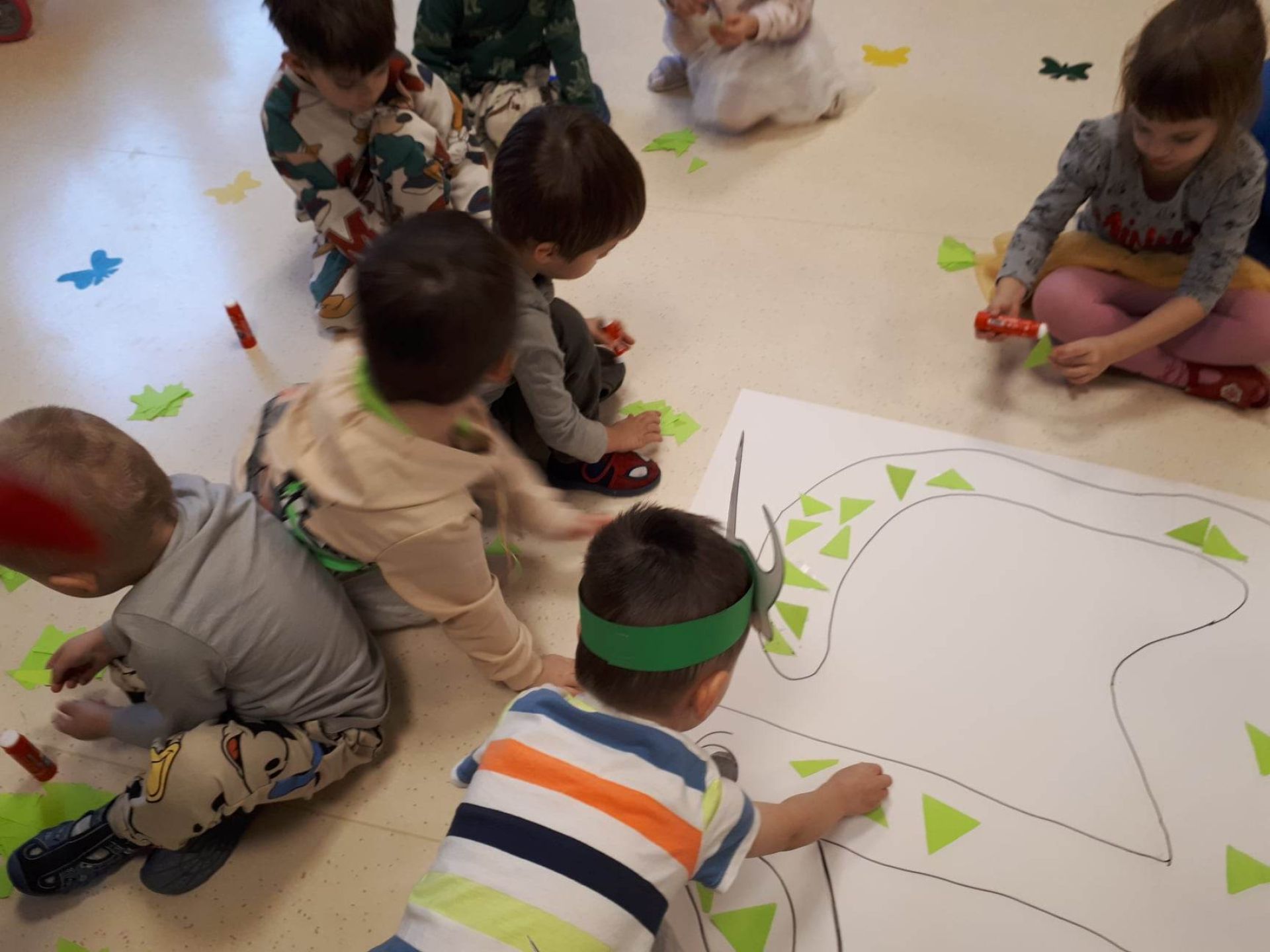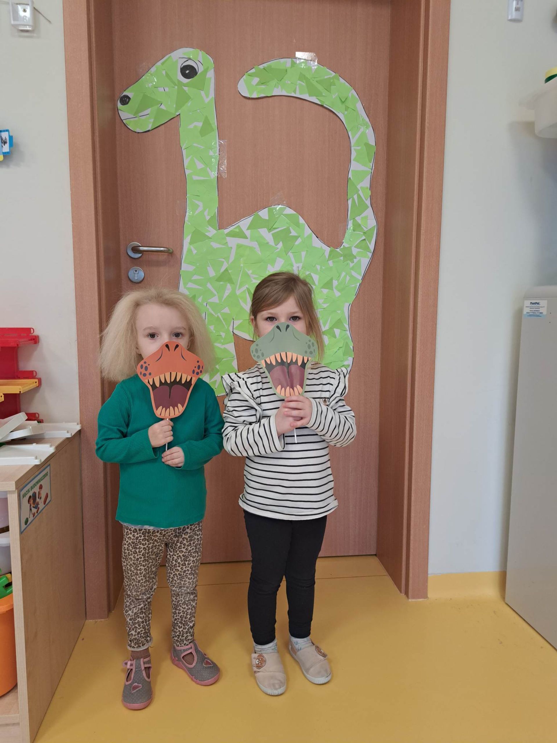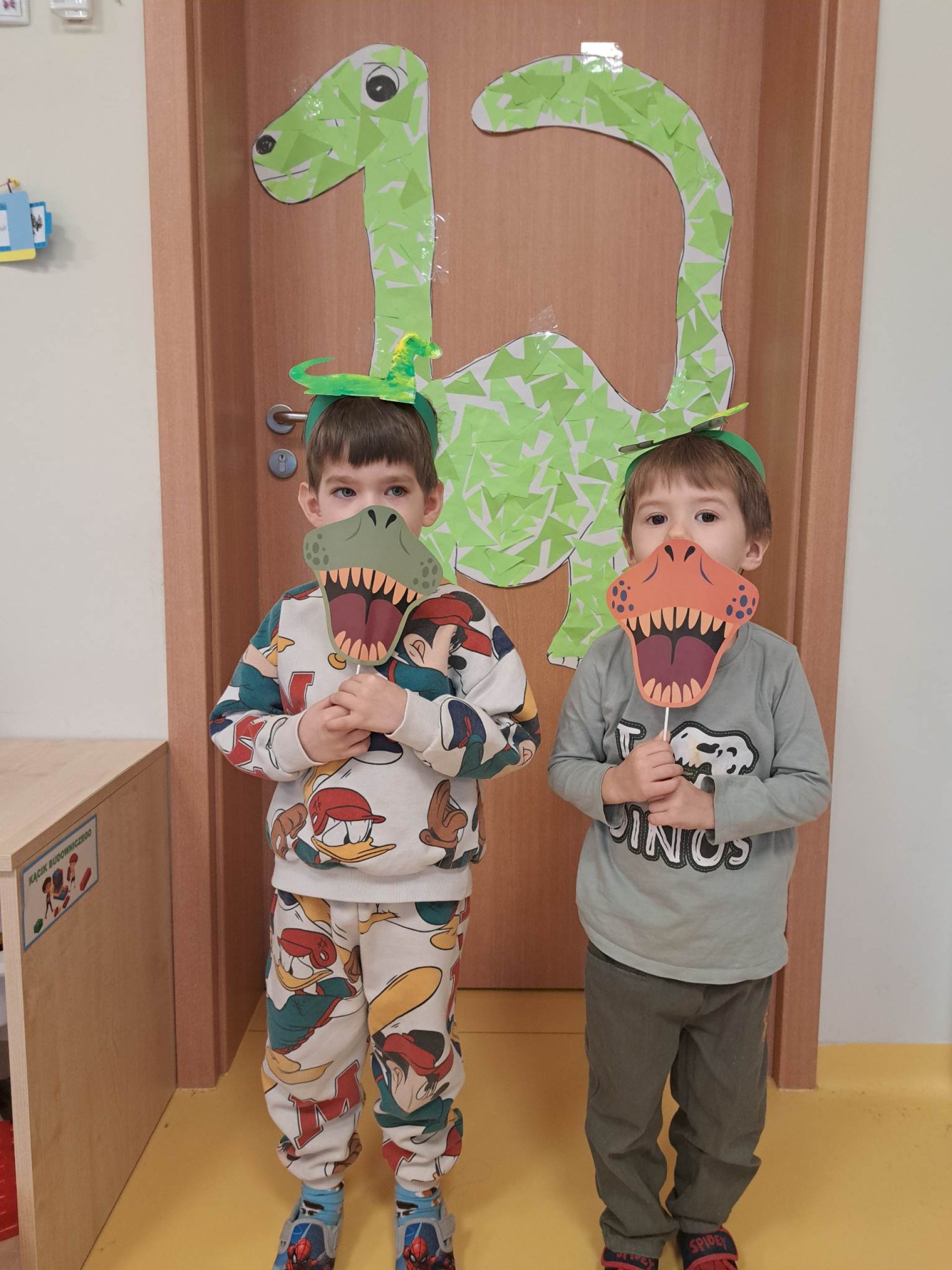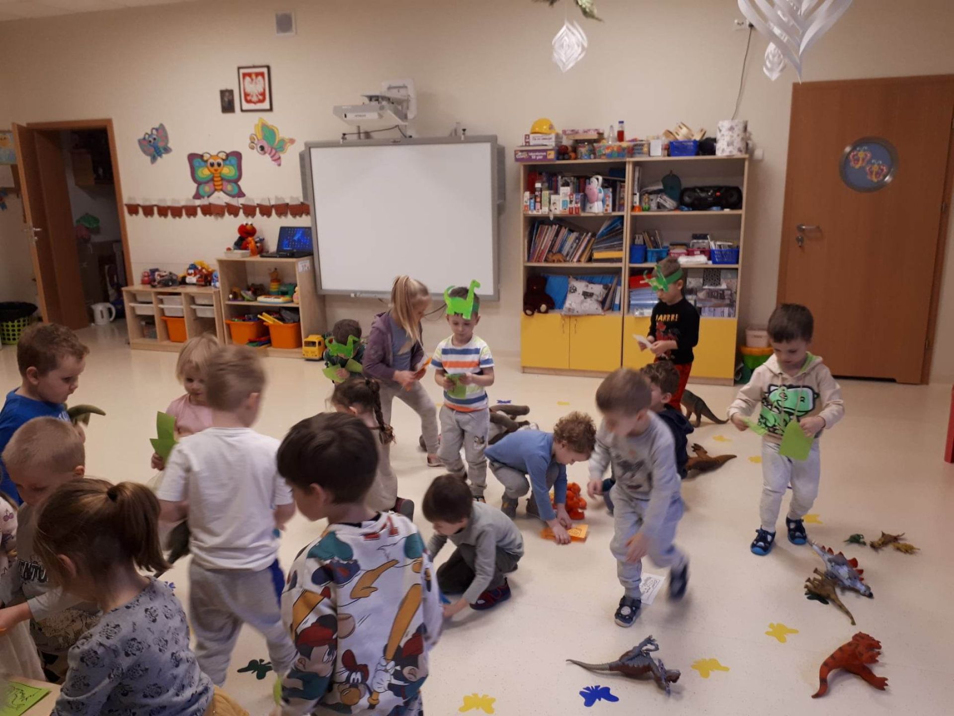 W dniu dzisiejszym Motylki obchodziły Światowy Dzień Dinozaura. Dzieci poznały historię dinozaurów, bawiły się w paleontologów, tańczyły ze swoimi dinozaurami. Dzięki wspólnej pracy powstał gigantyczny Diplodok który zadomowił się na drzwiach naszej sali. Na zakończenie każde dziecko miało zrobione zdjęcie w masce i opasce dinozaura.