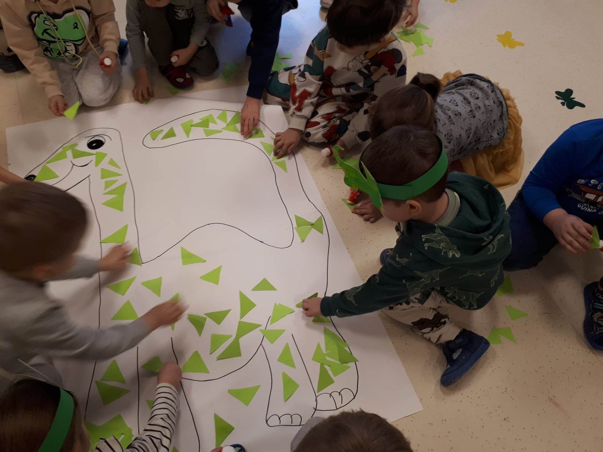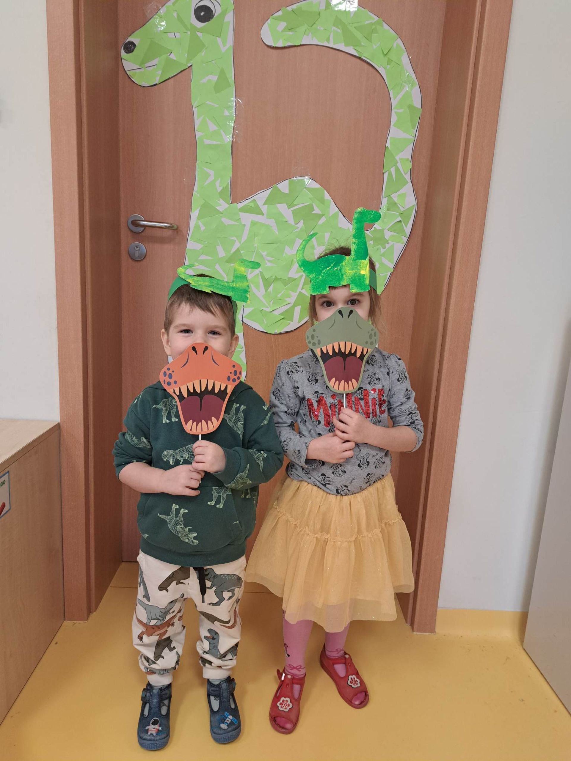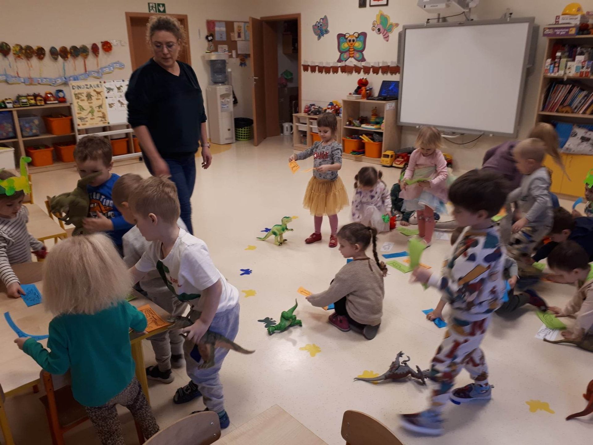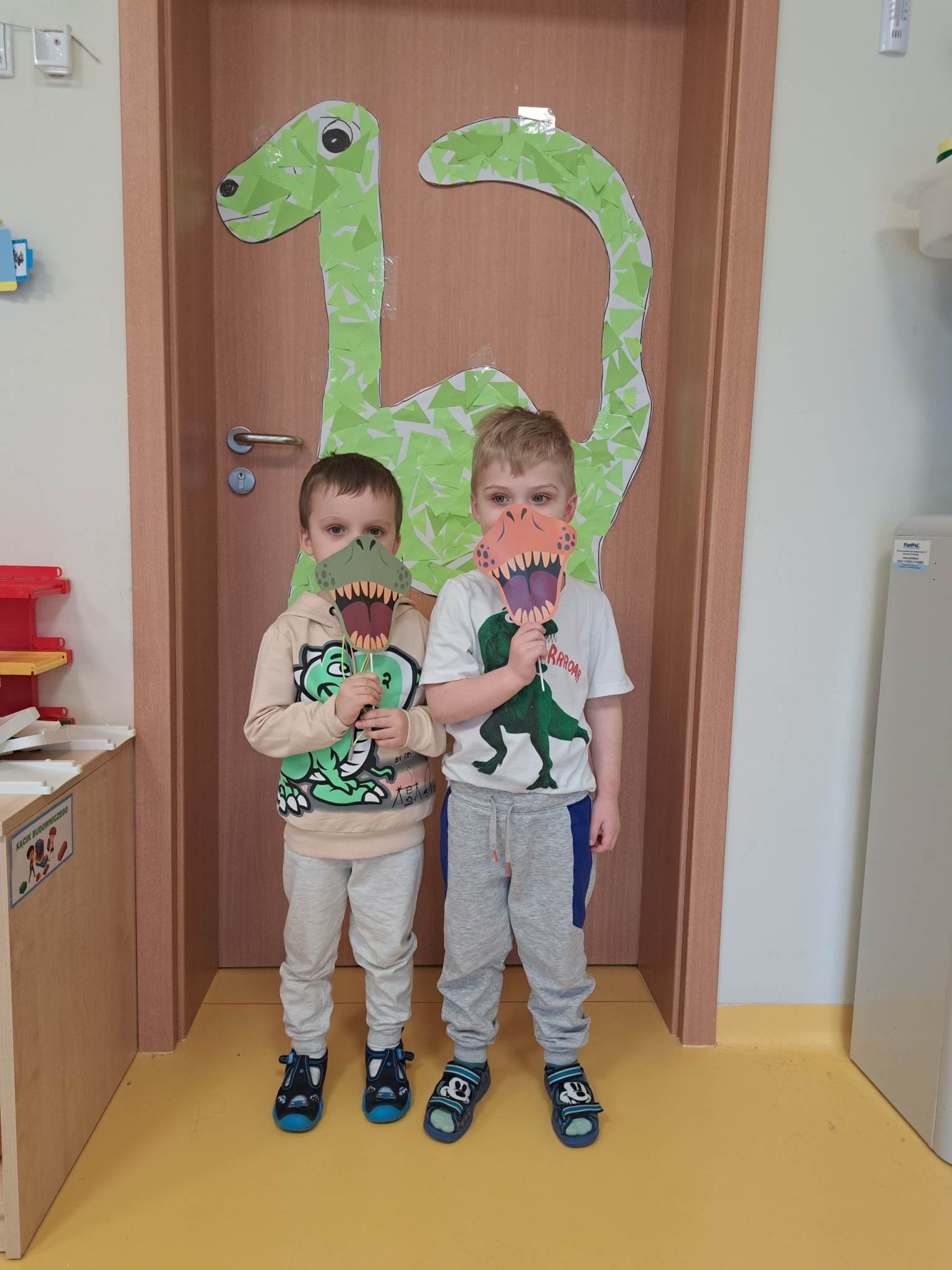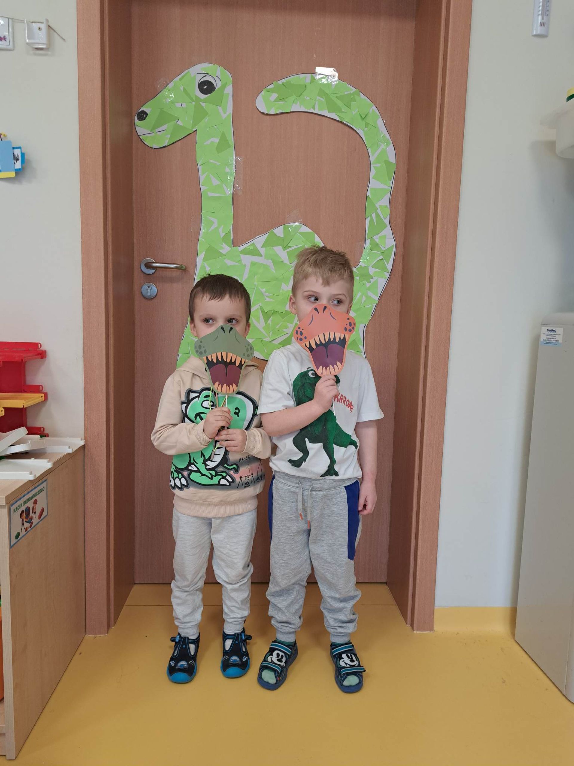 W dniu dzisiejszym Motylki obchodziły Światowy Dzień Dinozaura. Dzieci poznały historię dinozaurów, bawiły się w paleontologów, tańczyły ze swoimi dinozaurami. Dzięki wspólnej pracy powstał gigantyczny Diplodok który zadomowił się na drzwiach naszej sali. Na zakończenie każde dziecko miało zrobione zdjęcie w masce i opasce dinozaura.