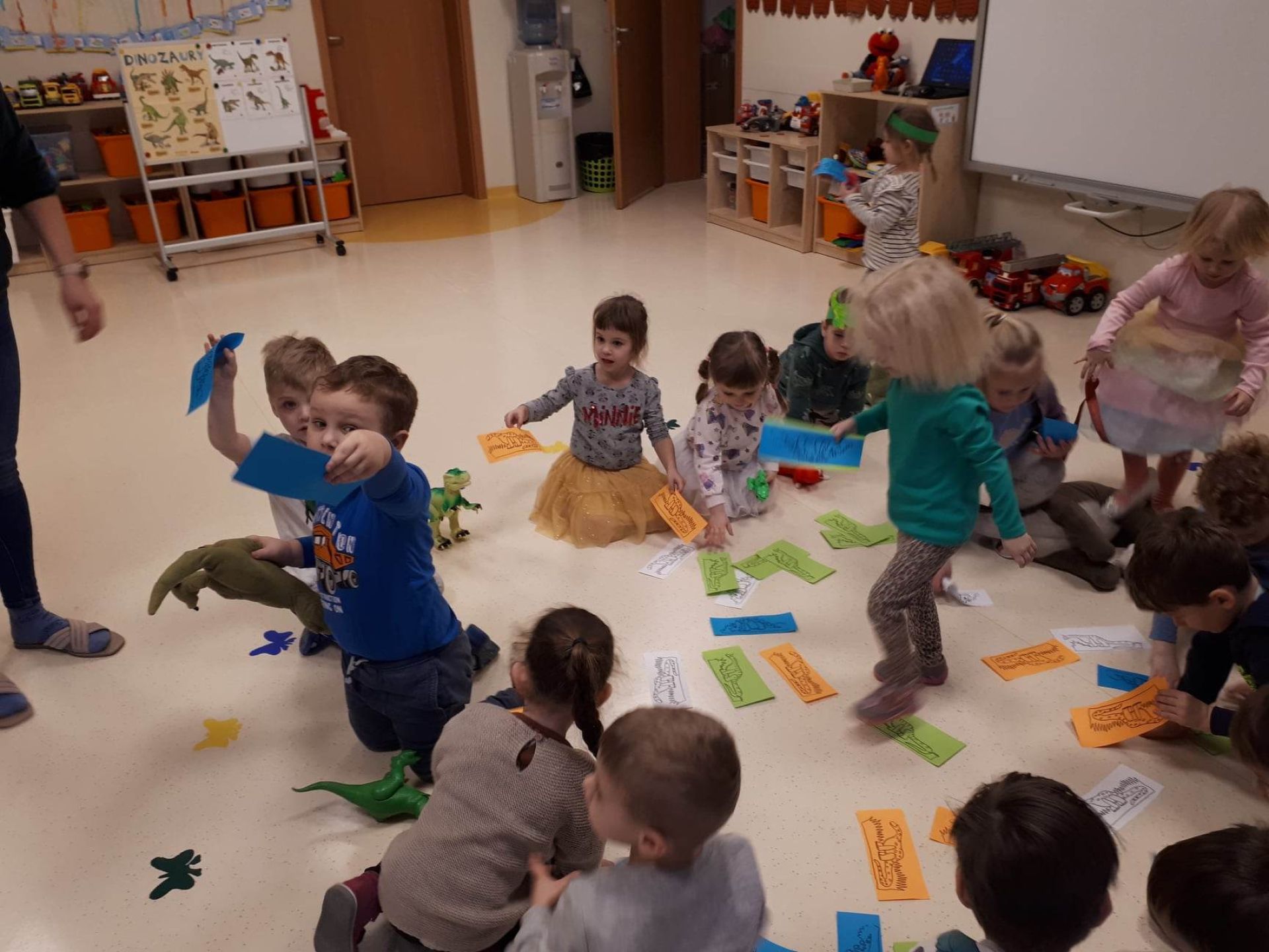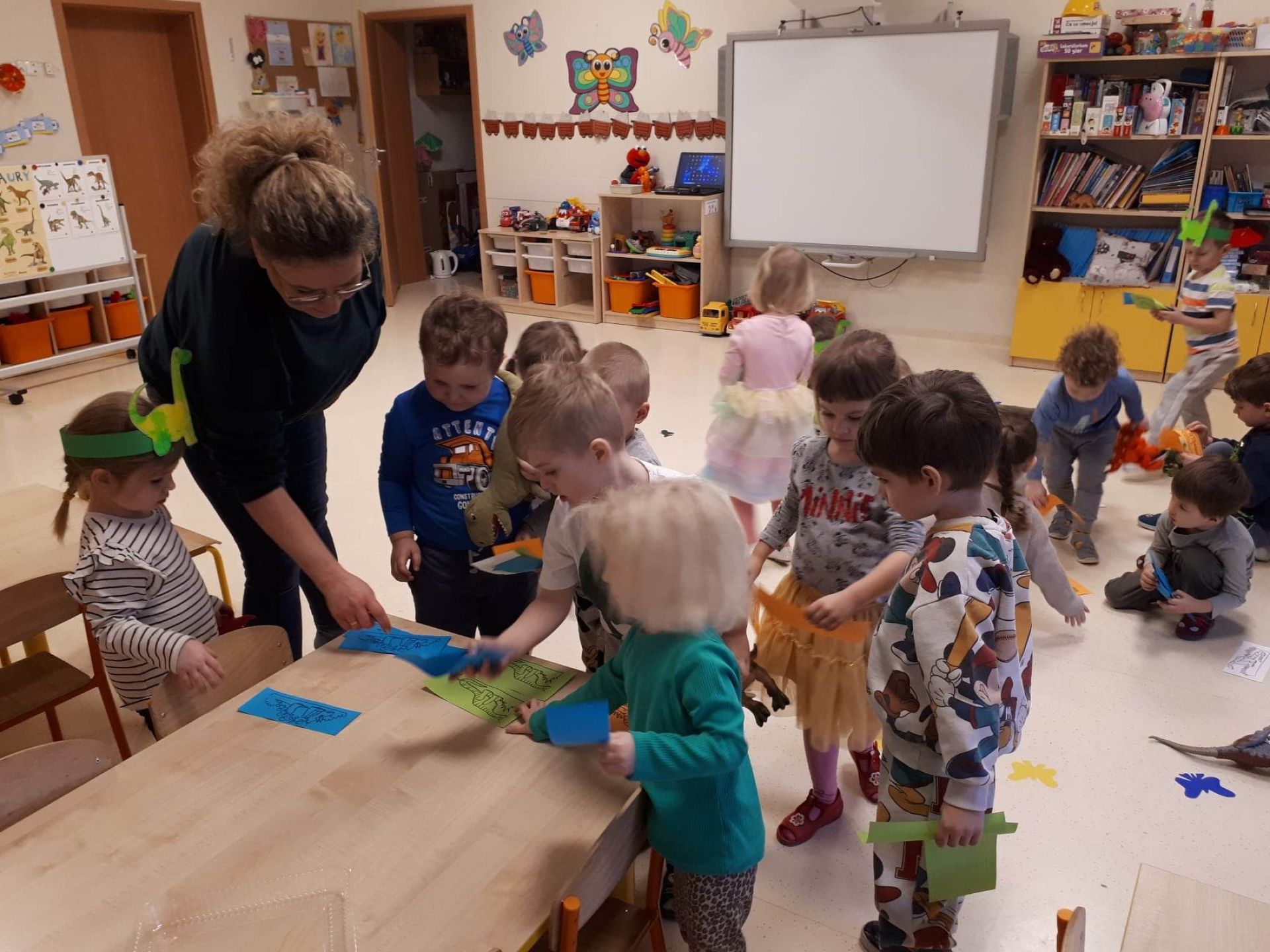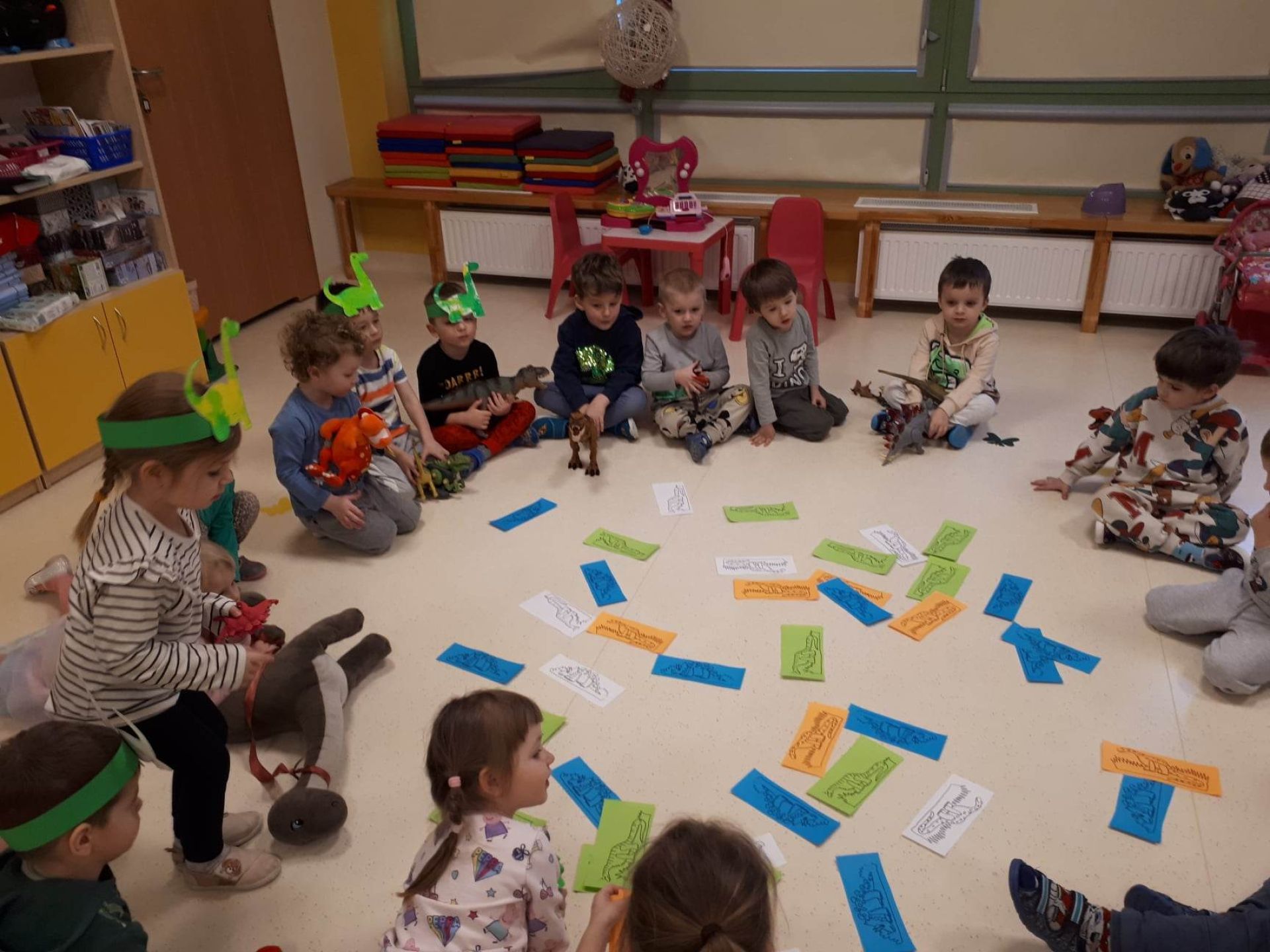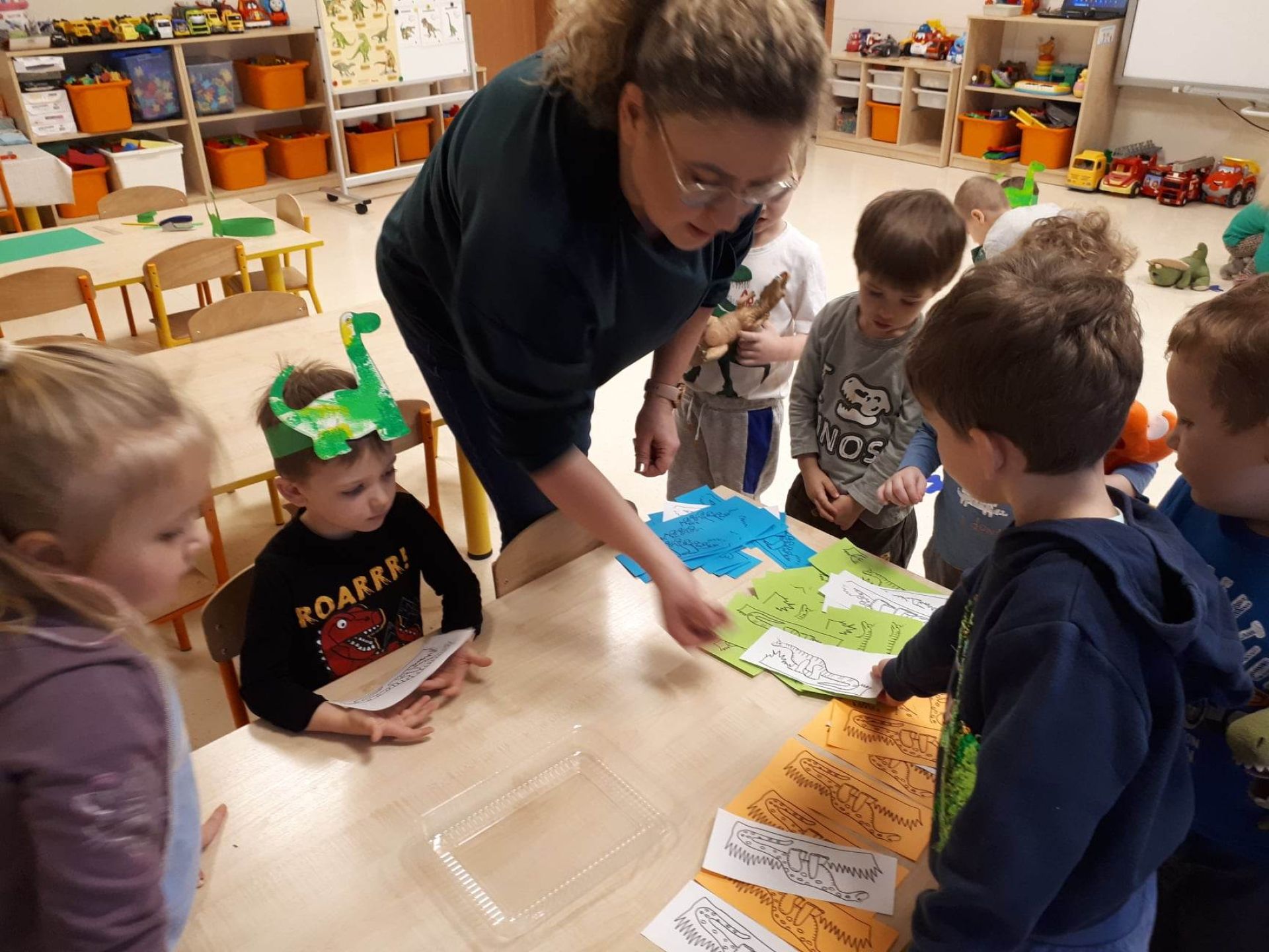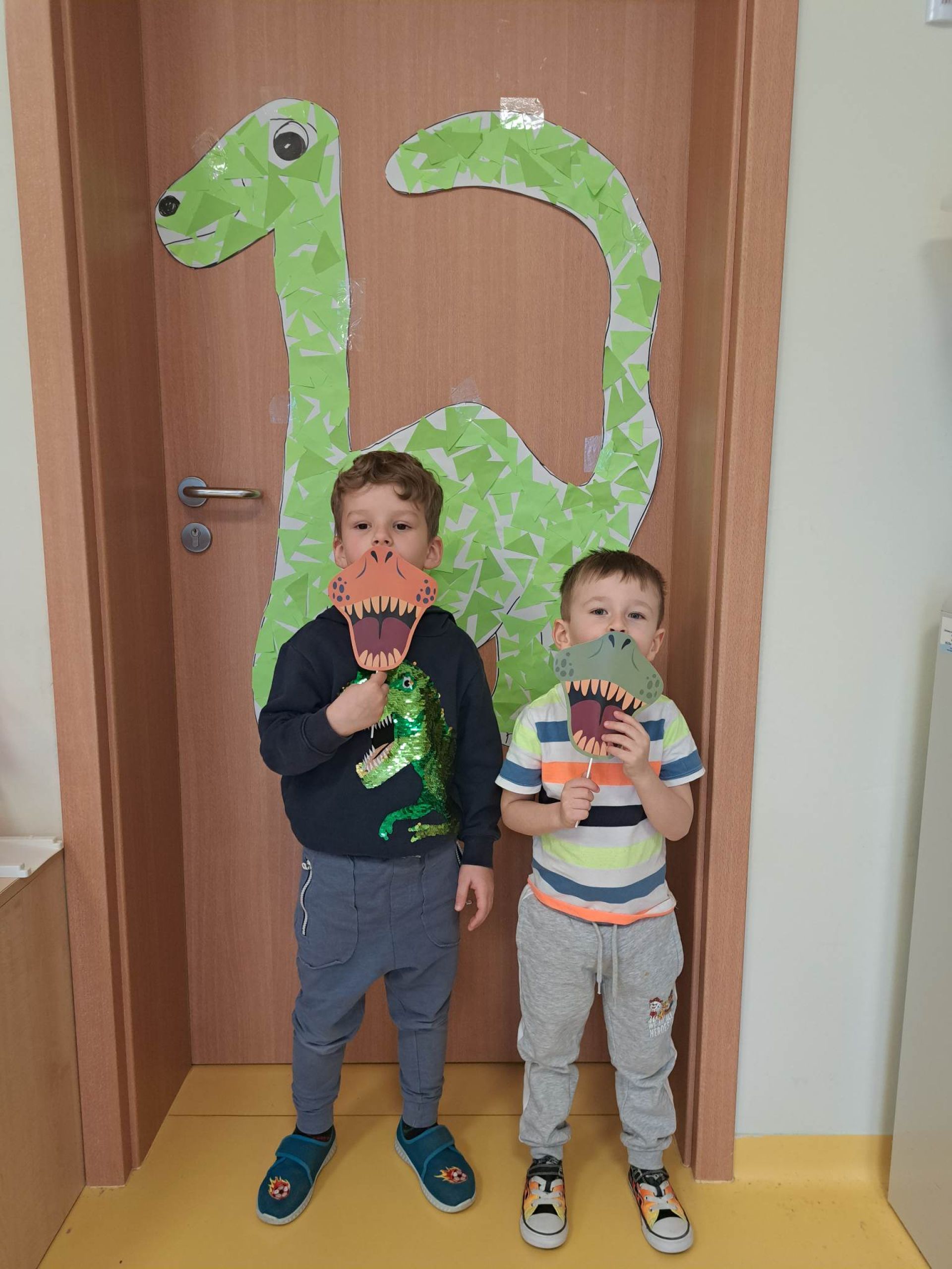 W dniu dzisiejszym Motylki obchodziły Światowy Dzień Dinozaura. Dzieci poznały historię dinozaurów, bawiły się w paleontologów, tańczyły ze swoimi dinozaurami. Dzięki wspólnej pracy powstał gigantyczny Diplodok który zadomowił się na drzwiach naszej sali. Na zakończenie każde dziecko miało zrobione zdjęcie w masce i opasce dinozaura.