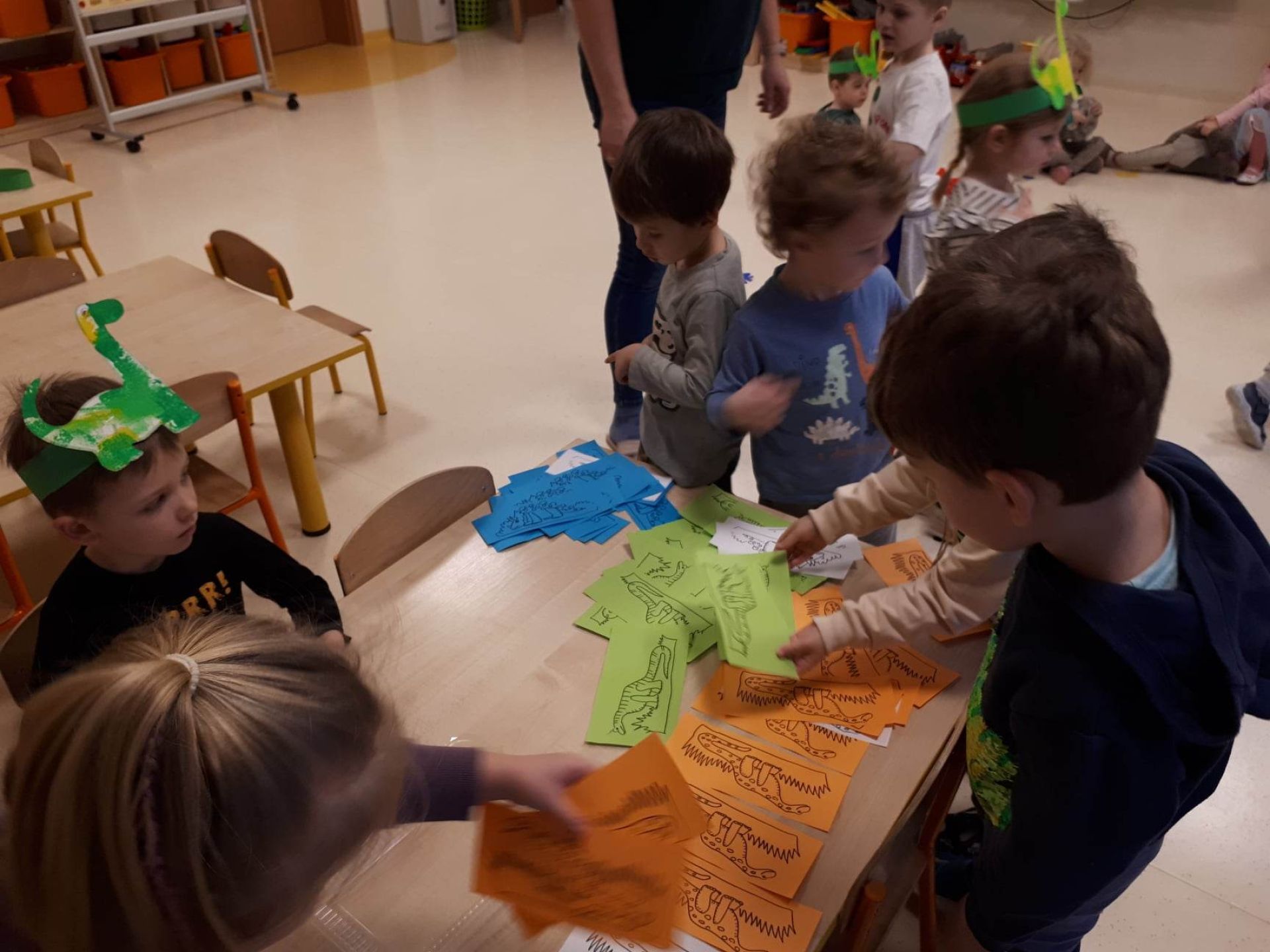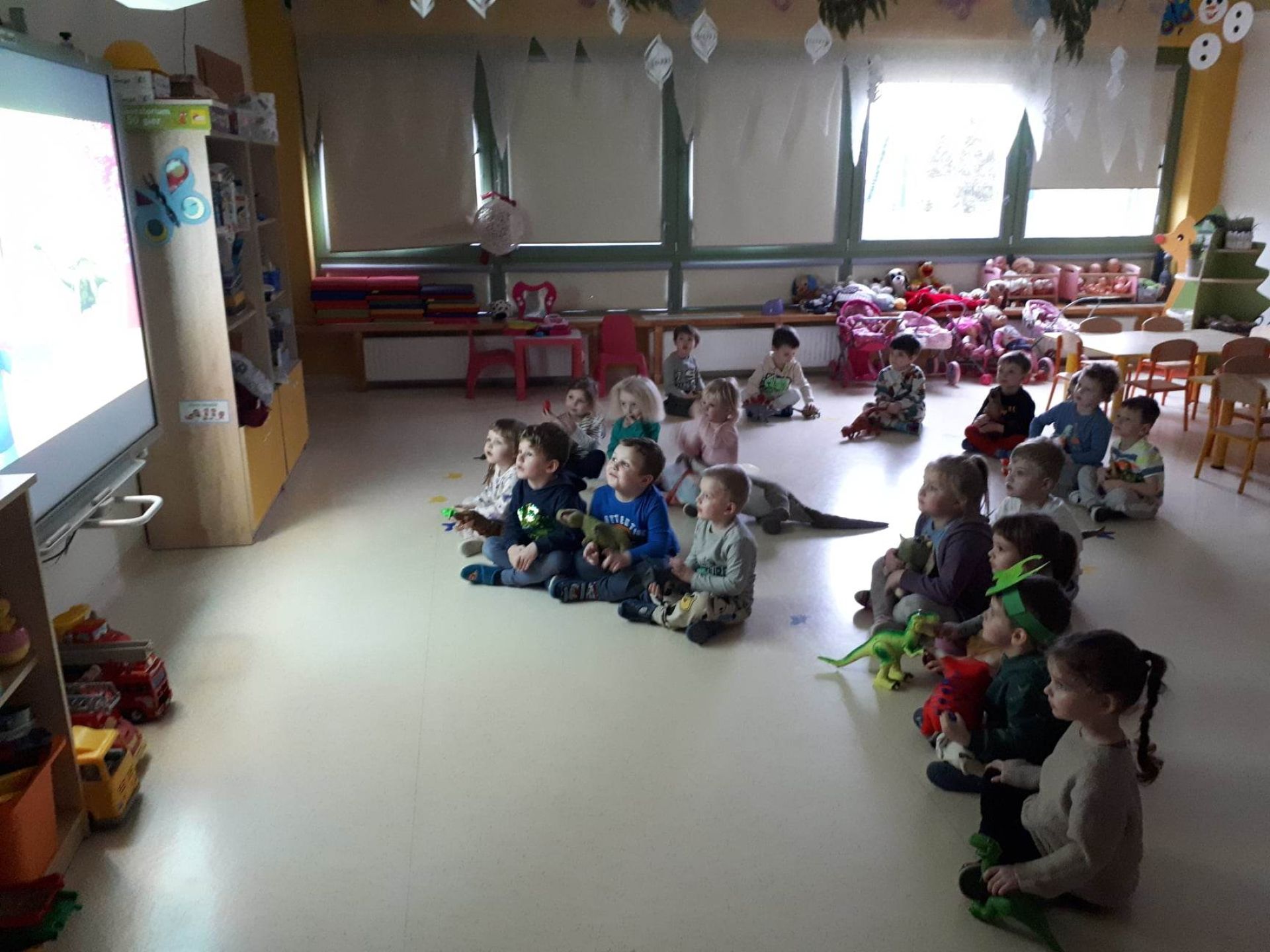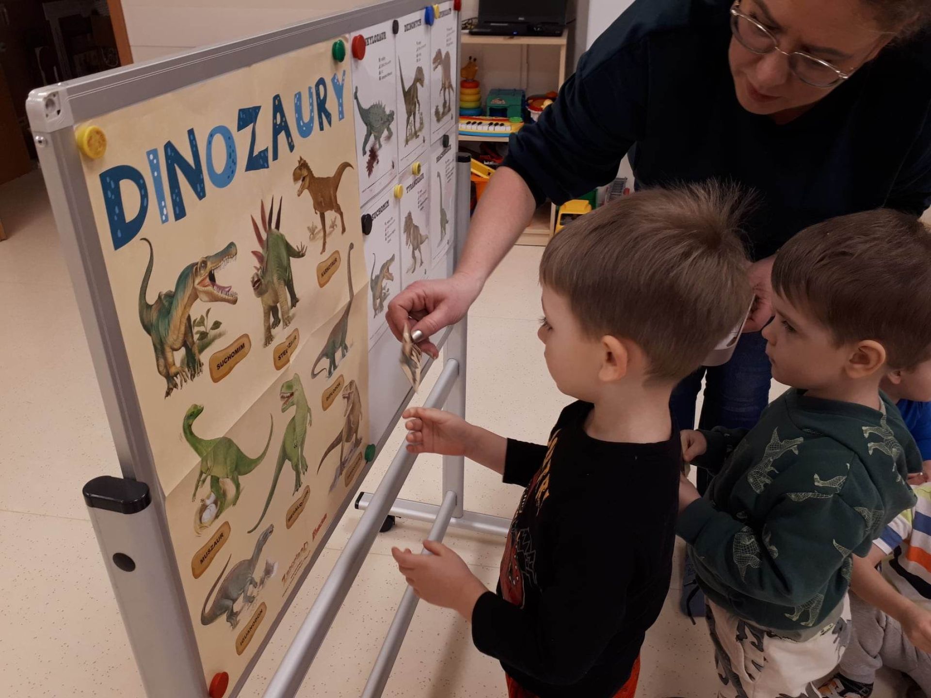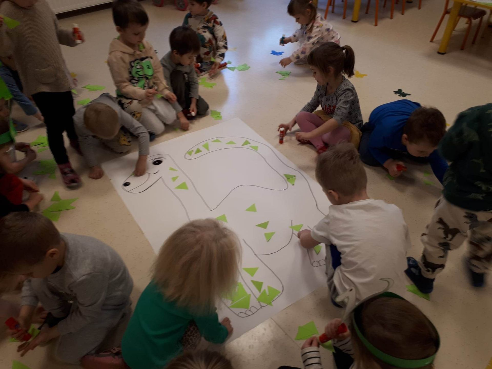 W dniu dzisiejszym Motylki obchodziły Światowy Dzień Dinozaura. Dzieci poznały historię dinozaurów, bawiły się w paleontologów, tańczyły ze swoimi dinozaurami. Dzięki wspólnej pracy powstał gigantyczny Diplodok który zadomowił się na drzwiach naszej sali. Na zakończenie każde dziecko miało zrobione zdjęcie w masce i opasce dinozaura.