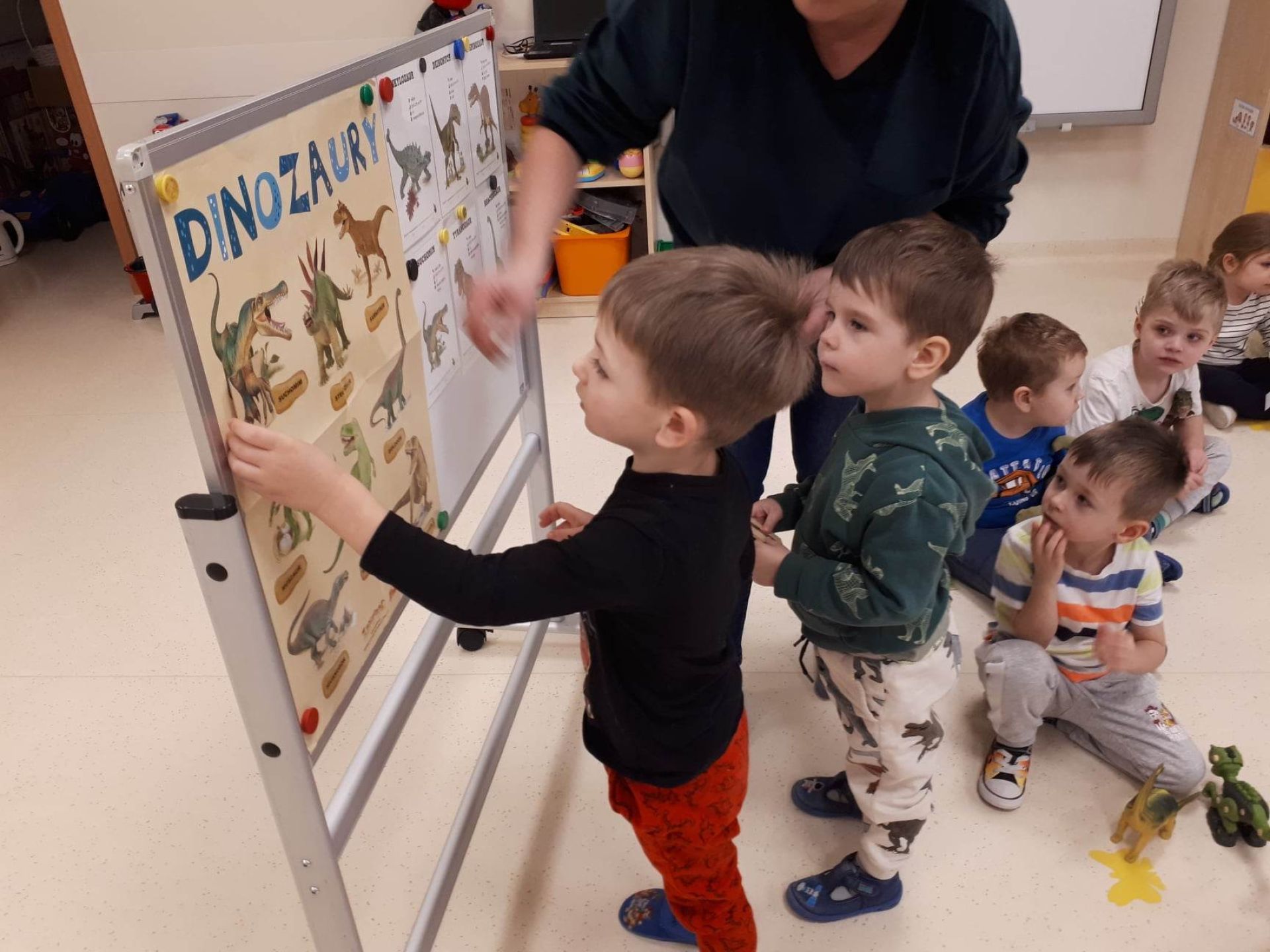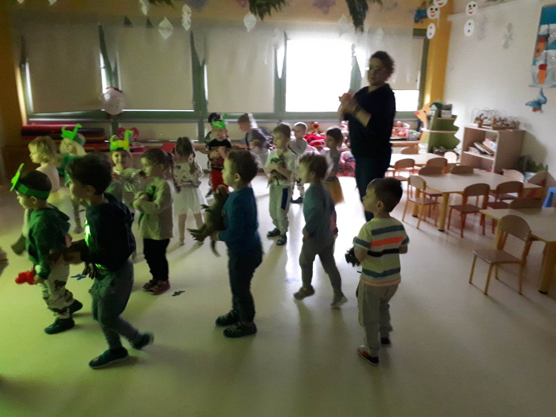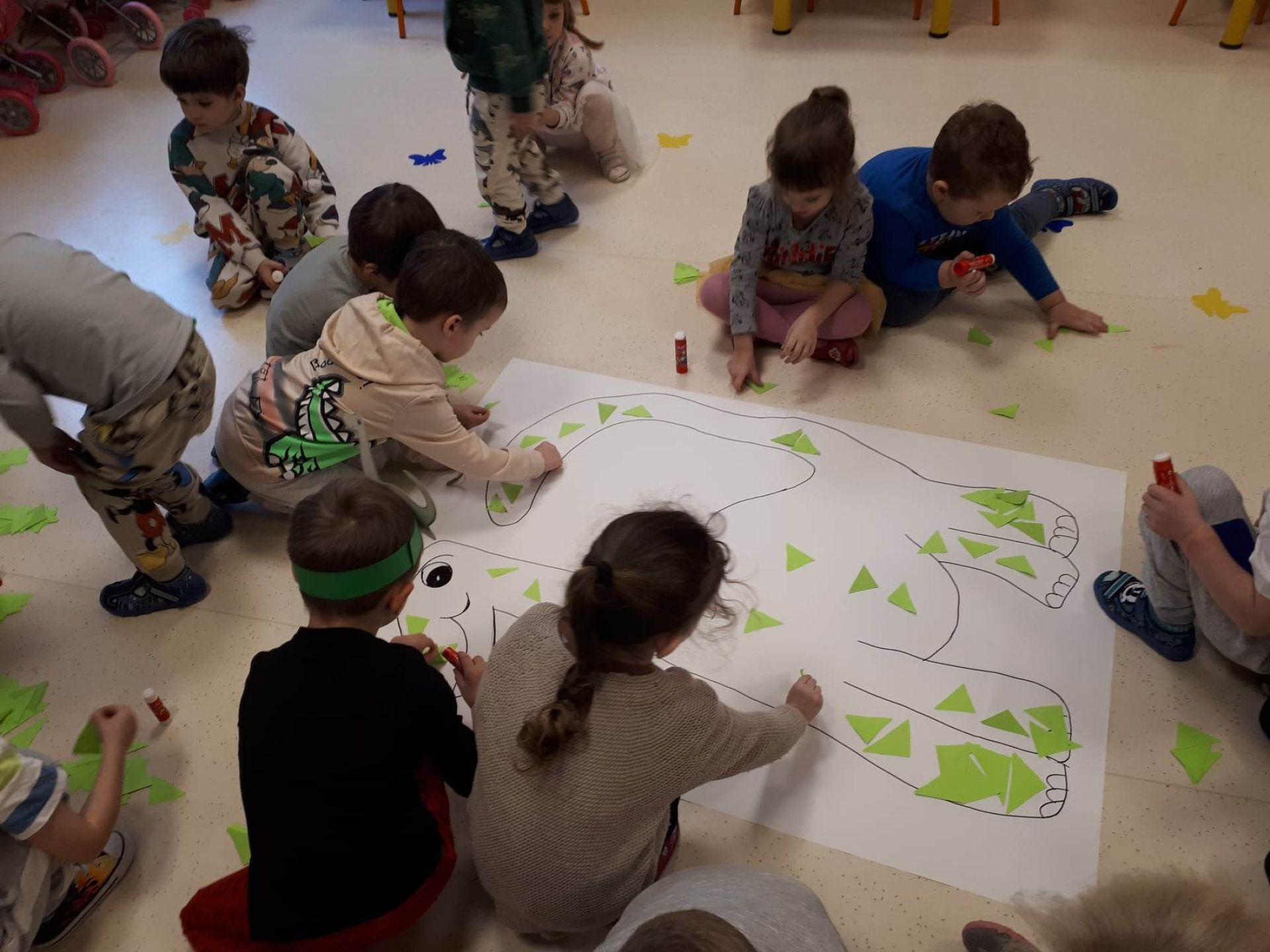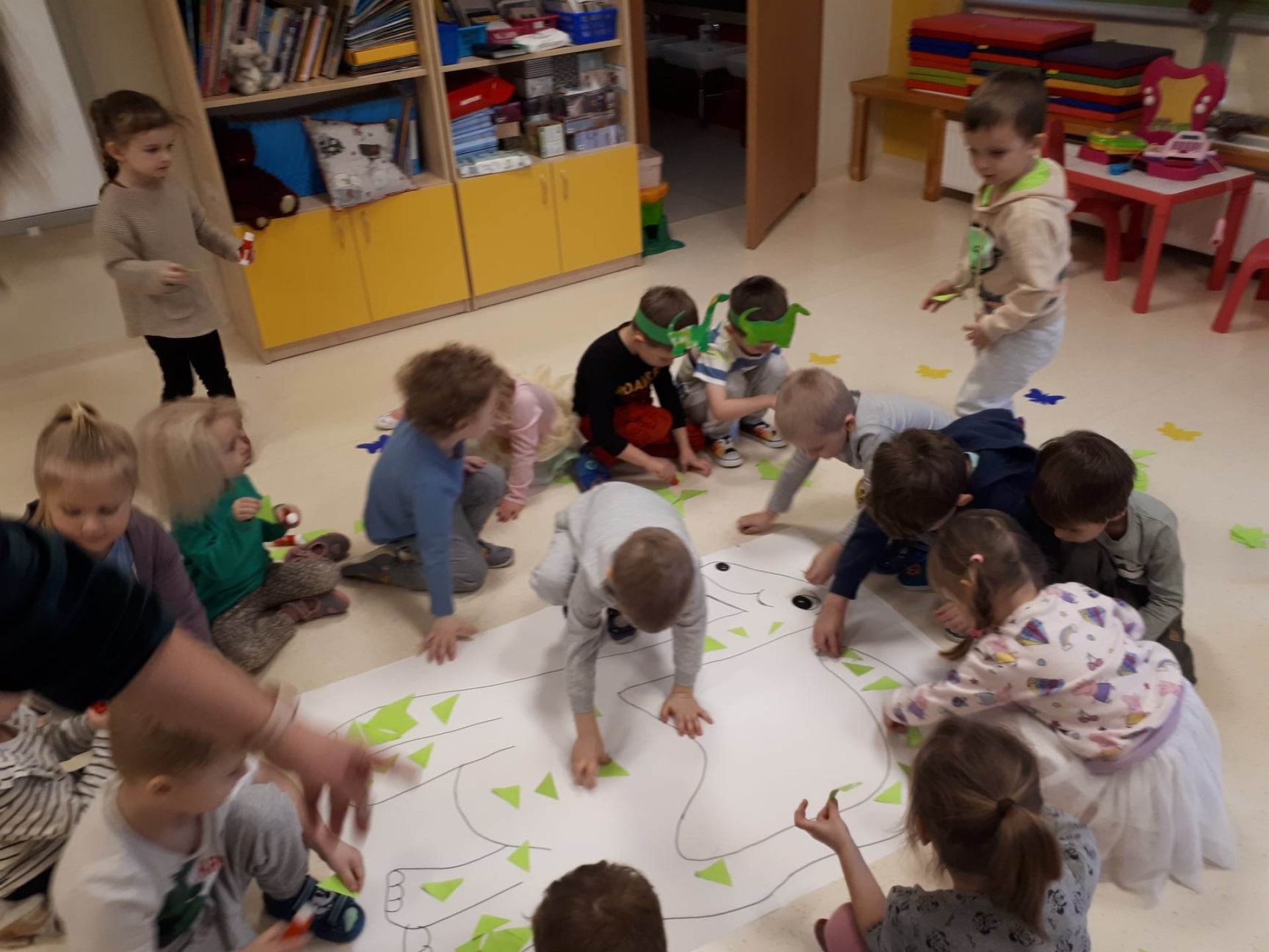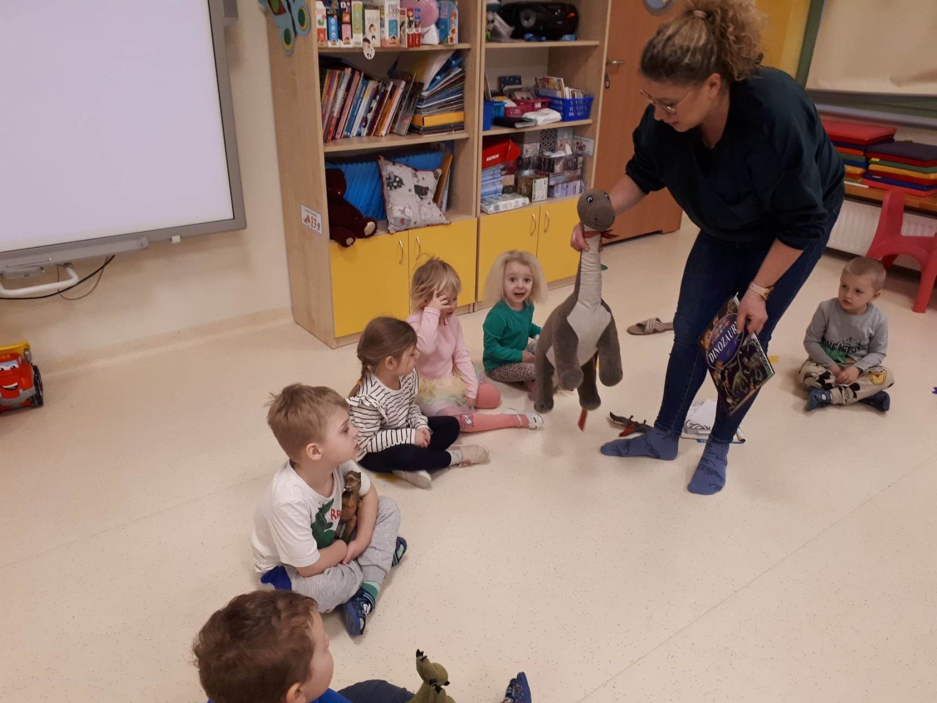 W dniu dzisiejszym Motylki obchodziły Światowy Dzień Dinozaura. Dzieci poznały historię dinozaurów, bawiły się w paleontologów, tańczyły ze swoimi dinozaurami. Dzięki wspólnej pracy powstał gigantyczny Diplodok który zadomowił się na drzwiach naszej sali. Na zakończenie każde dziecko miało zrobione zdjęcie w masce i opasce dinozaura.