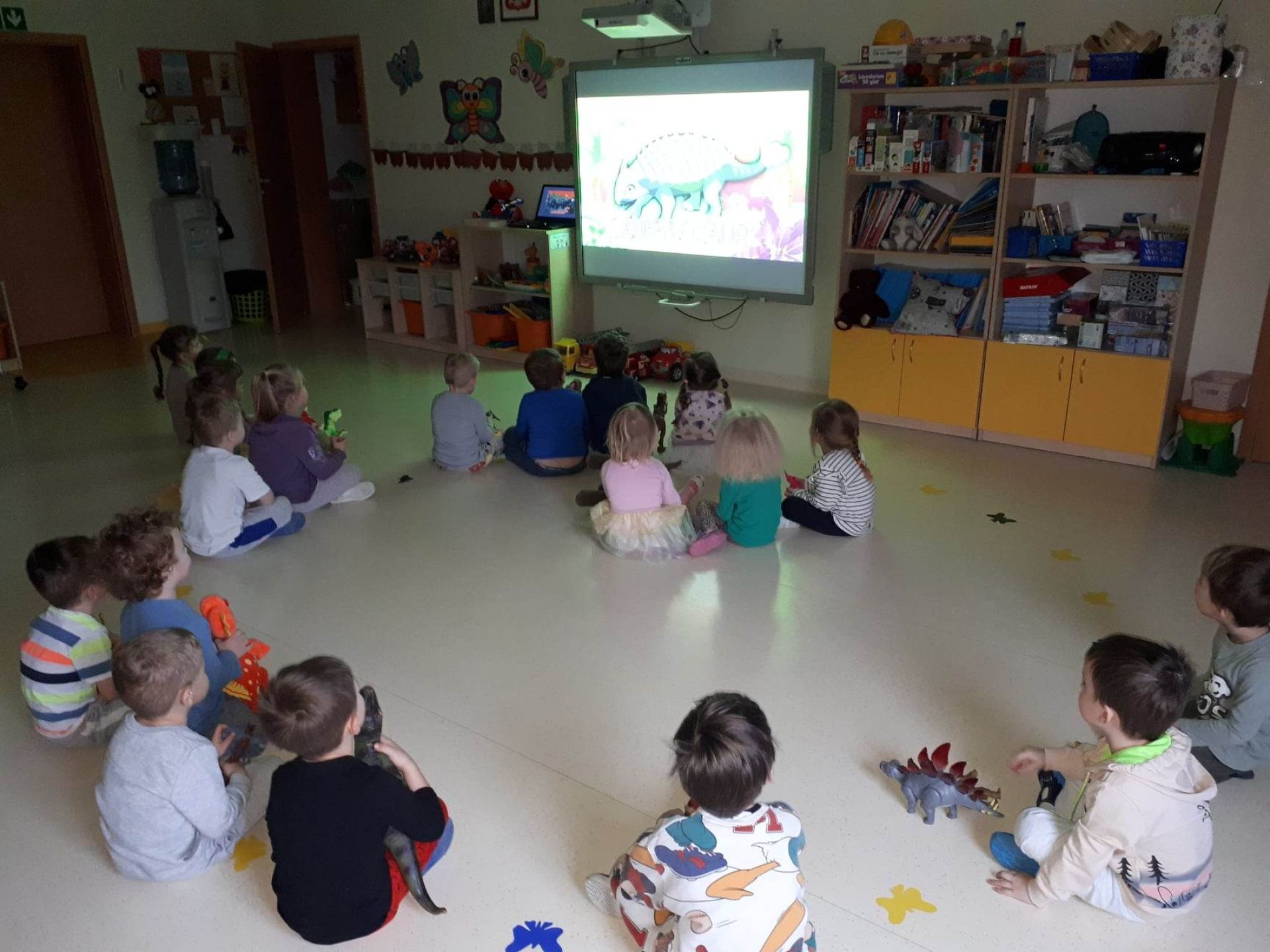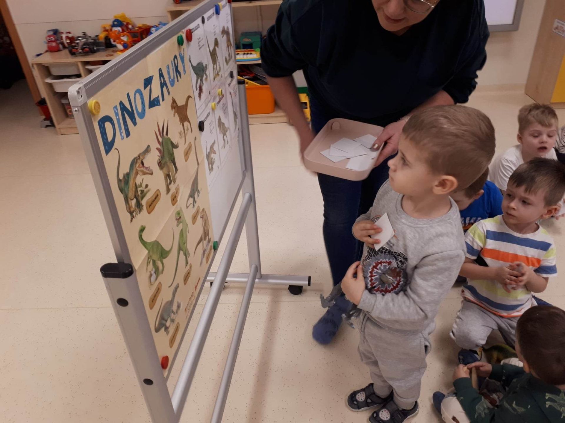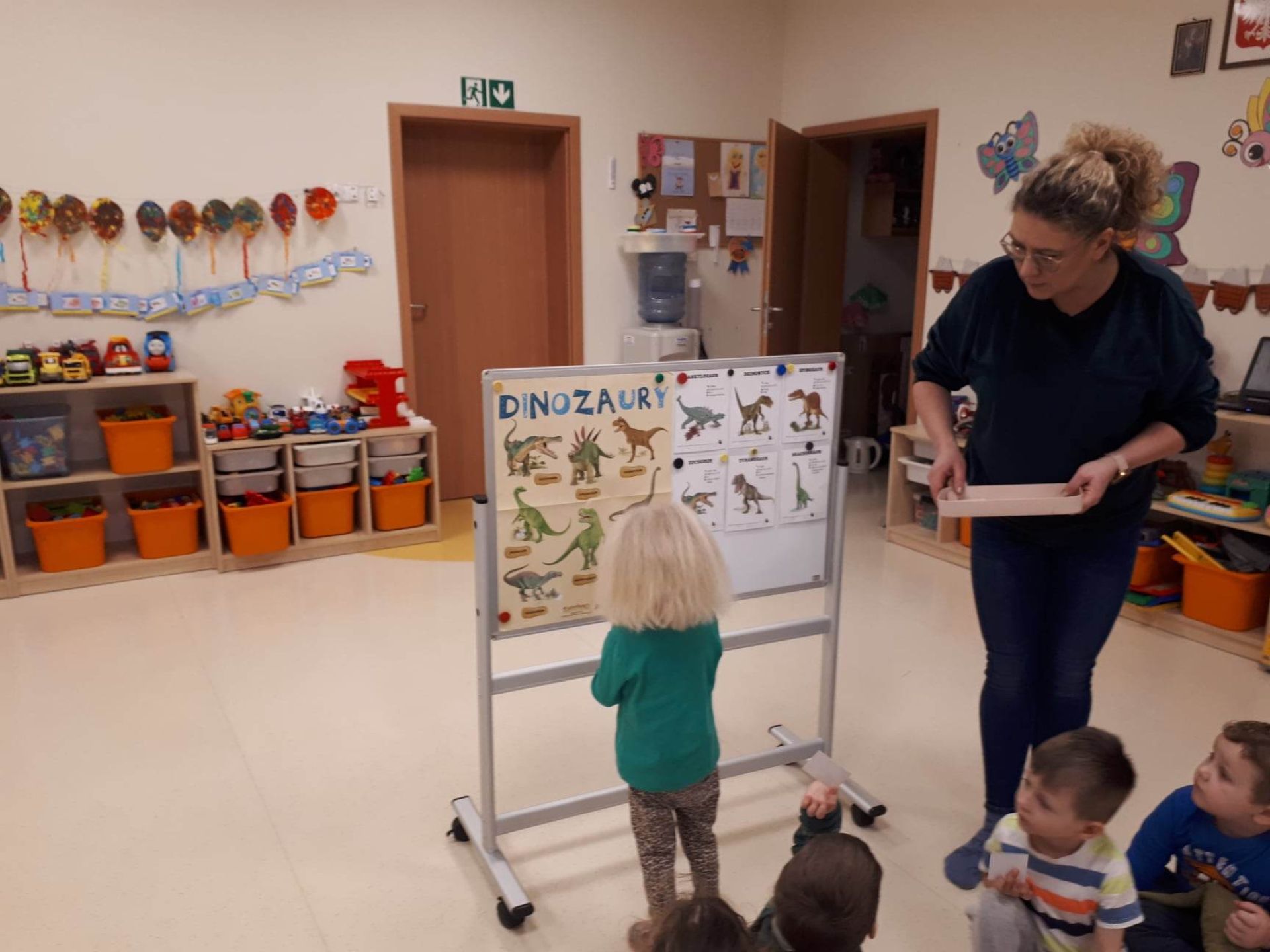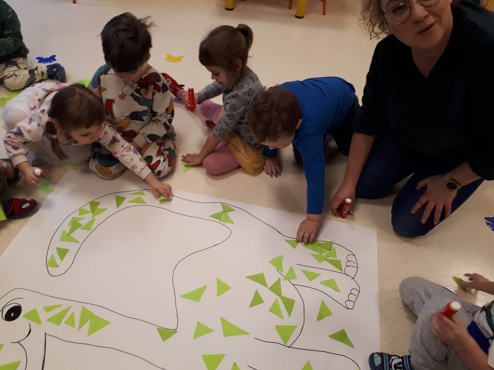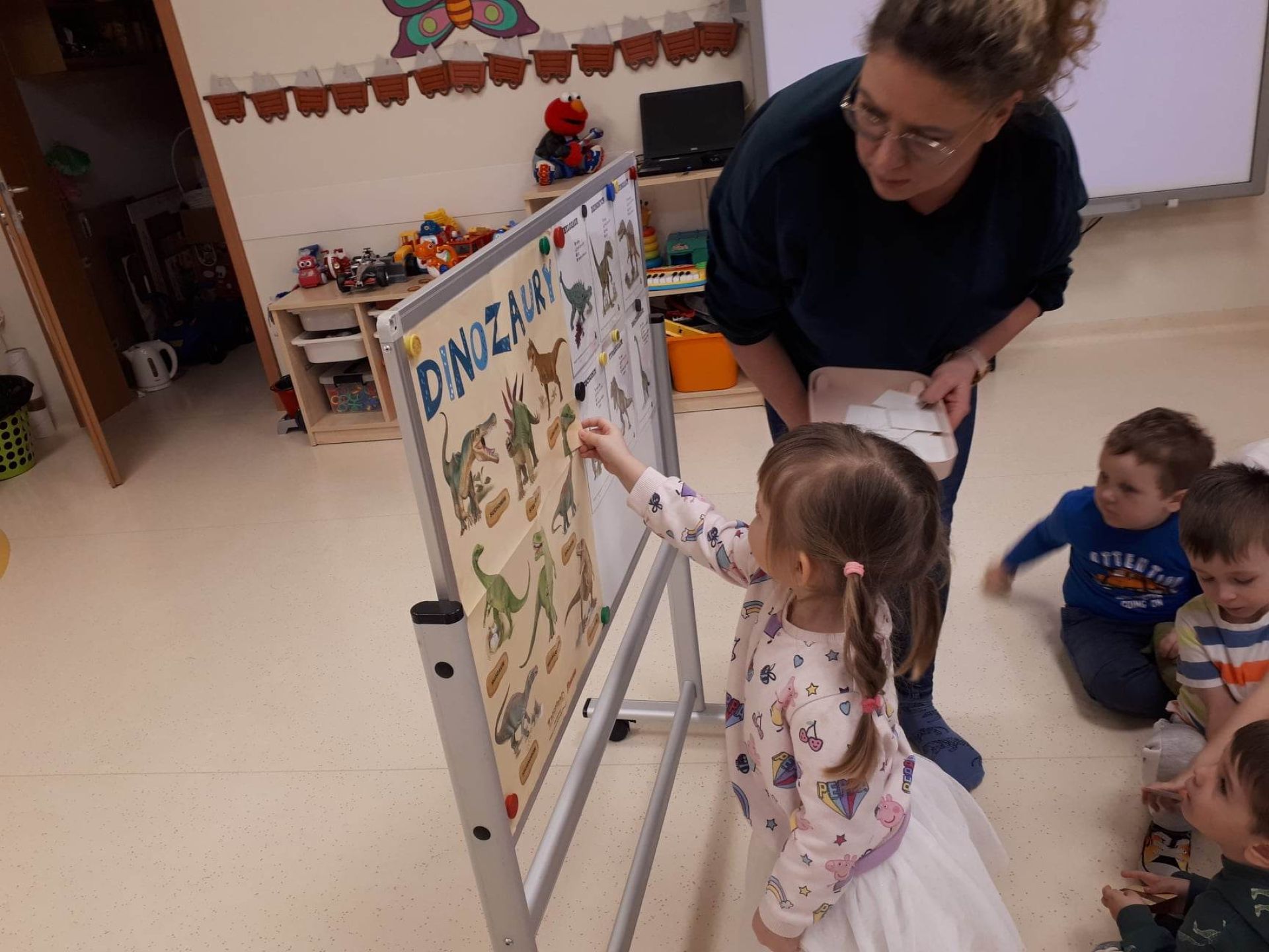 W dniu dzisiejszym Motylki obchodziły Światowy Dzień Dinozaura. Dzieci poznały historię dinozaurów, bawiły się w paleontologów, tańczyły ze swoimi dinozaurami. Dzięki wspólnej pracy powstał gigantyczny Diplodok który zadomowił się na drzwiach naszej sali. Na zakończenie każde dziecko miało zrobione zdjęcie w masce i opasce dinozaura.