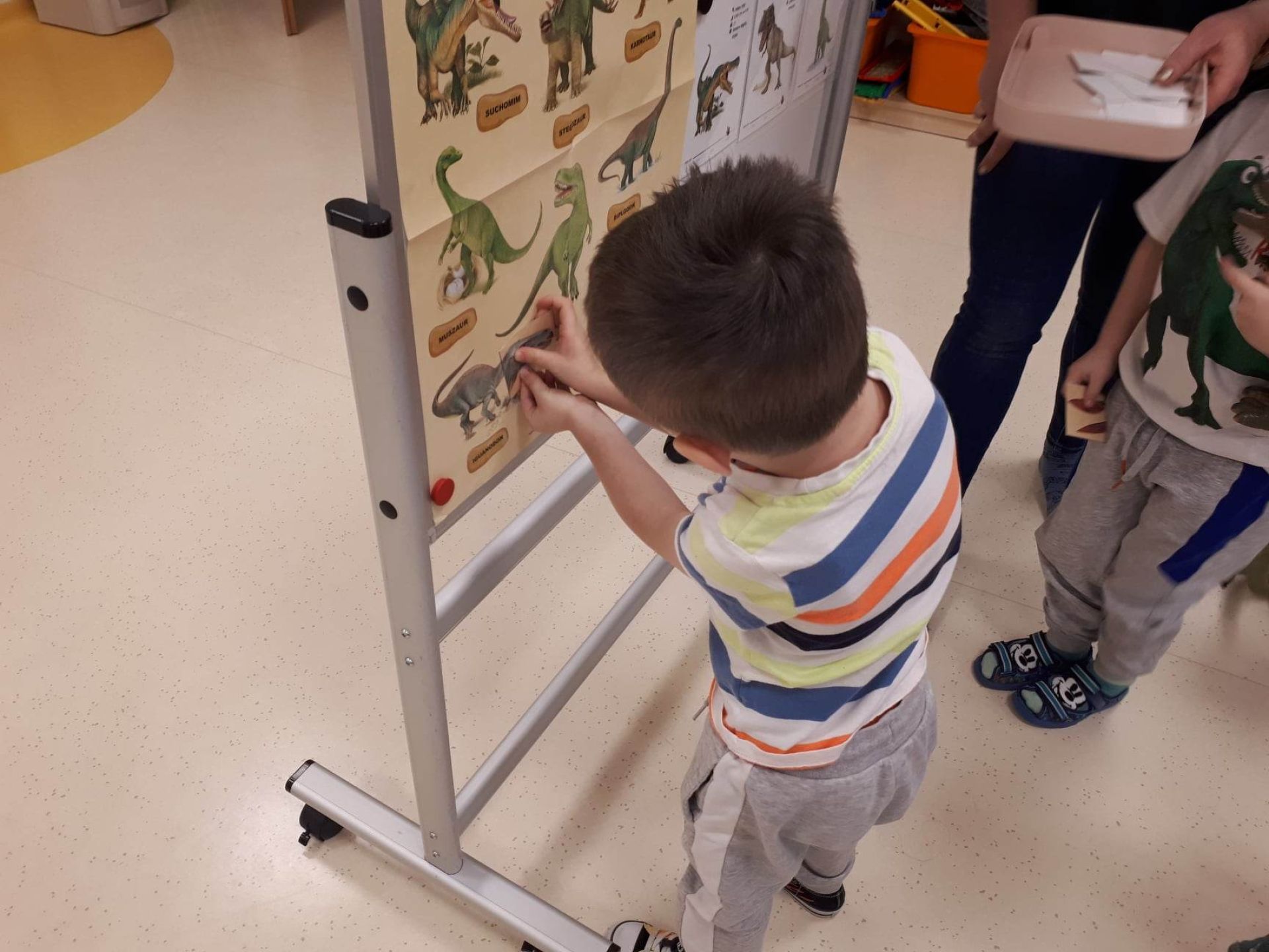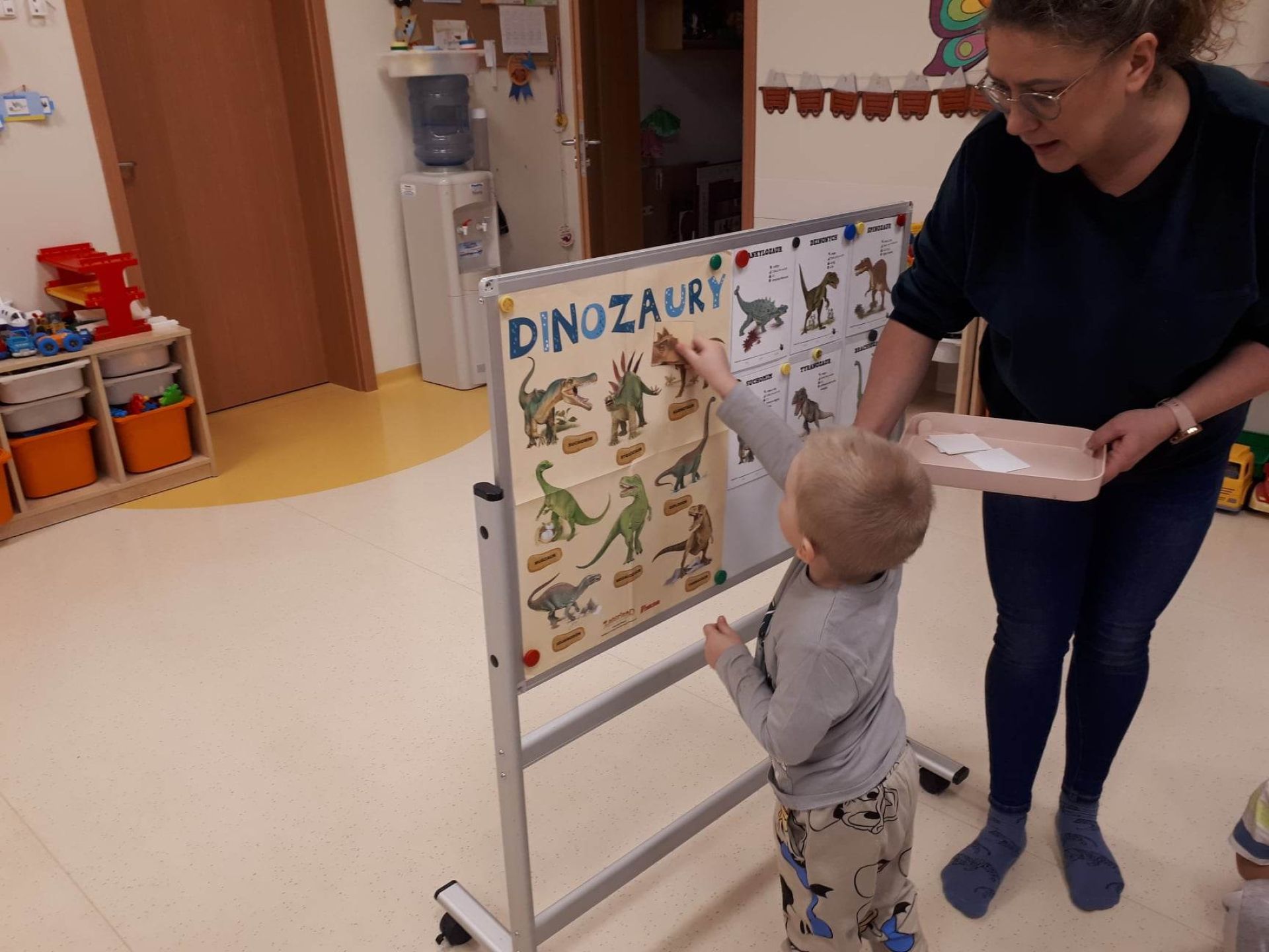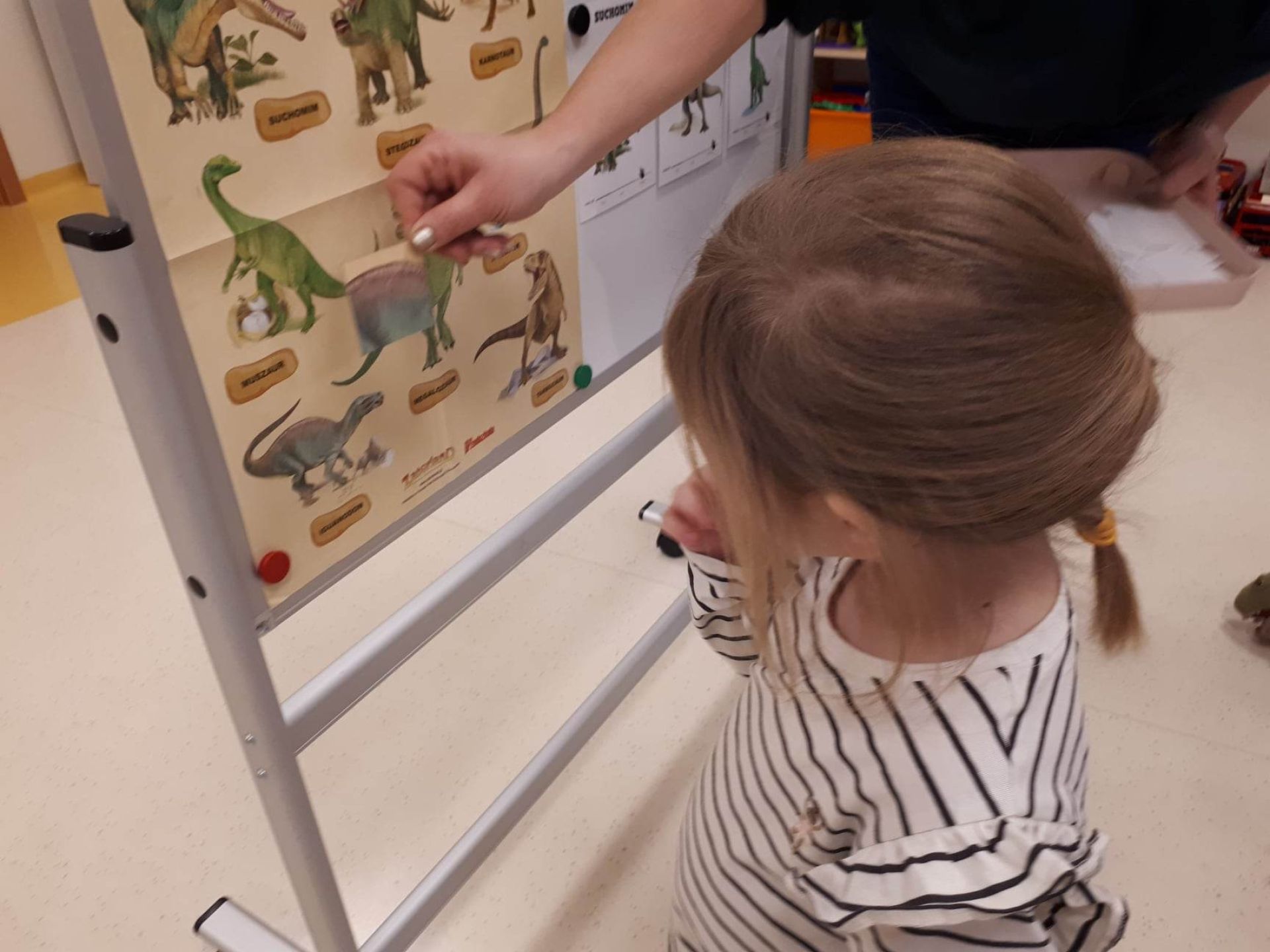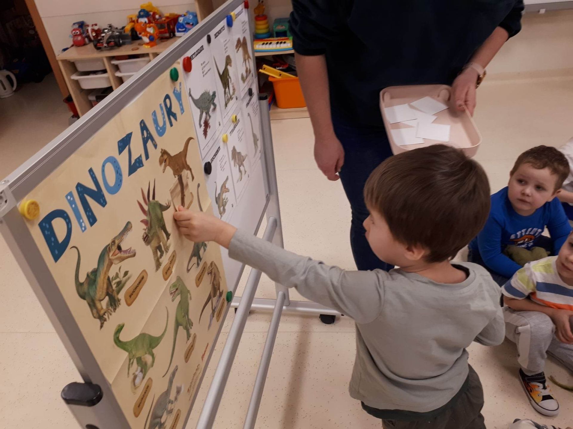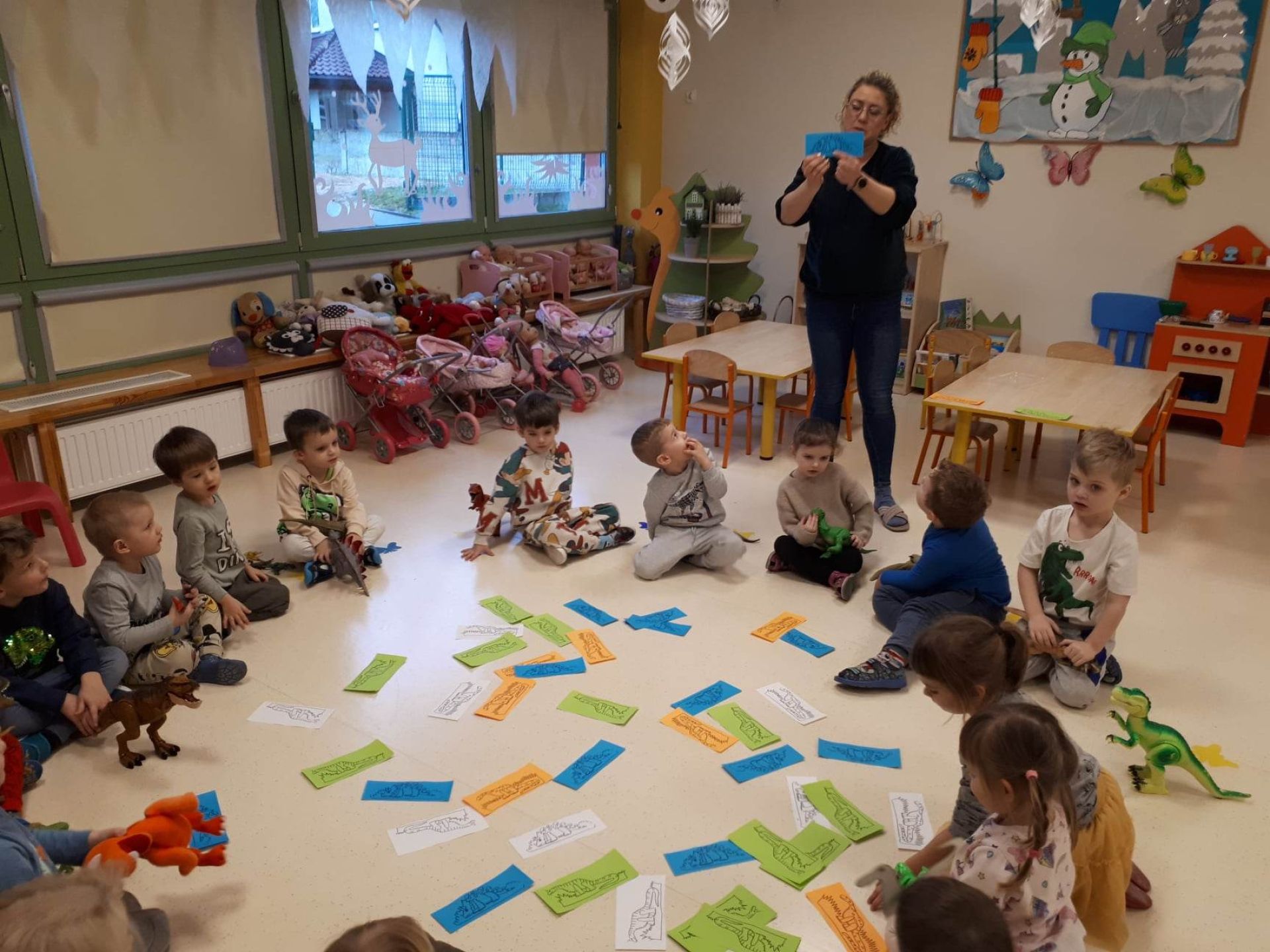W dniu dzisiejszym Motylki obchodziły Światowy Dzień Dinozaura. Dzieci poznały historię dinozaurów, bawiły się w paleontologów, tańczyły ze swoimi dinozaurami. Dzięki wspólnej pracy powstał gigantyczny Diplodok który zadomowił się na drzwiach naszej sali. Na zakończenie każde dziecko miało zrobione zdjęcie w masce i opasce dinozaura.