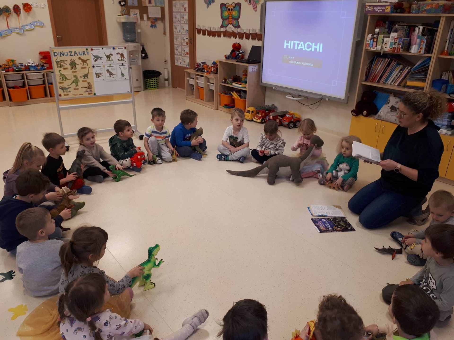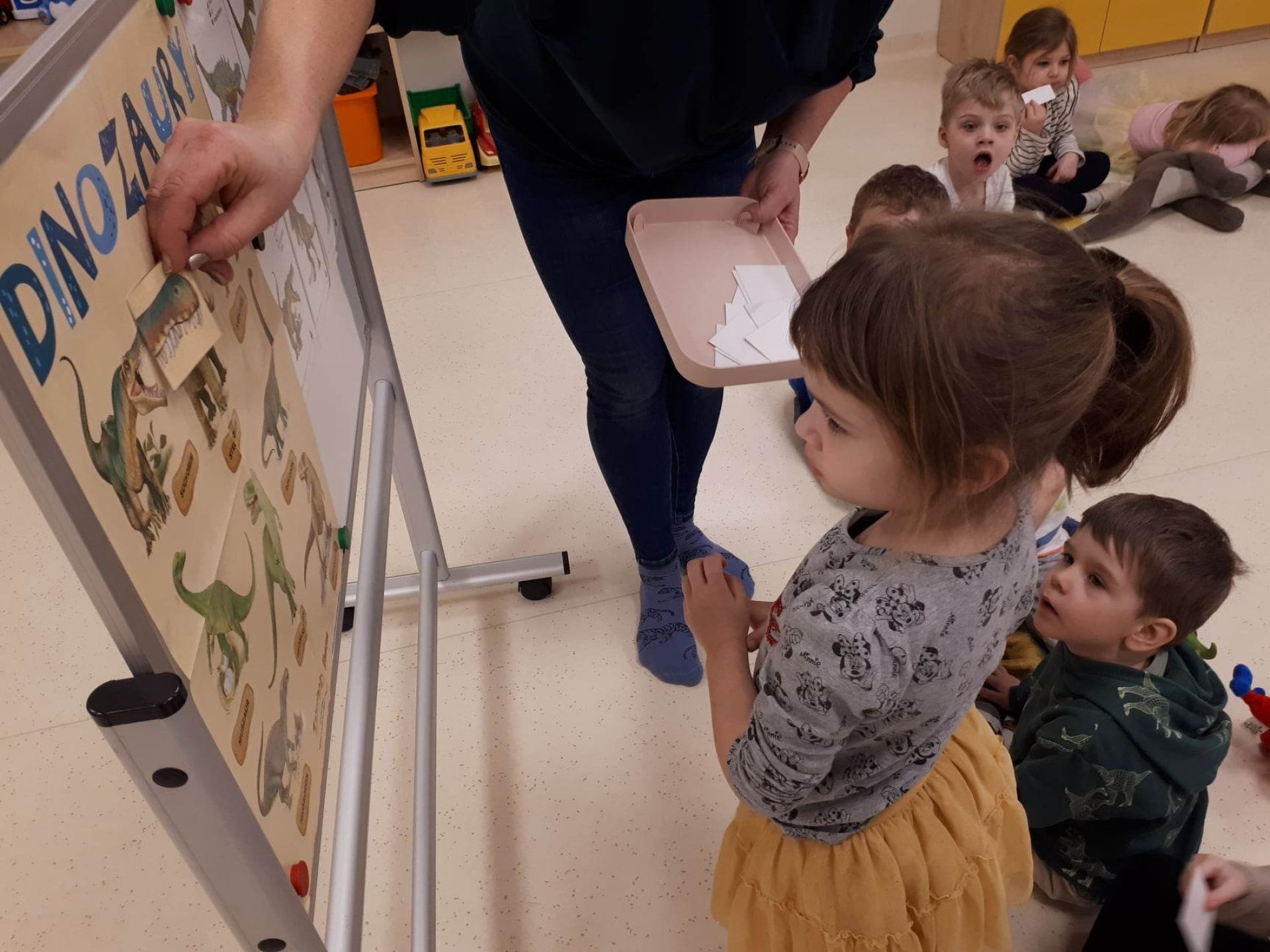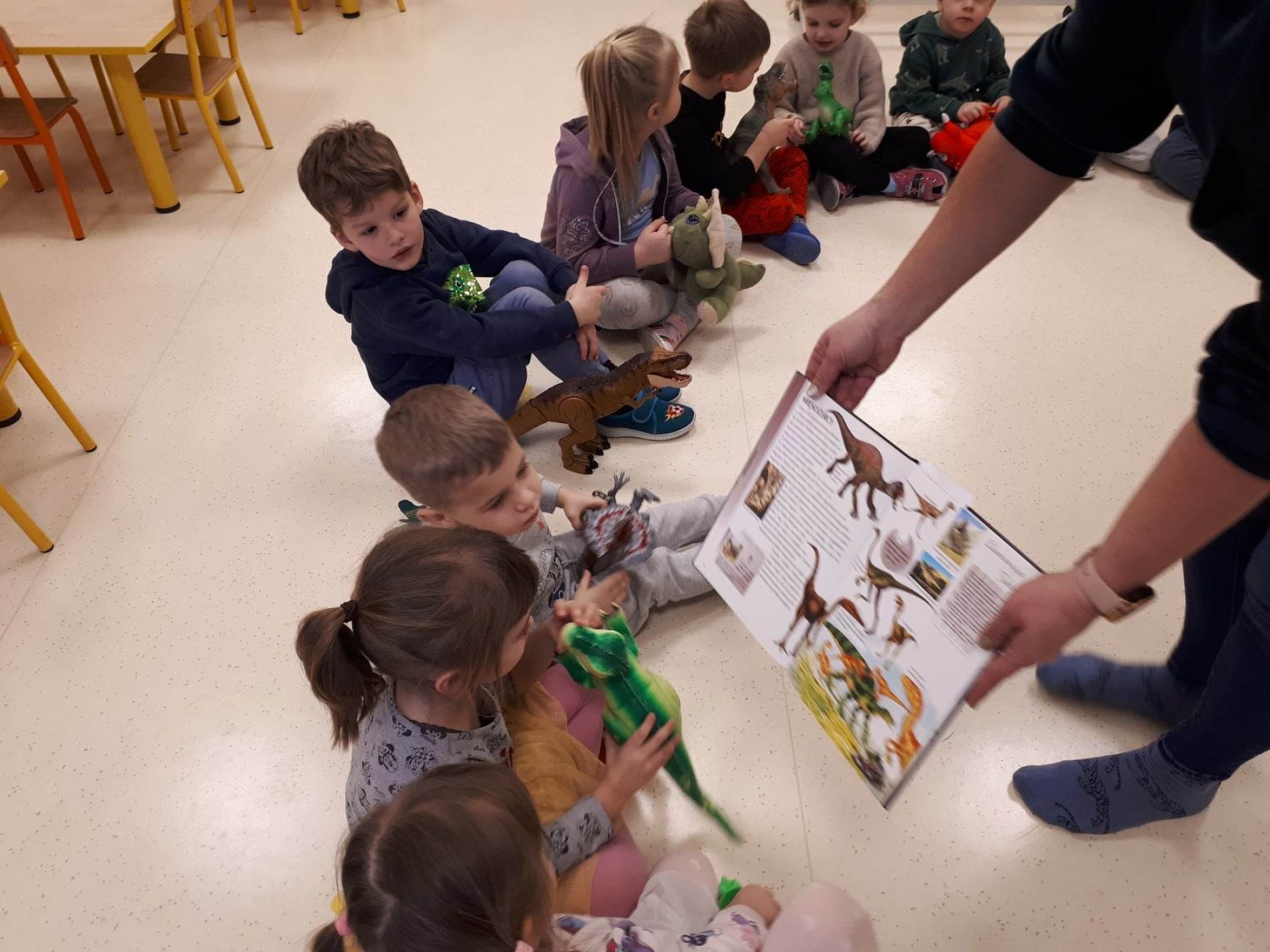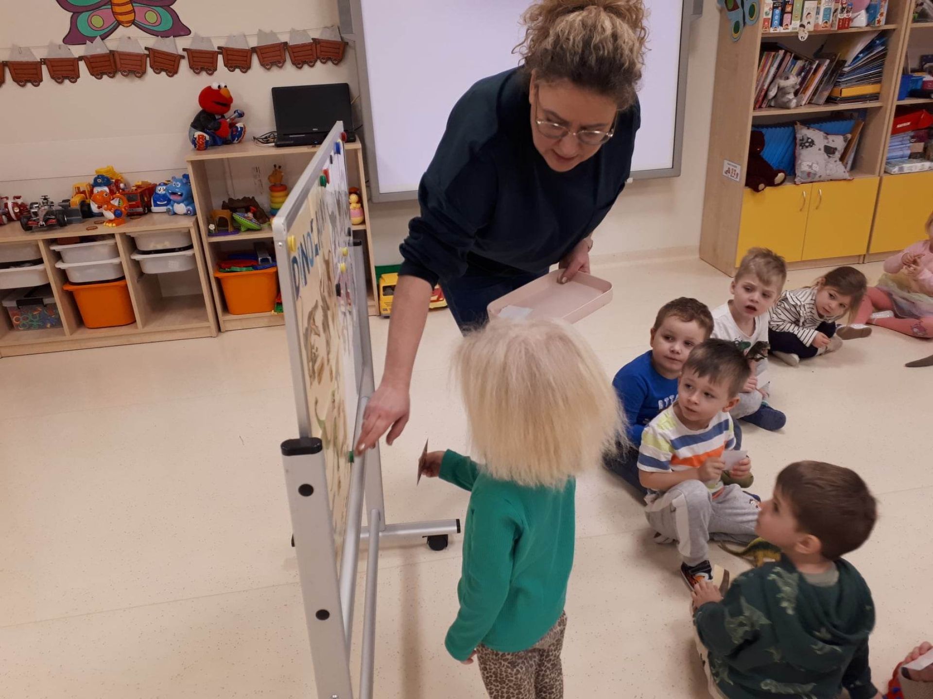 W dniu dzisiejszym Motylki obchodziły Światowy Dzień Dinozaura. Dzieci poznały historię dinozaurów, bawiły się w paleontologów, tańczyły ze swoimi dinozaurami. Dzięki wspólnej pracy powstał gigantyczny Diplodok który zadomowił się na drzwiach naszej sali. Na zakończenie każde dziecko miało zrobione zdjęcie w masce i opasce dinozaura.