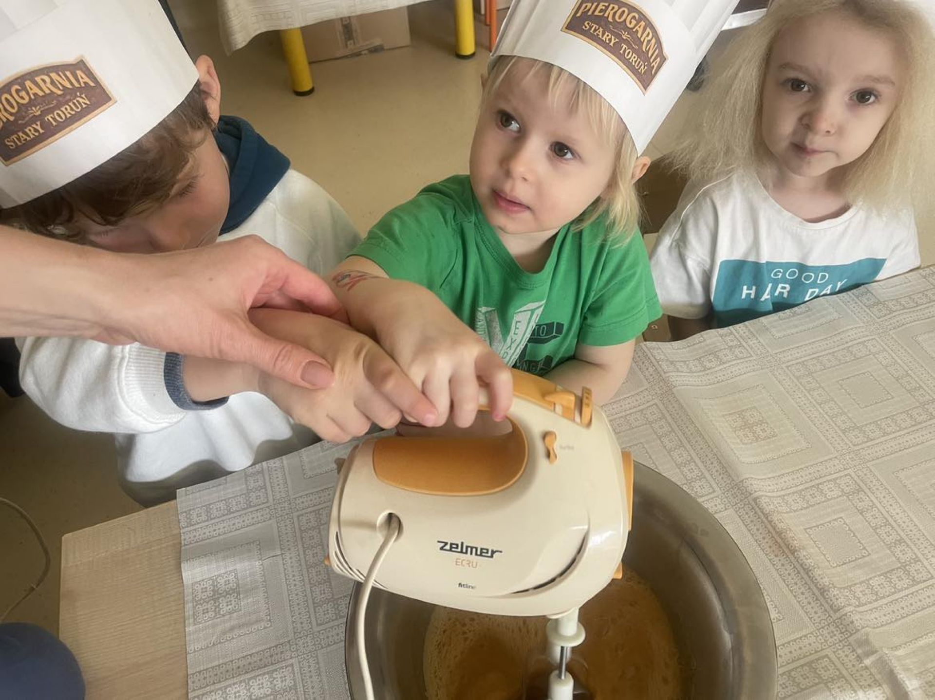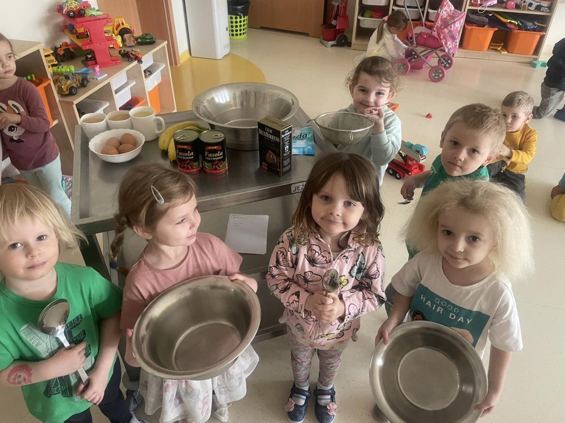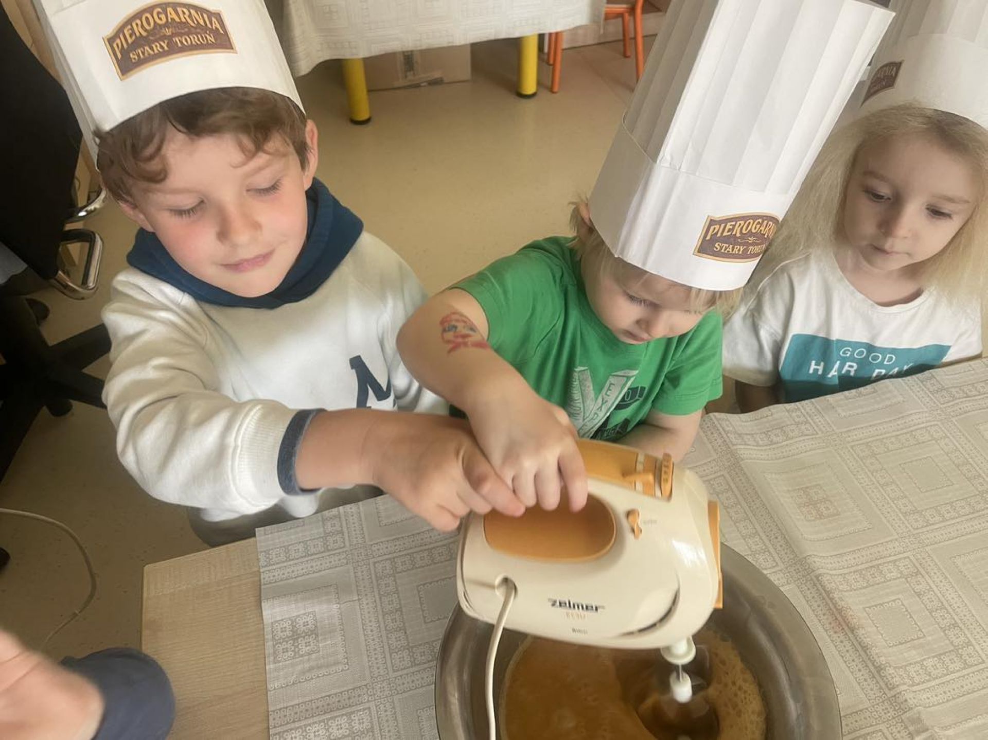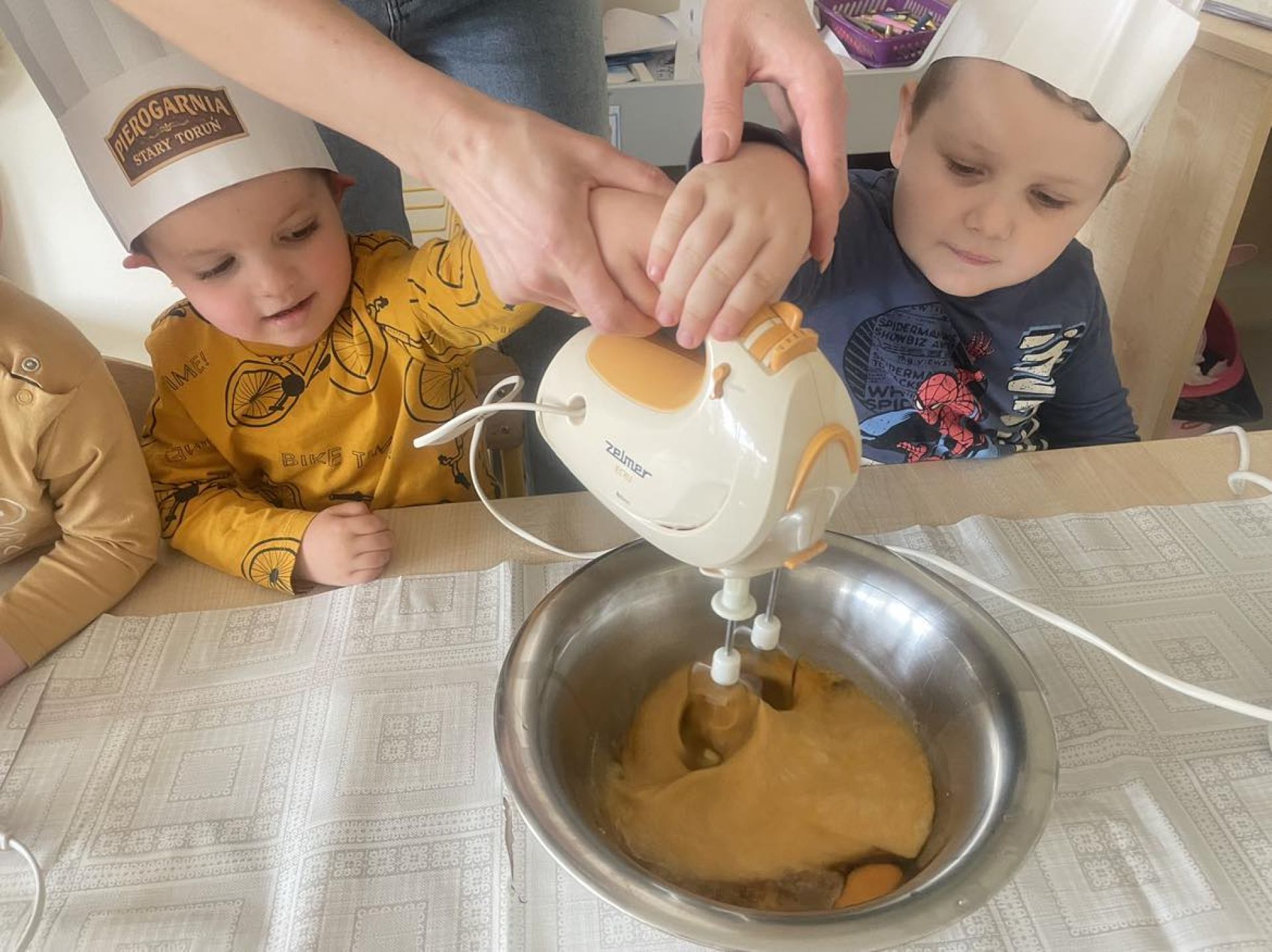 W dniu dzisiejszym Motylki piekły ciasto czekoladowe. Było to nowe doświadczenie , ponieważ dzieci miały okazję zobaczyć ,że z fasoli może powstać słodkie ciasto.