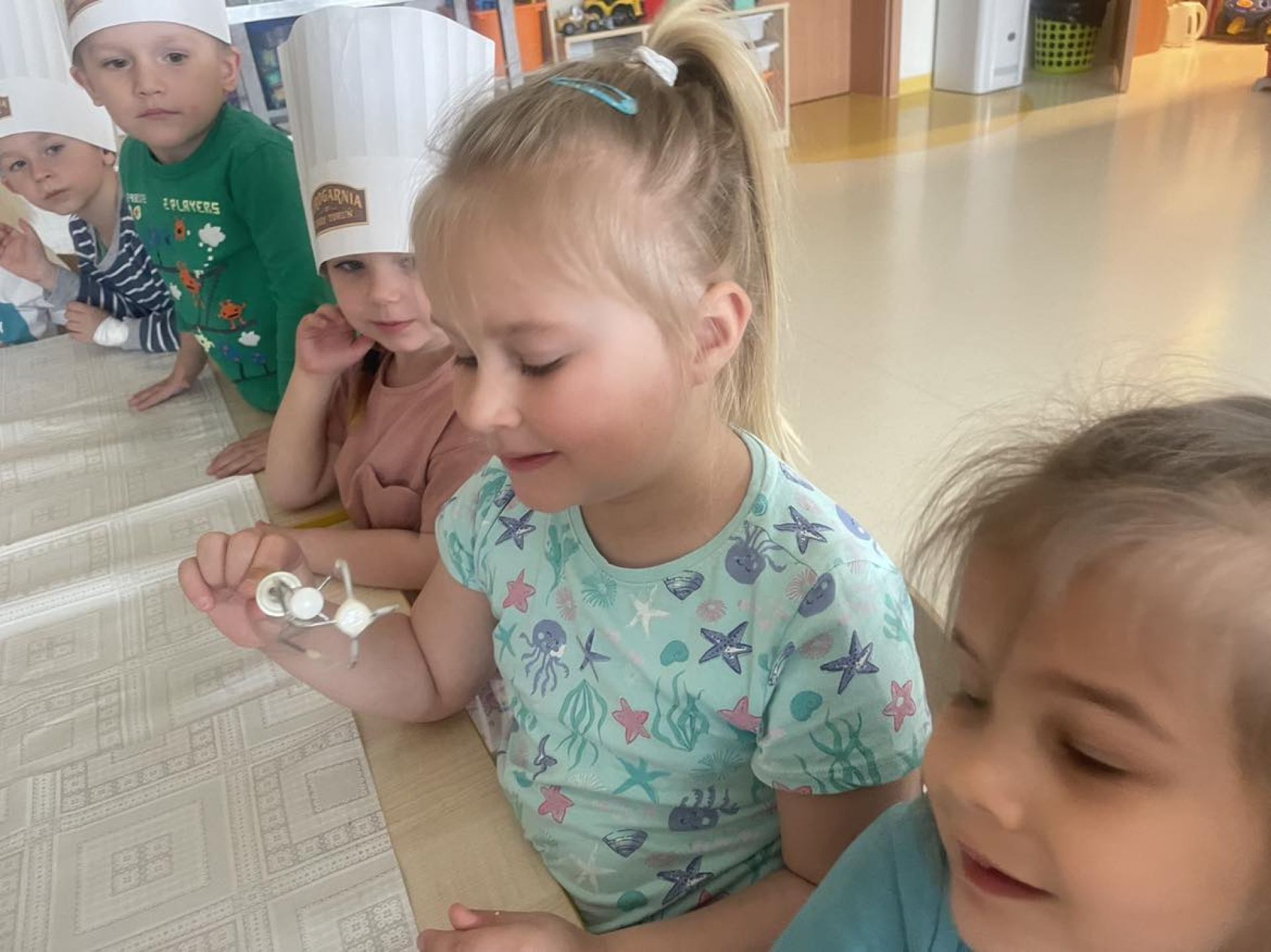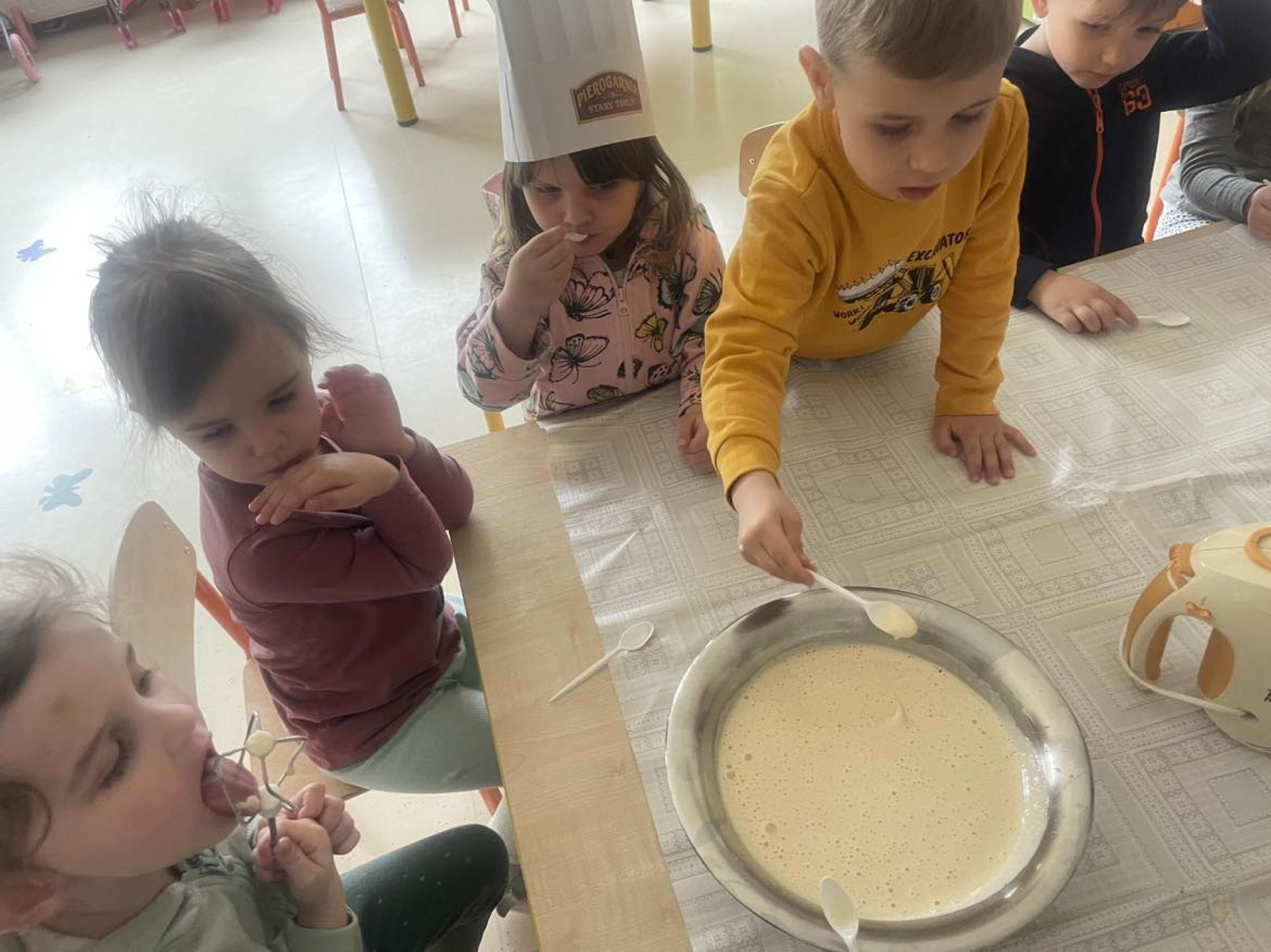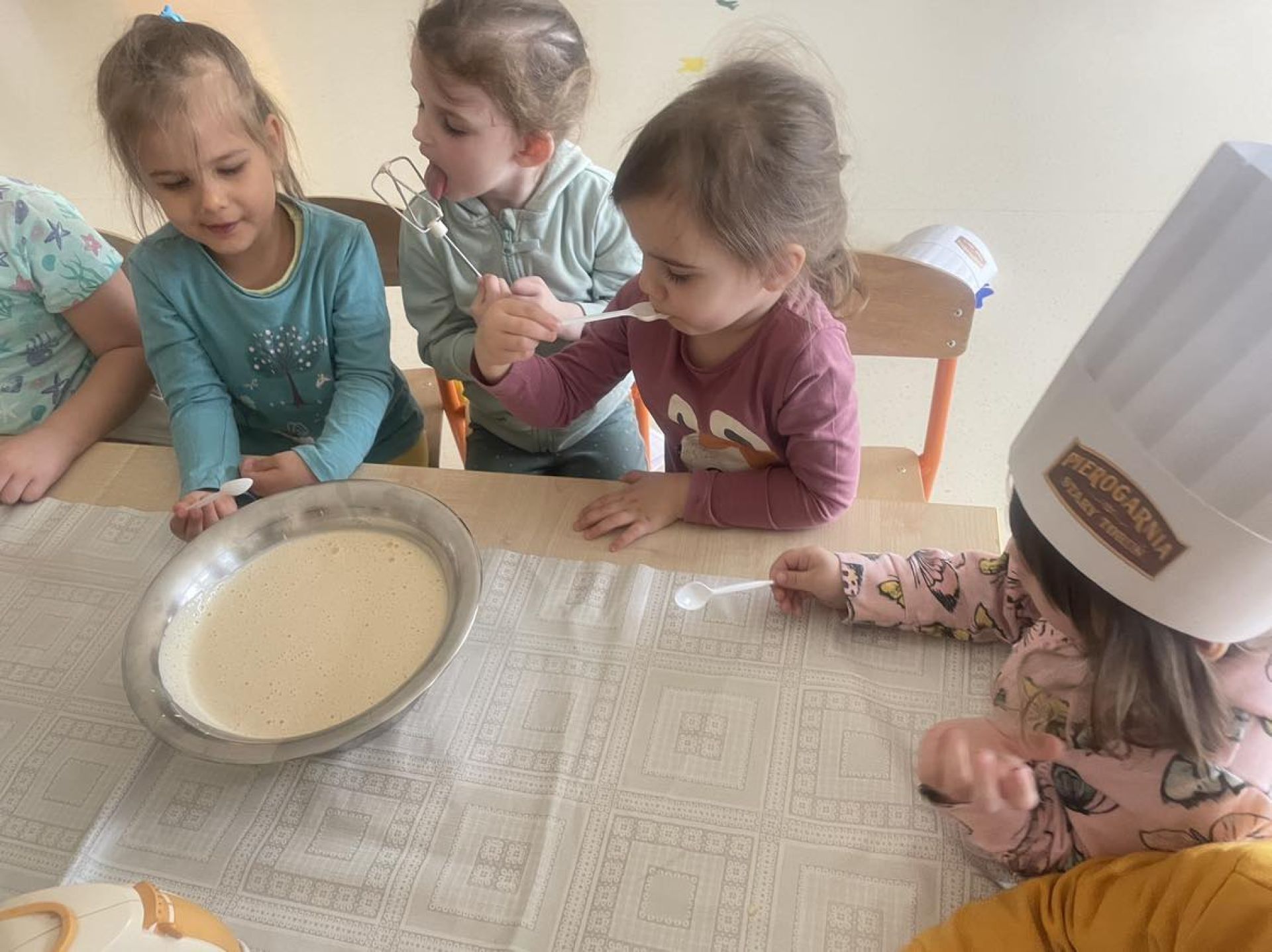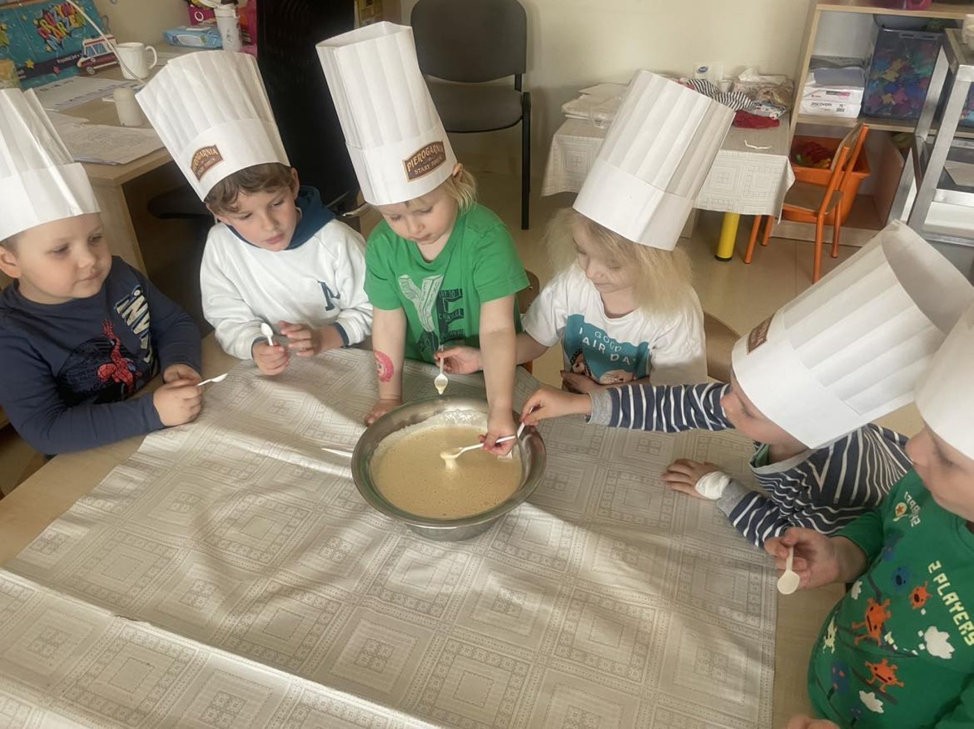 W dniu dzisiejszym Motylki piekły ciasto czekoladowe. Było to nowe doświadczenie , ponieważ dzieci miały okazję zobaczyć ,że z fasoli może powstać słodkie ciasto.