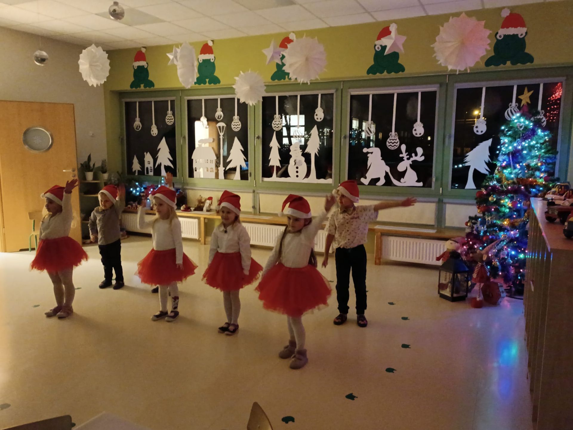 Świąteczne spotkanie z Rodzicami to niesamowity dzień dla wszystkich dzieci, które już od rana czekały na przyjście Rodziców. Żabki przedstawiły program artystyczny, śpiewając kolędy, pastorałki i tańcząc przy blasku lampek choinkowych i świec i złożyły świąteczne życzenia. Nie mogło zabraknąć słodkiego poczęstunku, które przygotowali Rodzice i przedszkole. Towarzyszyła temu przedświąteczna atmosfera. Odwiedził nas także Mikołaj, który przyniósł cudowne prezenty dla każdego dziecka jaka i dla grupy. Bardzo dziękujemy Radzie Rodziców za prezenty i P. Kopczyńskim za strój Św. Mikołaja.