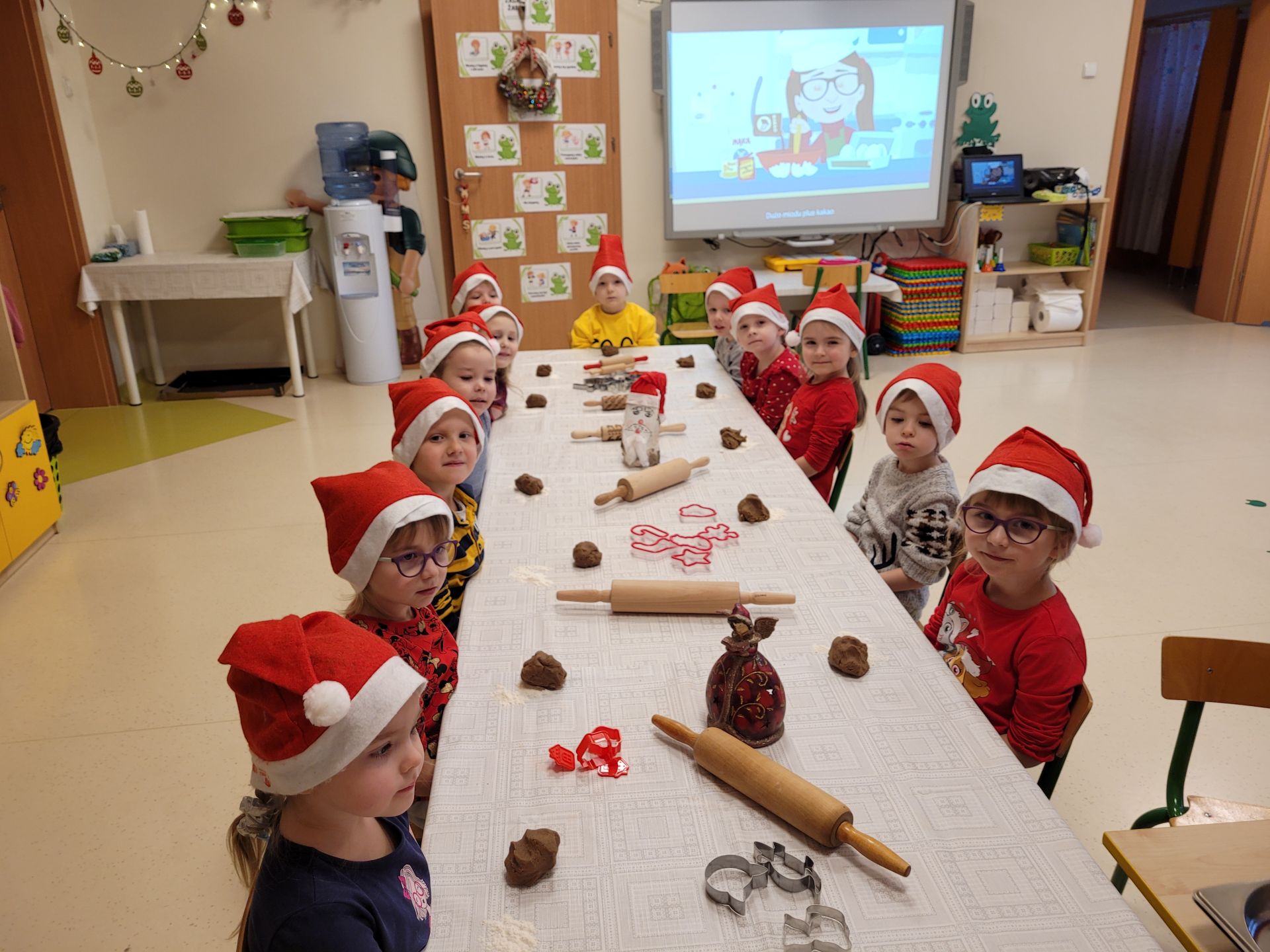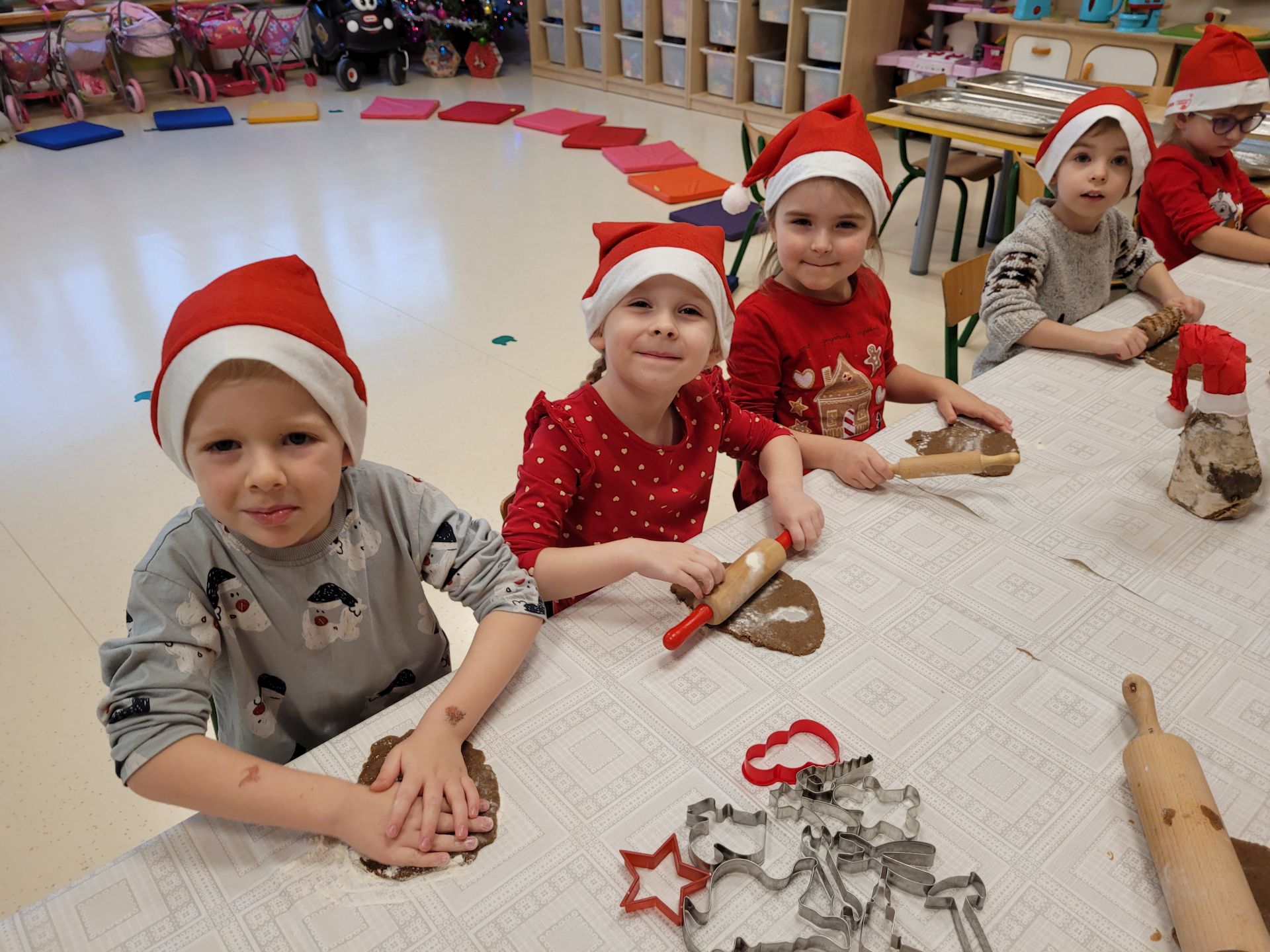 Żabki poznały sposób przygotowania ciasta na pierniczki. Wałkowały i wykrawały ciasto wybierając rożne kształty foremek: aniołki, bałwanki, dzwoneczki, choineczki, gwiazdki itp. Wszystko działo sie przy pięknych, polskich kolędach, które dzieci śpiewały. Upieczone pierniczki będziemy ozdabiać.
