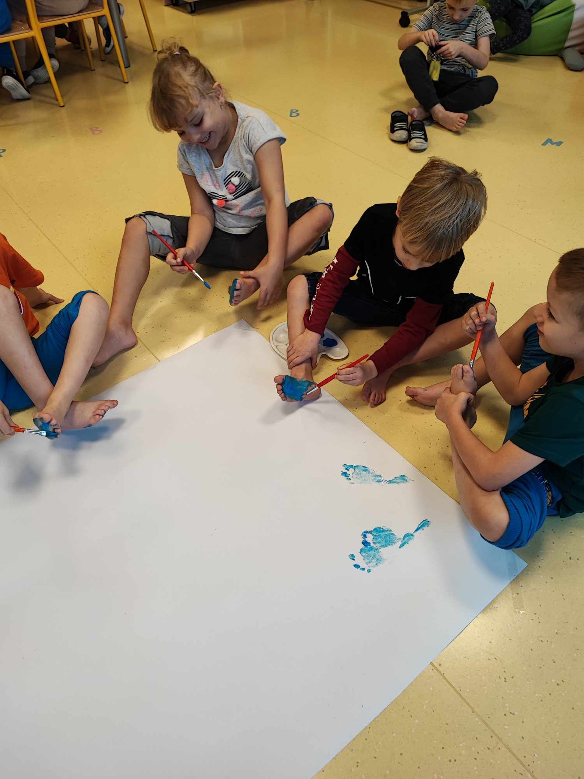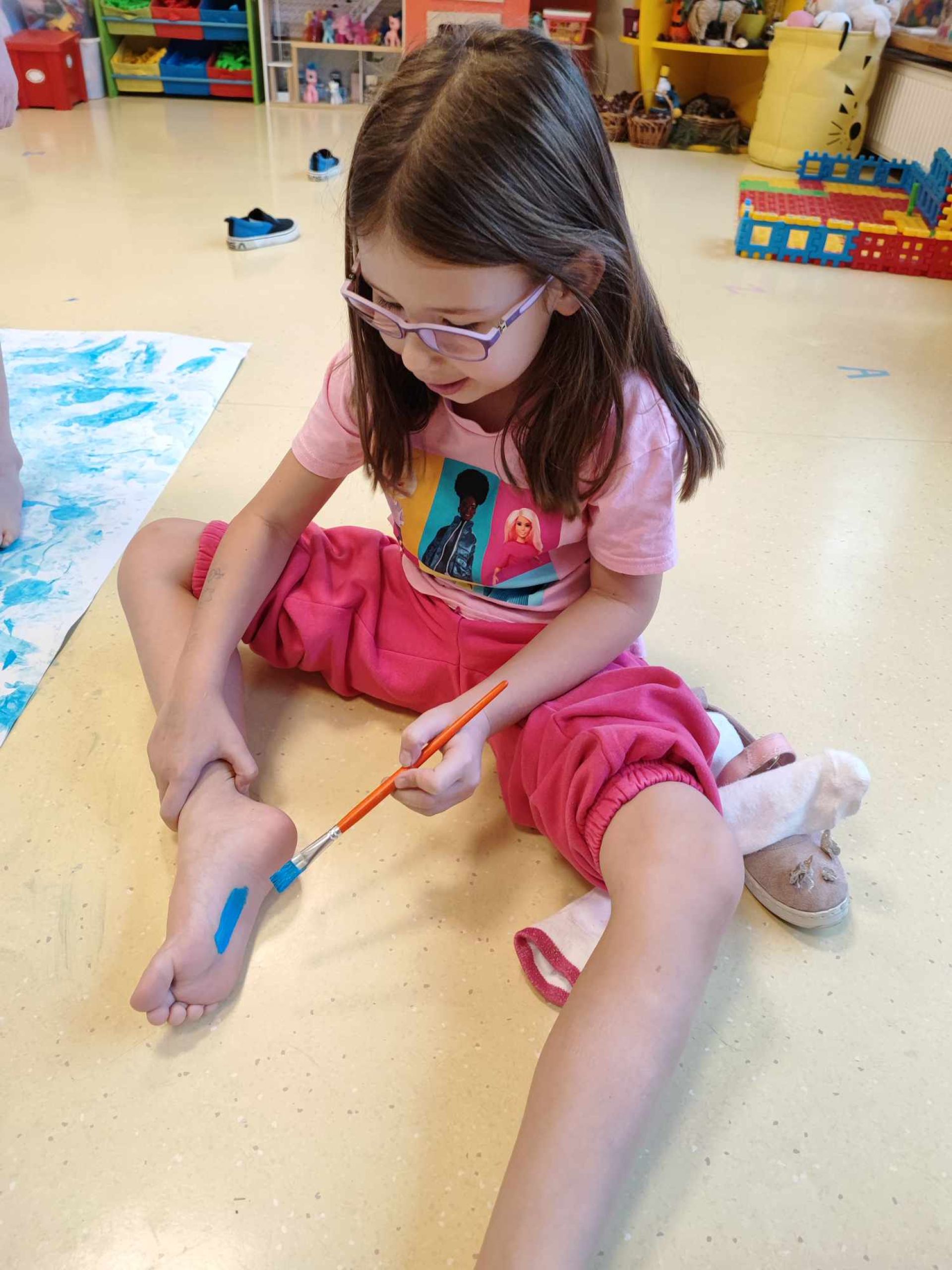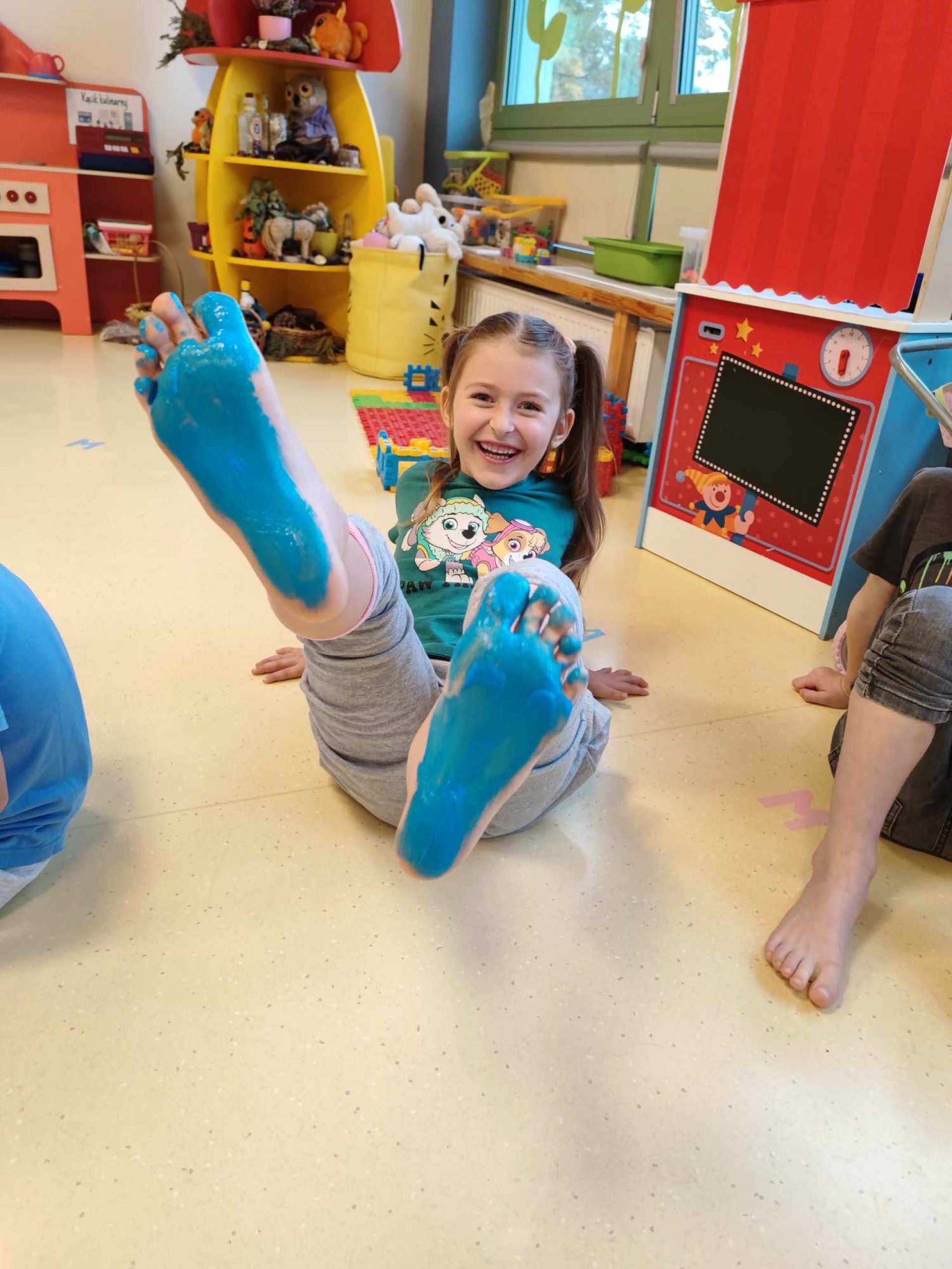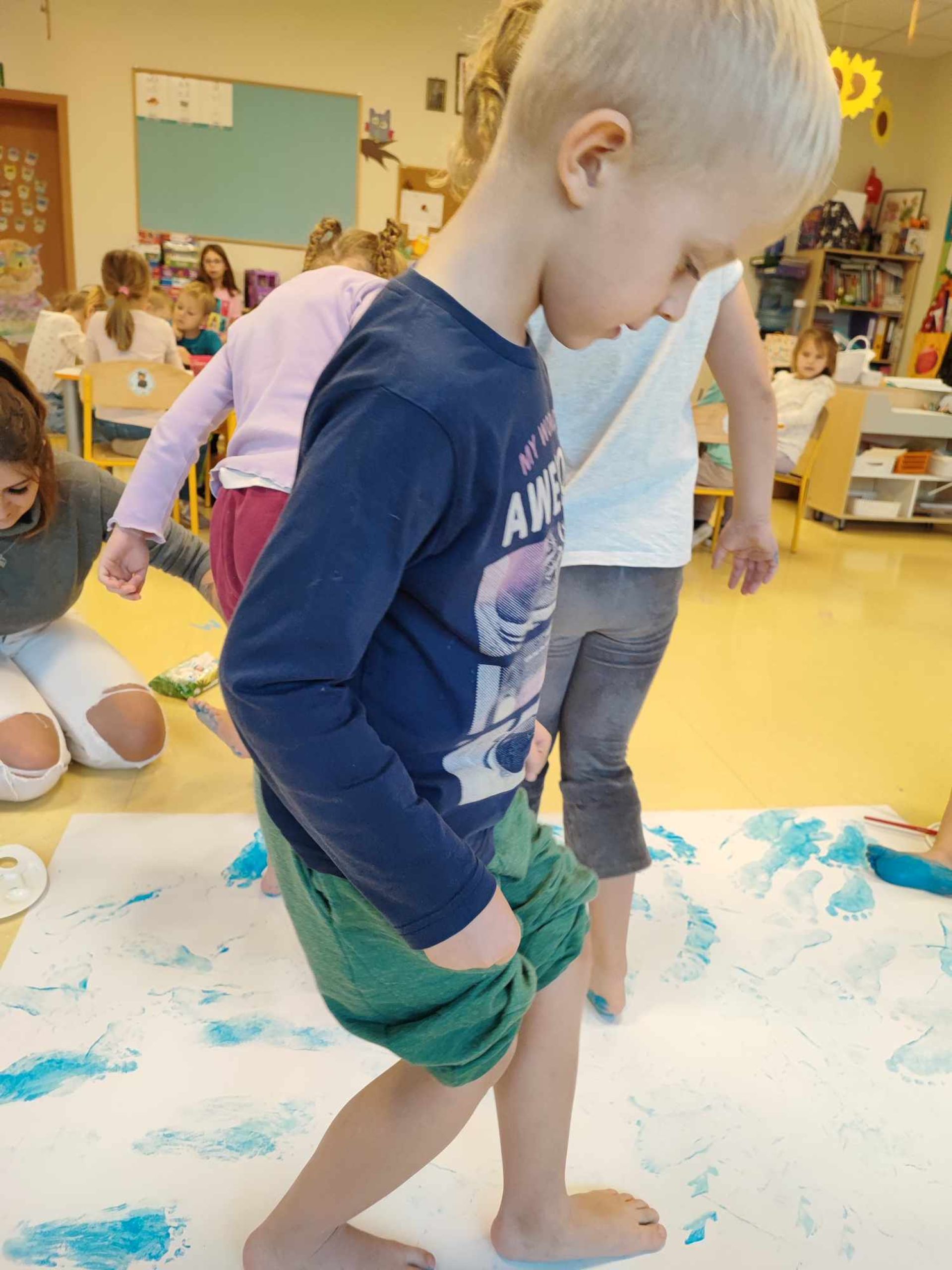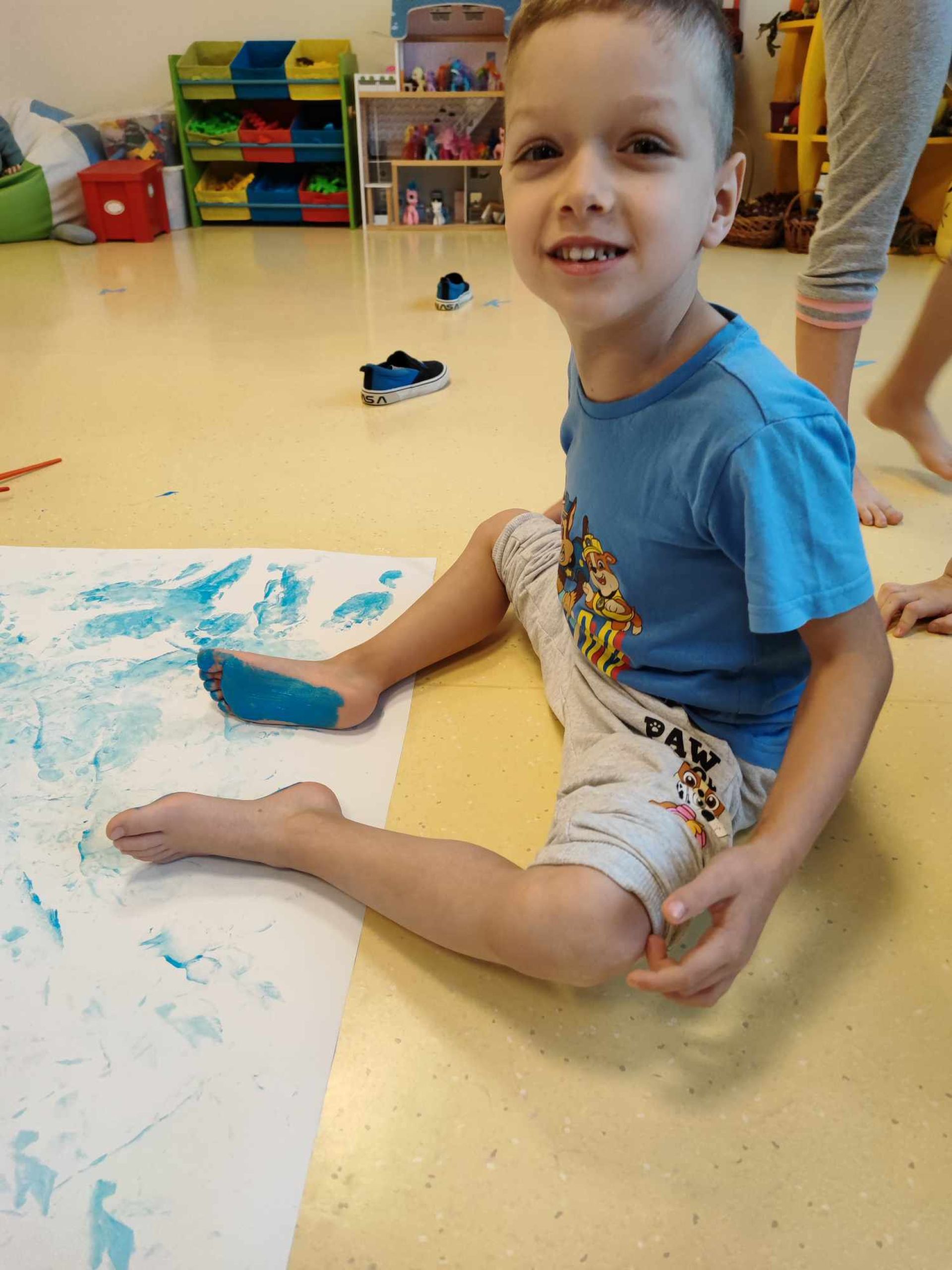 Na zajęciach sensoplastycznych pozwalamy dzieciom na dowolną ekspresję twórczą. Poprzez zanurzanie stóp w farbie przygotowanej na tackach, dzieci pokrywały odbitymi stopami biały arkusz papieru. Malowanie stopami to przede wszystkim fantastyczna zabawa, pełna spontanicznych reakcji, ekspresji twórczej i zdobywania przez dziecko nowych doświadczeń. Malowanie stopami to doskonałe ćwiczenia wspomagające integrację sensoryczną dziecka, w której główną metodą jest posługiwanie się ruchem, jako narzędziem wspomagania rozwoju psychoruchowego dzieci.