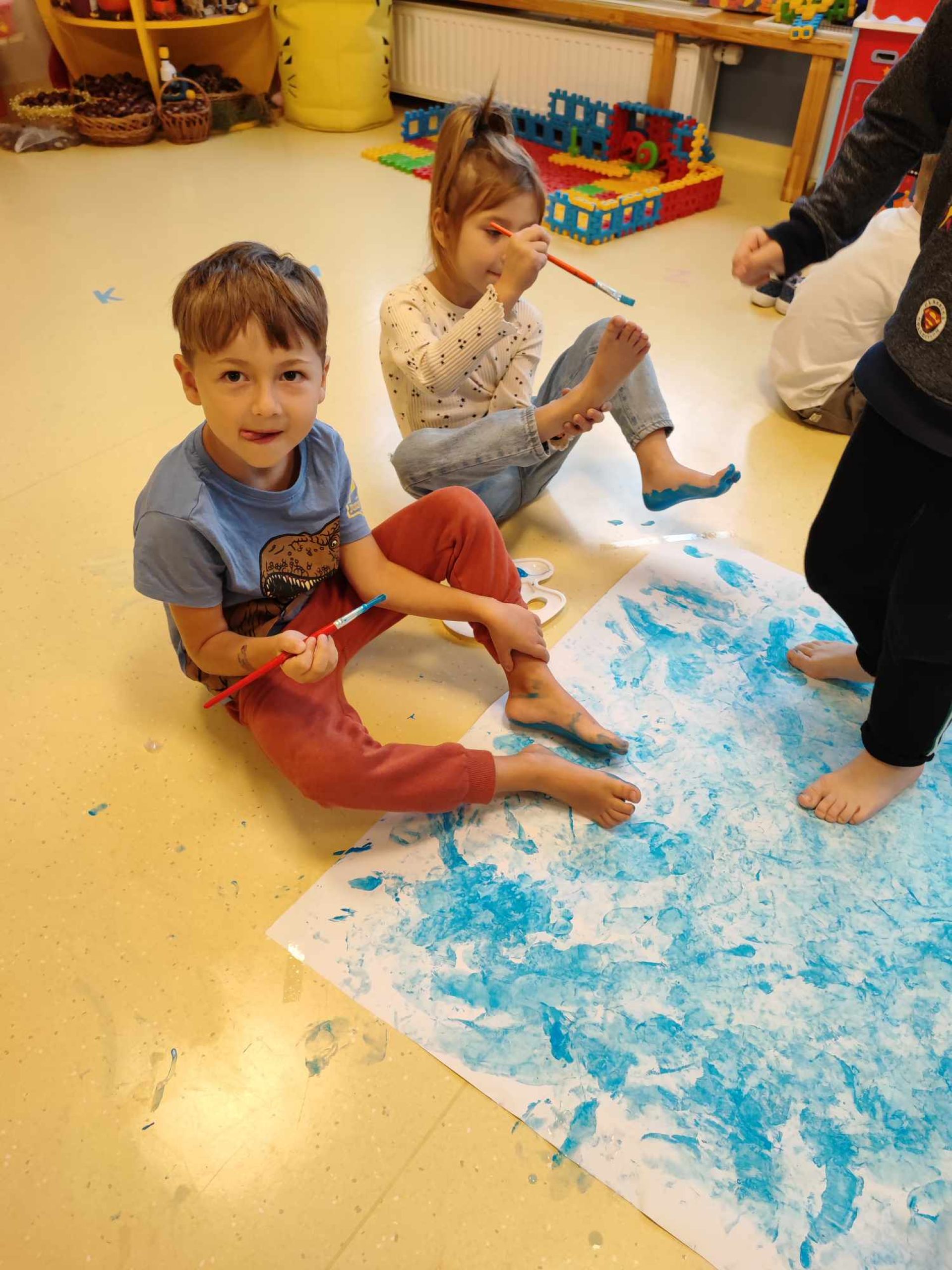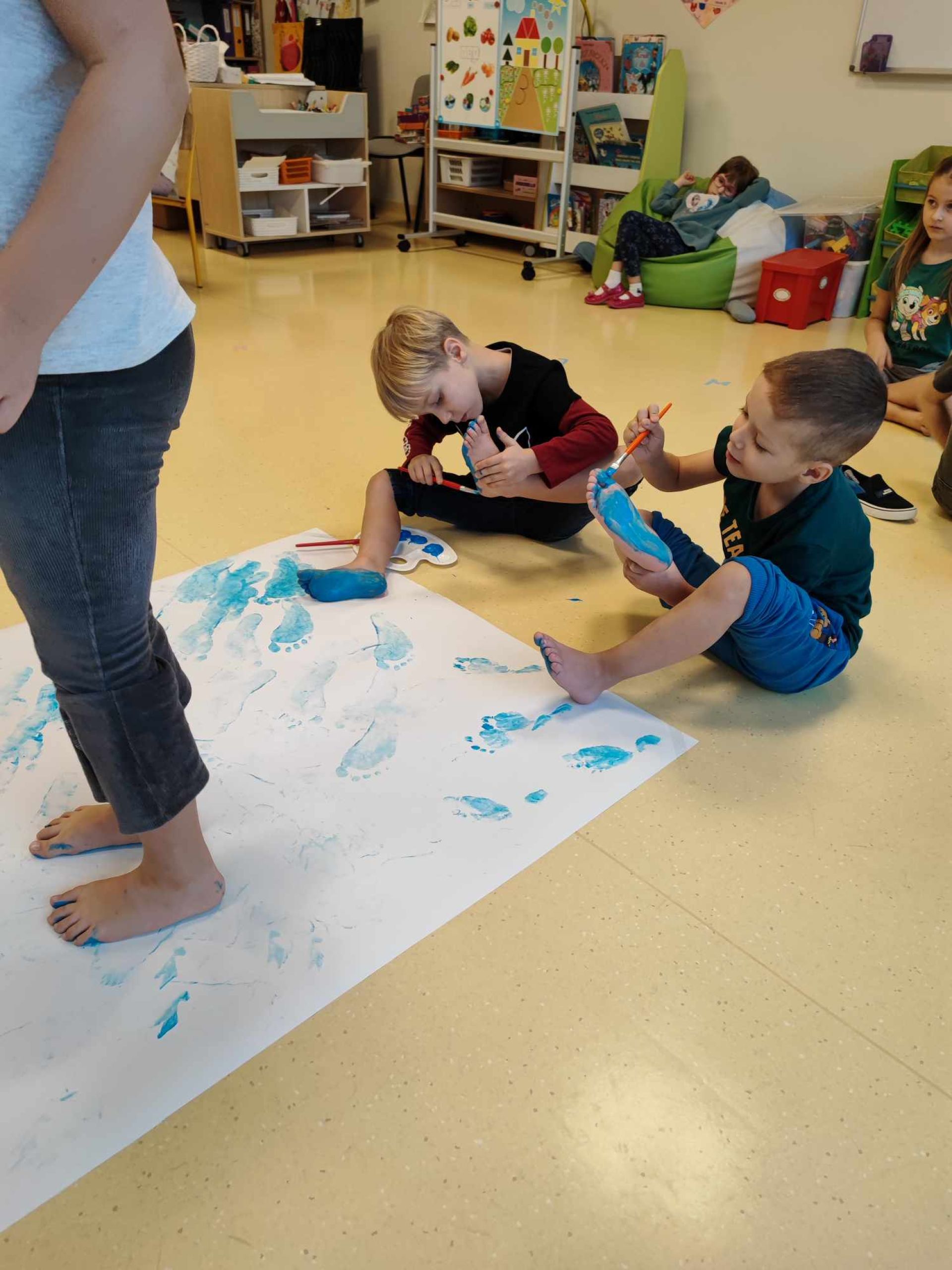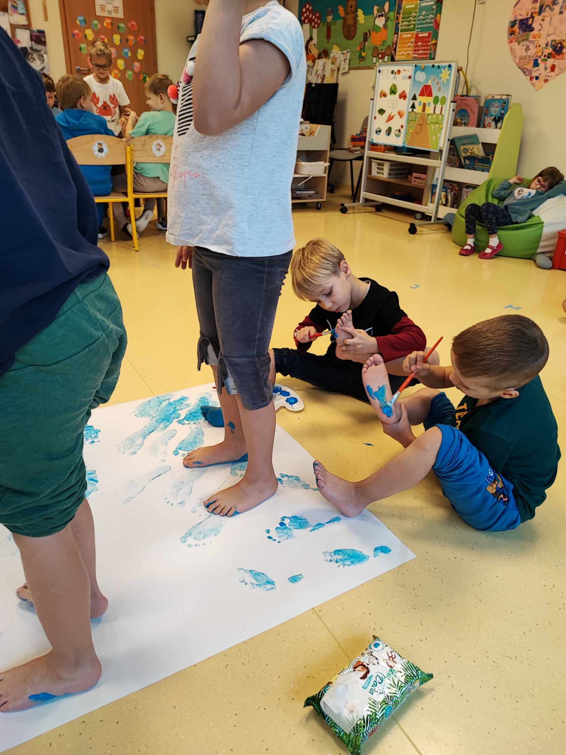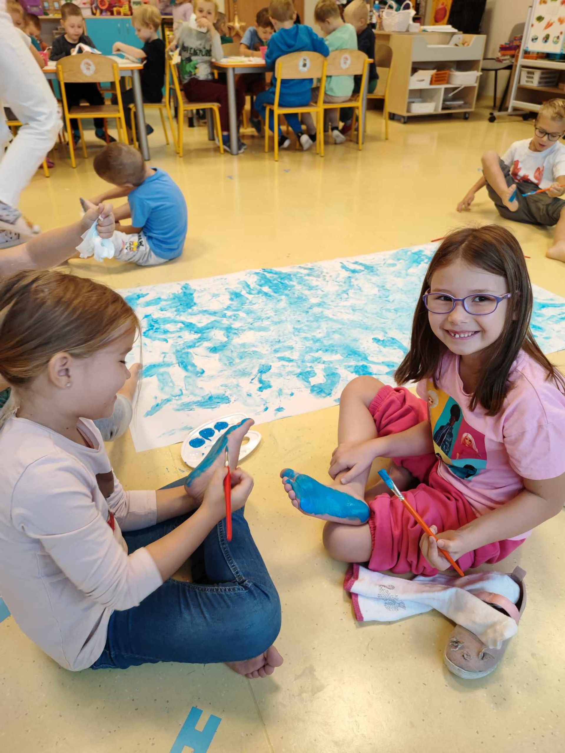 Na zajęciach sensoplastycznych pozwalamy dzieciom na dowolną ekspresję twórczą. Poprzez zanurzanie stóp w farbie przygotowanej na tackach, dzieci pokrywały odbitymi stopami biały arkusz papieru. Malowanie stopami to przede wszystkim fantastyczna zabawa, pełna spontanicznych reakcji, ekspresji twórczej i zdobywania przez dziecko nowych doświadczeń. Malowanie stopami to doskonałe ćwiczenia wspomagające integrację sensoryczną dziecka, w której główną metodą jest posługiwanie się ruchem, jako narzędziem wspomagania rozwoju psychoruchowego dzieci.