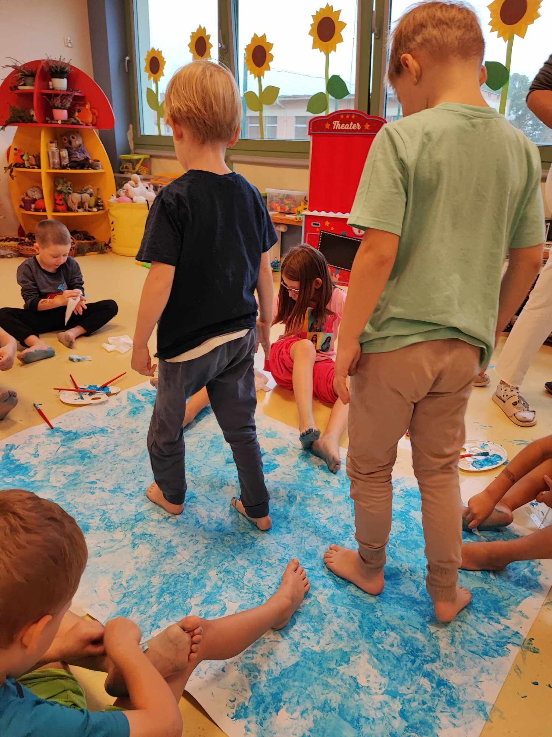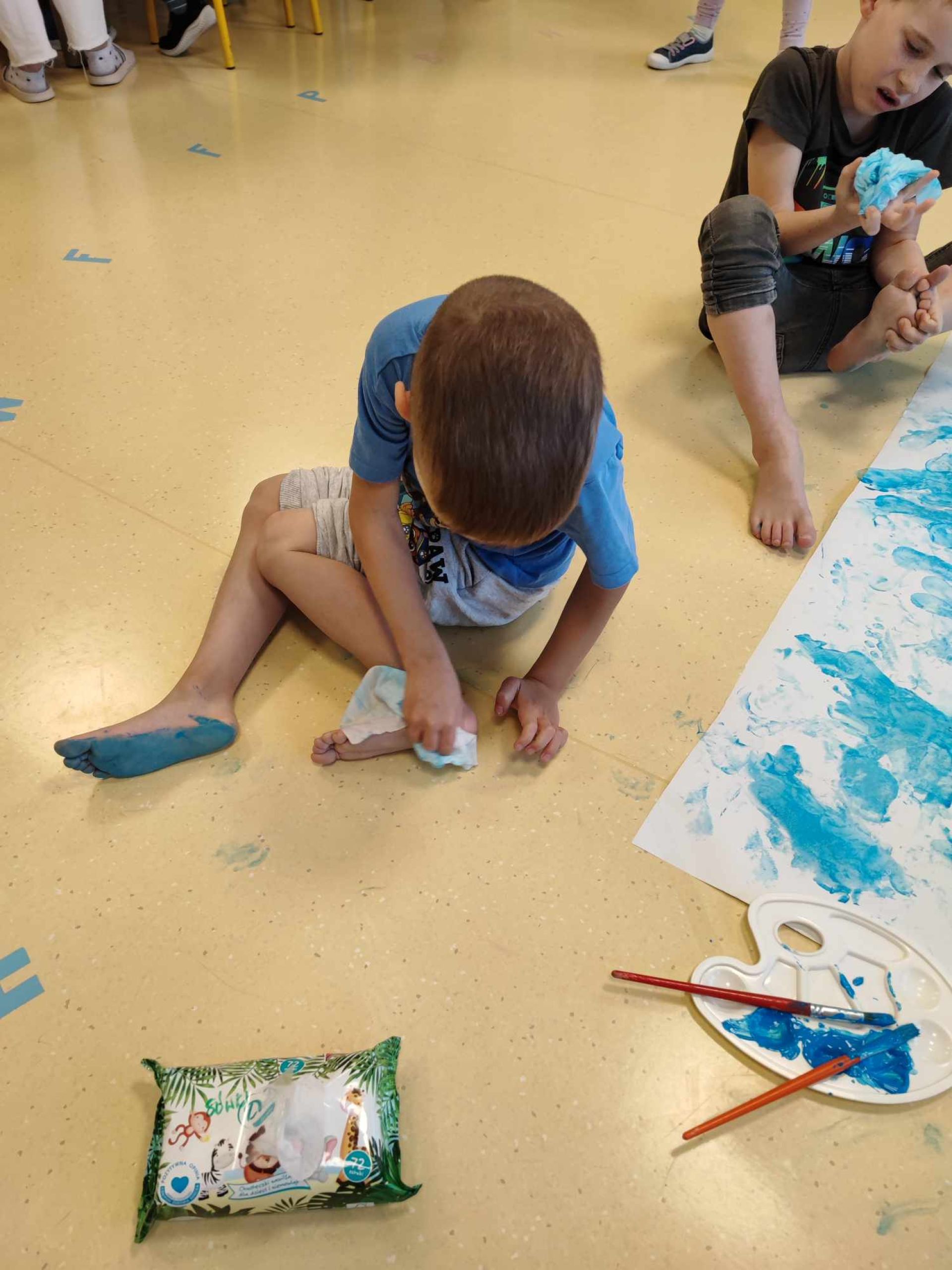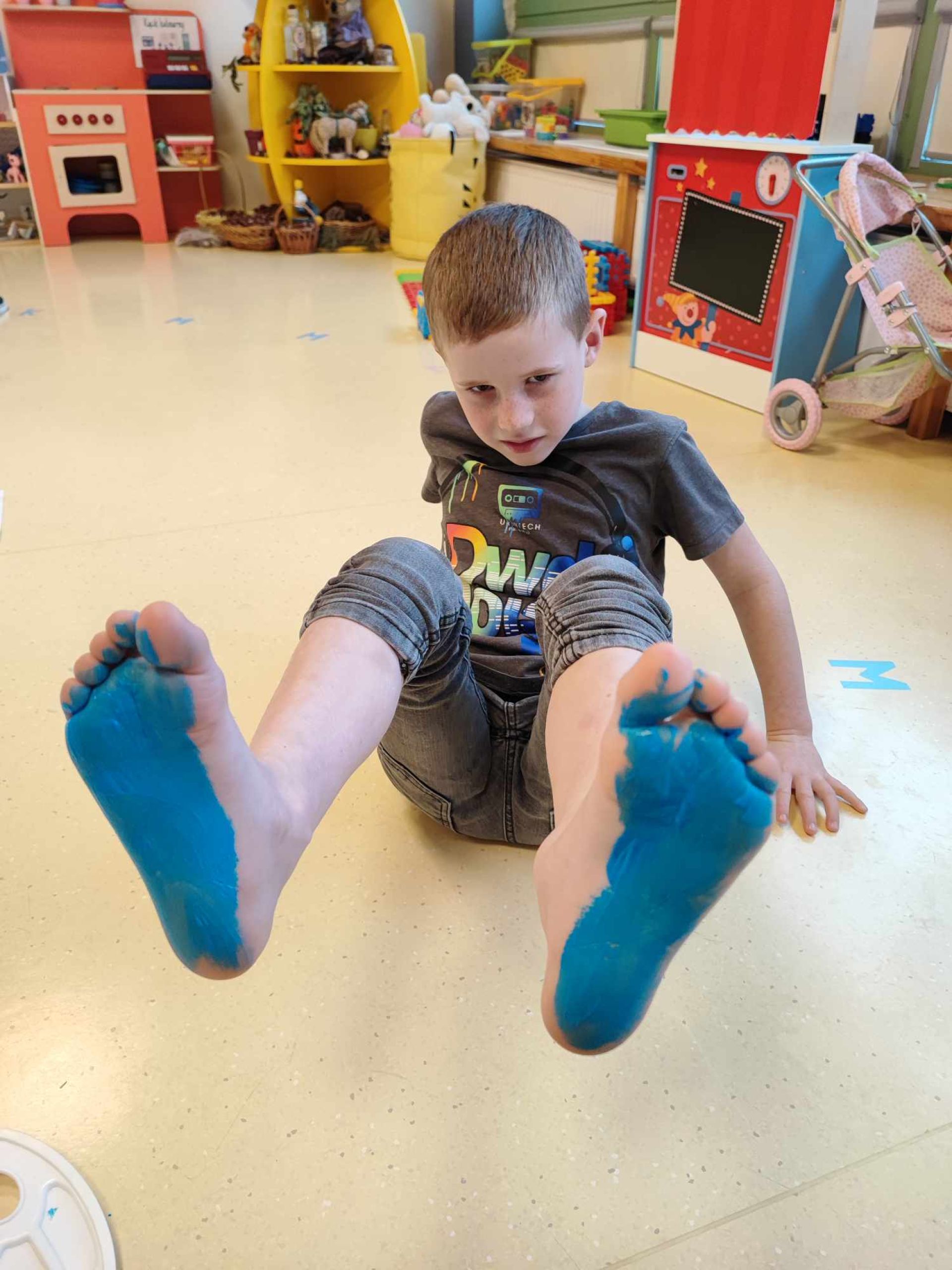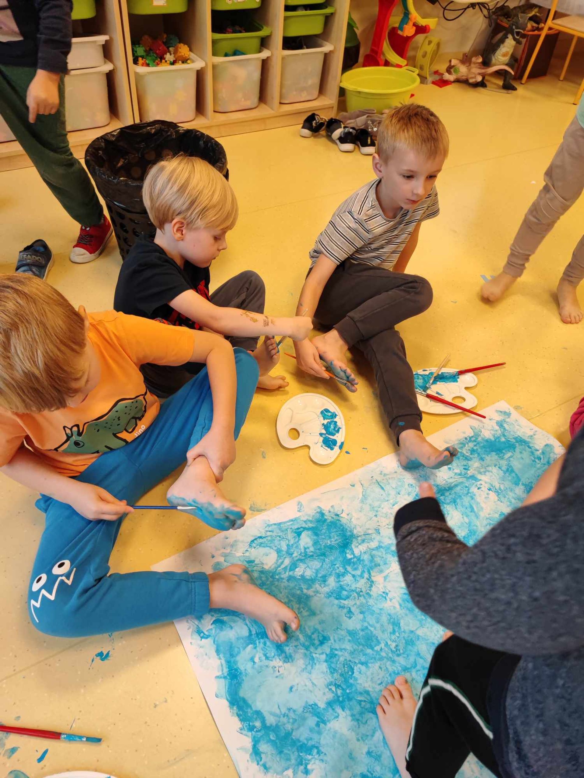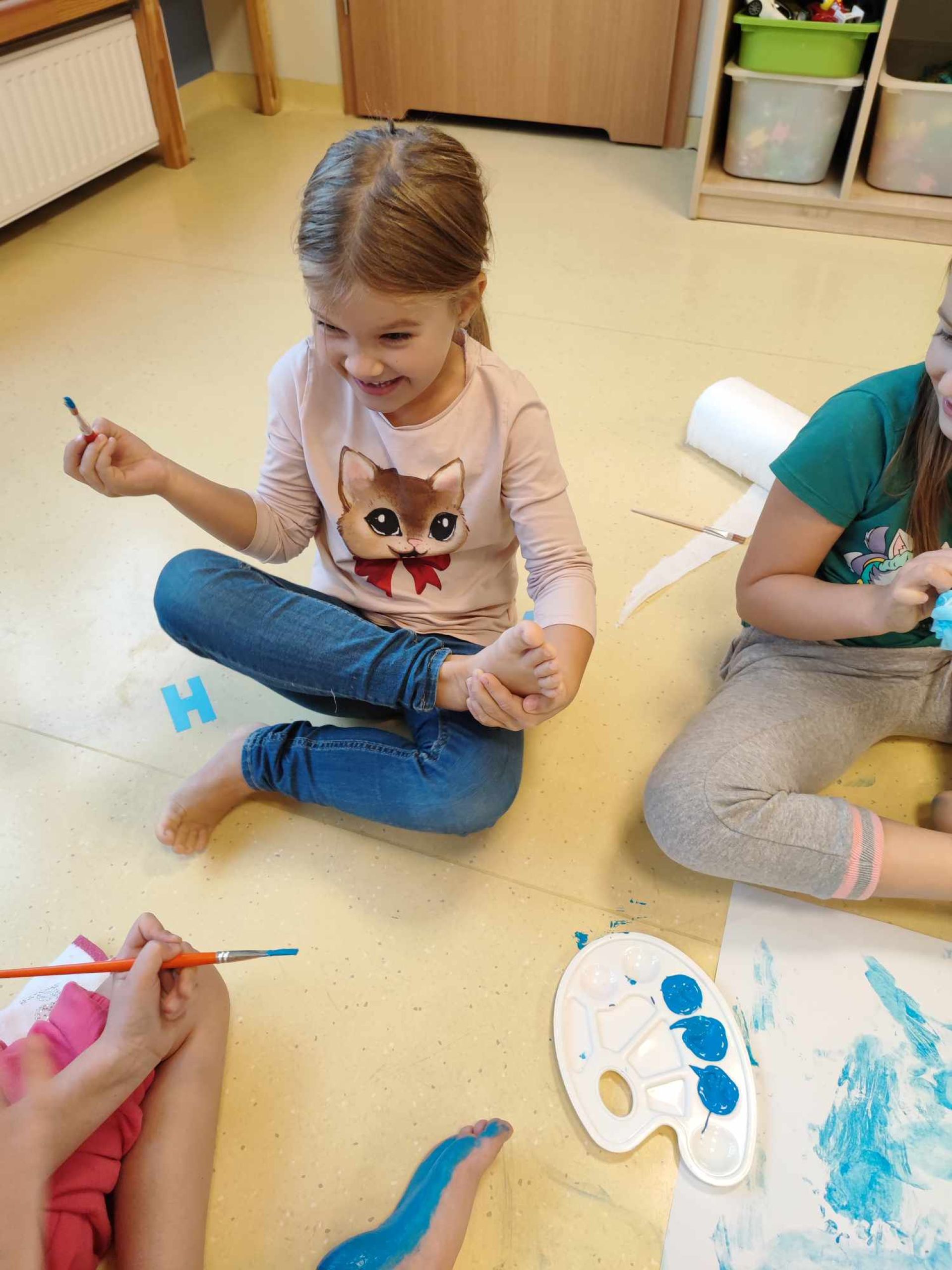 Na zajęciach sensoplastycznych pozwalamy dzieciom na dowolną ekspresję twórczą. Poprzez zanurzanie stóp w farbie przygotowanej na tackach, dzieci pokrywały odbitymi stopami biały arkusz papieru. Malowanie stopami to przede wszystkim fantastyczna zabawa, pełna spontanicznych reakcji, ekspresji twórczej i zdobywania przez dziecko nowych doświadczeń. Malowanie stopami to doskonałe ćwiczenia wspomagające integrację sensoryczną dziecka, w której główną metodą jest posługiwanie się ruchem, jako narzędziem wspomagania rozwoju psychoruchowego dzieci.