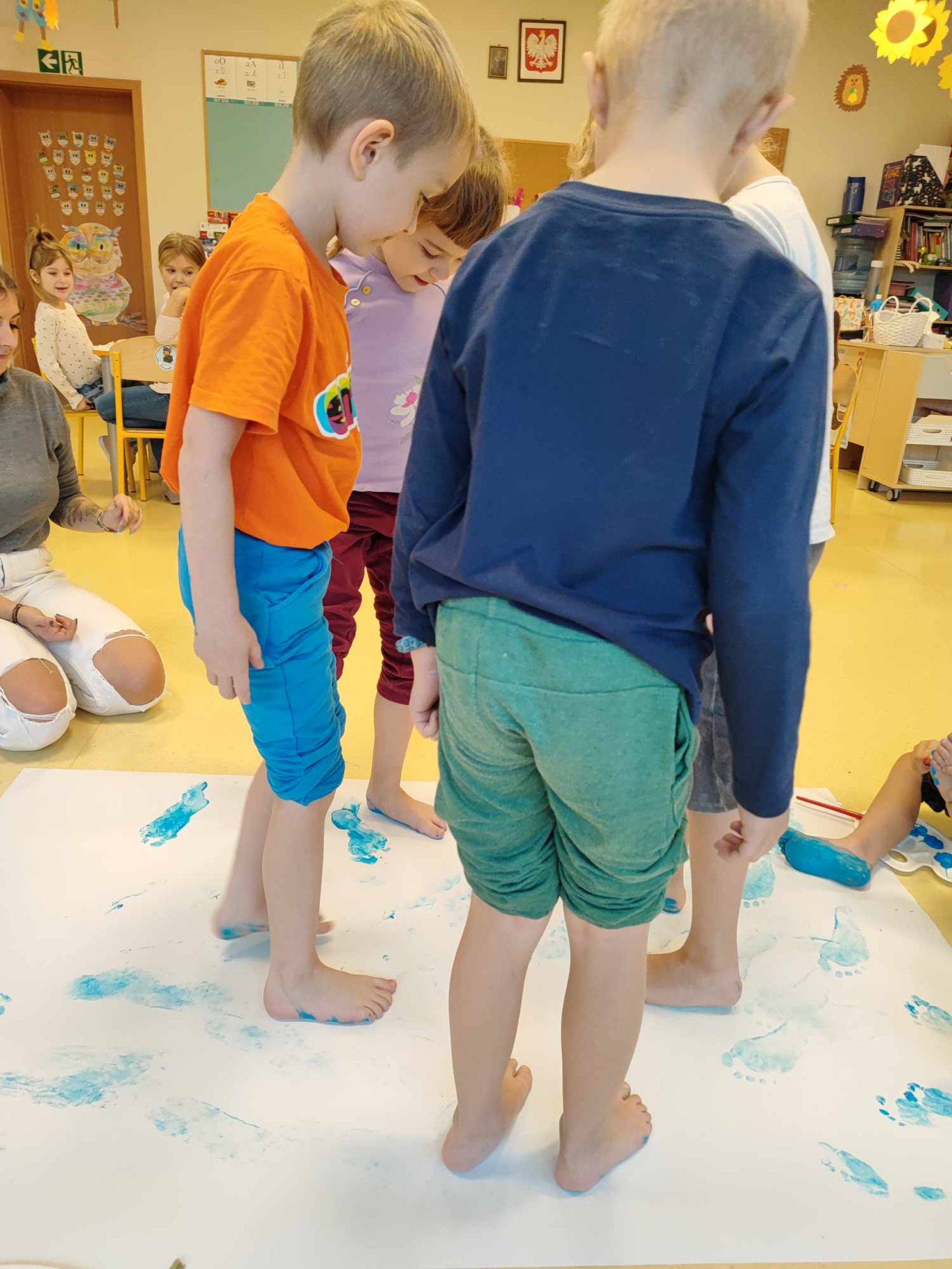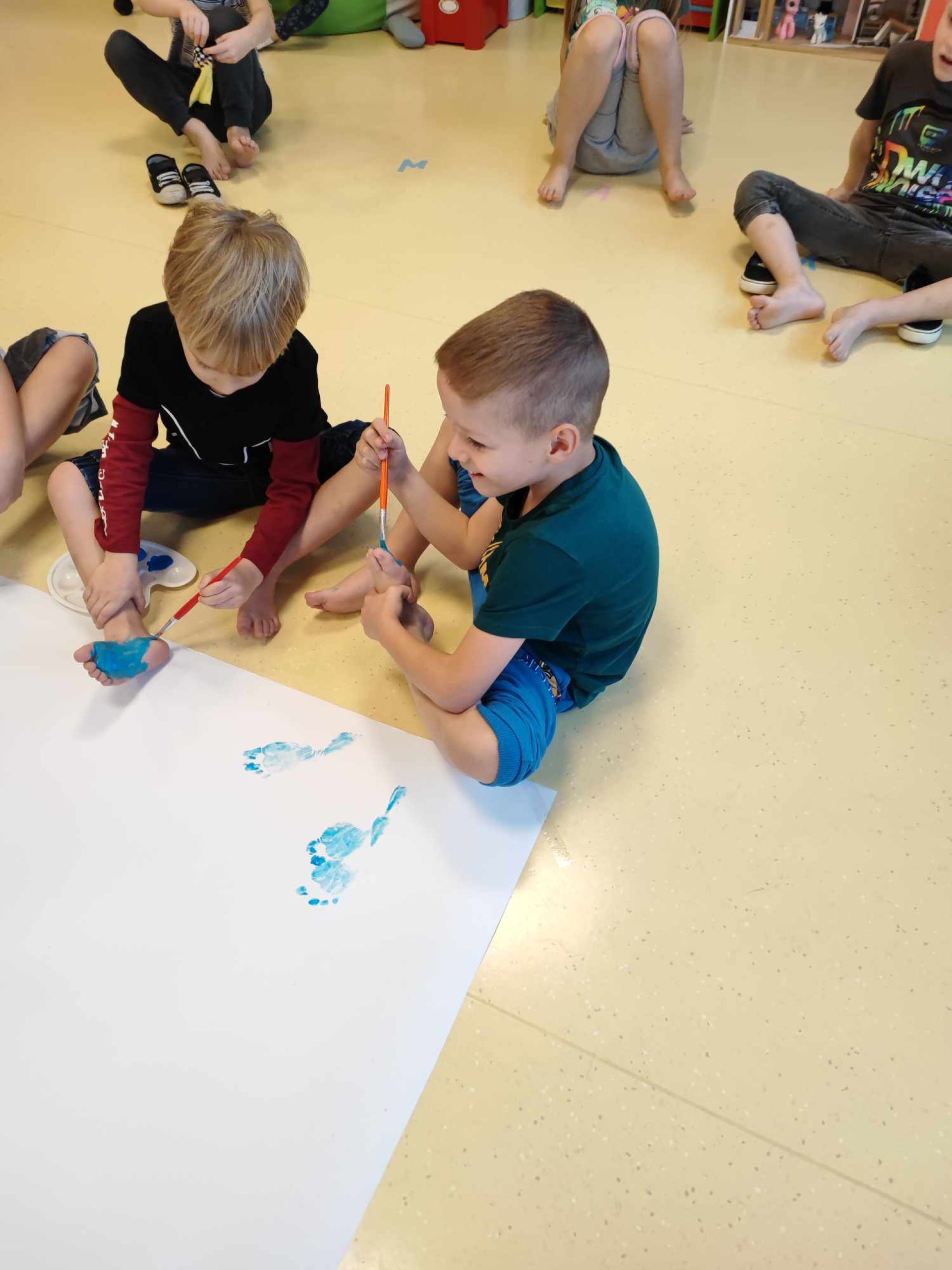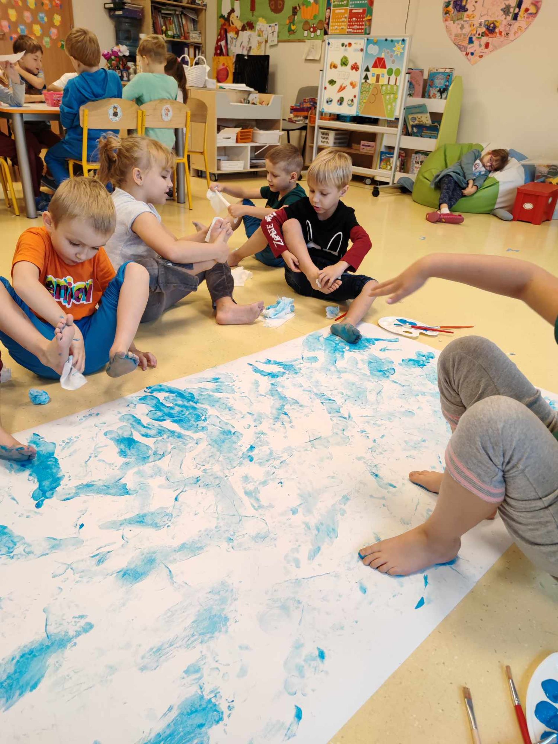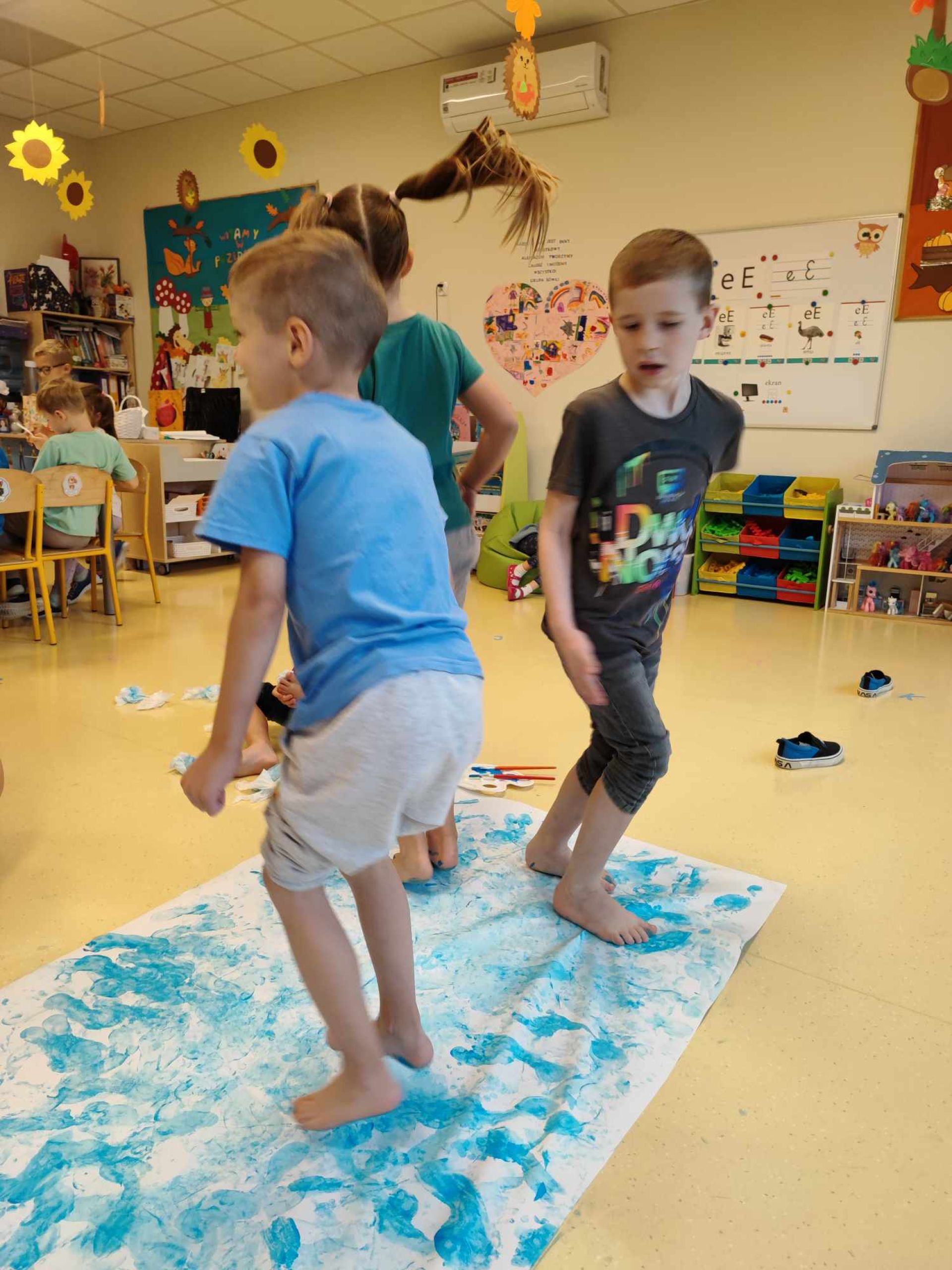 Na zajęciach sensoplastycznych pozwalamy dzieciom na dowolną ekspresję twórczą. Poprzez zanurzanie stóp w farbie przygotowanej na tackach, dzieci pokrywały odbitymi stopami biały arkusz papieru. Malowanie stopami to przede wszystkim fantastyczna zabawa, pełna spontanicznych reakcji, ekspresji twórczej i zdobywania przez dziecko nowych doświadczeń. Malowanie stopami to doskonałe ćwiczenia wspomagające integrację sensoryczną dziecka, w której główną metodą jest posługiwanie się ruchem, jako narzędziem wspomagania rozwoju psychoruchowego dzieci.
