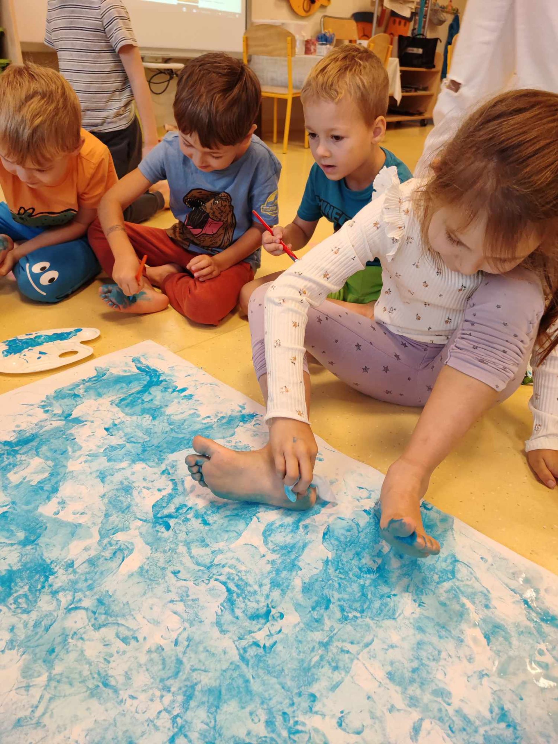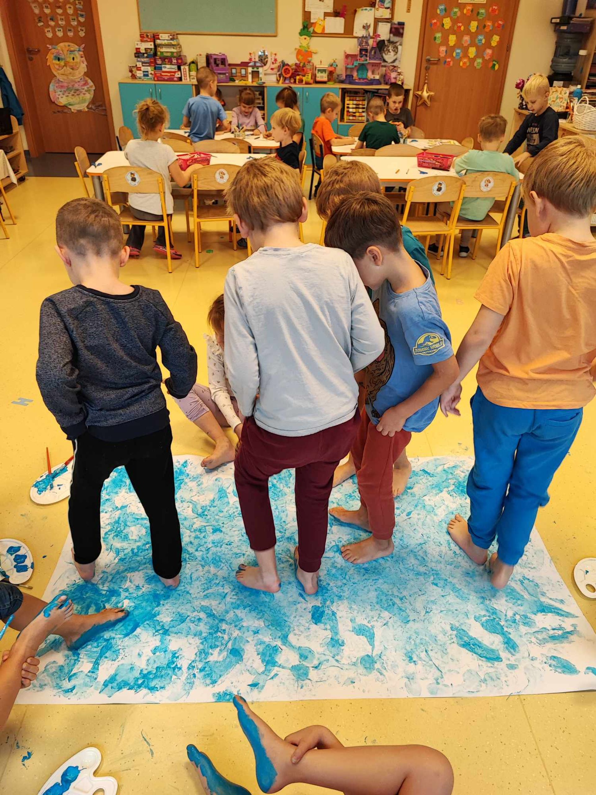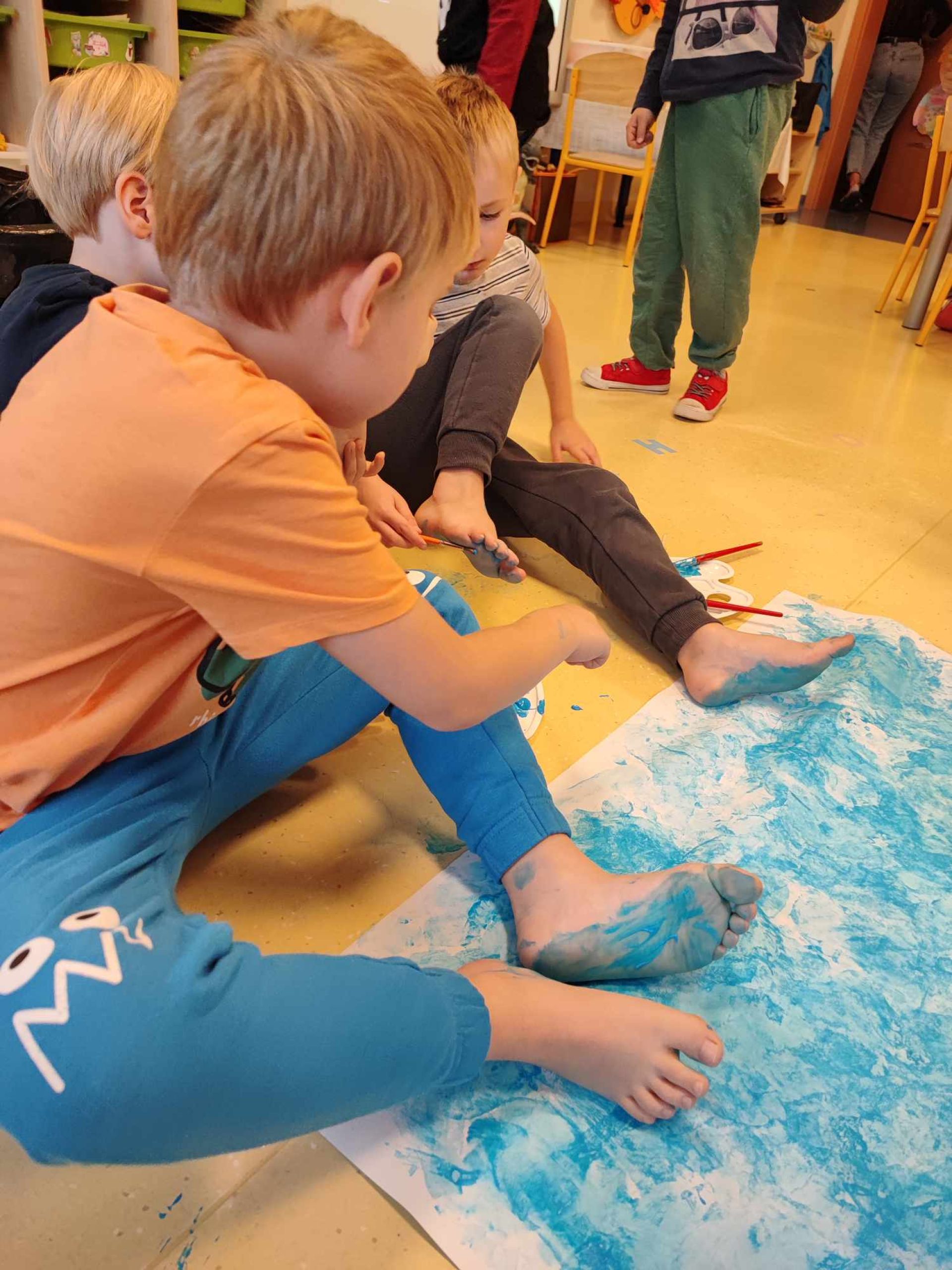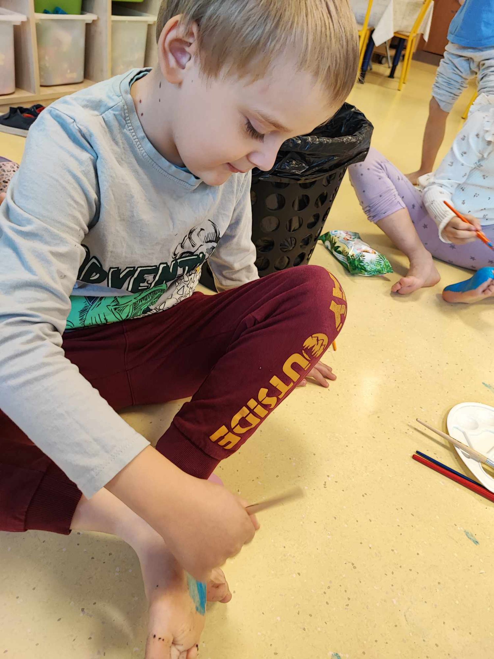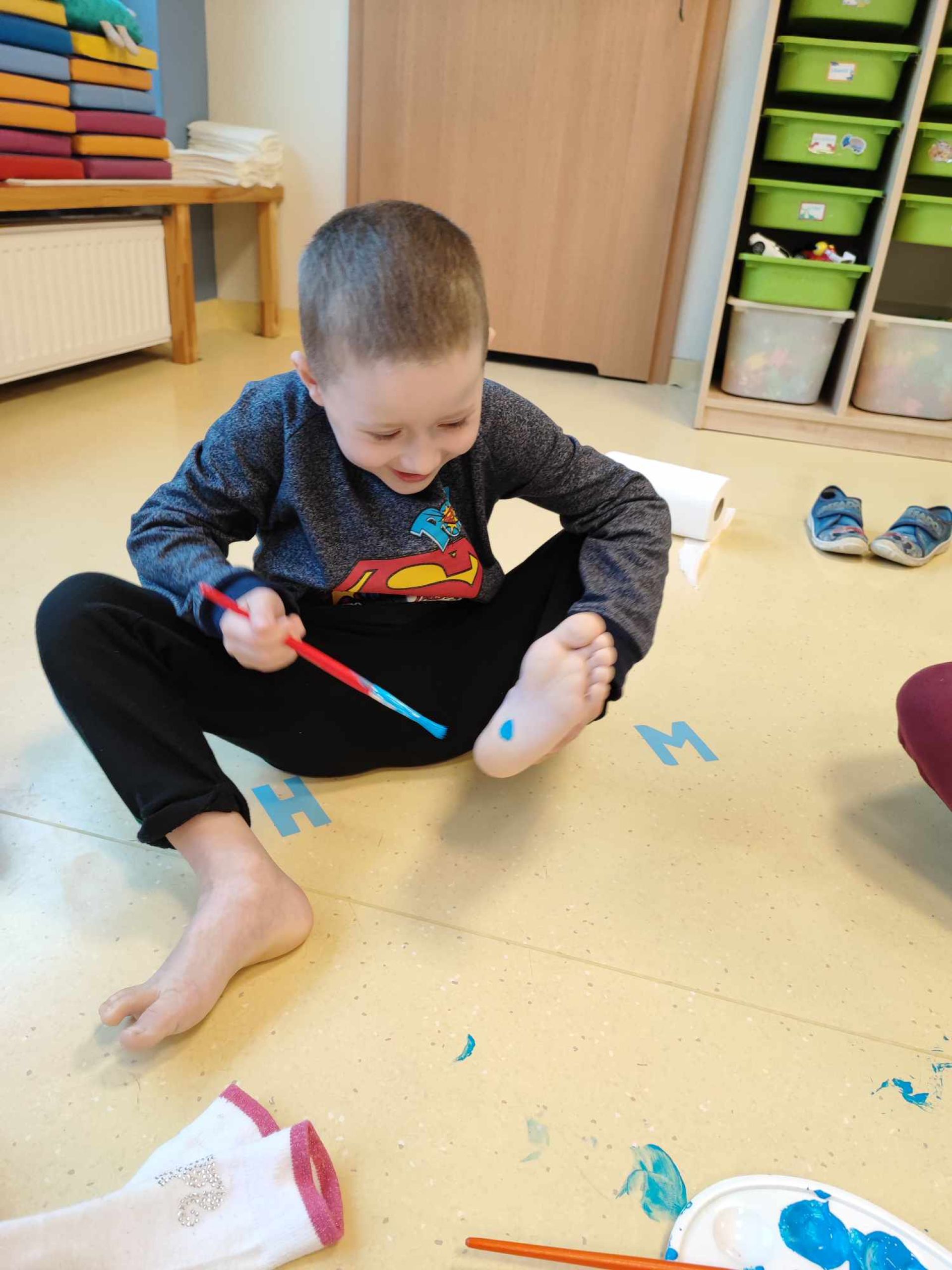 Na zajęciach sensoplastycznych pozwalamy dzieciom na dowolną ekspresję twórczą. Poprzez zanurzanie stóp w farbie przygotowanej na tackach, dzieci pokrywały odbitymi stopami biały arkusz papieru. Malowanie stopami to przede wszystkim fantastyczna zabawa, pełna spontanicznych reakcji, ekspresji twórczej i zdobywania przez dziecko nowych doświadczeń. Malowanie stopami to doskonałe ćwiczenia wspomagające integrację sensoryczną dziecka, w której główną metodą jest posługiwanie się ruchem, jako narzędziem wspomagania rozwoju psychoruchowego dzieci.