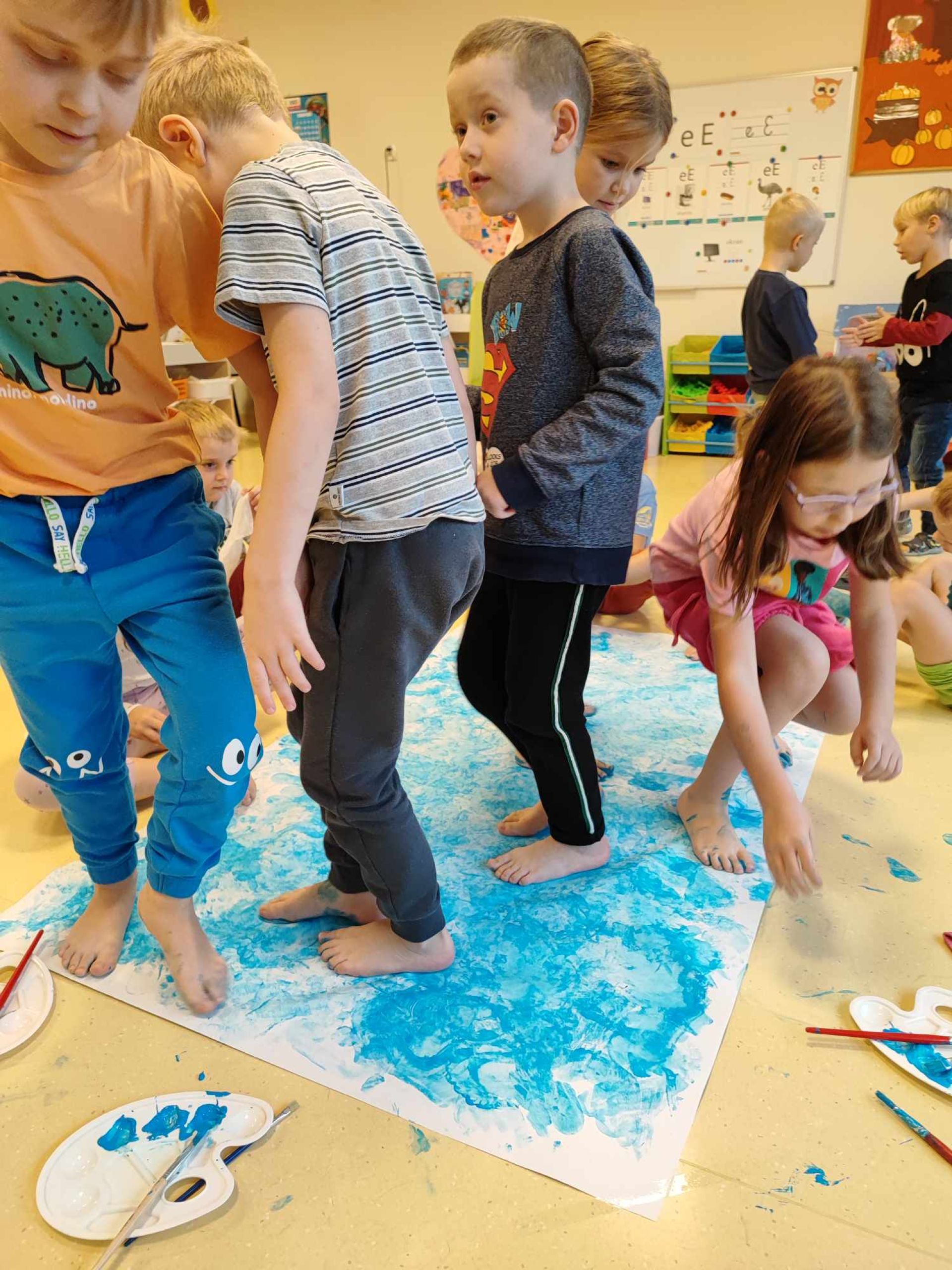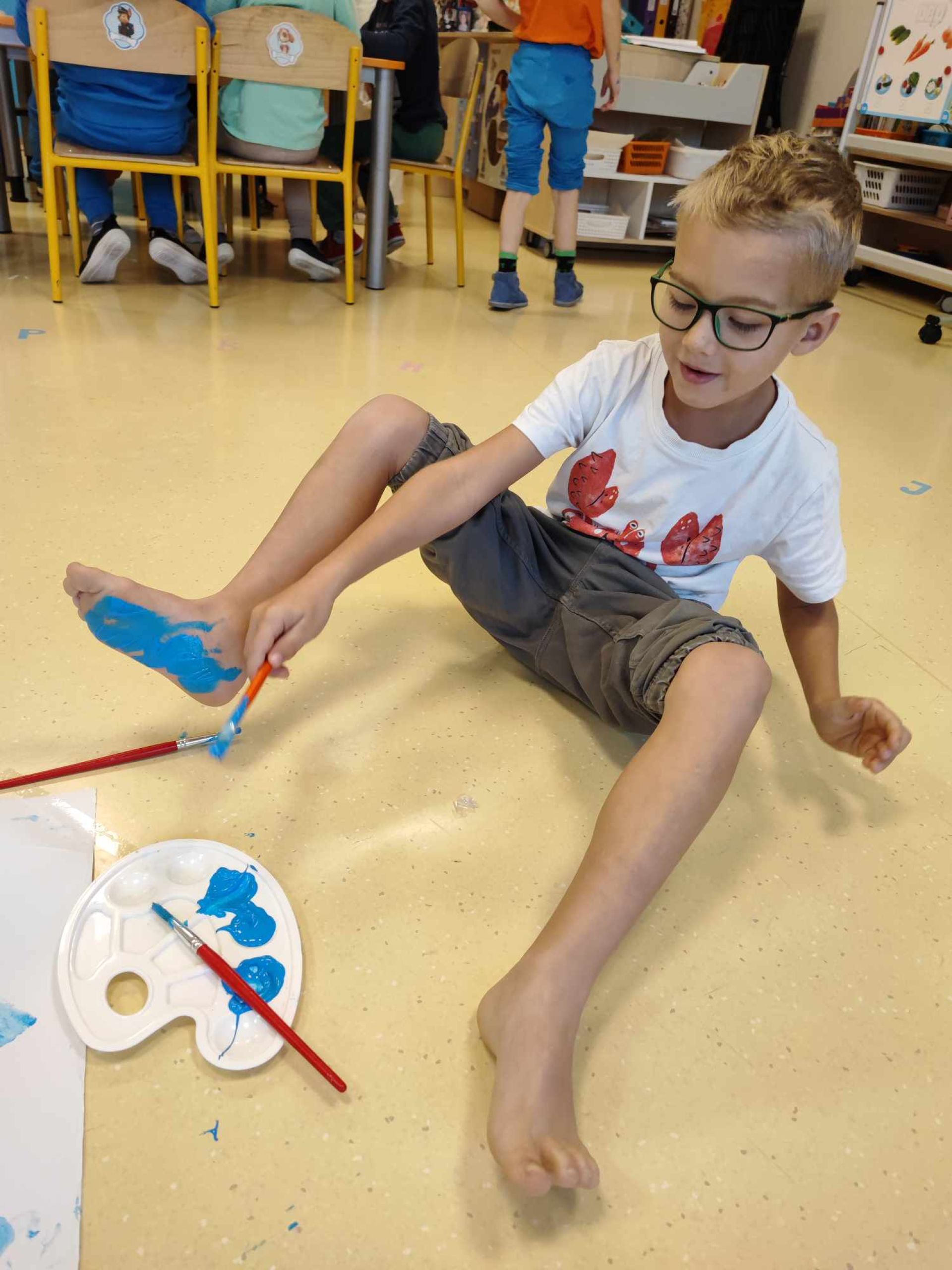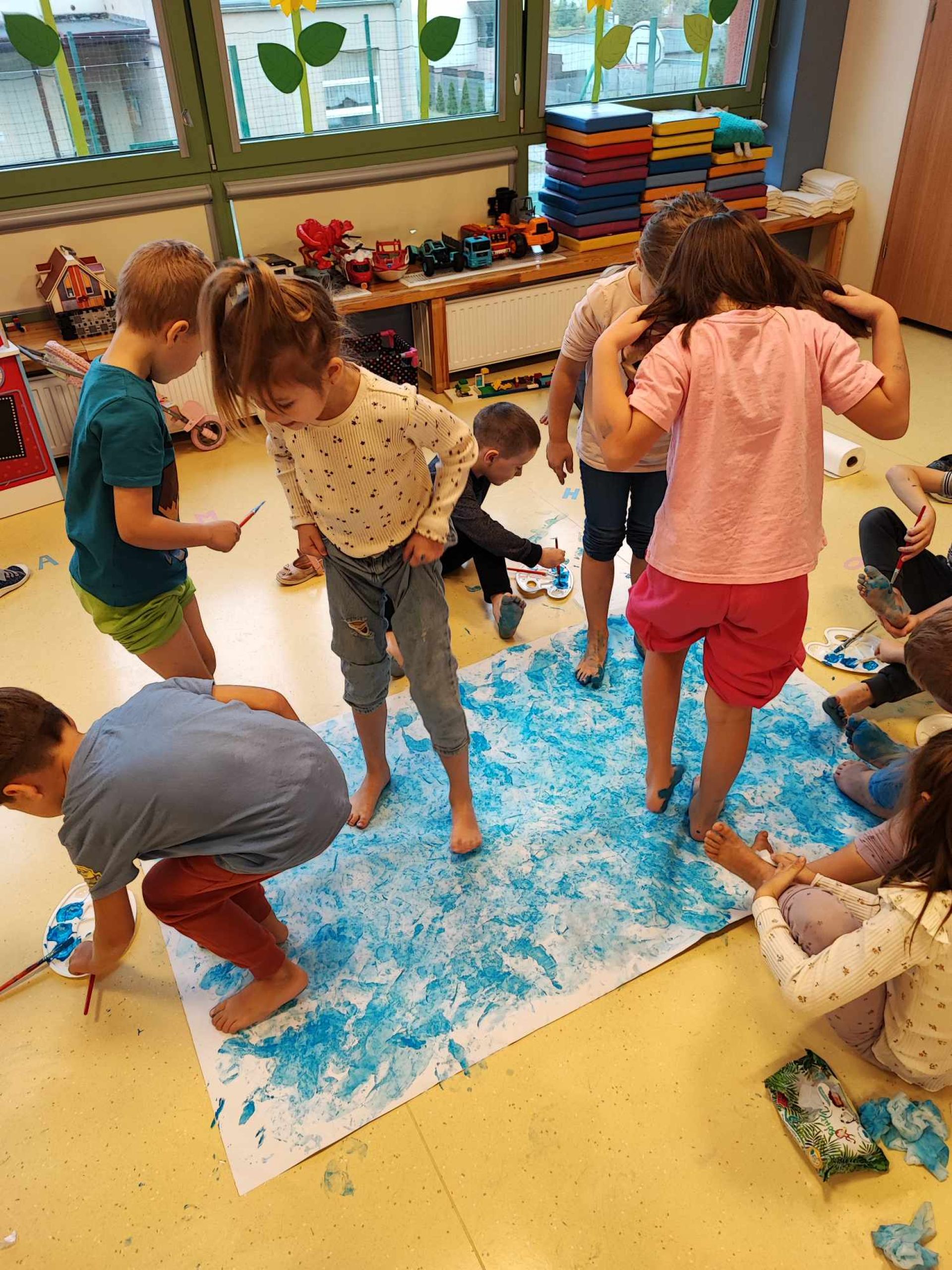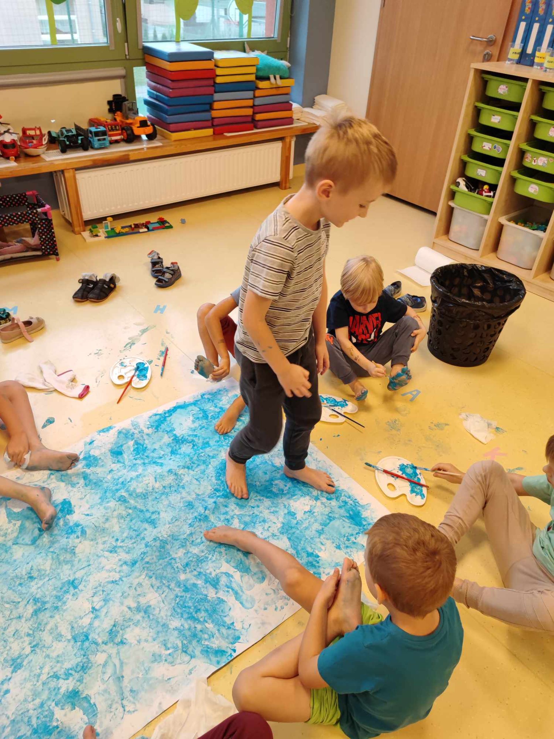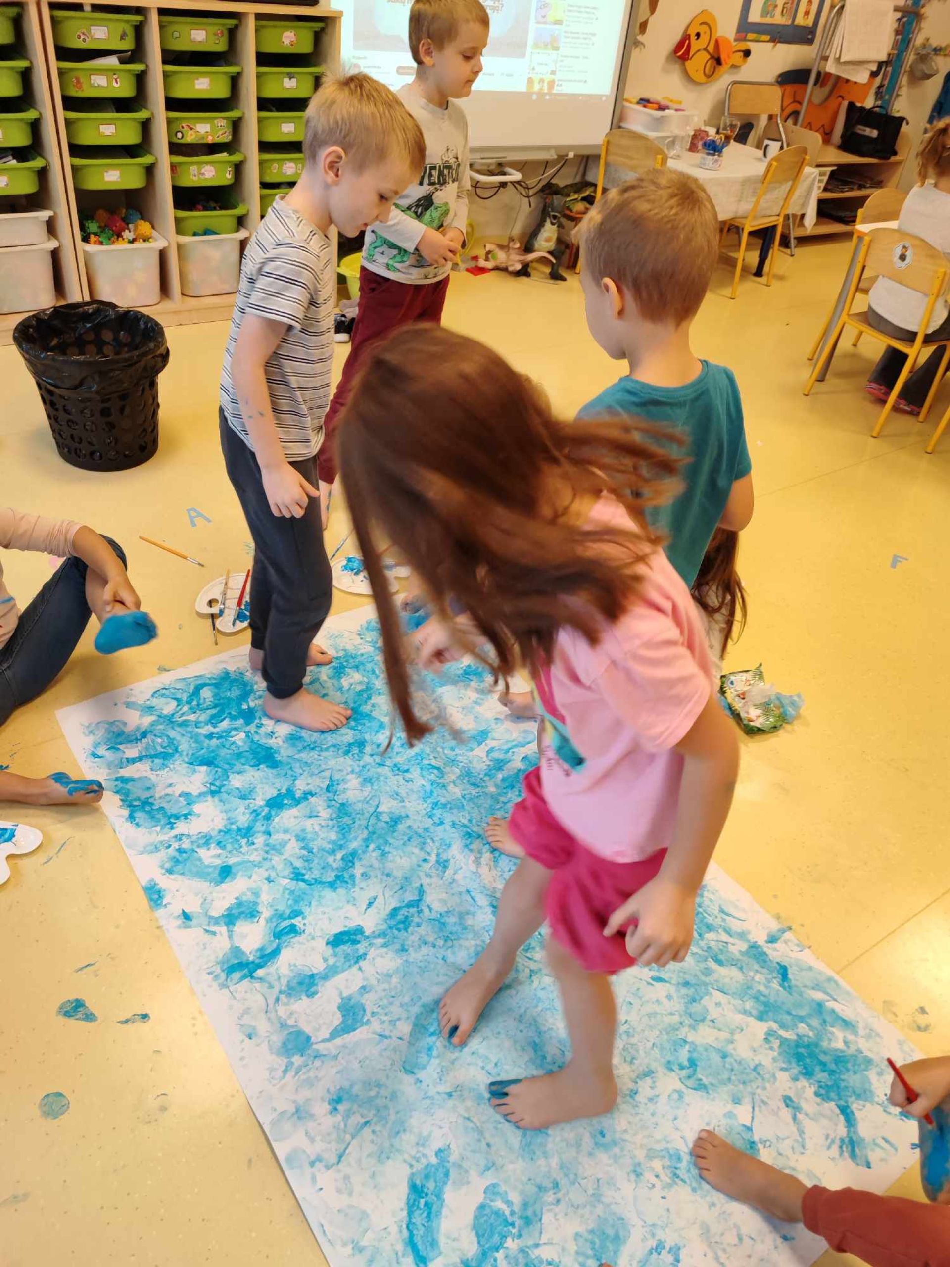 Na zajęciach sensoplastycznych pozwalamy dzieciom na dowolną ekspresję twórczą. Poprzez zanurzanie stóp w farbie przygotowanej na tackach, dzieci pokrywały odbitymi stopami biały arkusz papieru. Malowanie stopami to przede wszystkim fantastyczna zabawa, pełna spontanicznych reakcji, ekspresji twórczej i zdobywania przez dziecko nowych doświadczeń. Malowanie stopami to doskonałe ćwiczenia wspomagające integrację sensoryczną dziecka, w której główną metodą jest posługiwanie się ruchem, jako narzędziem wspomagania rozwoju psychoruchowego dzieci.