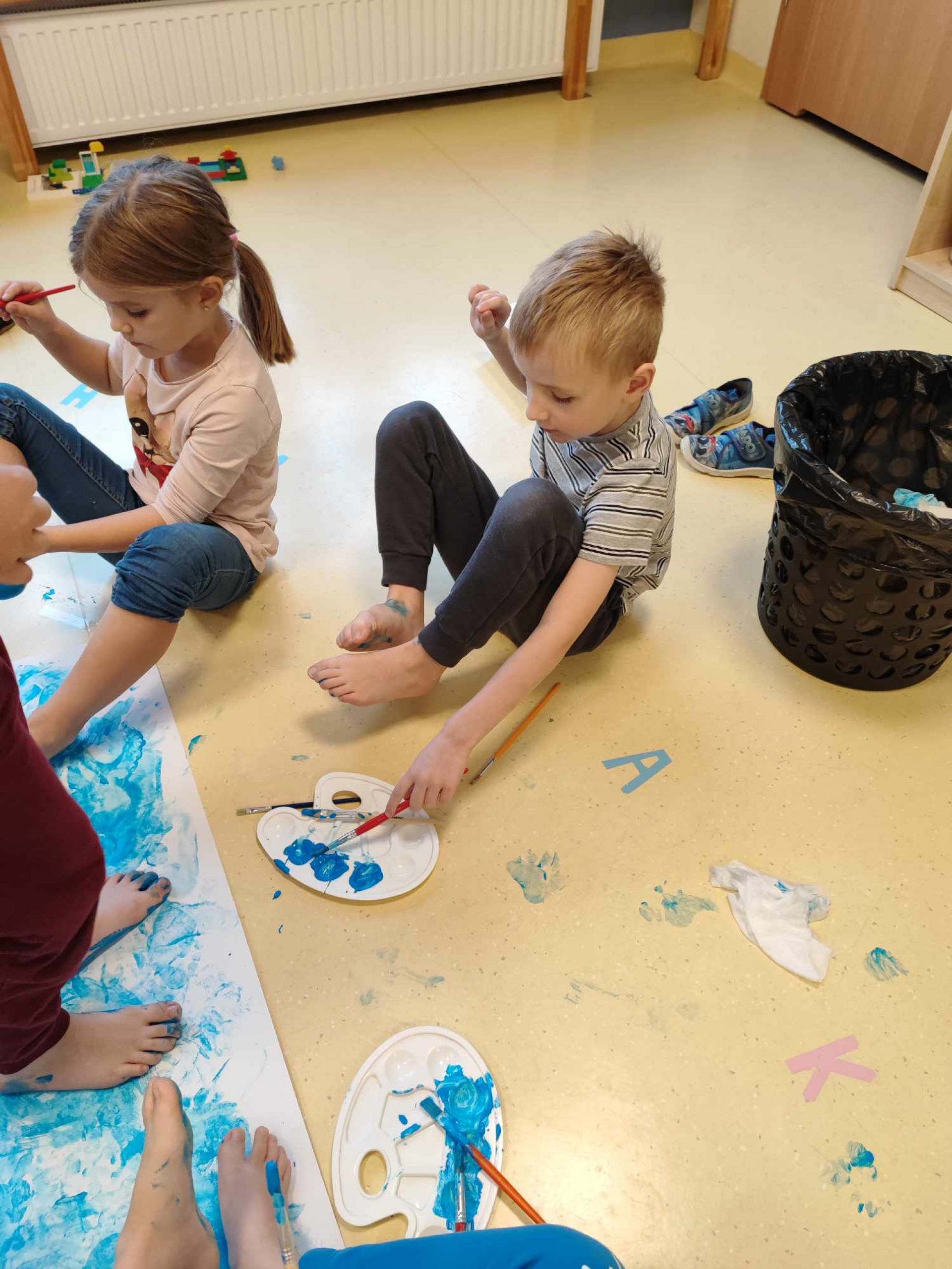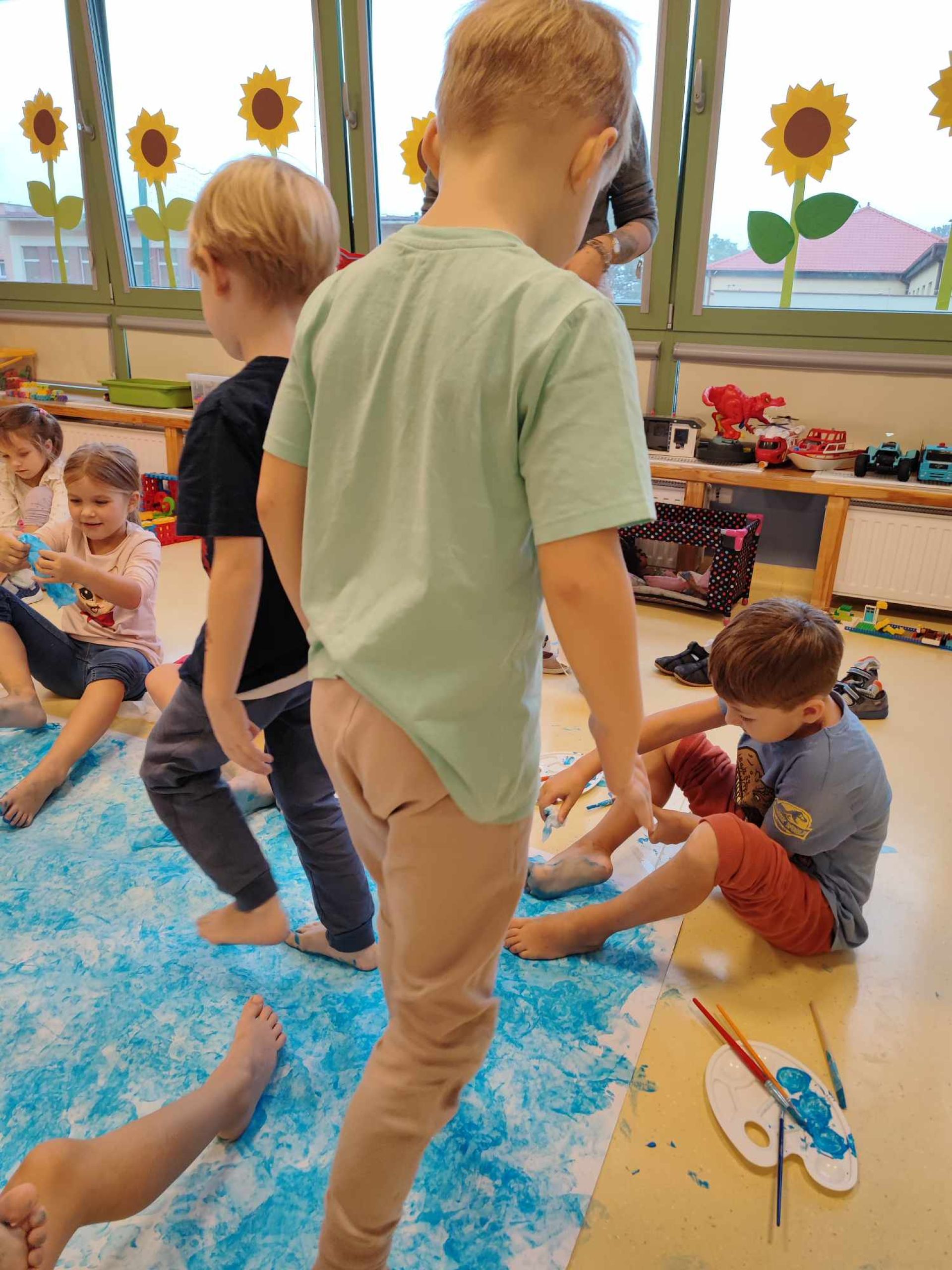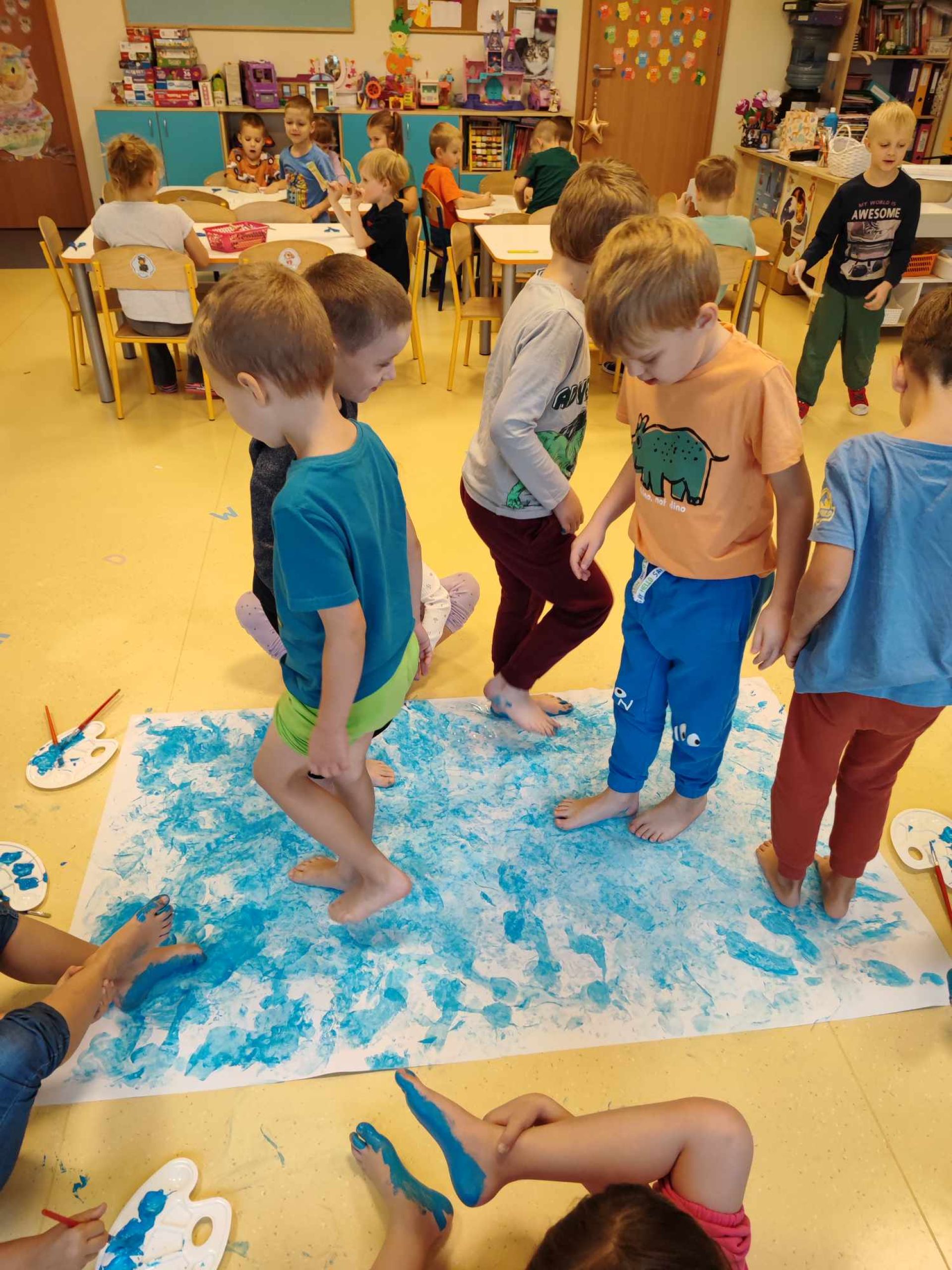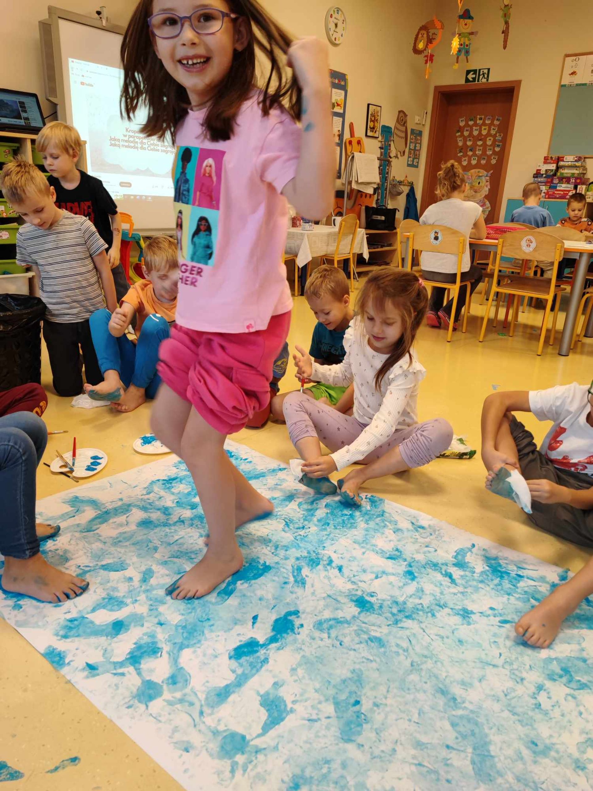 Na zajęciach sensoplastycznych pozwalamy dzieciom na dowolną ekspresję twórczą. Poprzez zanurzanie stóp w farbie przygotowanej na tackach, dzieci pokrywały odbitymi stopami biały arkusz papieru. Malowanie stopami to przede wszystkim fantastyczna zabawa, pełna spontanicznych reakcji, ekspresji twórczej i zdobywania przez dziecko nowych doświadczeń. Malowanie stopami to doskonałe ćwiczenia wspomagające integrację sensoryczną dziecka, w której główną metodą jest posługiwanie się ruchem, jako narzędziem wspomagania rozwoju psychoruchowego dzieci.