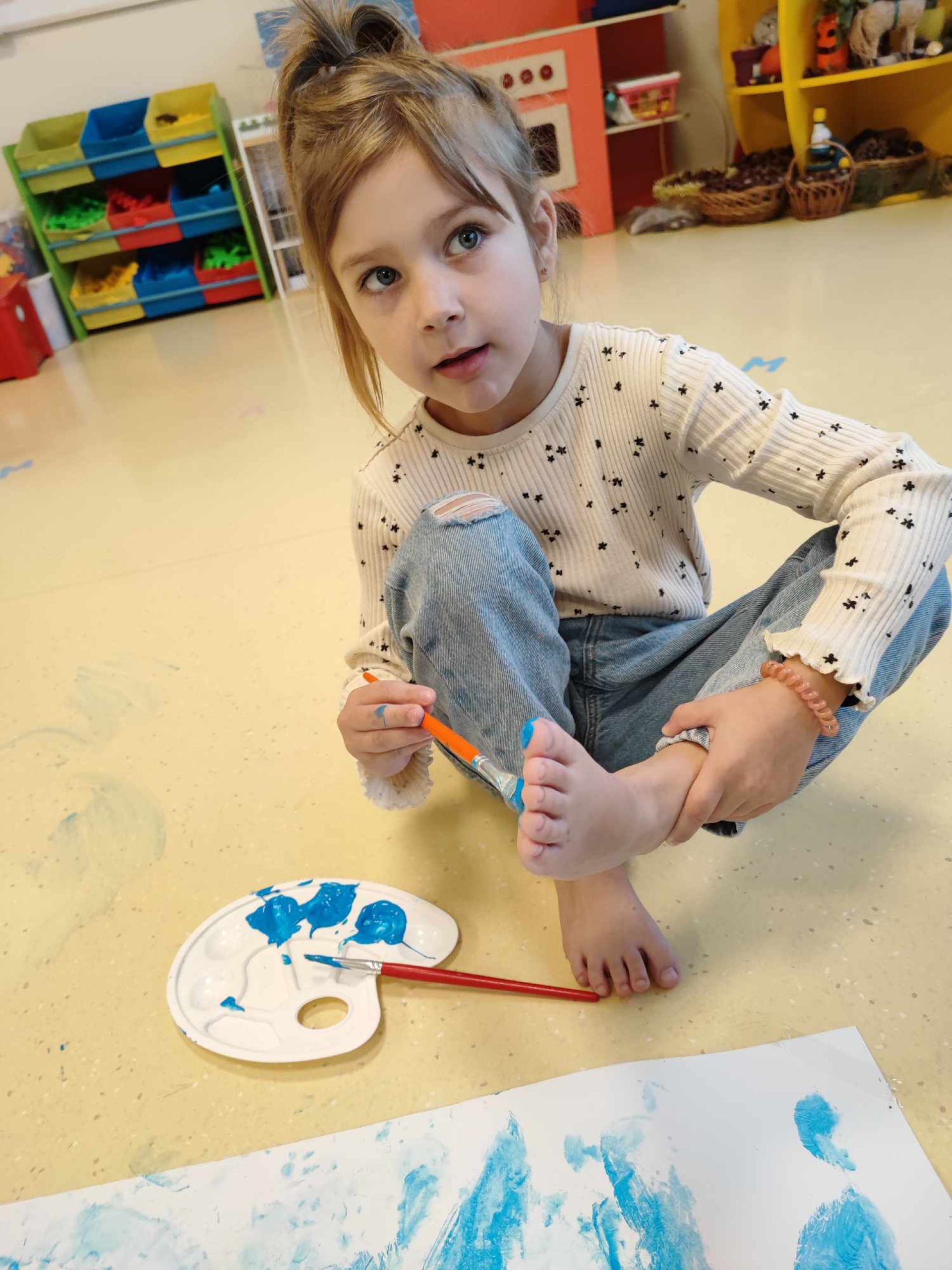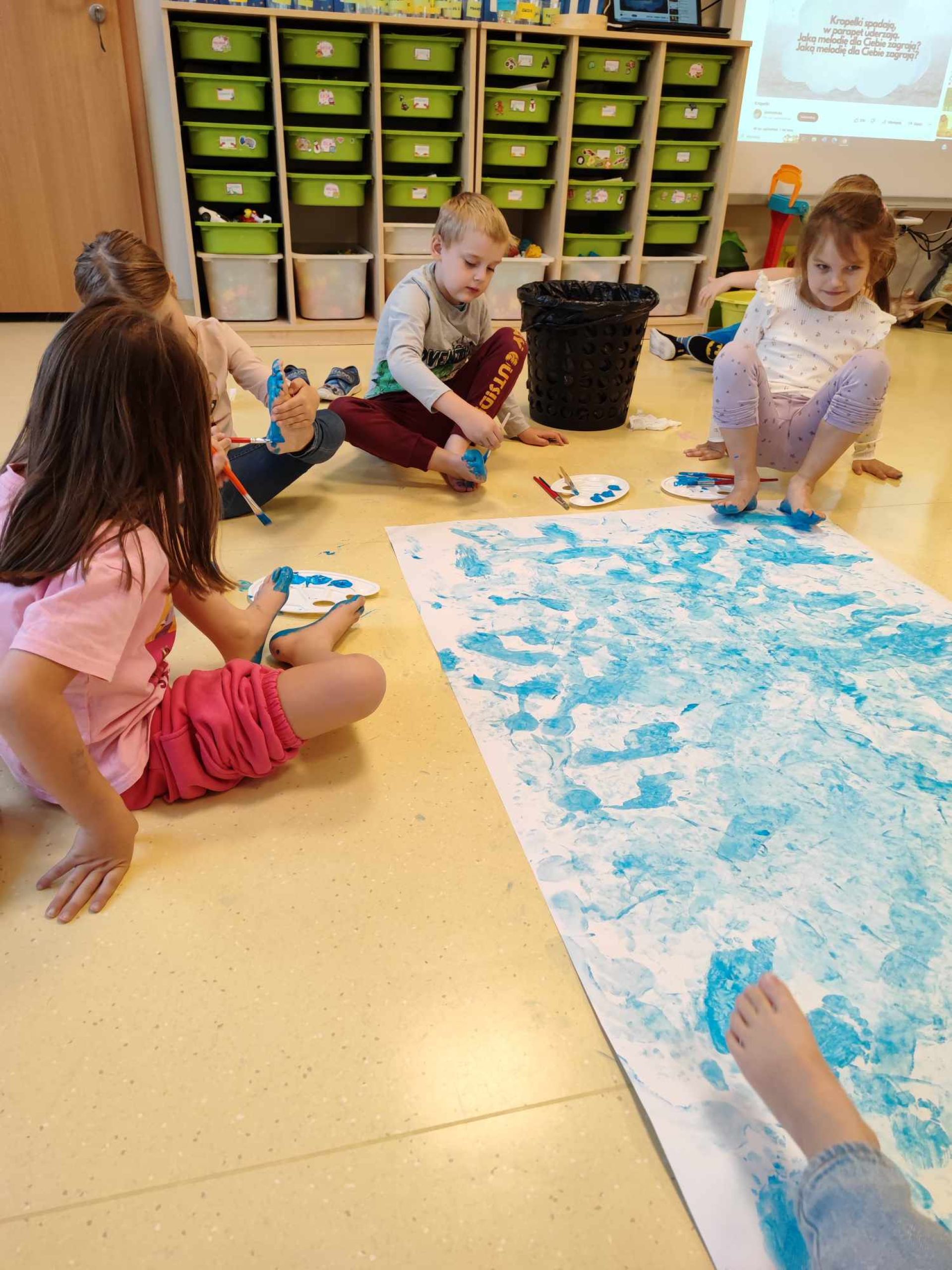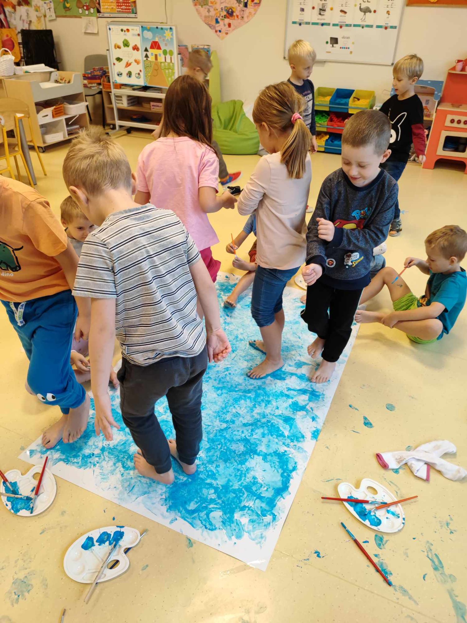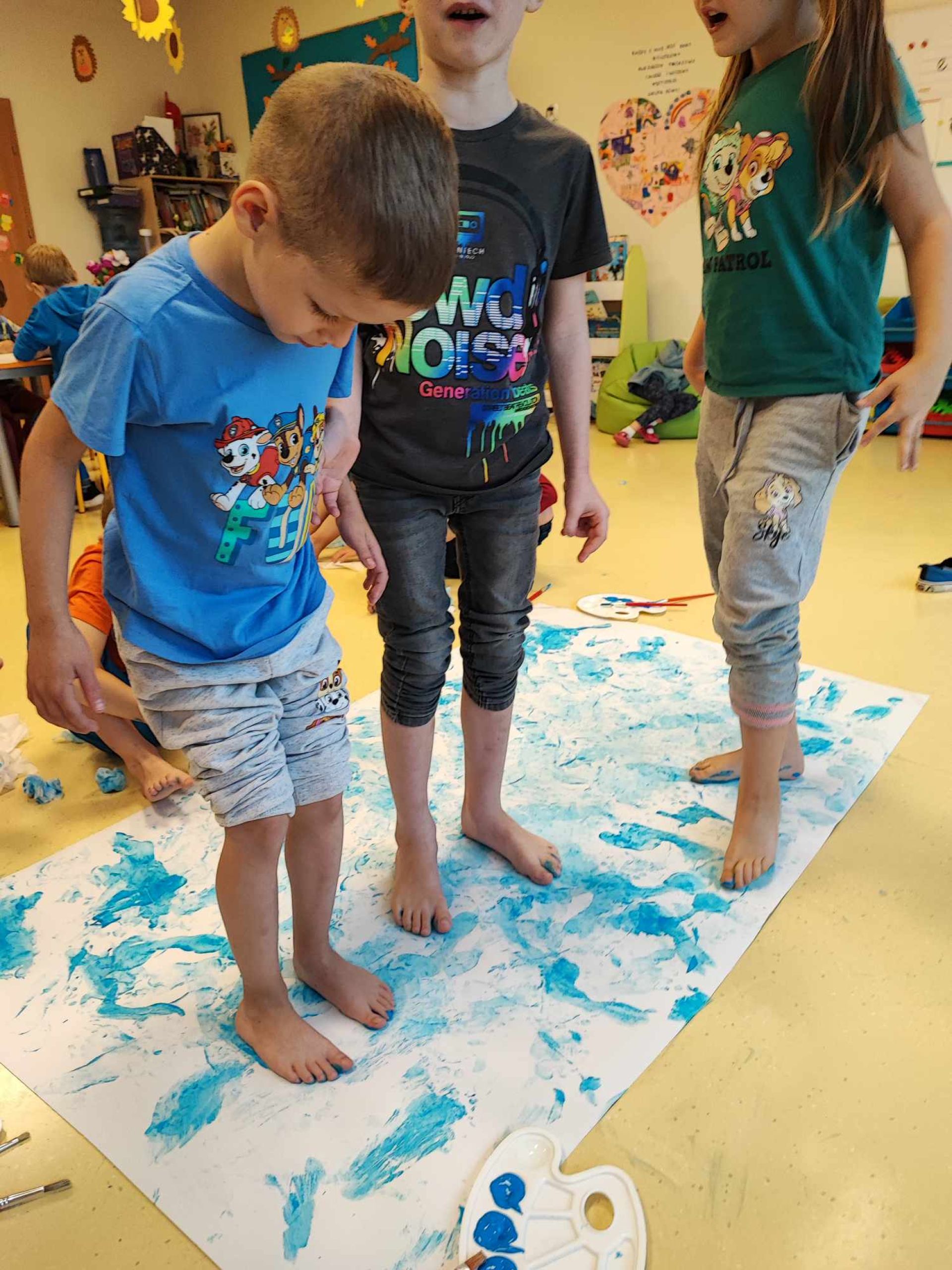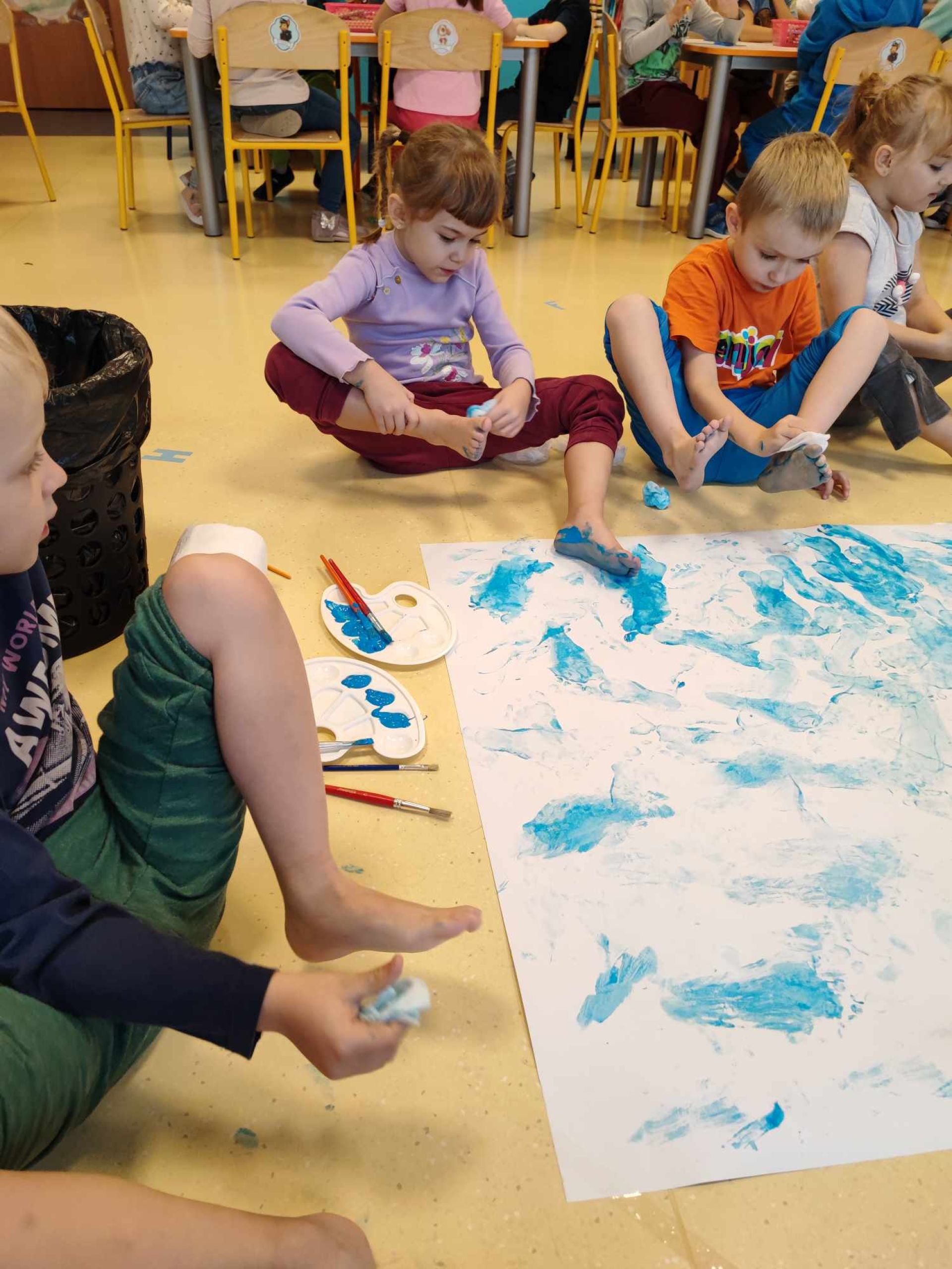 Na zajęciach sensoplastycznych pozwalamy dzieciom na dowolną ekspresję twórczą. Poprzez zanurzanie stóp w farbie przygotowanej na tackach, dzieci pokrywały odbitymi stopami biały arkusz papieru. Malowanie stopami to przede wszystkim fantastyczna zabawa, pełna spontanicznych reakcji, ekspresji twórczej i zdobywania przez dziecko nowych doświadczeń. Malowanie stopami to doskonałe ćwiczenia wspomagające integrację sensoryczną dziecka, w której główną metodą jest posługiwanie się ruchem, jako narzędziem wspomagania rozwoju psychoruchowego dzieci.