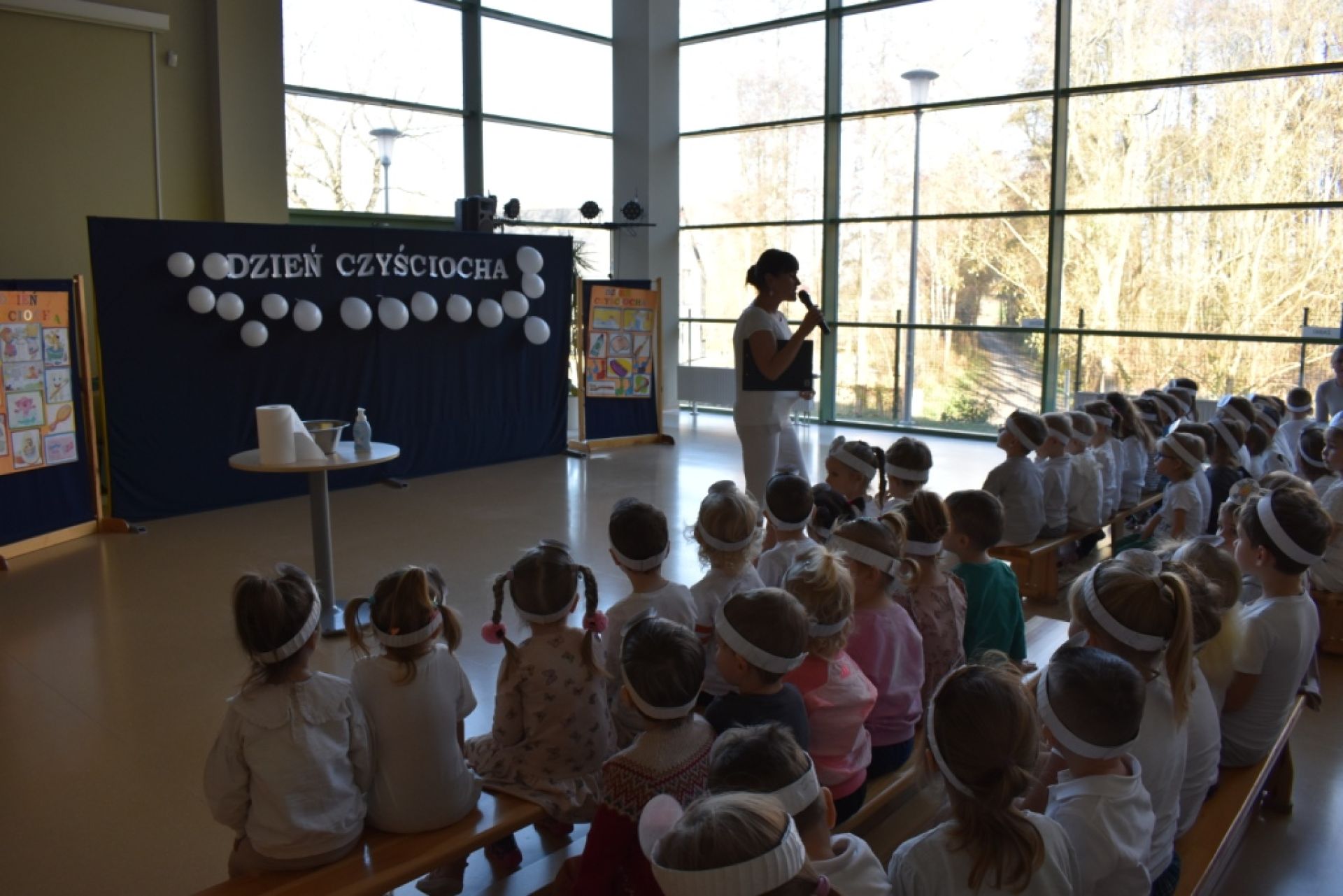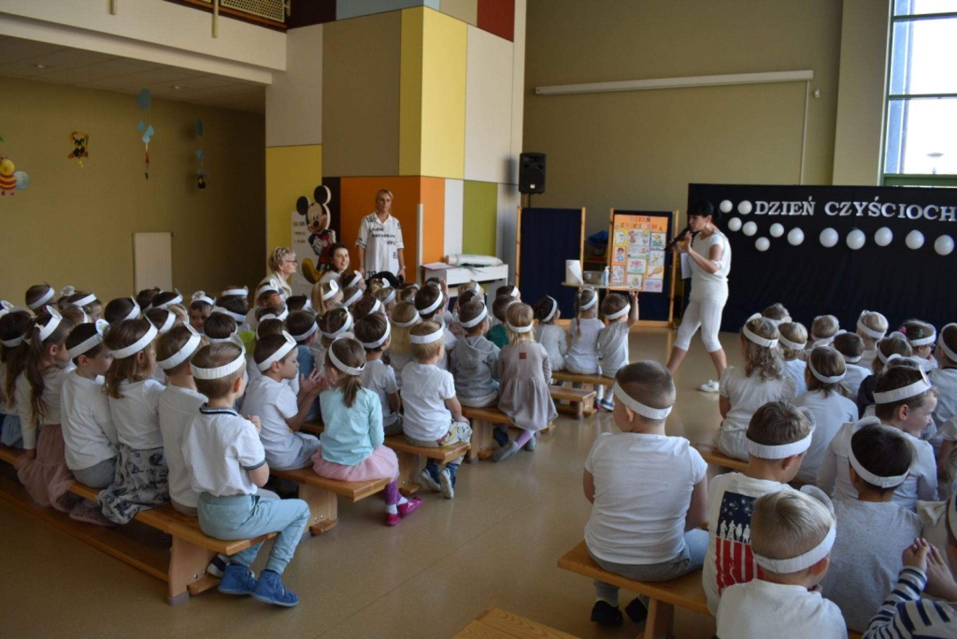 Dzień Czyściocha - wszystkie dzieci ubrane były na biało, otrzymały czyściochowe korony oraz aktywnie uczestniczyły w proponowanych zabawach. Nazywały i wskazywały przedmioty potrzebne do dbania o czystość, prezentowąły prawidłowe mycie rąk i zębów. Na koniec odbył się pochód czyściochów. Każde dziecko otrzymało do domu koronę oraz kolorowankę. To był ciekawy dzień, utrwalający naszą wiedzę na temat czystości.