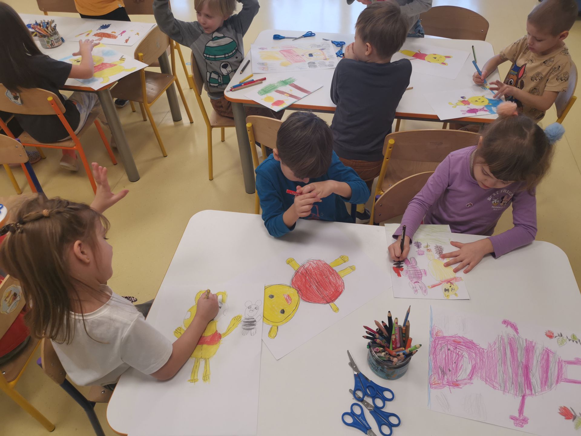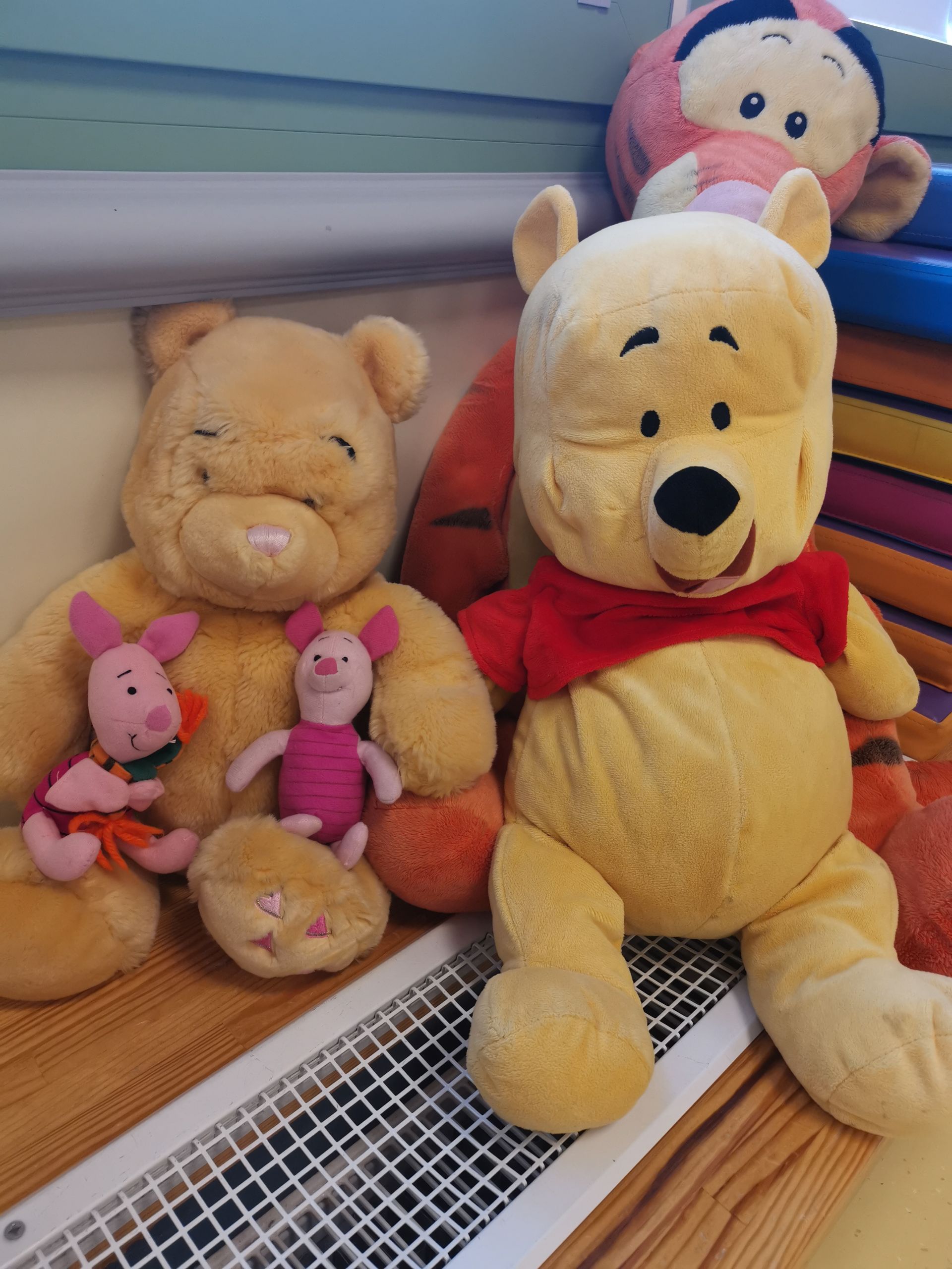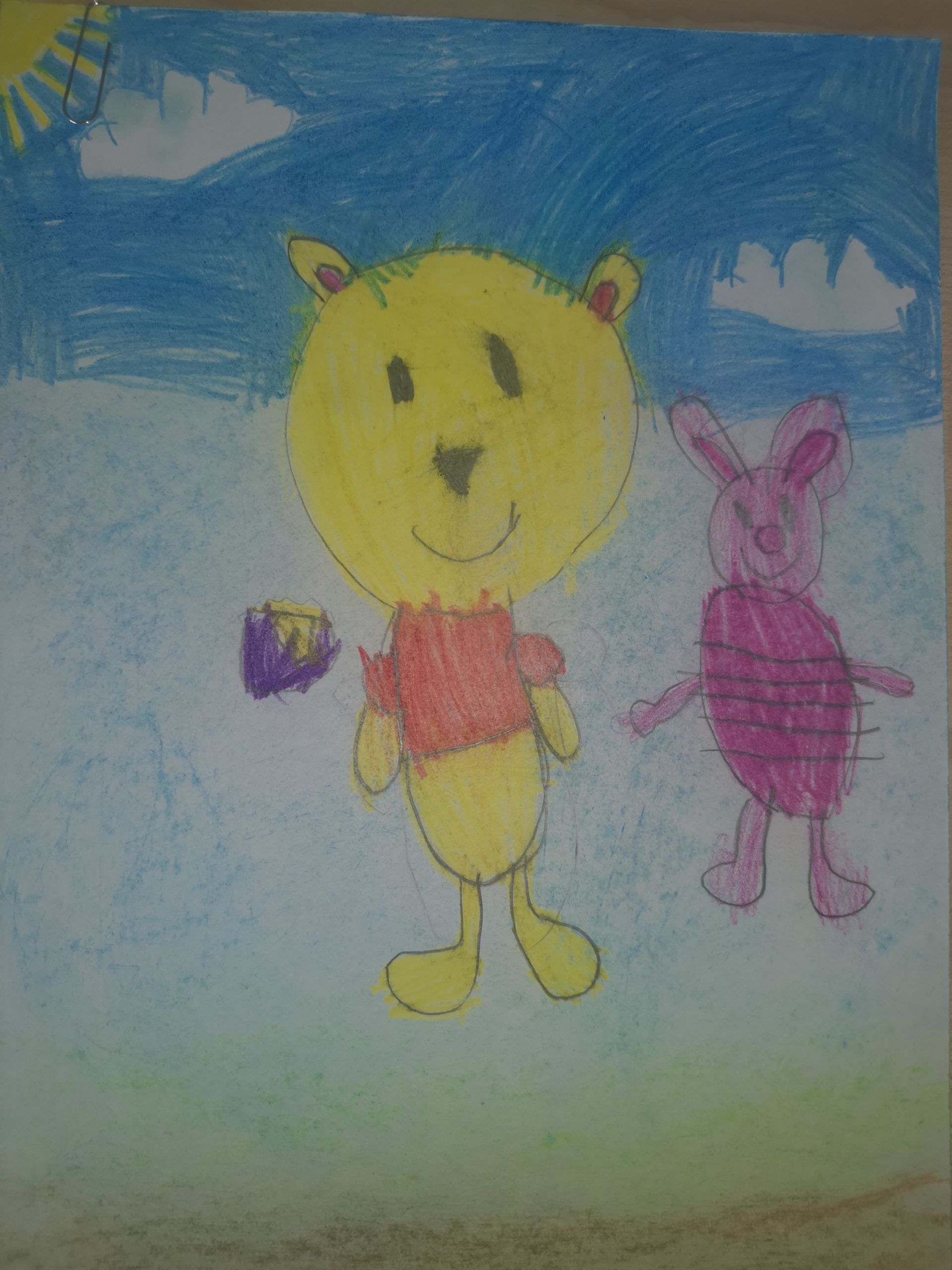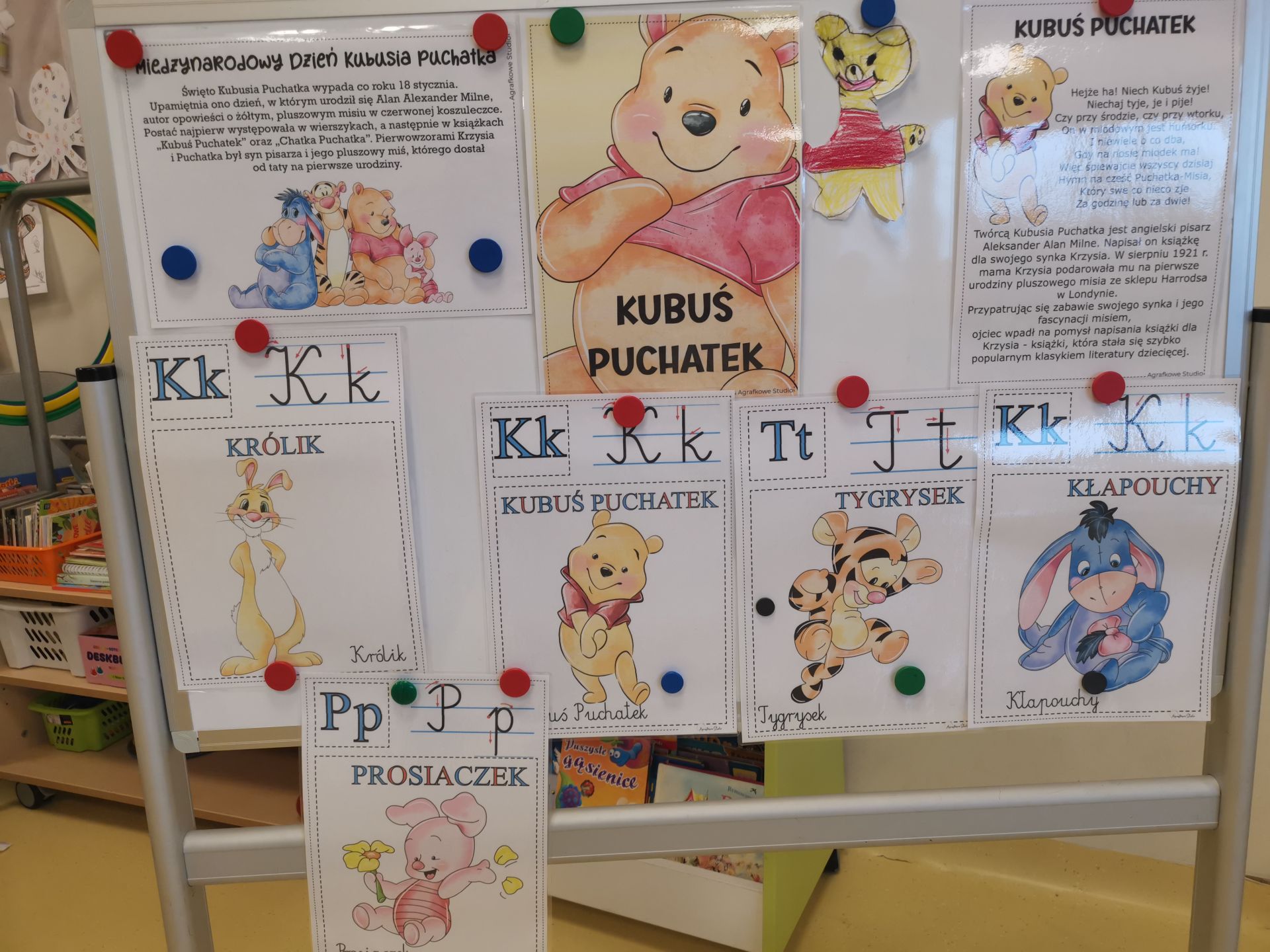 W poniedziałek nasza sala zmieniła się na chwile w Stumilowy las...miejsce w którym mieszka Kubuś Puchatek i przyjaciele. Poczytaliśmy wspólnie o przygodach Kubusia Puchatka, zajadaliśmy się przysmakiem misia czyli słodkim miodkiem. Były zagadki i wyścigi....Na koniec zajęc Sówki stworzyły cudowne prace plastyczne. Kredki pastelowe wyczarowały Kubusiowe cuda!