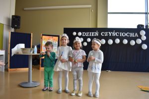 Dzisiaj w naszym przedszkolu dla wszystkich przedszkolaków odbył się Dzień Czyściocha. Dzieci ubrane na biało lub jasne kolory otrzymały czyściochowe korony oraz aktywnie uczestniczyły w proponowanych zabawach. Nazywały i wskazywały przedmioty potrzebne do dbania o czystość, prezentowąły prawidłowe mycie rąk i zębów. Tańczyły i śpiewały piosenki o tematyce ściśle związanej z naszym świętem. Analizowały wspólnie z prowadzącymi paniami teksty literackie, prezentowały je za pomocą ruchu, ćwiczyły pamięć odtwórczą podczas zabaw z wierszami. Na koniec odbył się pochód czyściochów. Każde dziecko otrzymało do domu koronę oraz kolorowankę. Dzieci w naszej grupie dodatkowo otrzymały profesjonalne szczoteczki z pastą zakupione z budżetu naszej grupy. To był ciekawy, utrwalający naszą wiedzę nt. czystości dzień.