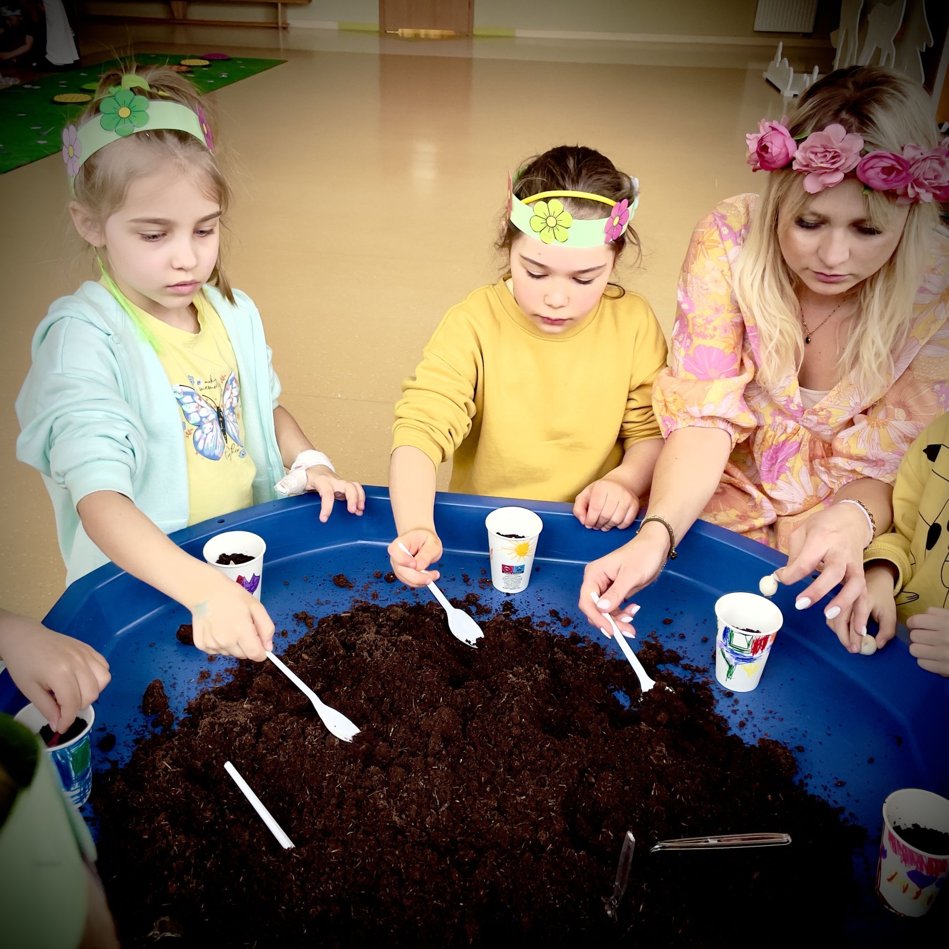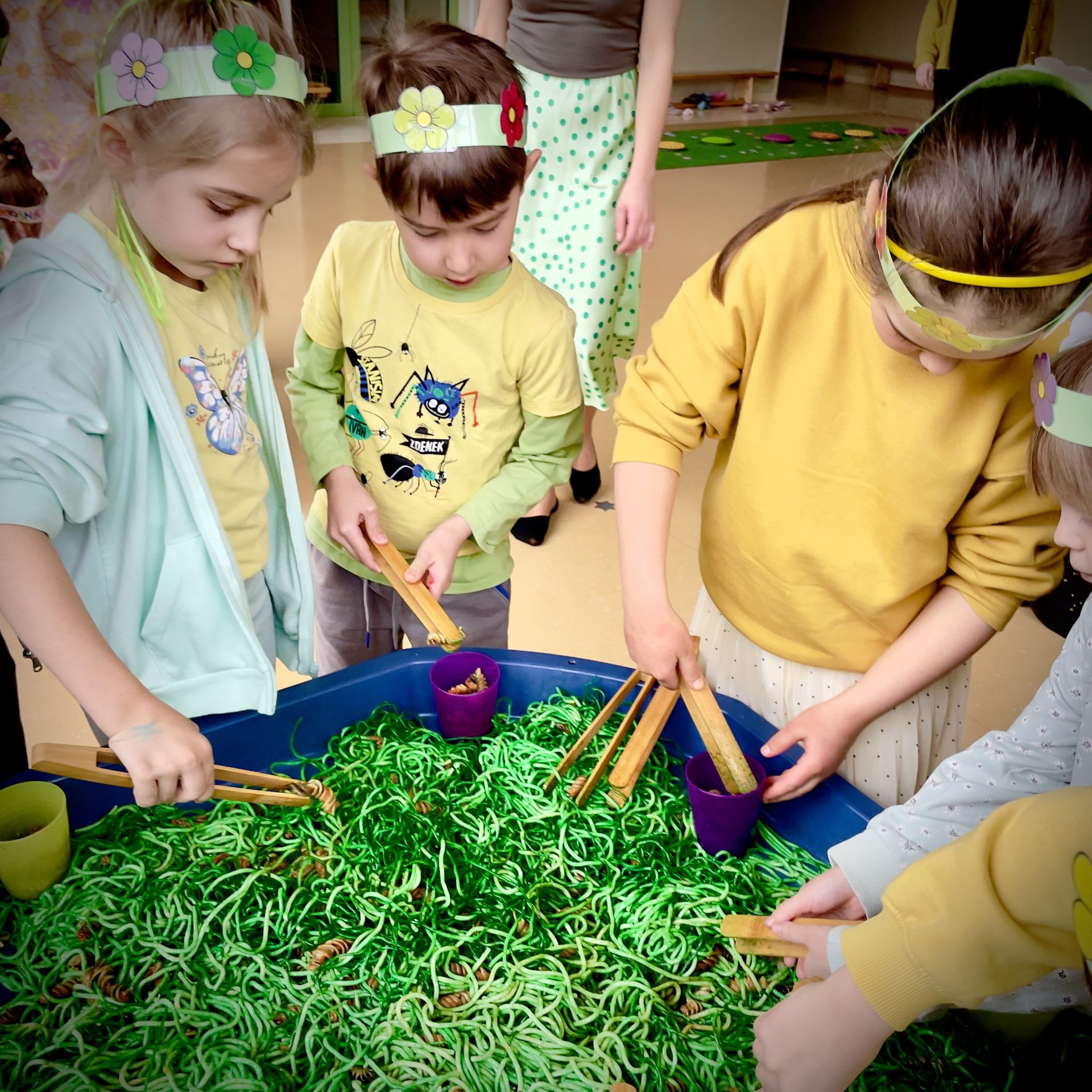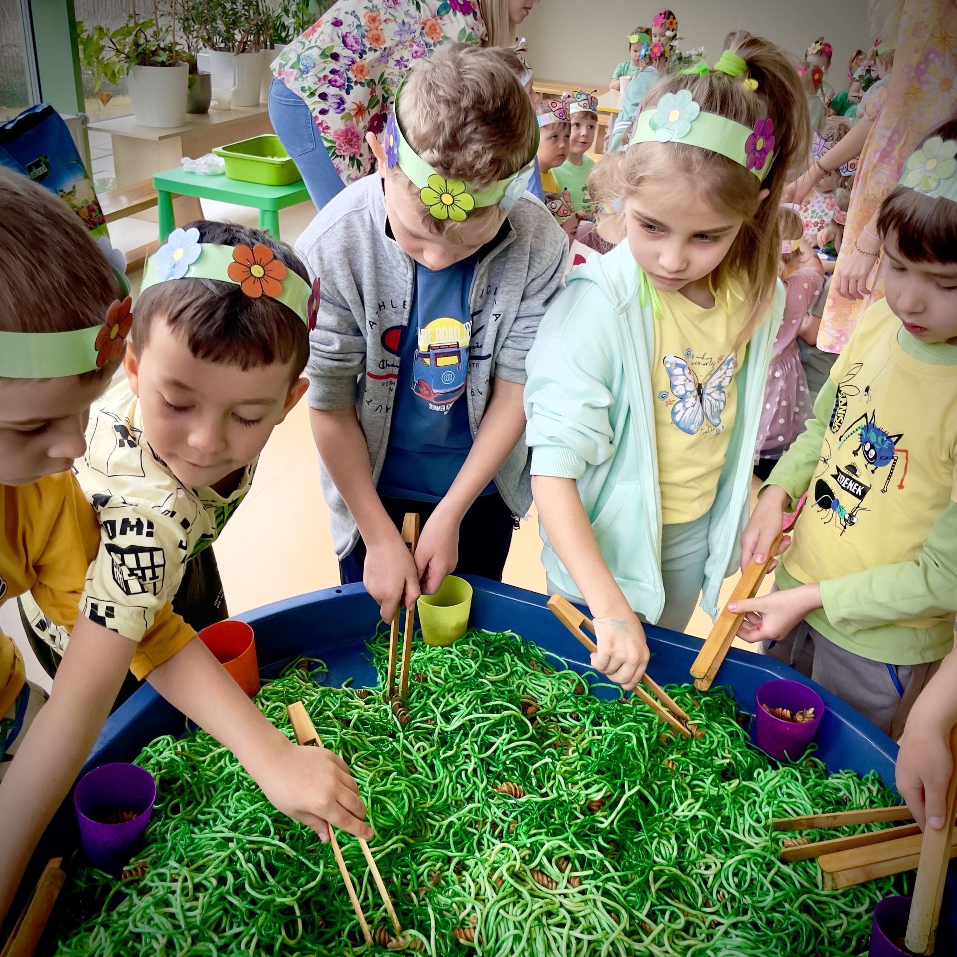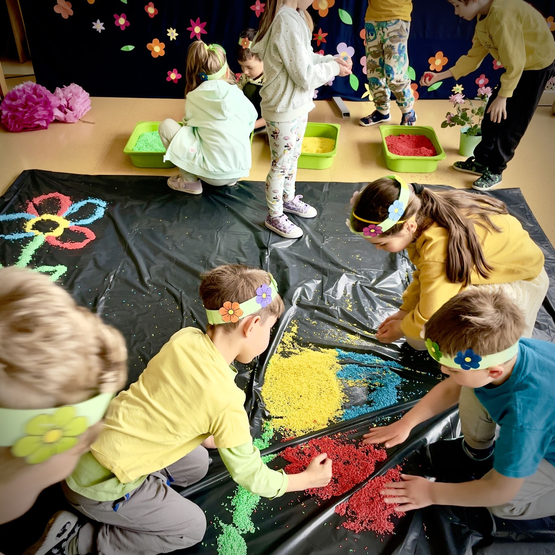 W dniu dzisiejszym dzieci radośnie powitały nową porę roku uczestnicząc w kreatywnych zajęciach sensoplastycznych. Wspólnie z Panią Wiosną rozmawialiśmy o oznakach wiosny - rozkwitających kwiatach, śpiewie ptaków, i budzącej się do życia przyrodzie. Nie zabrakło wspólnych zabaw ruchowych, piosenek o wiośnie. które wprowadziły wszystkich w pogodny nastrój. Szczególną atrakcją były zajęcia sensoplastyczne, które dostarczyły dzieciom wielu niezapomnianych wrażeń.
