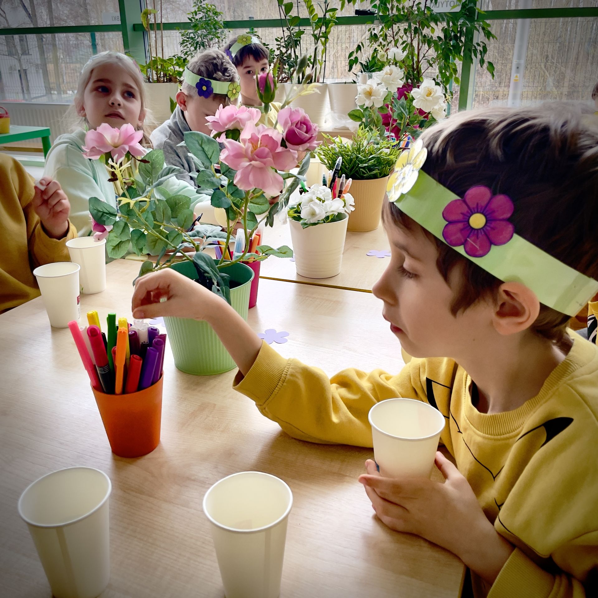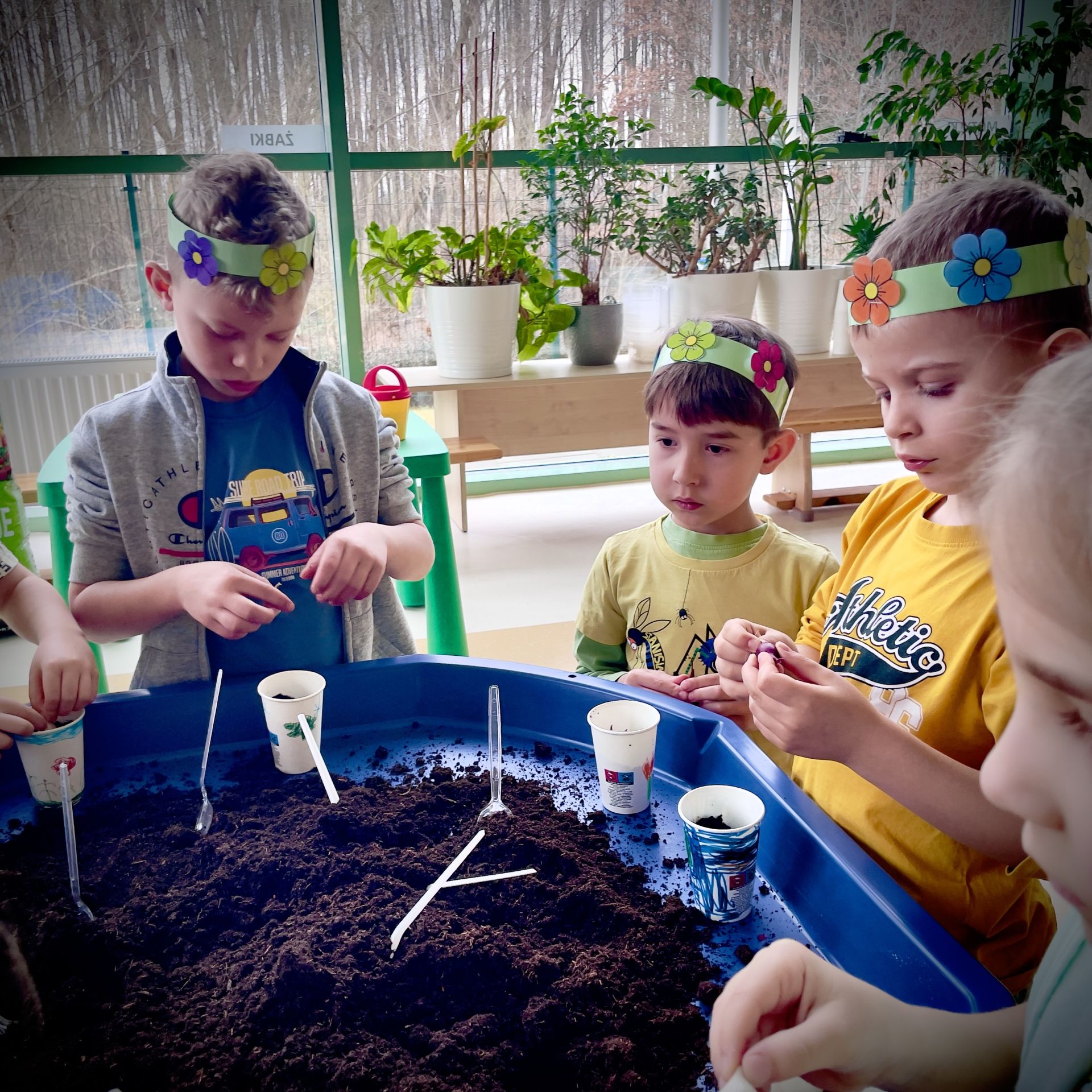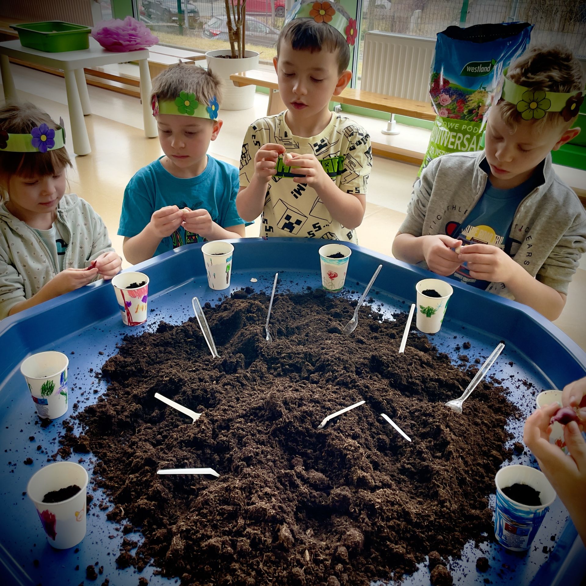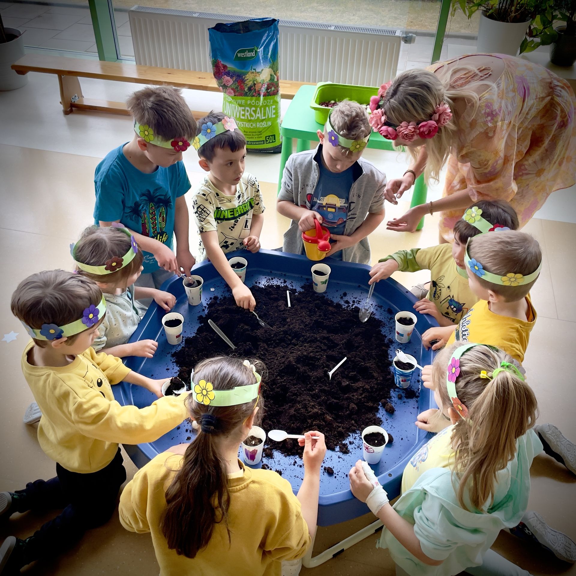 W dniu dzisiejszym dzieci radośnie powitały nową porę roku uczestnicząc w kreatywnych zajęciach sensoplastycznych. Wspólnie z Panią Wiosną rozmawialiśmy o oznakach wiosny - rozkwitających kwiatach, śpiewie ptaków, i budzącej się do życia przyrodzie. Nie zabrakło wspólnych zabaw ruchowych, piosenek o wiośnie. które wprowadziły wszystkich w pogodny nastrój. Szczególną atrakcją były zajęcia sensoplastyczne, które dostarczyły dzieciom wielu niezapomnianych wrażeń.