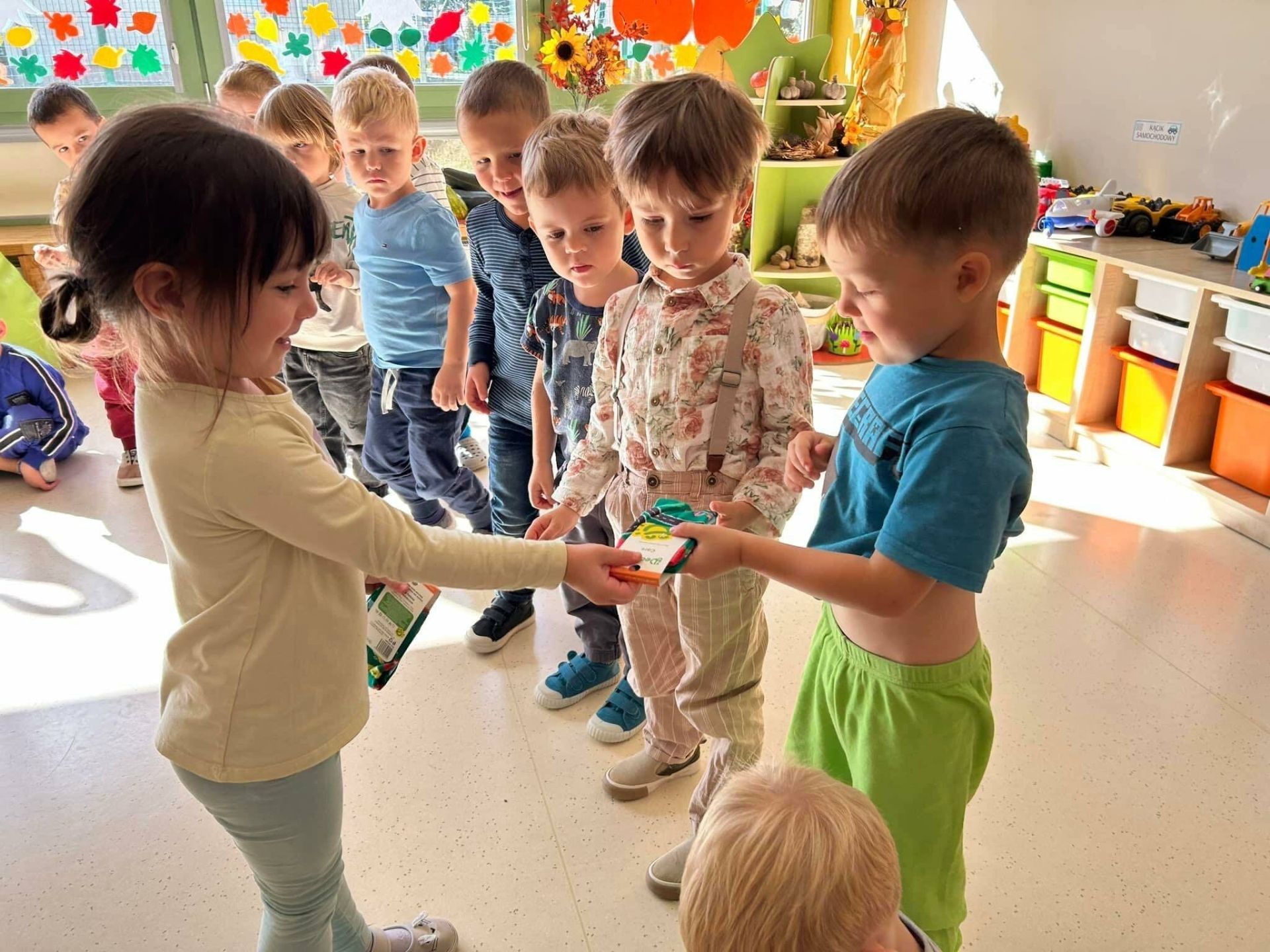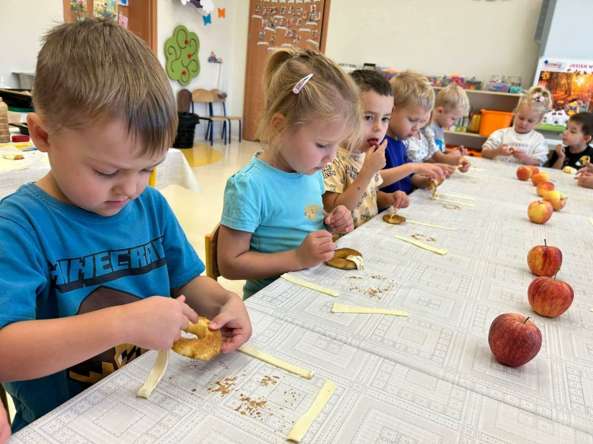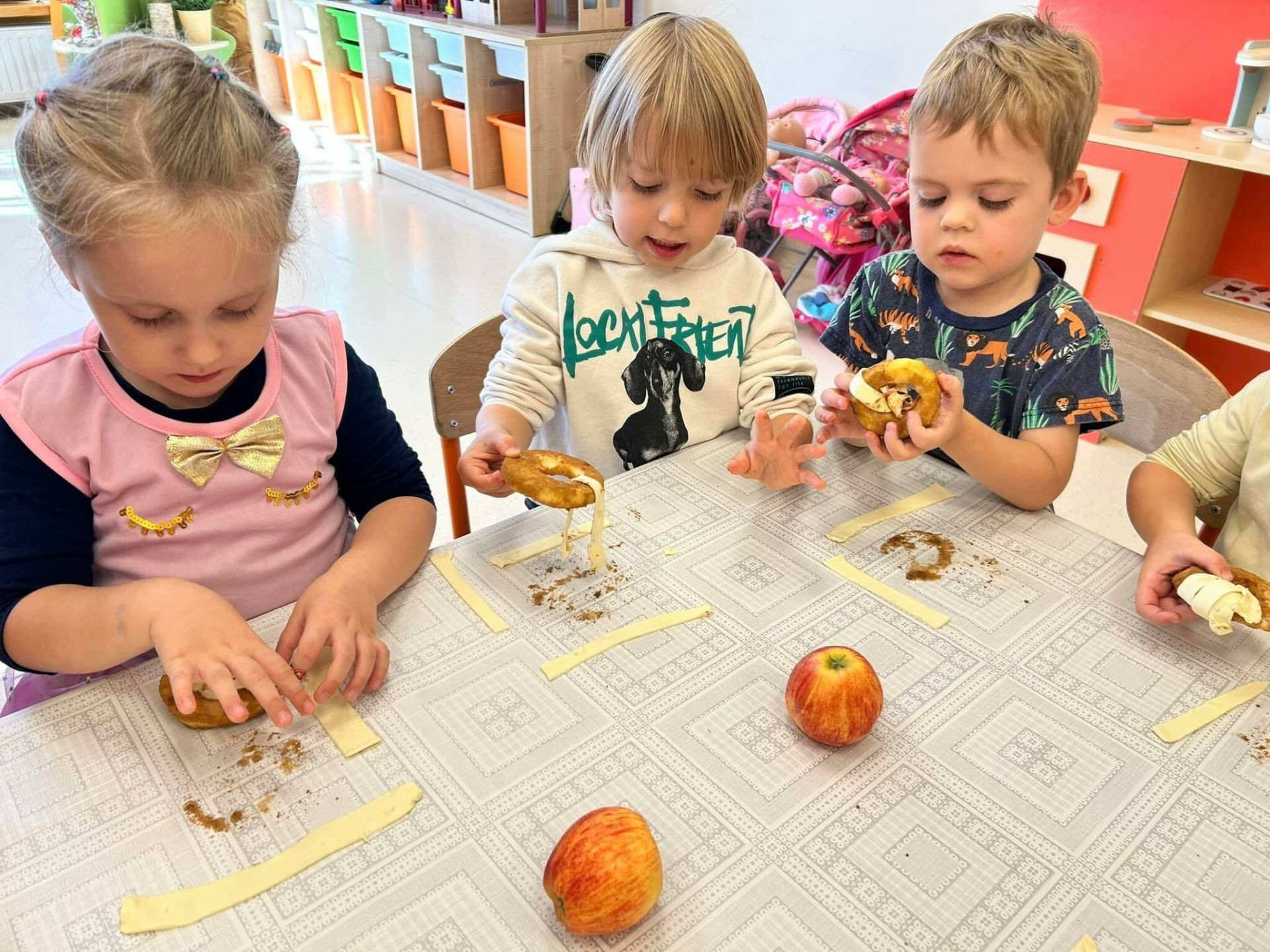Dzisiaj dzieciaczki upiekły jabłuszkowe dynie. Małe paluszki dzielnie i sumiennie pracowały by stworzyć takie pyszności. Wykorzystały do tego jabłka, cynamon oraz ciasto francuskie. Na koniec dziewczynki wręczyły prezenty i słodkości chłopcom z okazji ich święta.