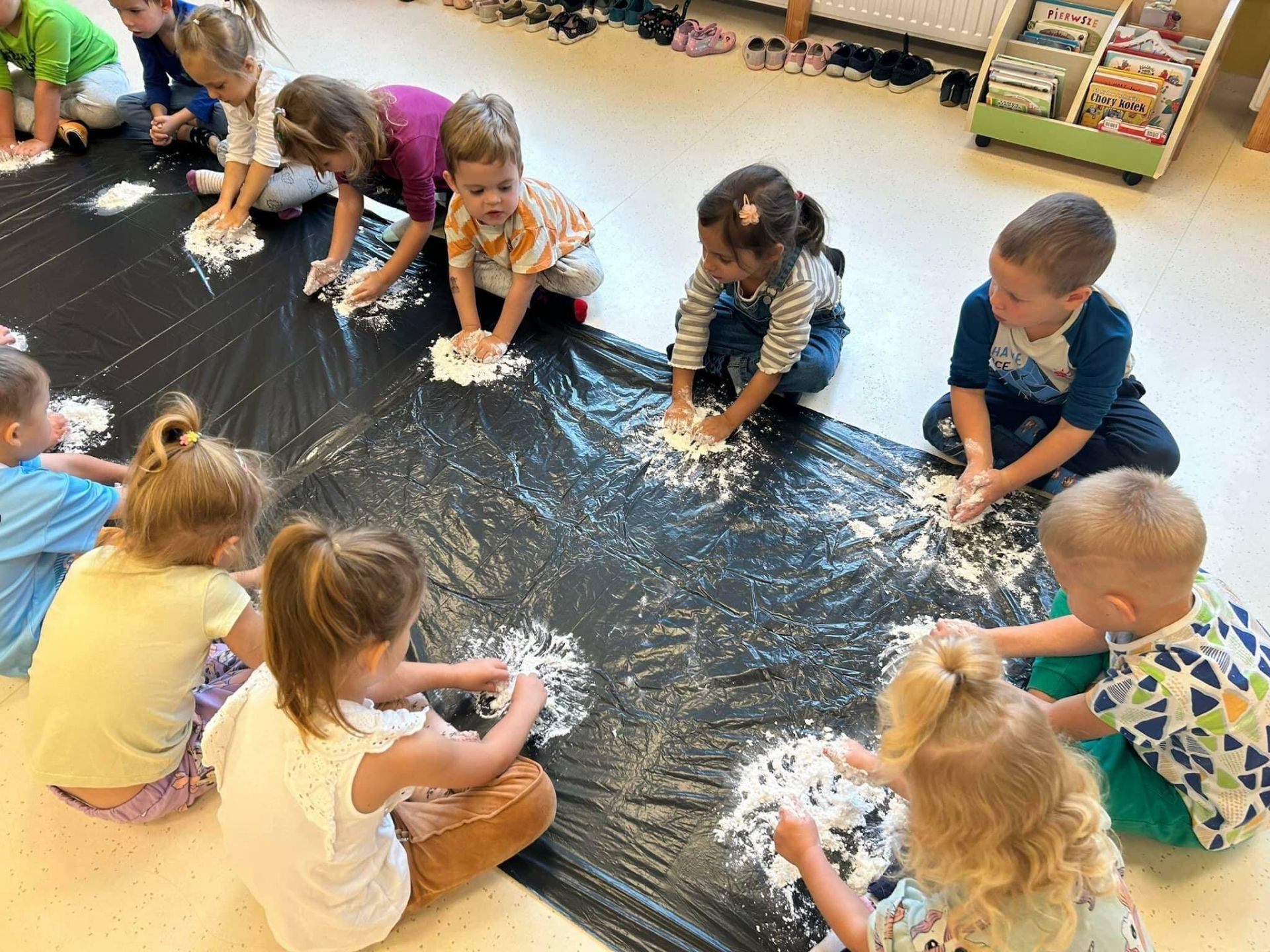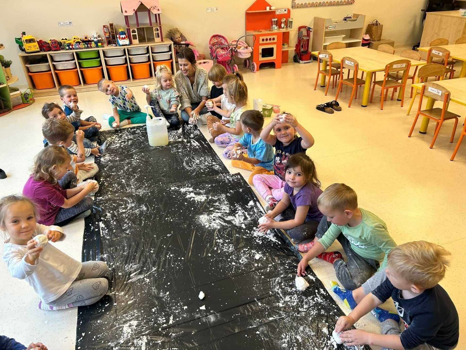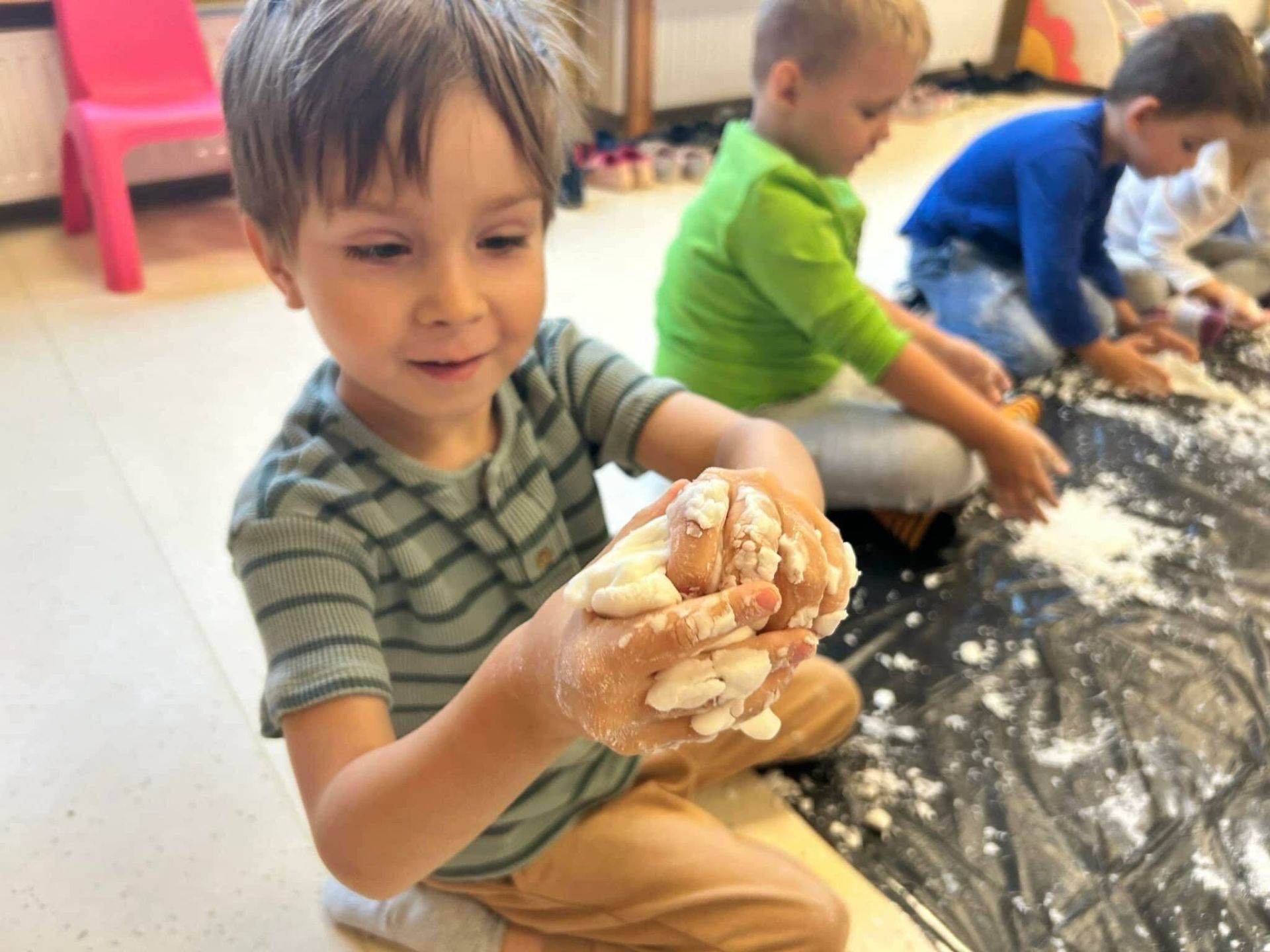 Dzisiaj dzieciaczki tworzyły kolorową, puszystą ciastolinę! Uśmiech, radość i fascynacja dzieci podczas tworzenia czegoś, prawie z niczego, są dla nas bezcenne. Pracowaliśmy dzisiaj na bazie skrobi ziemniaczanej, szamponu, brokatu i barwników spożywczych.