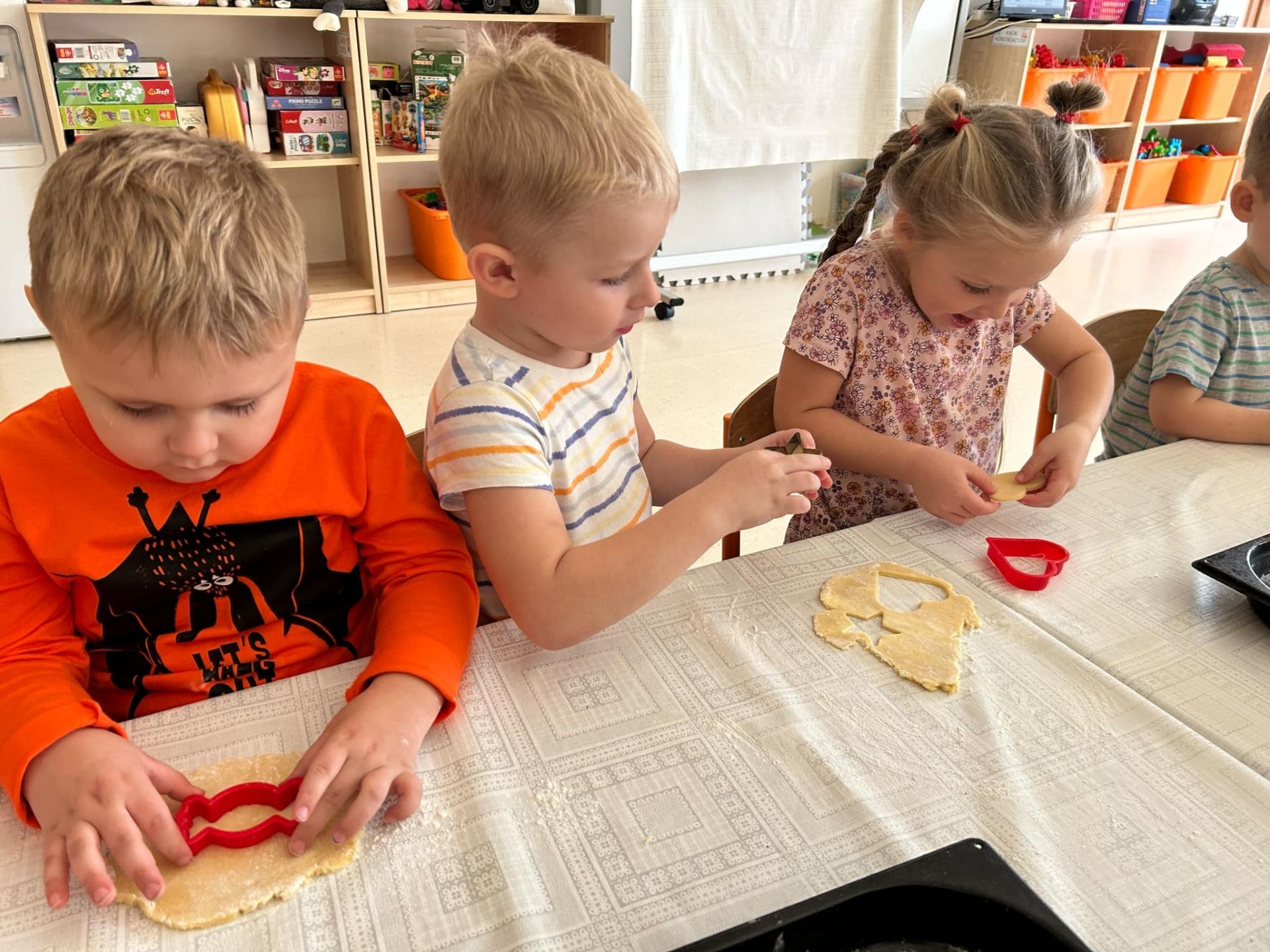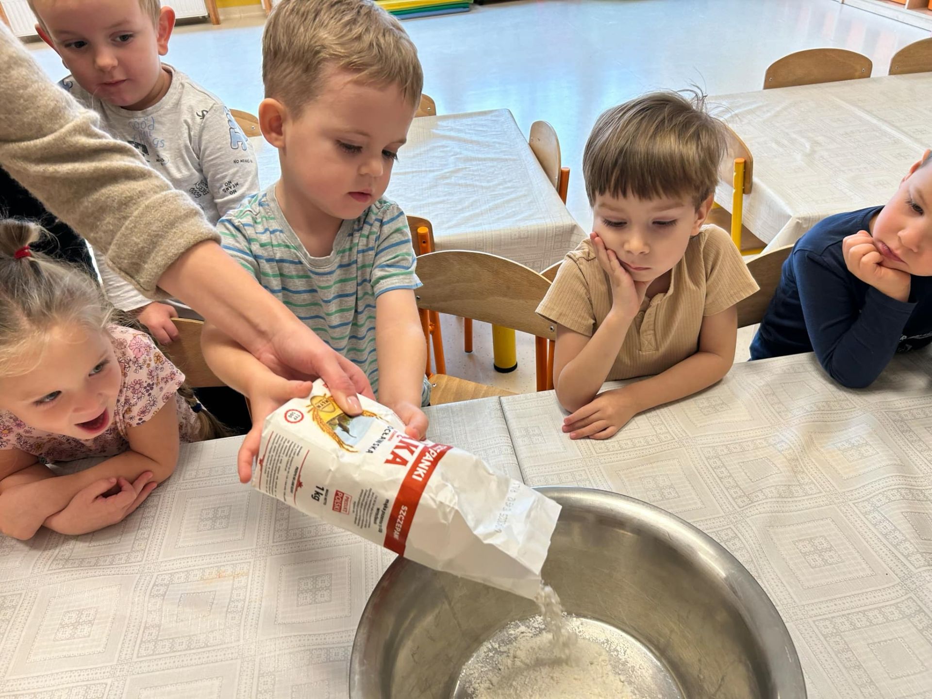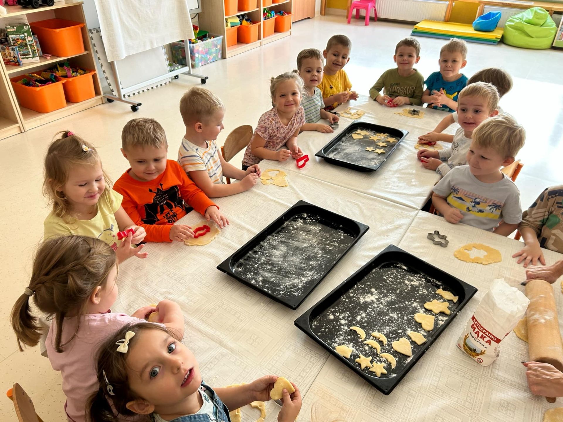 Dziś odbyły się kolejne warsztaty kulinarne, na których dzieci wspólnie z Paniami przygotowały ciasteczka maślane. Przedszkolaki dzielnie i z pełnym zaangażowaniem wałkowały ciasto oraz wycinały foremkami różne kształty. Przygotowane ciasteczka zostały upieczone w przedszkolnej kuchni. Gdy przyszedł czas degustacji, dzieci z apetytem i dumą próbowały przygotowanych przez siebie ciasteczek.