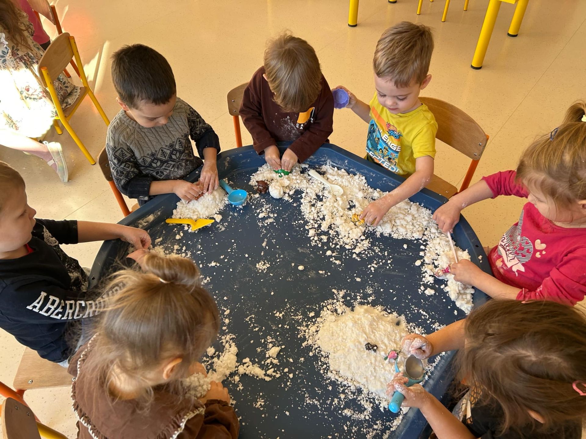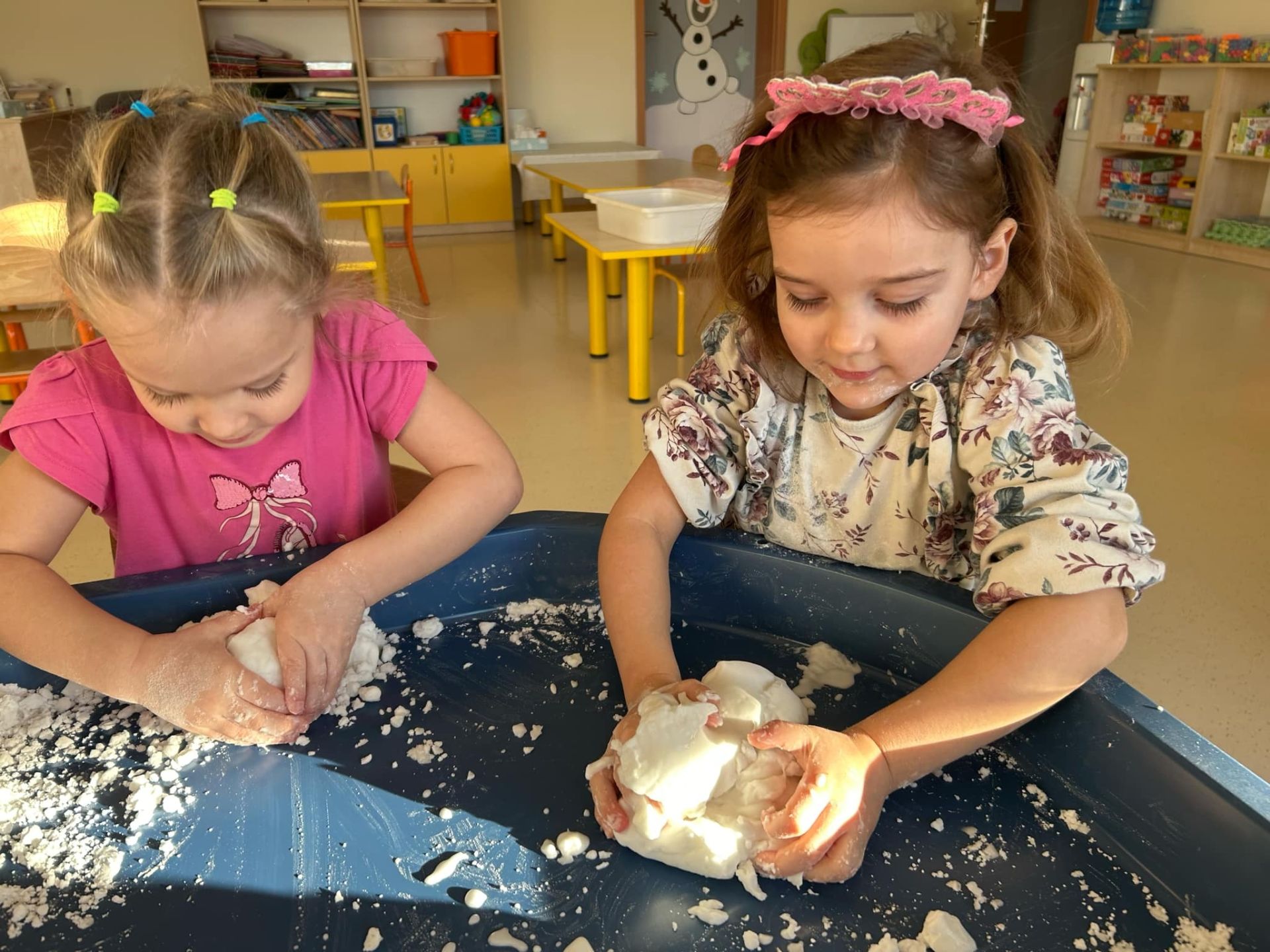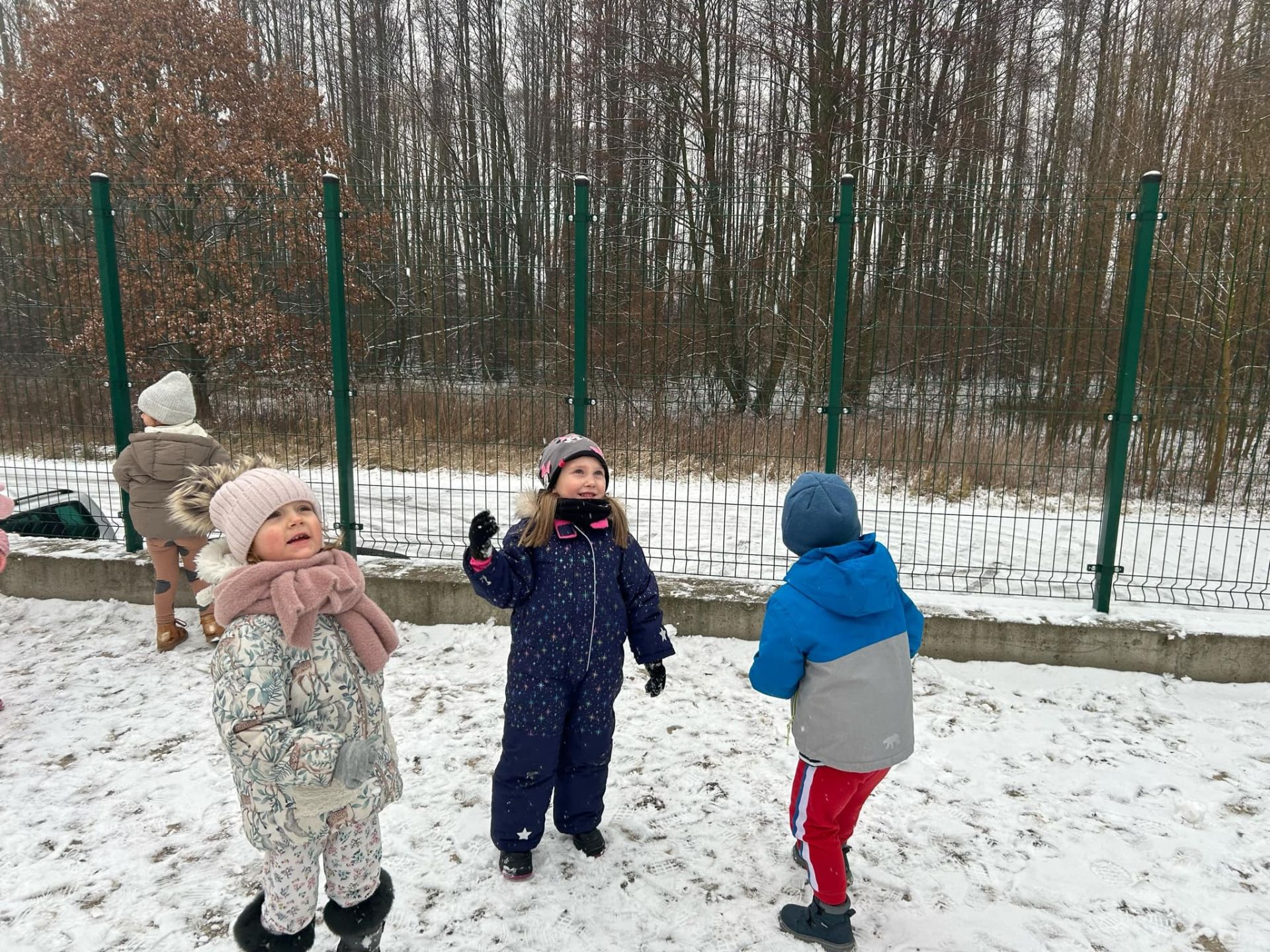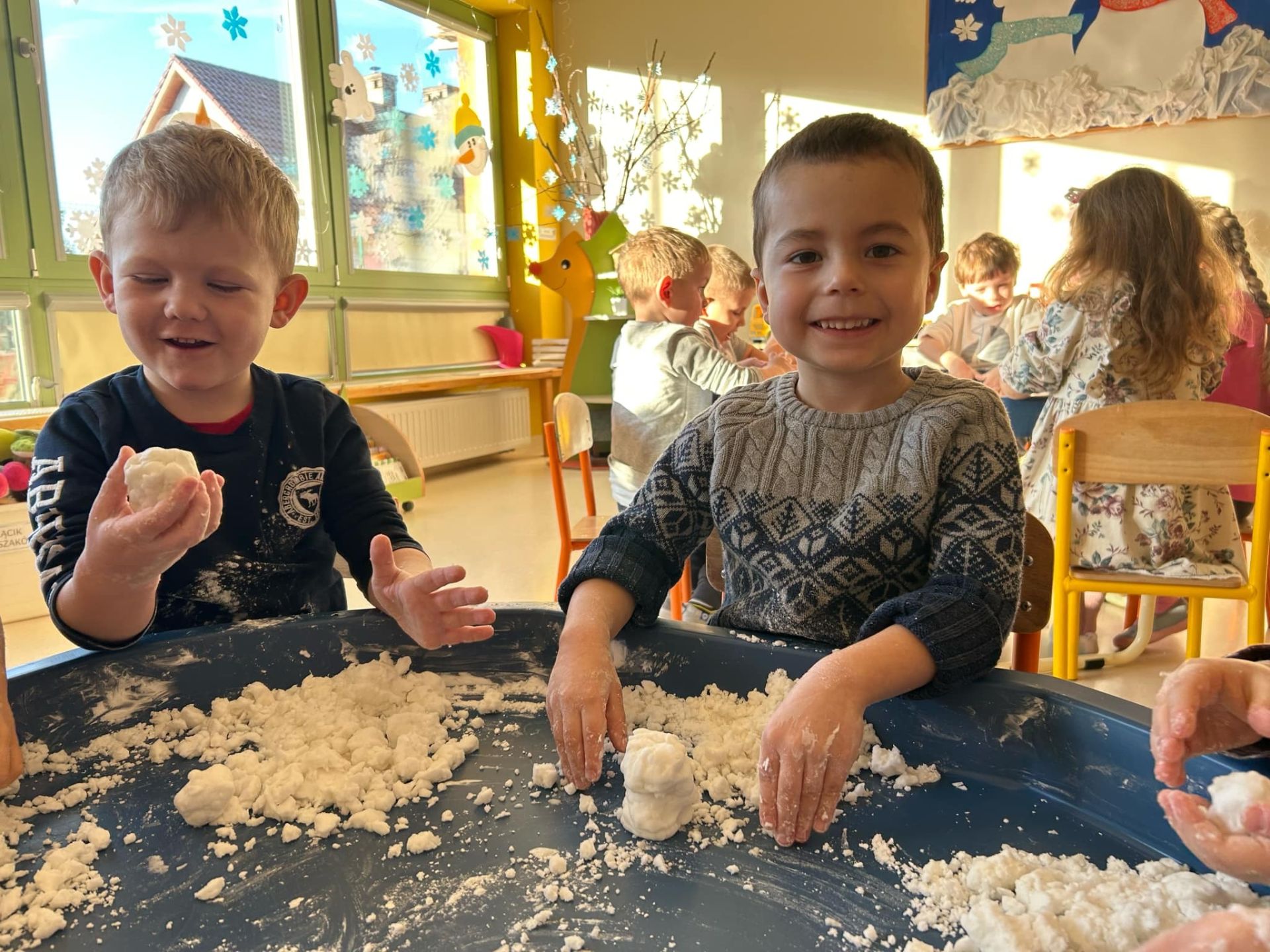 Korzystając z uroków zimy dzieci z naszej grupy bawiły się w przedszkolnym ogrodzie lepiąc śnieżne budowle oraz rzucając się śnieżkami. Przedszkolaki uwielbiają także wszelkiego rodzaju zabawy sensoryczne, dlatego też często z nich korzystamy. Zabawy te odgrywaja kluczową rolę w rozwoju dziecięcych zmysłów i umiejętności poznawczych. Zima to wiele możliwości na wspaniałe zabawy zarówno w sali jak i na świeżym powietrzu.