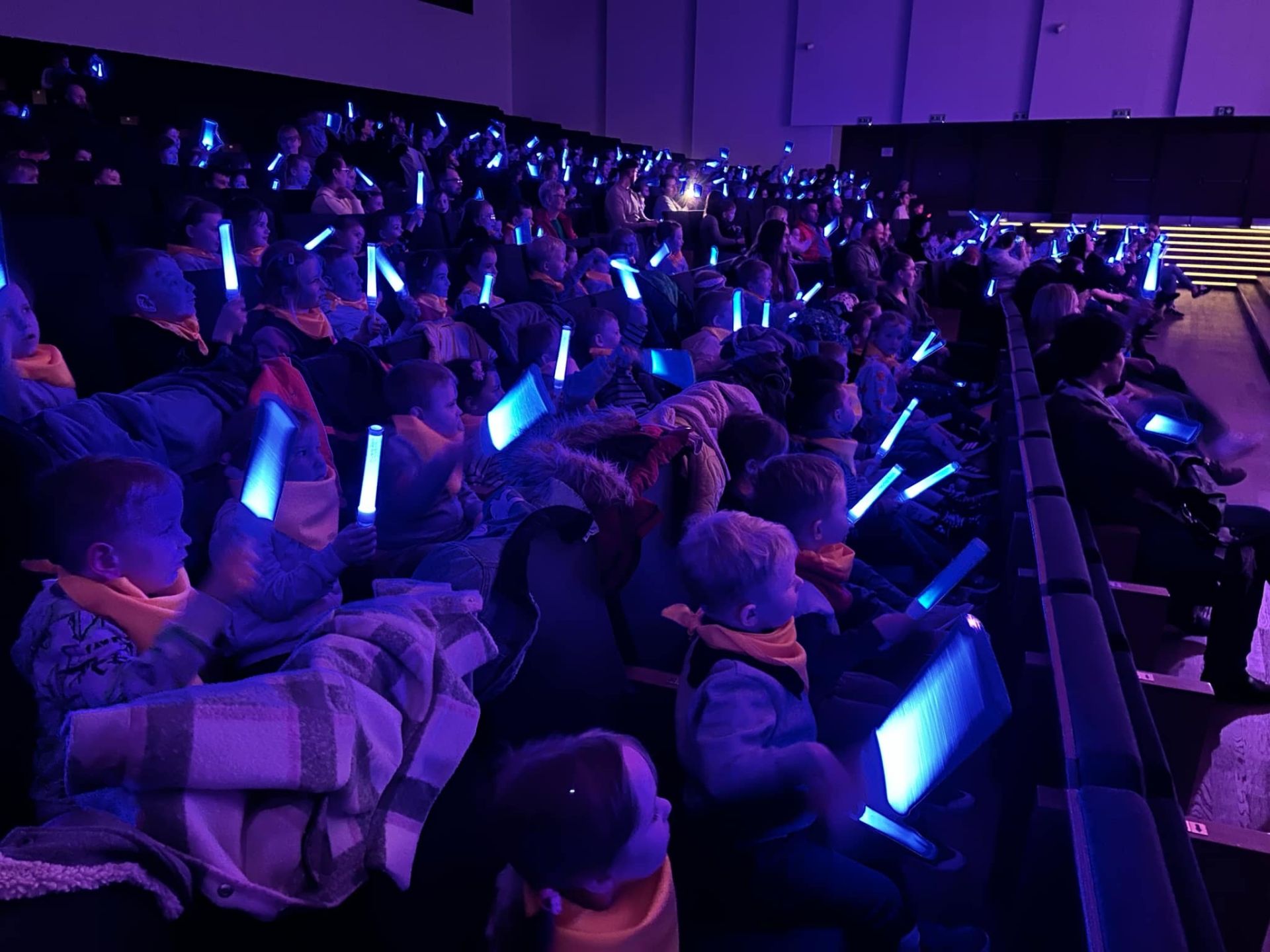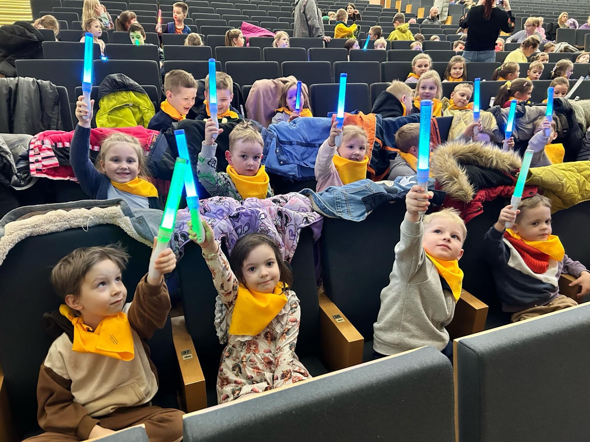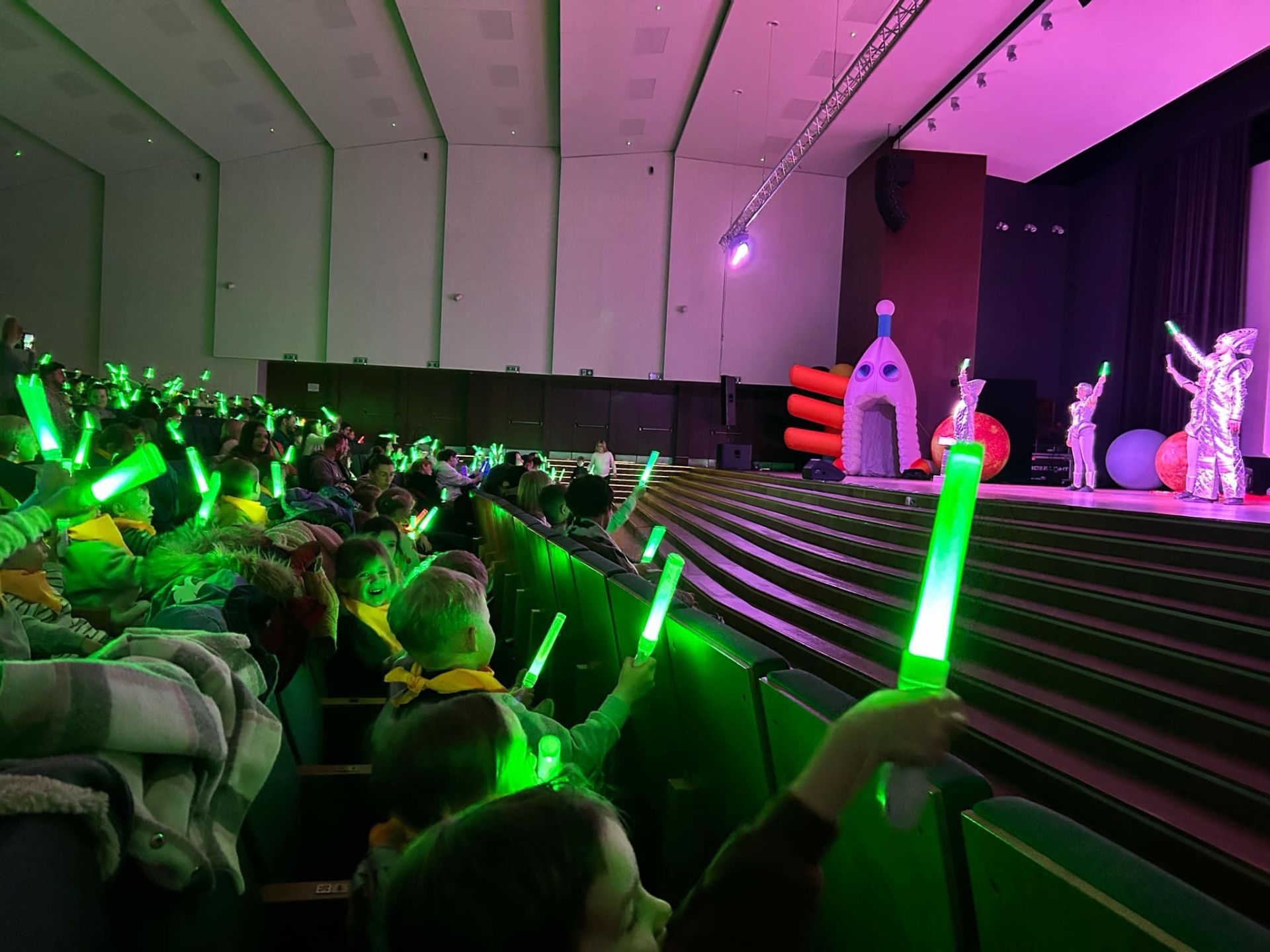 Dziś przedszkolaki wybrały się na ciekawy spektakl interaktywny "Kosmo Show" o kosmosie. Dzieci podczas występu brały czynny udział - otrzymały specjalne latarki, dzięki którym zapalały gwiazdy, rozbijały asteroidy, sterowały statkiem kosmicznym i tworzyły niesamowite efekty świetlne. Dzieciaczki były zachwycone magią kolorów i dźwięków.