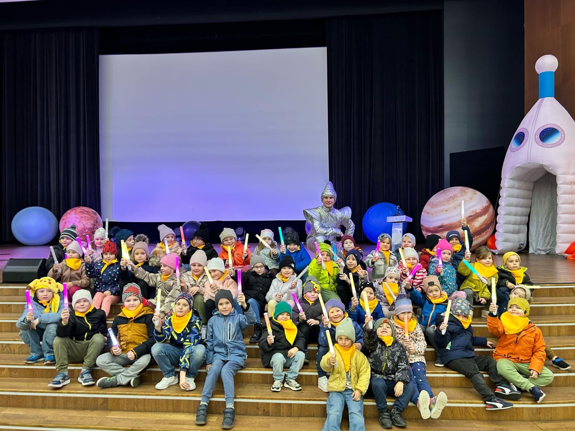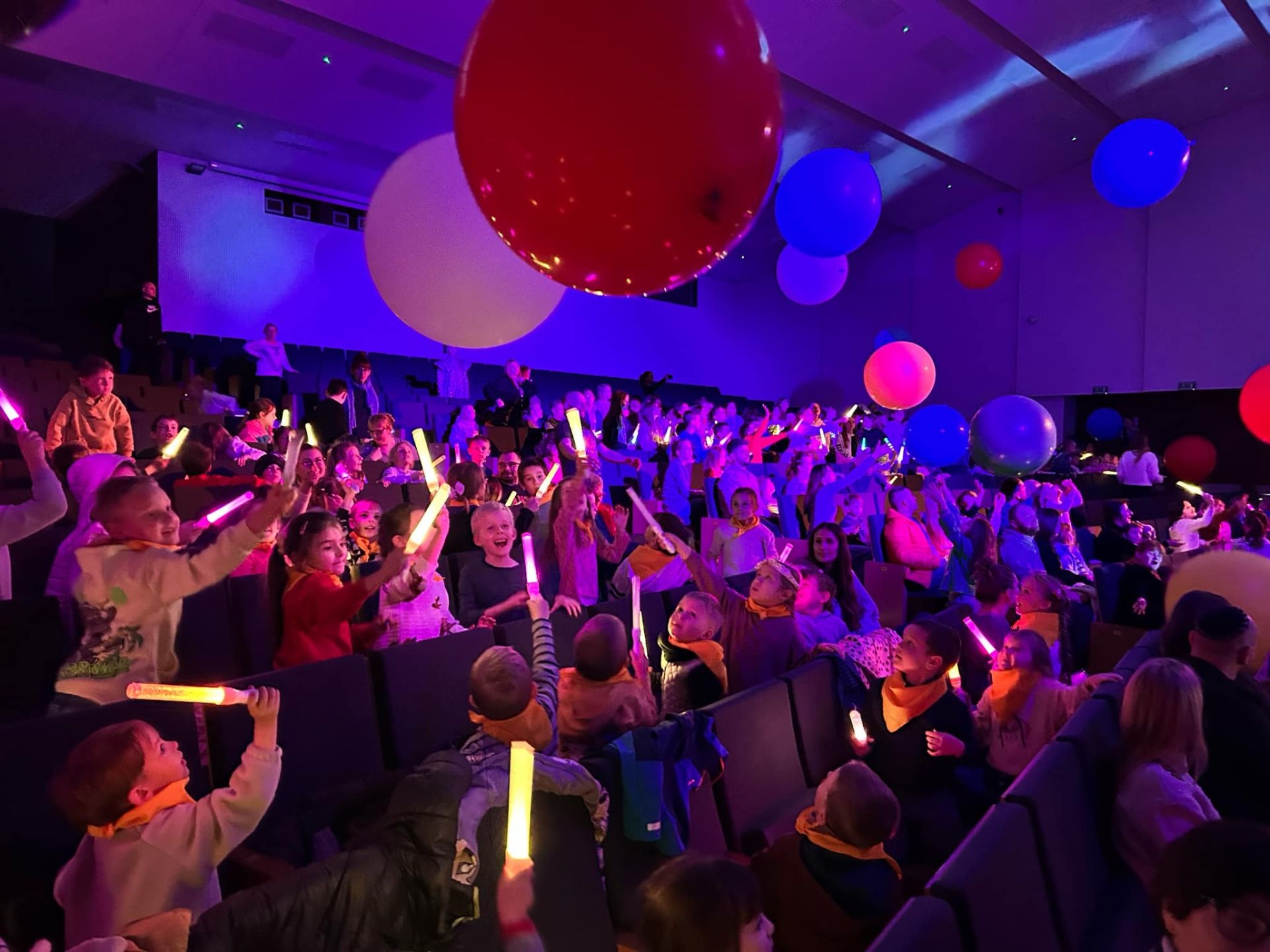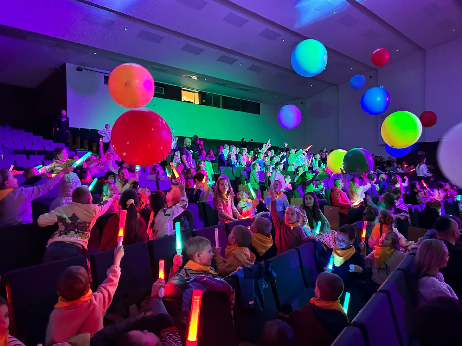 Dziś przedszkolaki wybrały się na ciekawy spektakl interaktywny "Kosmo Show" o kosmosie. Dzieci podczas występu brały czynny udział - otrzymały specjalne latarki, dzięki którym zapalały gwiazdy, rozbijały asteroidy, sterowały statkiem kosmicznym i tworzyły niesamowite efekty świetlne. Dzieciaczki były zachwycone magią kolorów i dźwięków.