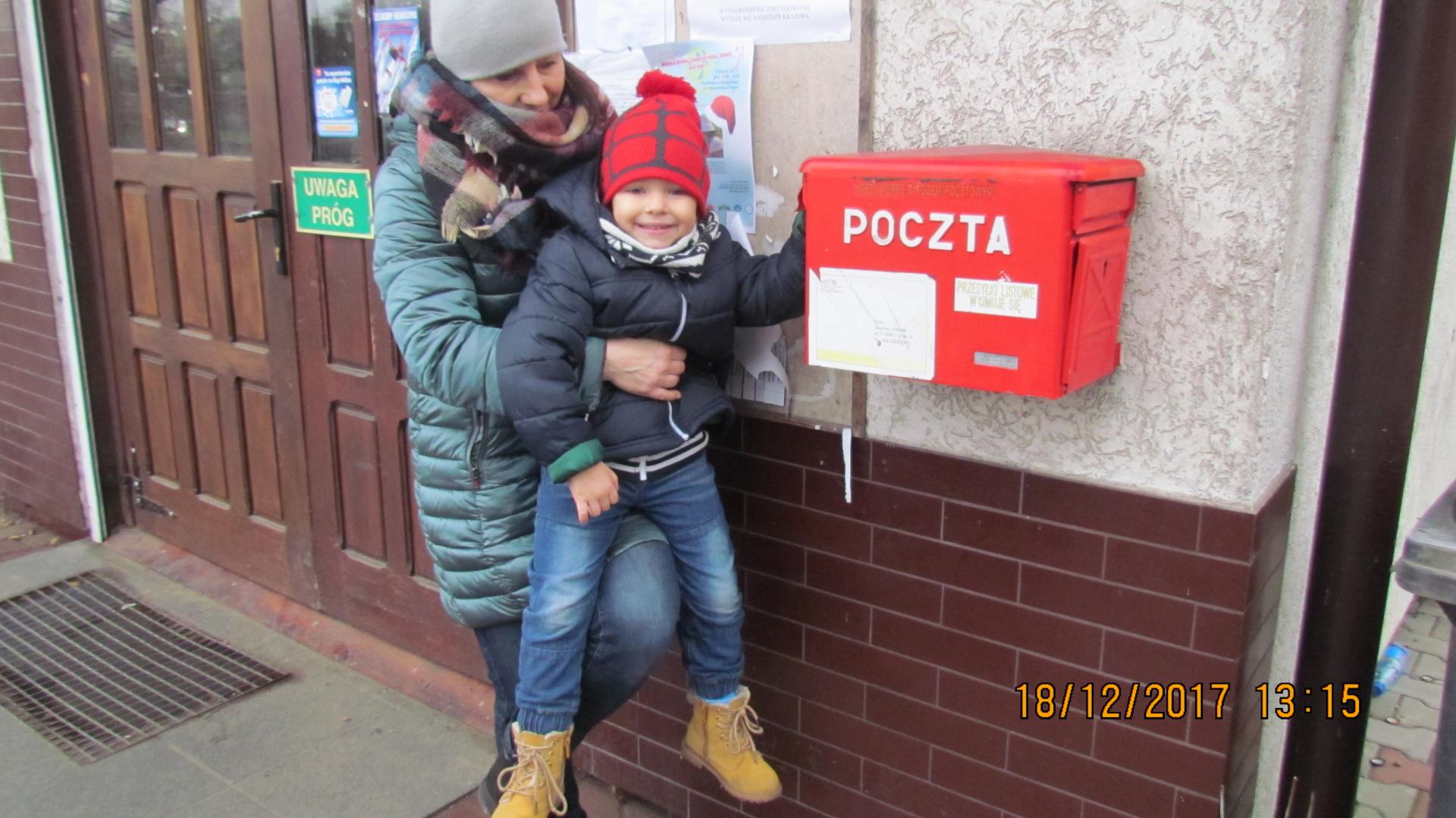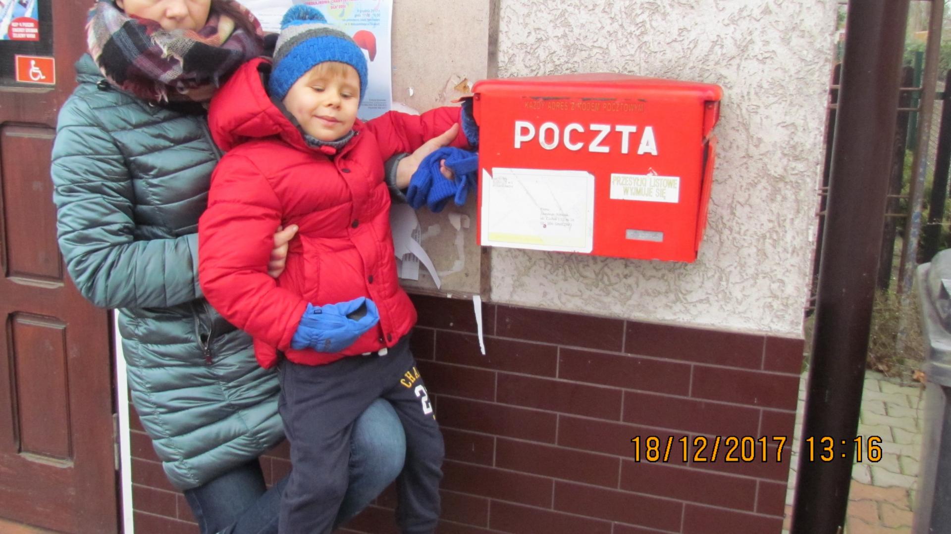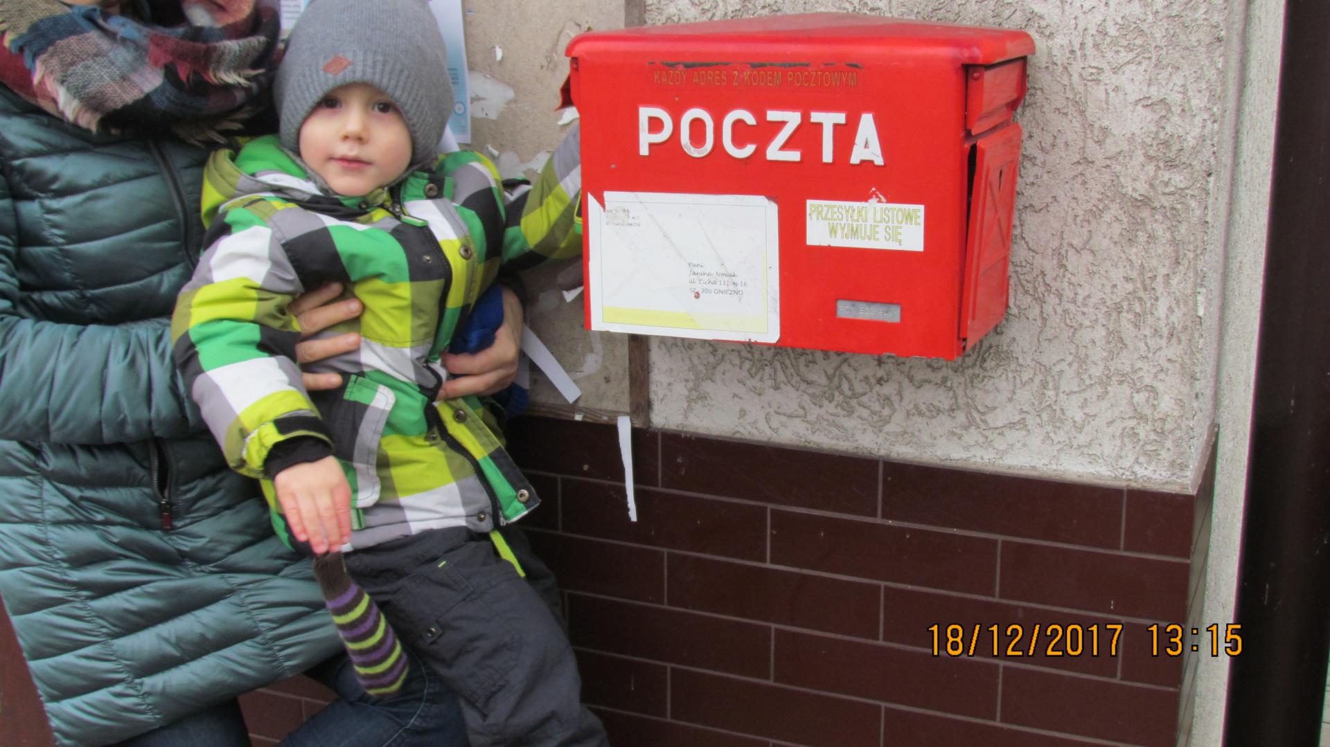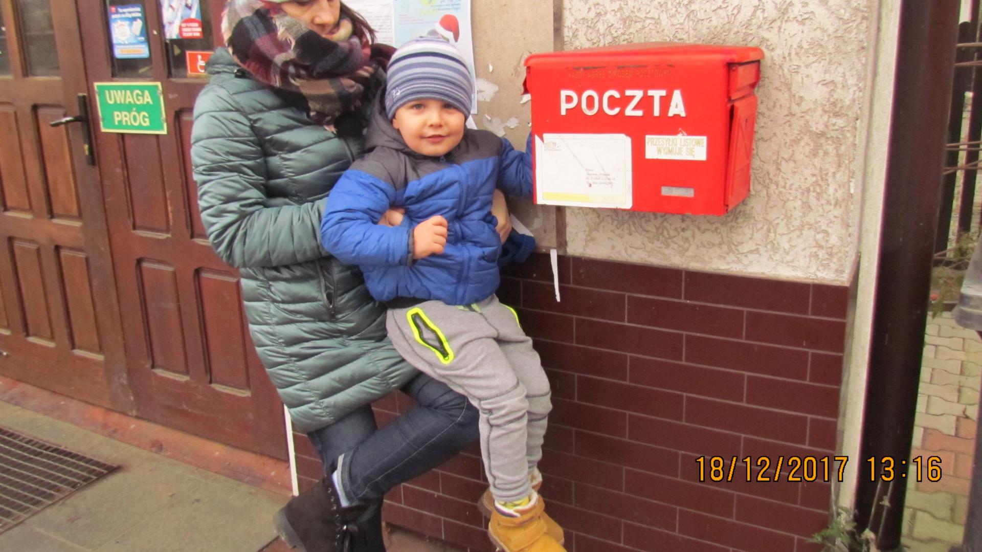 Dziś,18 grudnia wybraliśmy się z wizytą na pocztę. Chcieliśmy wysłać świąteczne życzenia dla Pani Dyrektor i wszystkich pracowników naszego przedszkola. Mieliśmy bardzo duży list do wysłania. Nie wiedzieliśmy, czy poradzimy sobie z wysłaniem go. Nasze obawy szybko zamieniły się w radość. Z pomocą przyszedł nam Pan, który obsługiwał okienko listowe. Wytłumaczył nam, jaka jest droga listu, co musimy zrobić, żeby list szybko trafił do właściwego adresata.