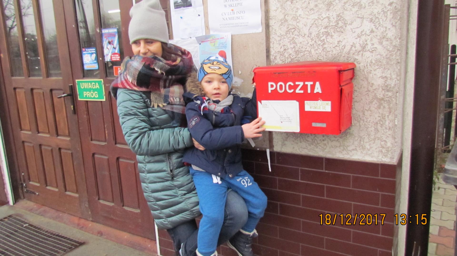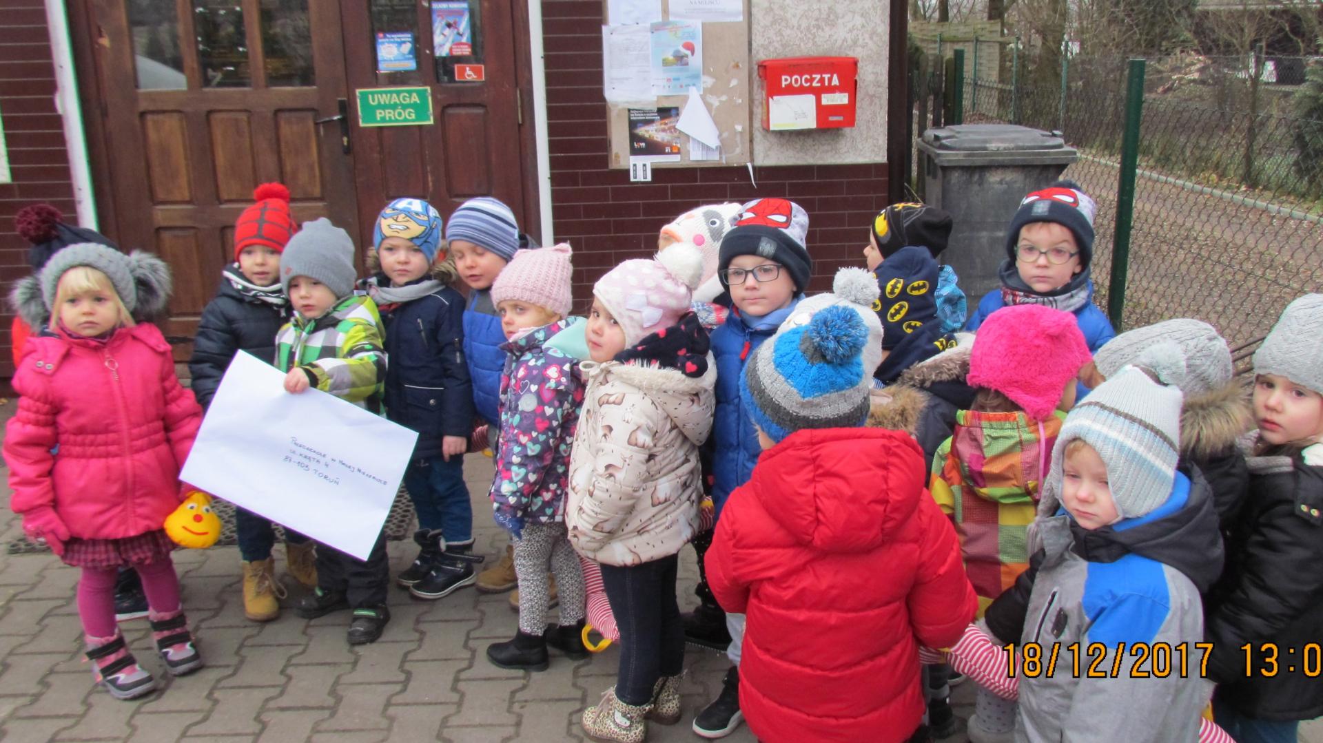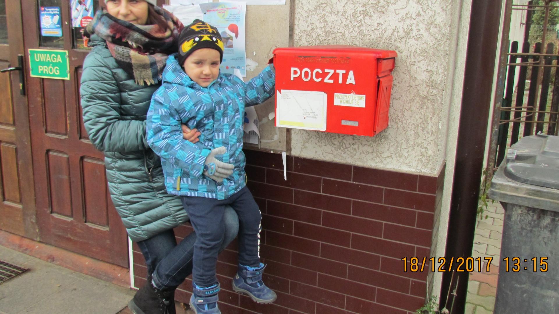 Dziś,18 grudnia wybraliśmy się z wizytą na pocztę. Chcieliśmy wysłać świąteczne życzenia dla Pani Dyrektor i wszystkich pracowników naszego przedszkola. Mieliśmy bardzo duży list do wysłania. Nie wiedzieliśmy, czy poradzimy sobie z wysłaniem go. Nasze obawy szybko zamieniły się w radość. Z pomocą przyszedł nam Pan, który obsługiwał okienko listowe. Wytłumaczył nam, jaka jest droga listu, co musimy zrobić, żeby list szybko trafił do właściwego adresata.