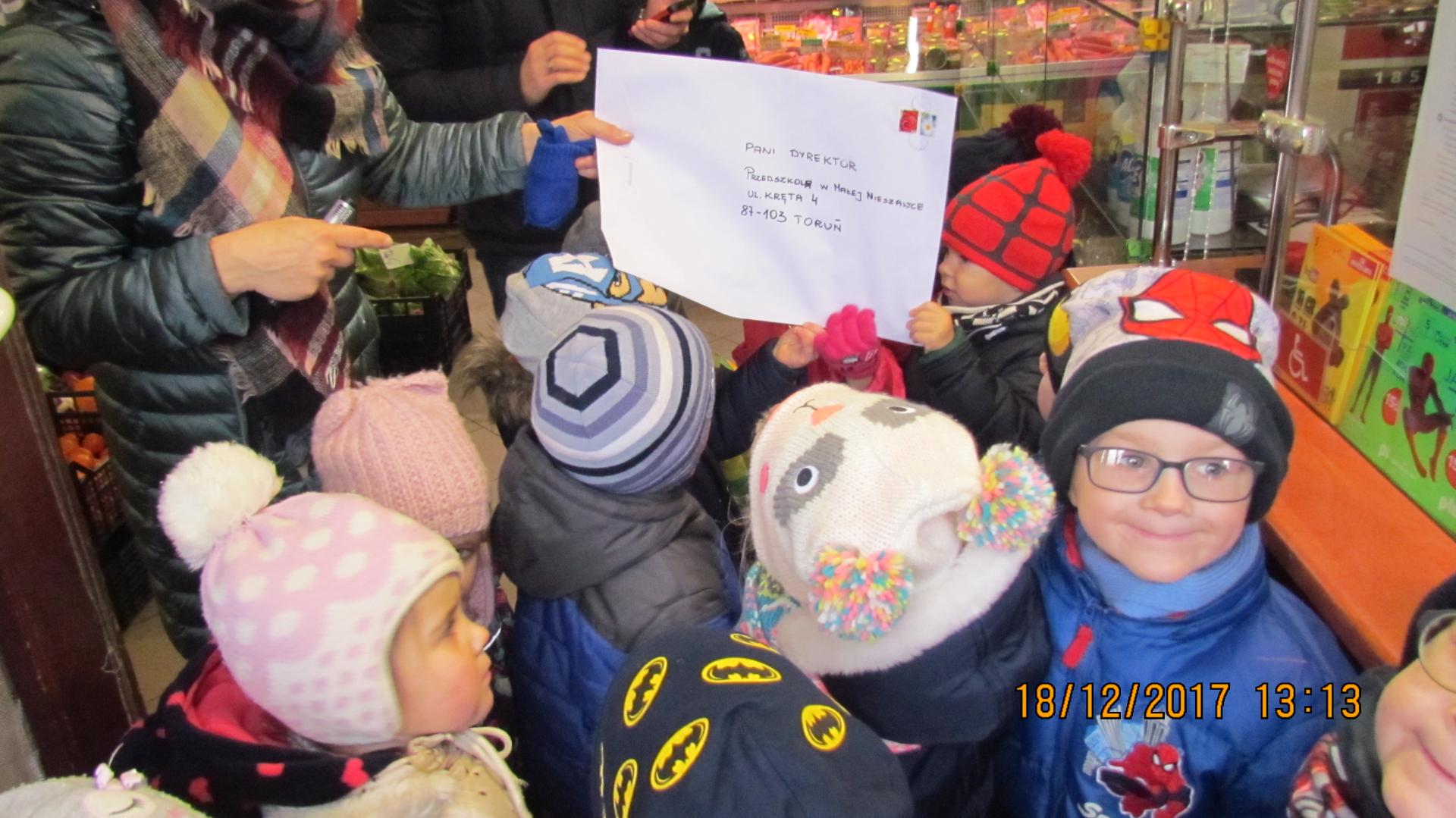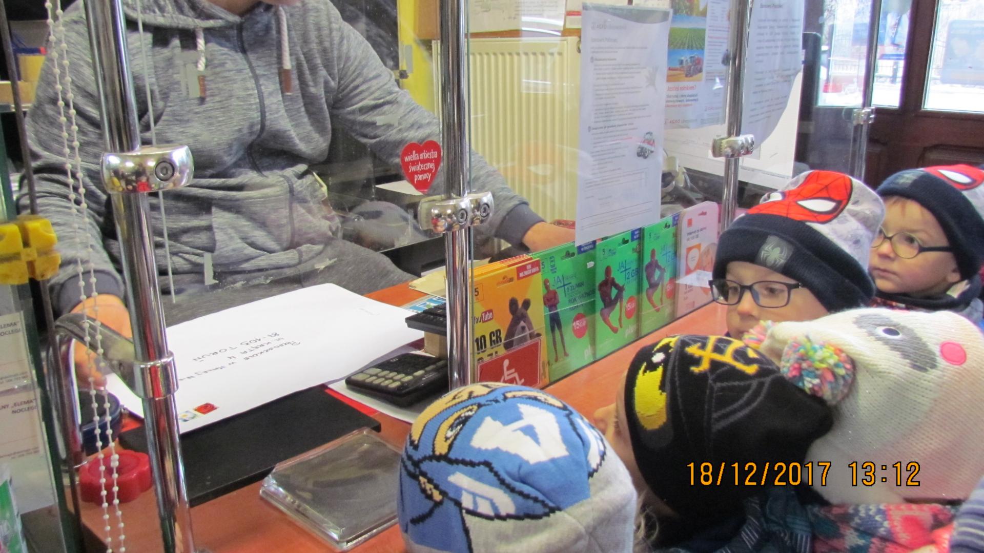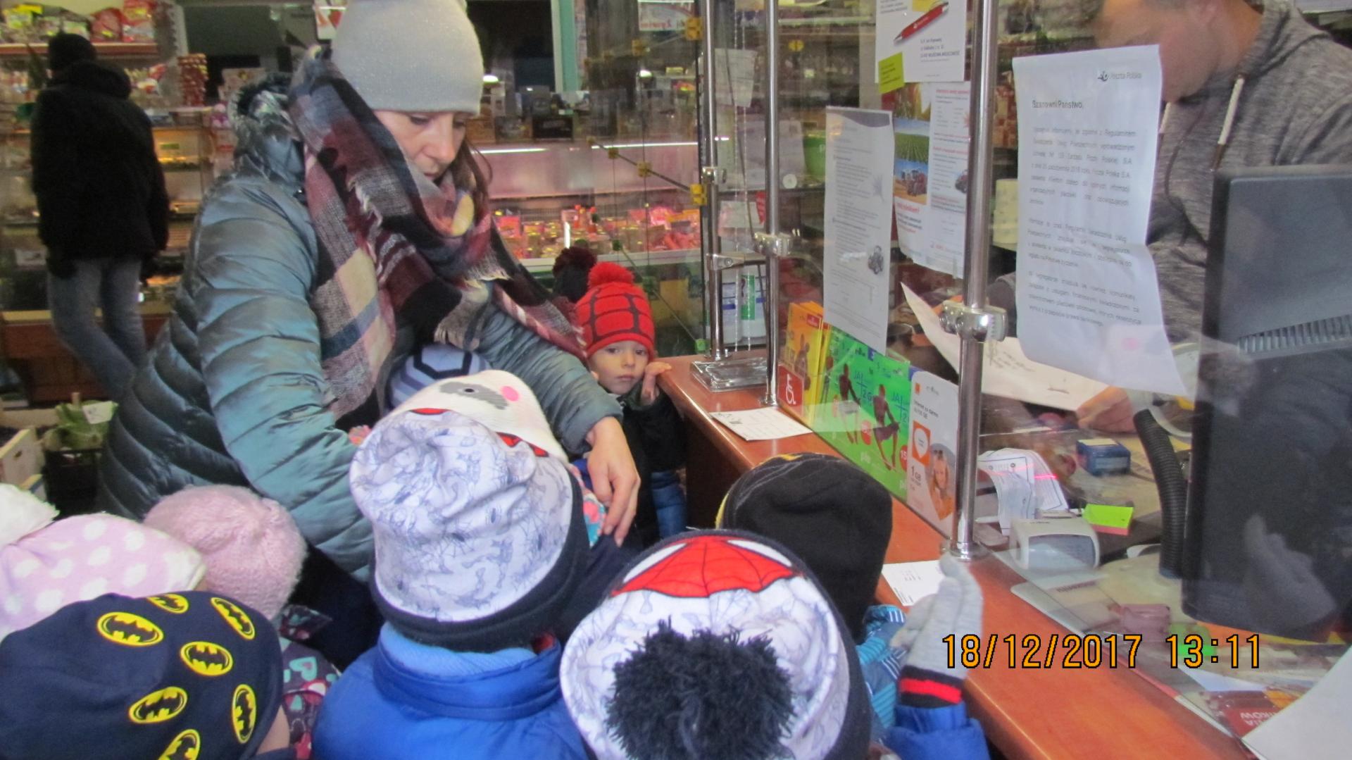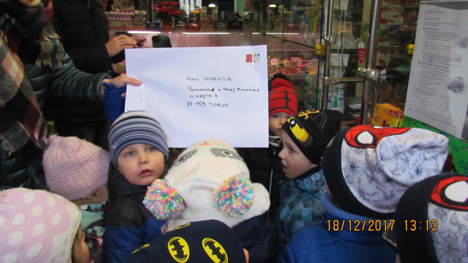 Dziś,18 grudnia wybraliśmy się z wizytą na pocztę. Chcieliśmy wysłać świąteczne życzenia dla Pani Dyrektor i wszystkich pracowników naszego przedszkola. Mieliśmy bardzo duży list do wysłania. Nie wiedzieliśmy, czy poradzimy sobie z wysłaniem go. Nasze obawy szybko zamieniły się w radość. Z pomocą przyszedł nam Pan, który obsługiwał okienko listowe. Wytłumaczył nam, jaka jest droga listu, co musimy zrobić, żeby list szybko trafił do właściwego adresata.