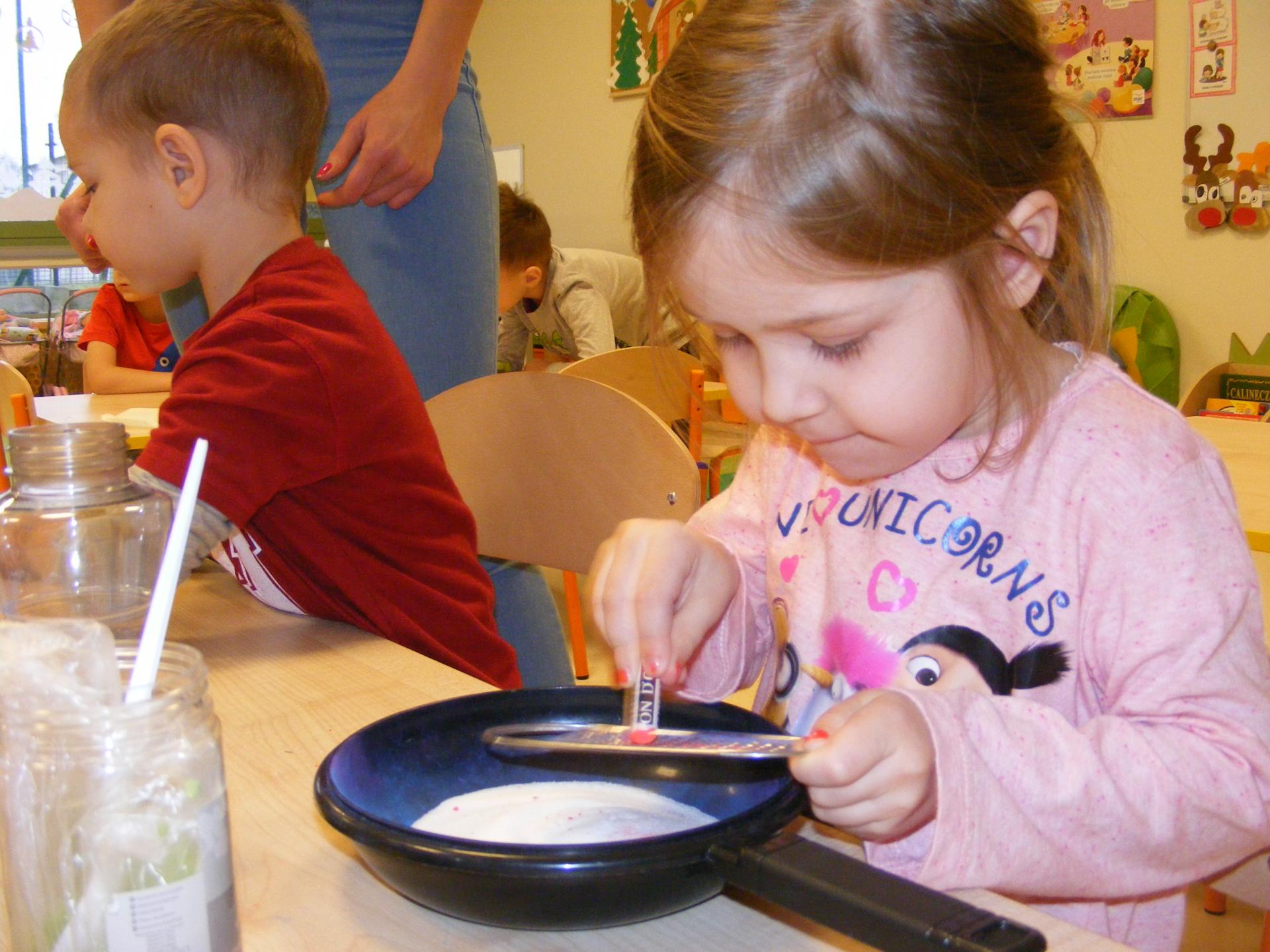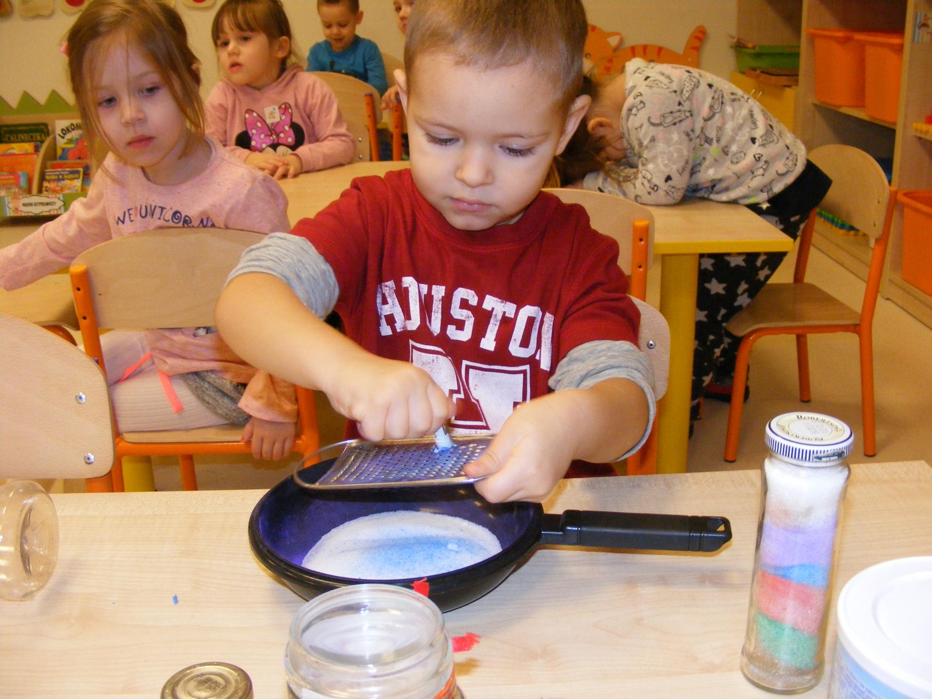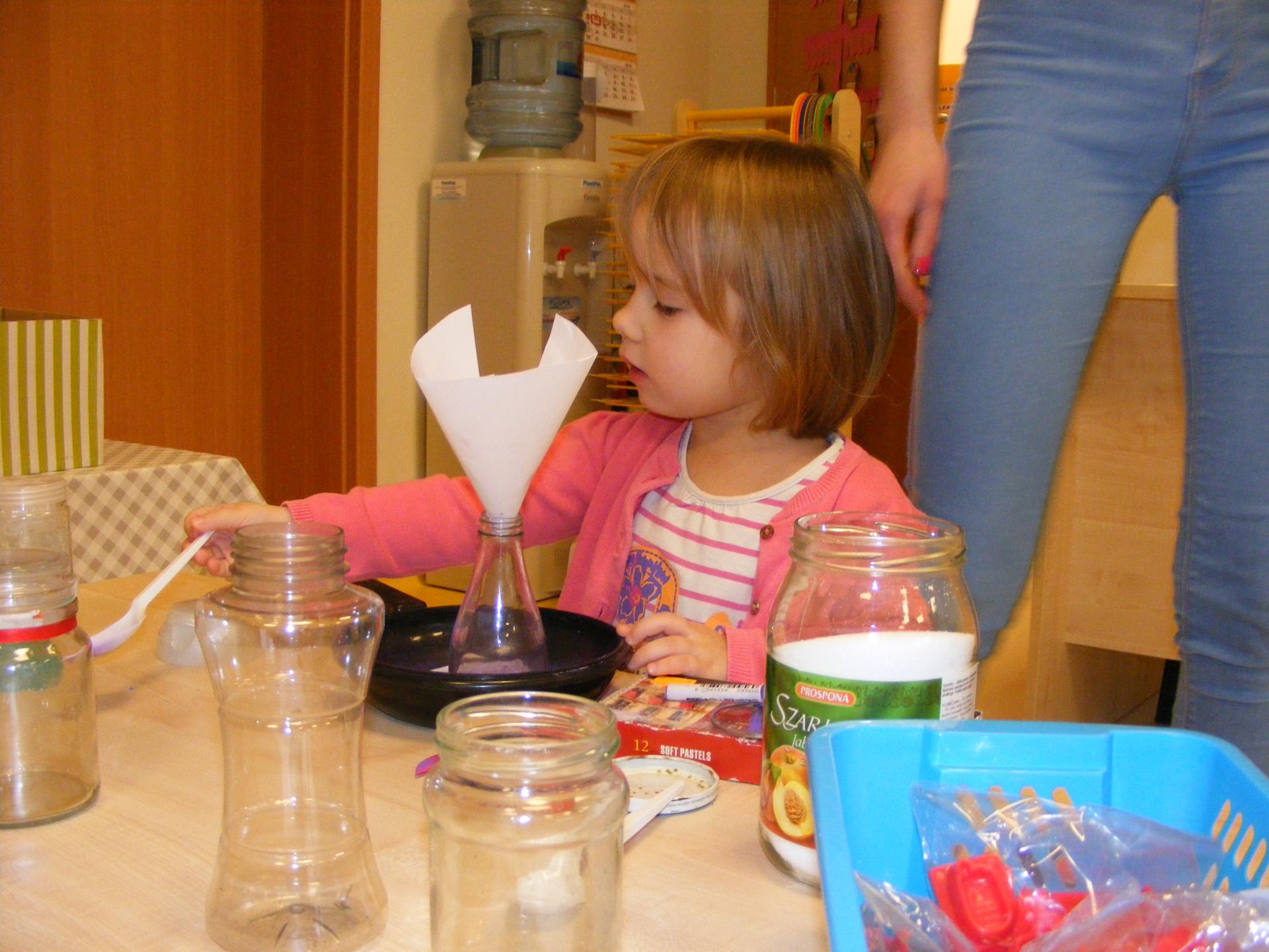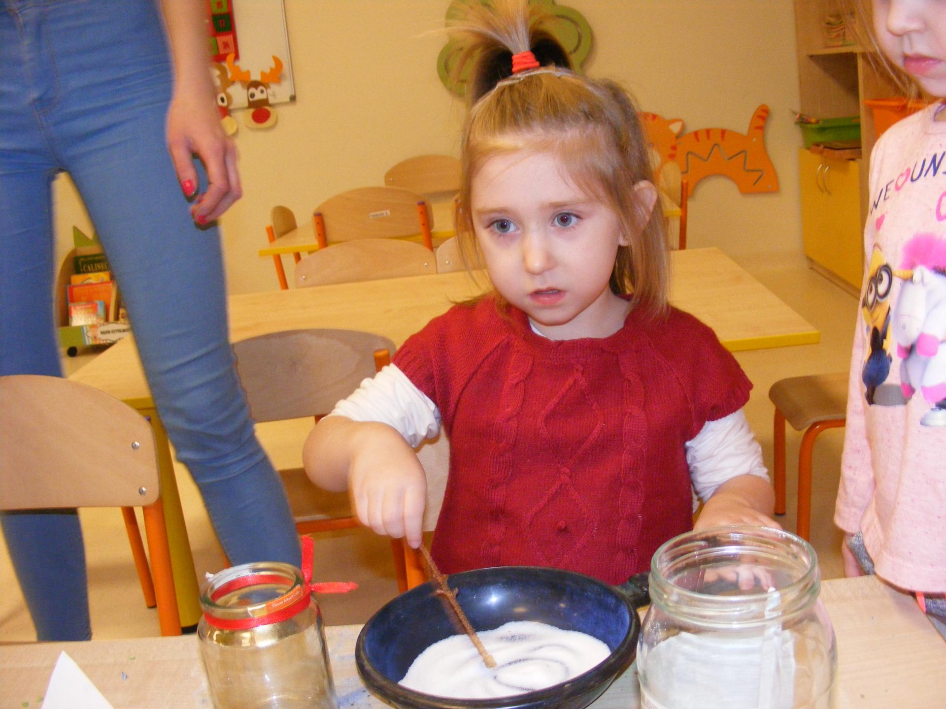 Dziś, 10 stycznia badaliśmy właściwości soli kuchennej. Barwiliśmy sól na tęczowe kolory i stworzyliśmy kompozycje w słoikach do naszego kącika badawczego.