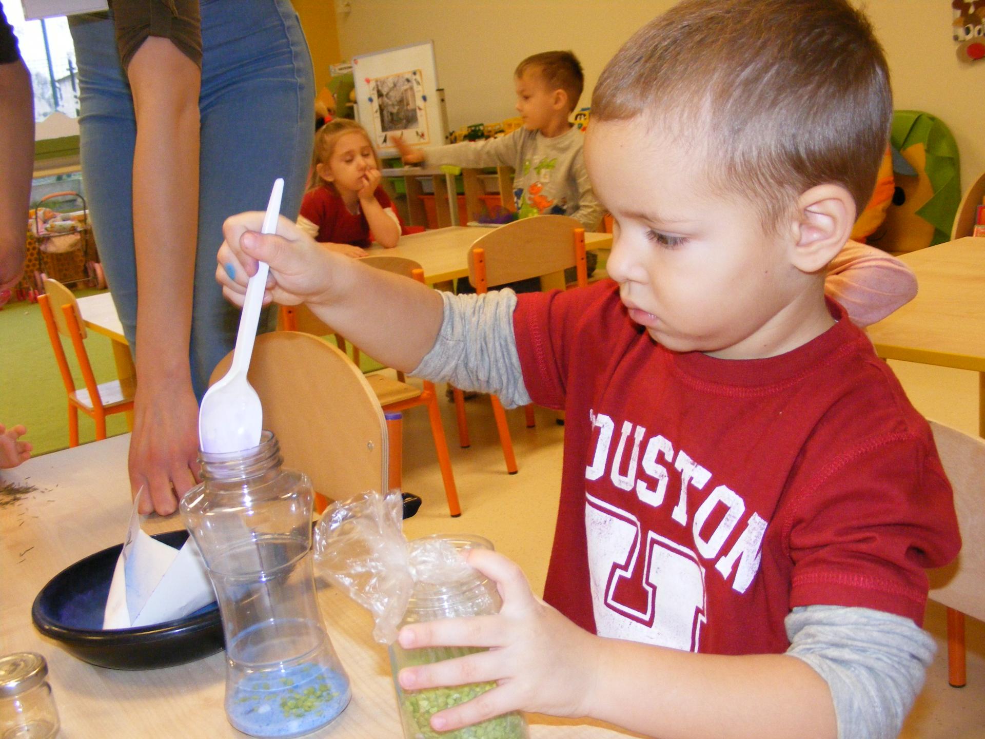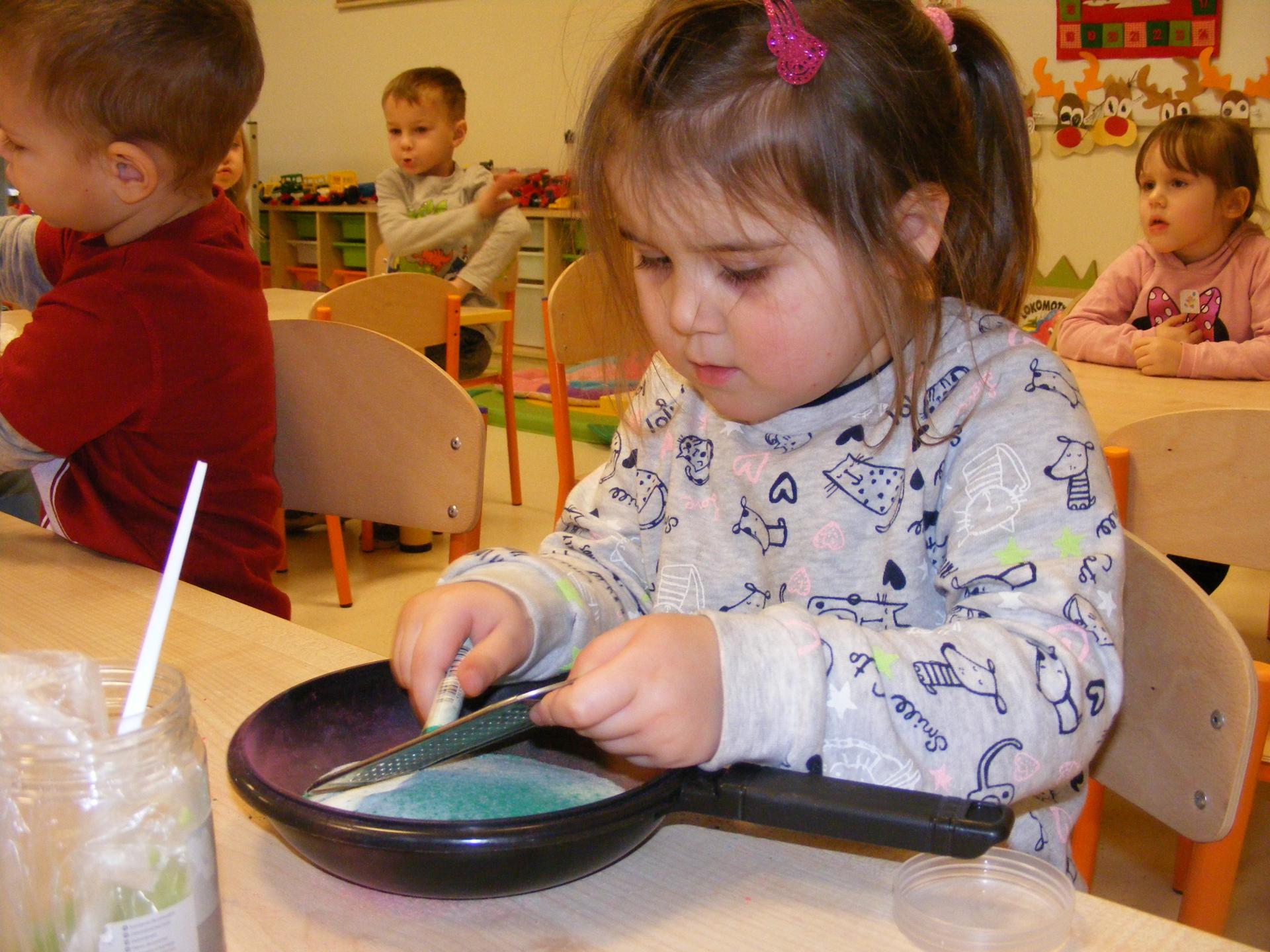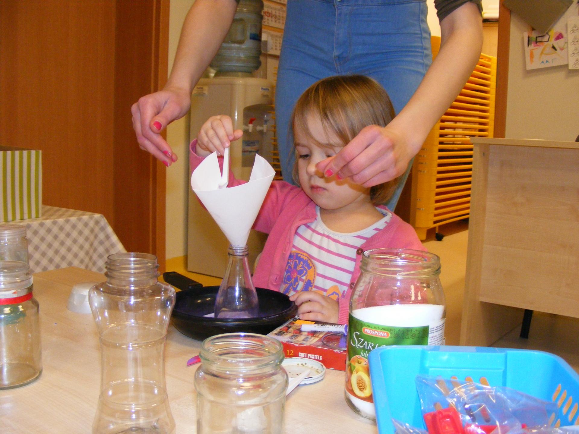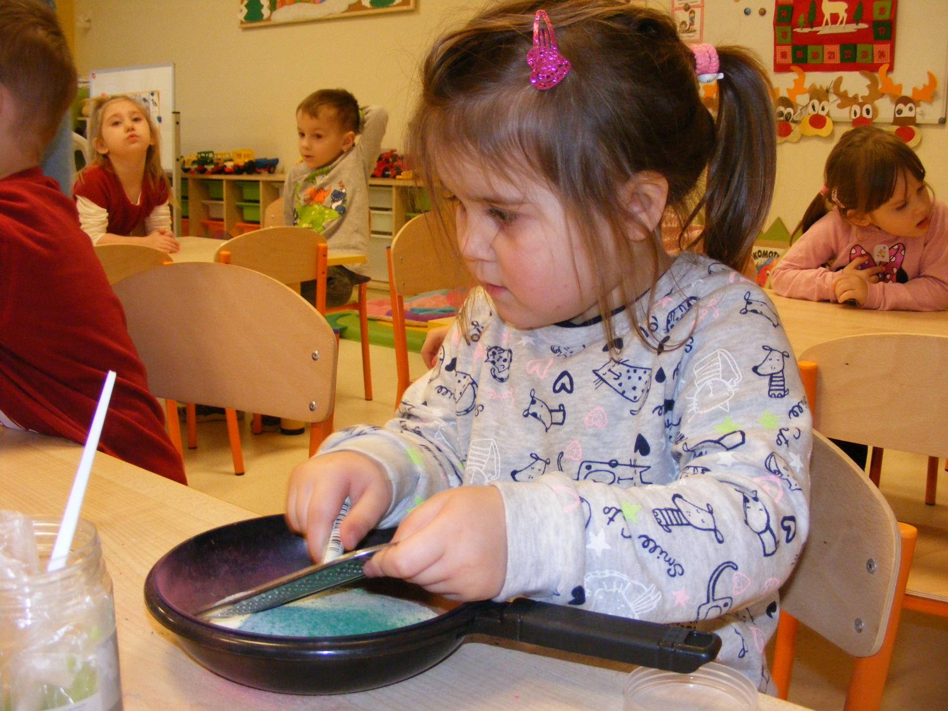 Dziś, 10 stycznia badaliśmy właściwości soli kuchennej. Barwiliśmy sól na tęczowe kolory i stworzyliśmy kompozycje w słoikach do naszego kącika badawczego.