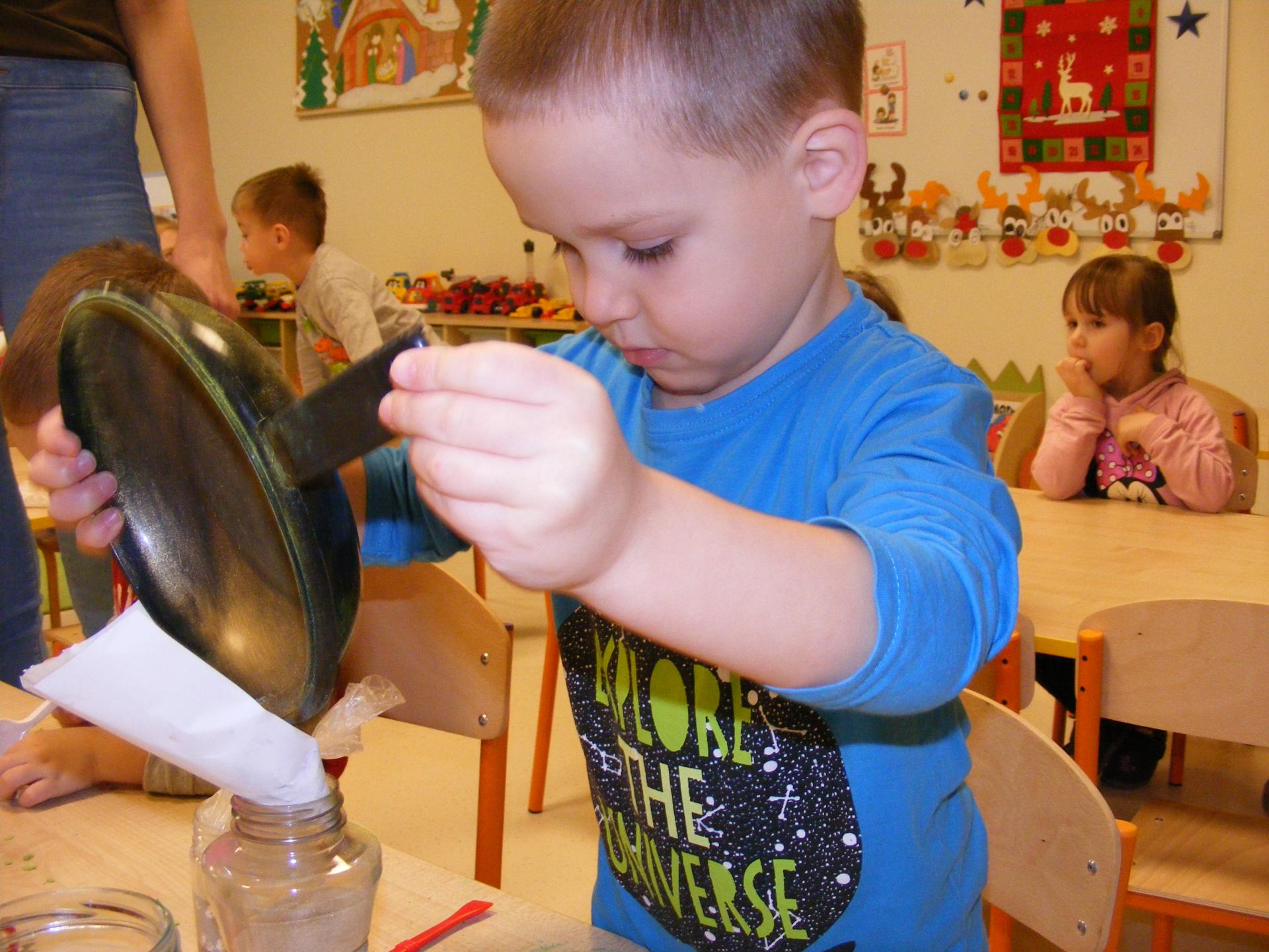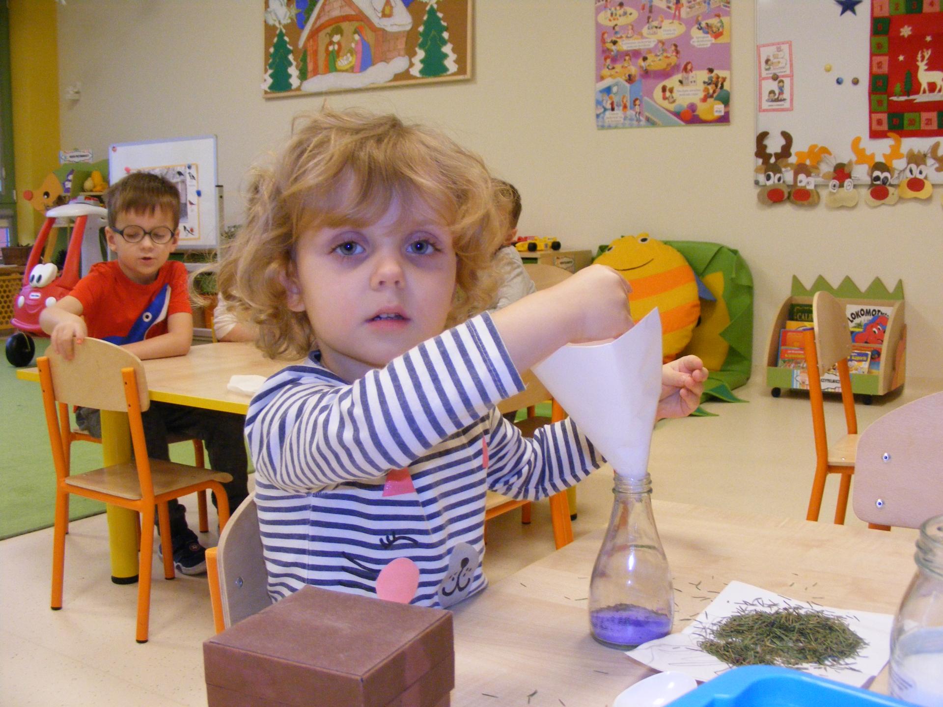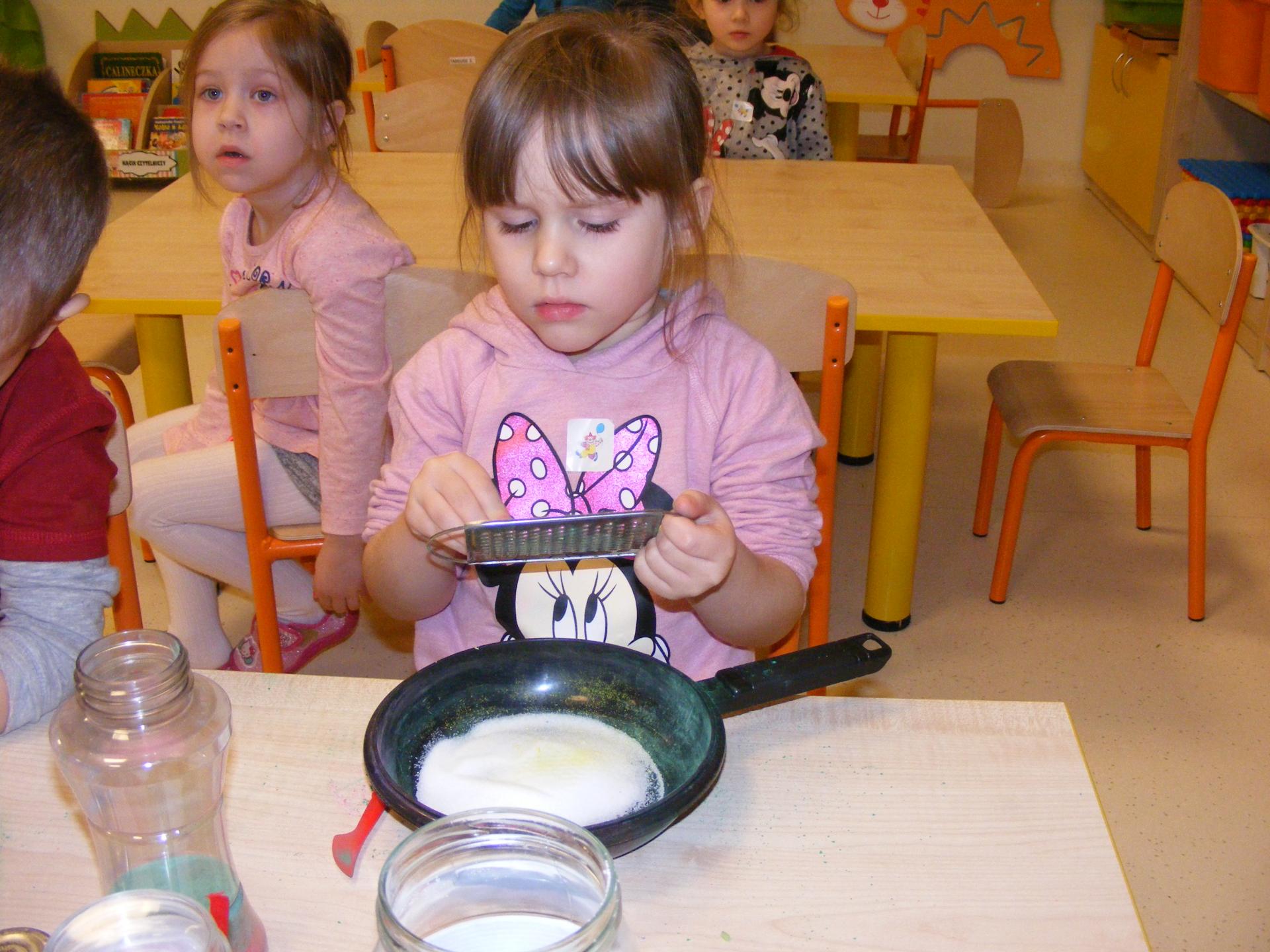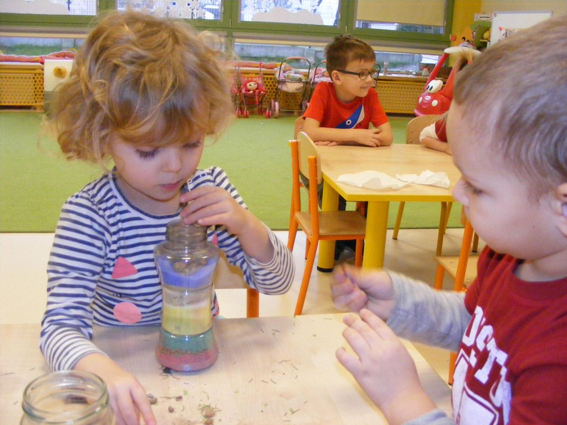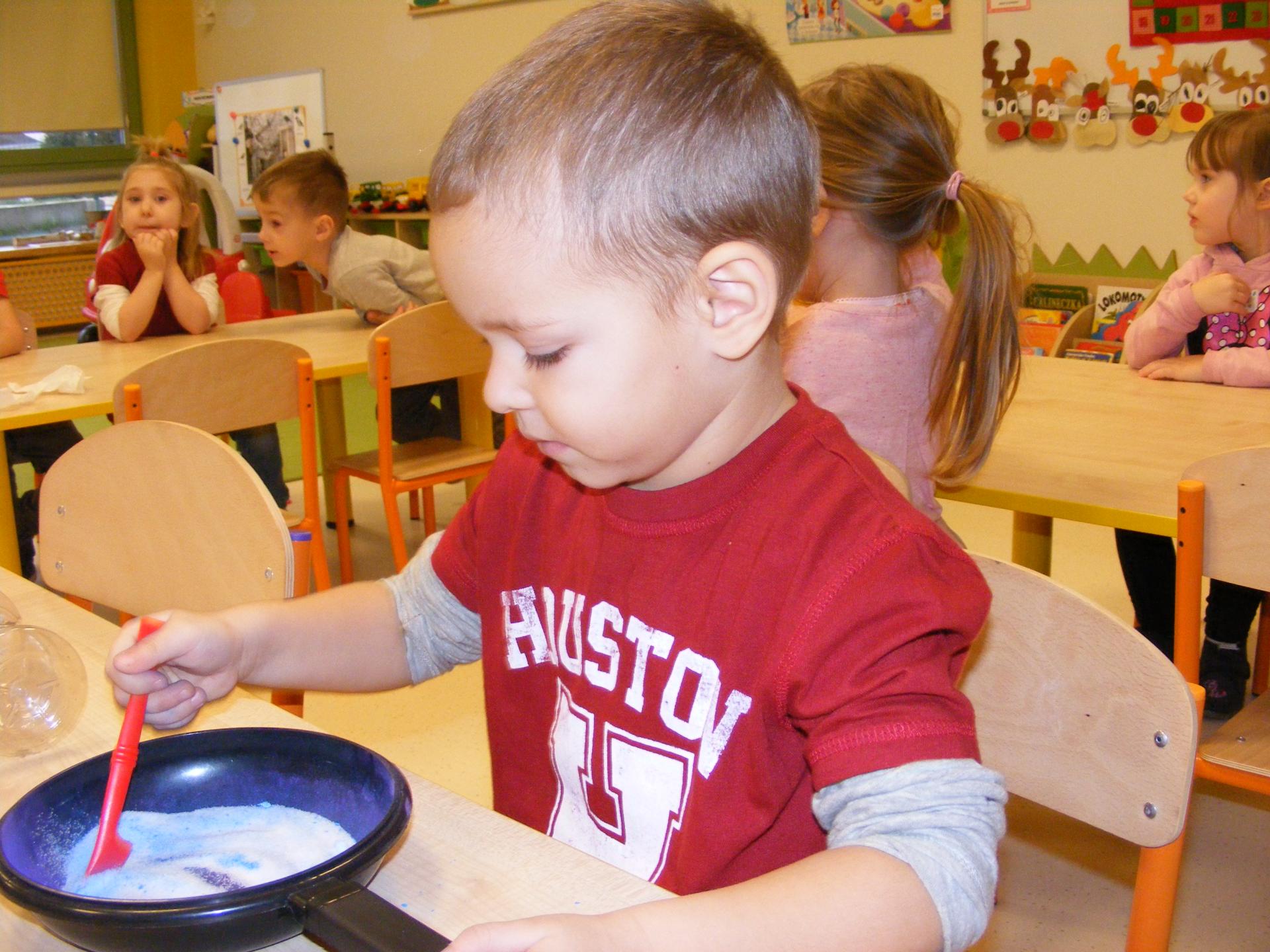 Dziś, 10 stycznia badaliśmy właściwości soli kuchennej. Barwiliśmy sól na tęczowe kolory i stworzyliśmy kompozycje w słoikach do naszego kącika badawczego.